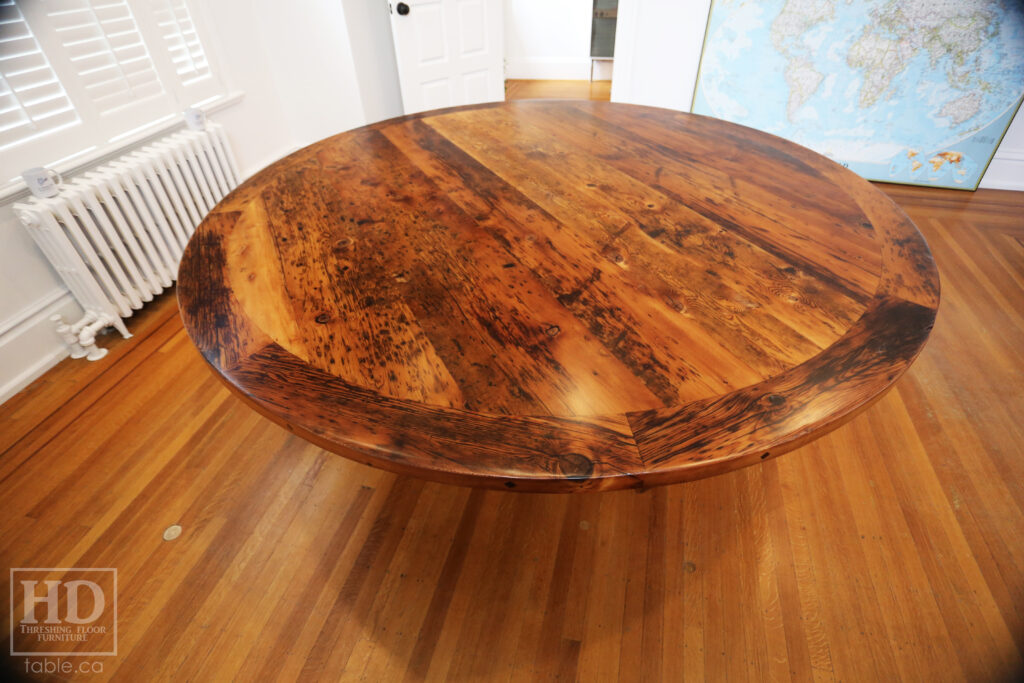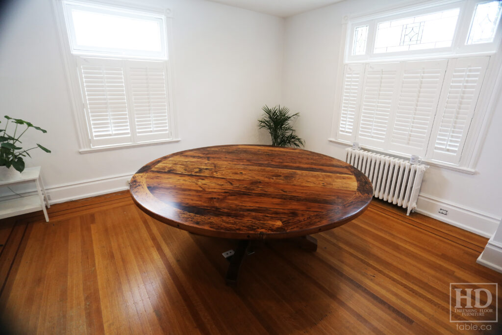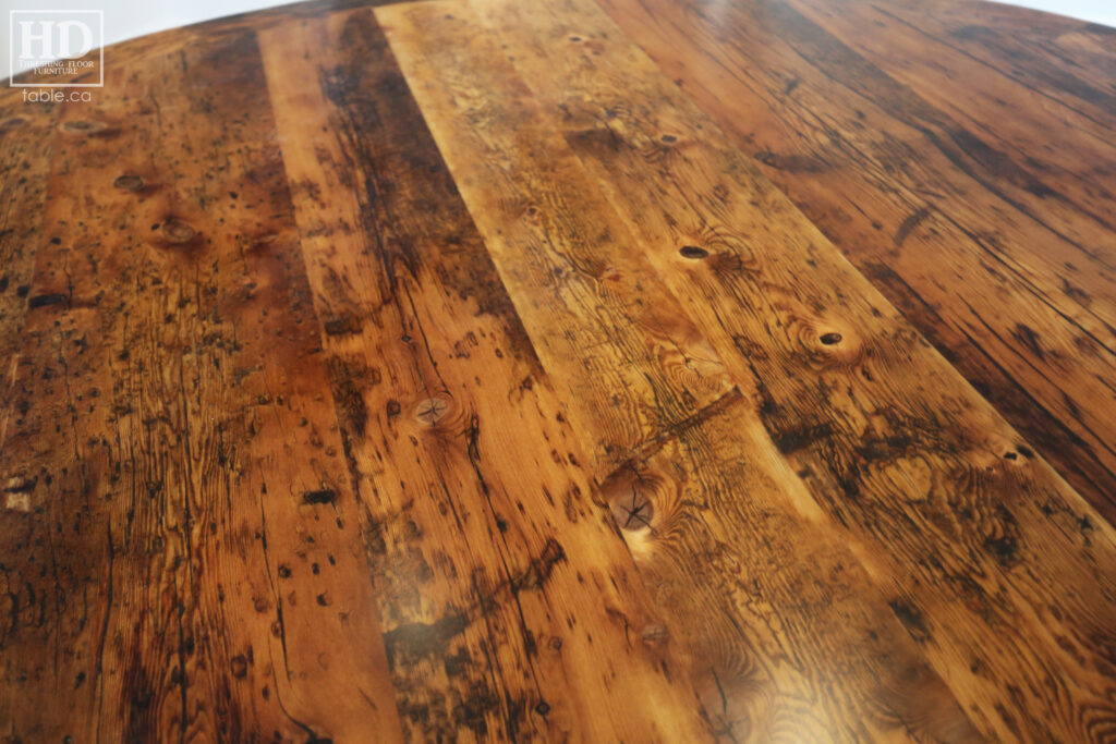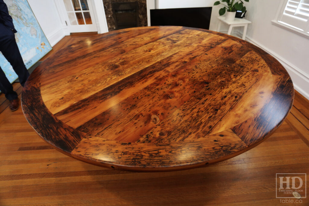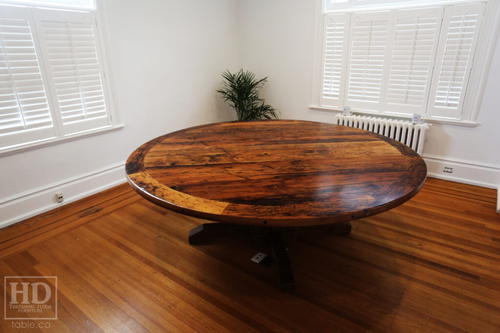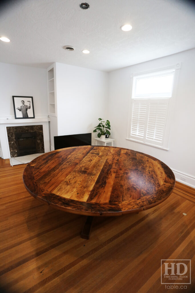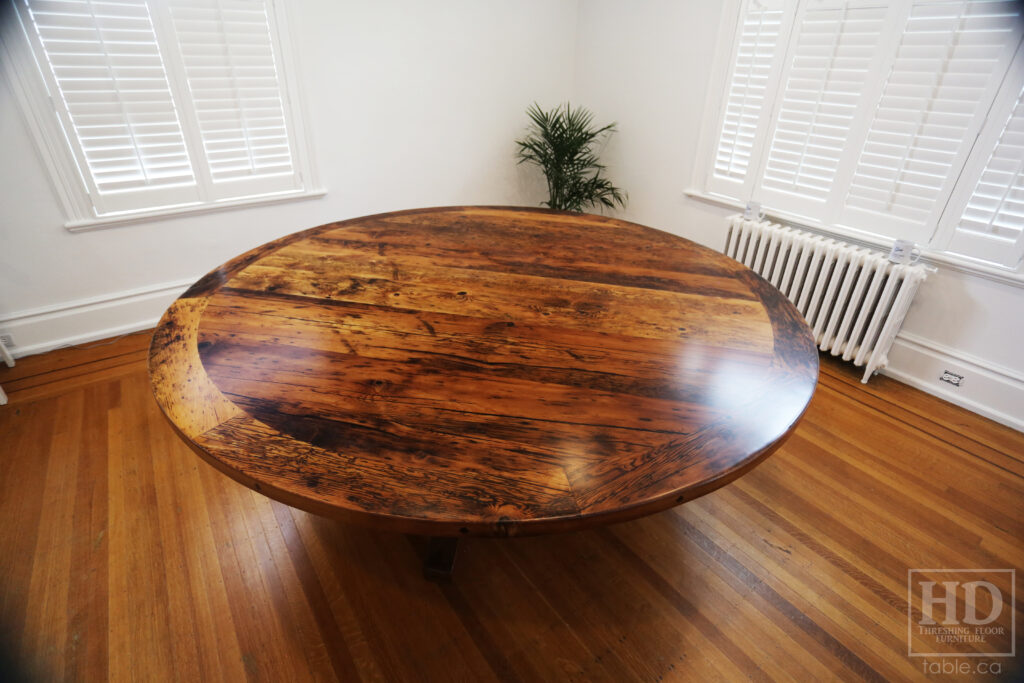 Project summary: 84″ Reclaimed Ontario Barnwood Round Table we made for a Dundas office – Old Growth Hemlock Threshing Floor Construction – Hand-Hewn Beam Base Option – Black Stain Option – Original edges + distressing maintained – Premium epoxy + matte polyurethane finish – www.table.ca