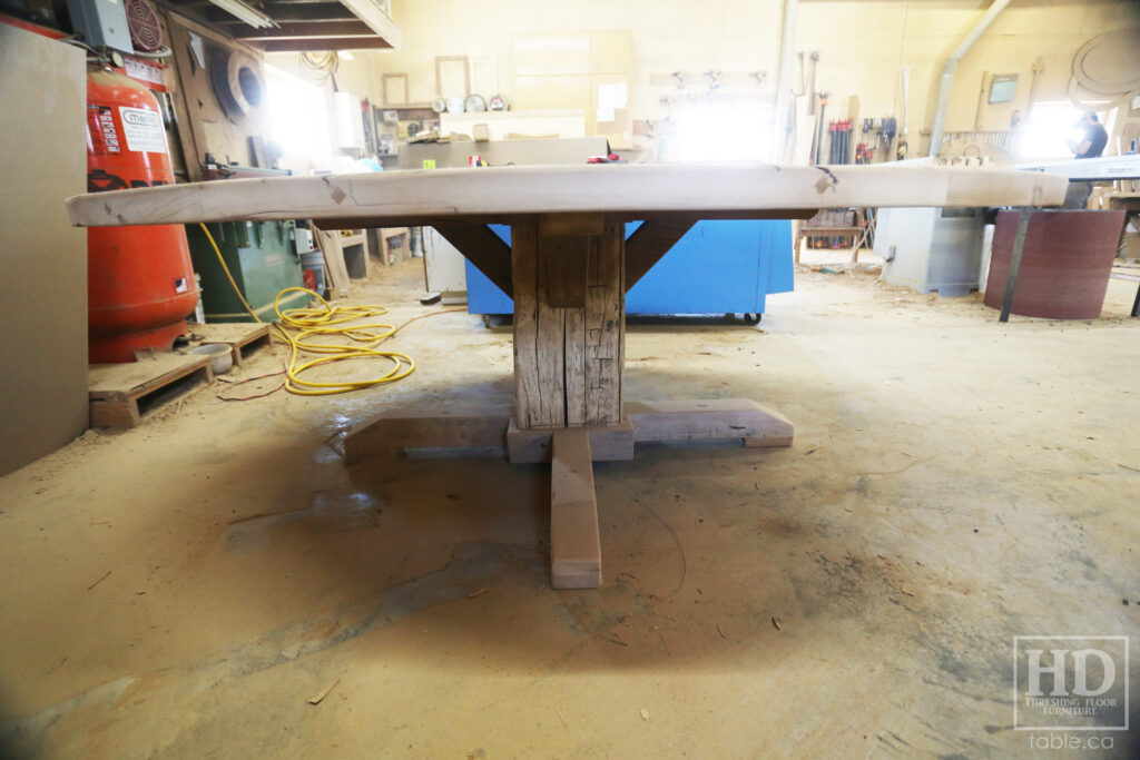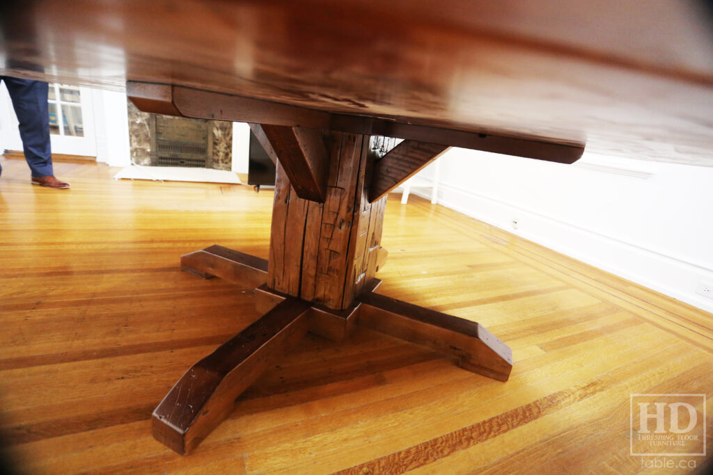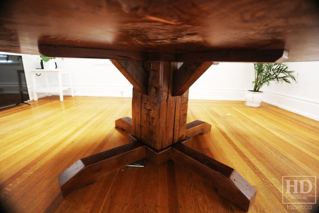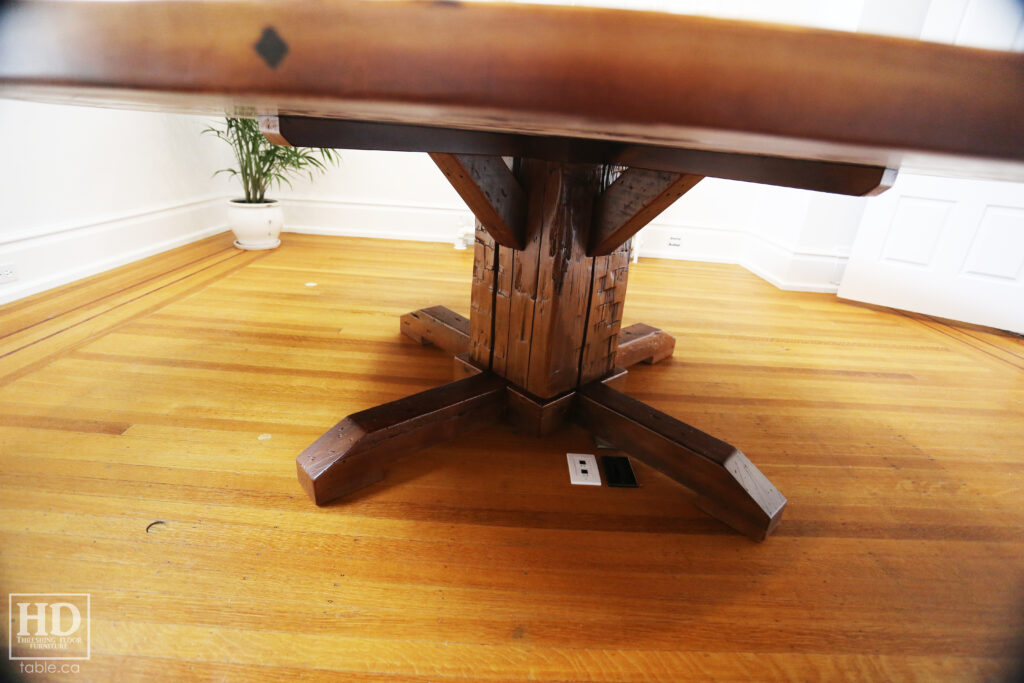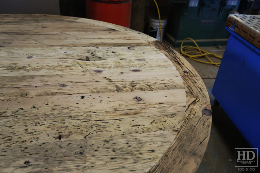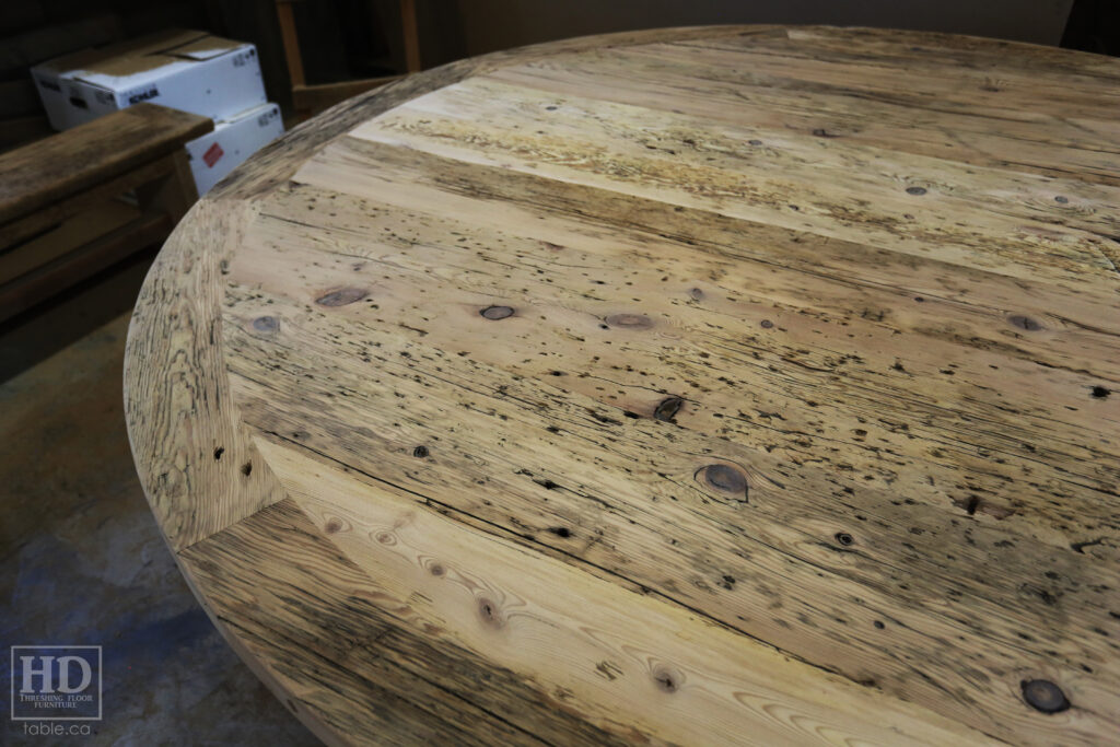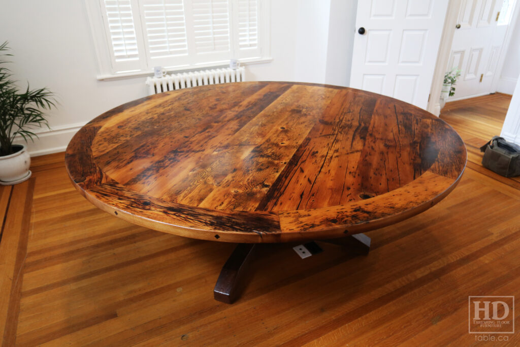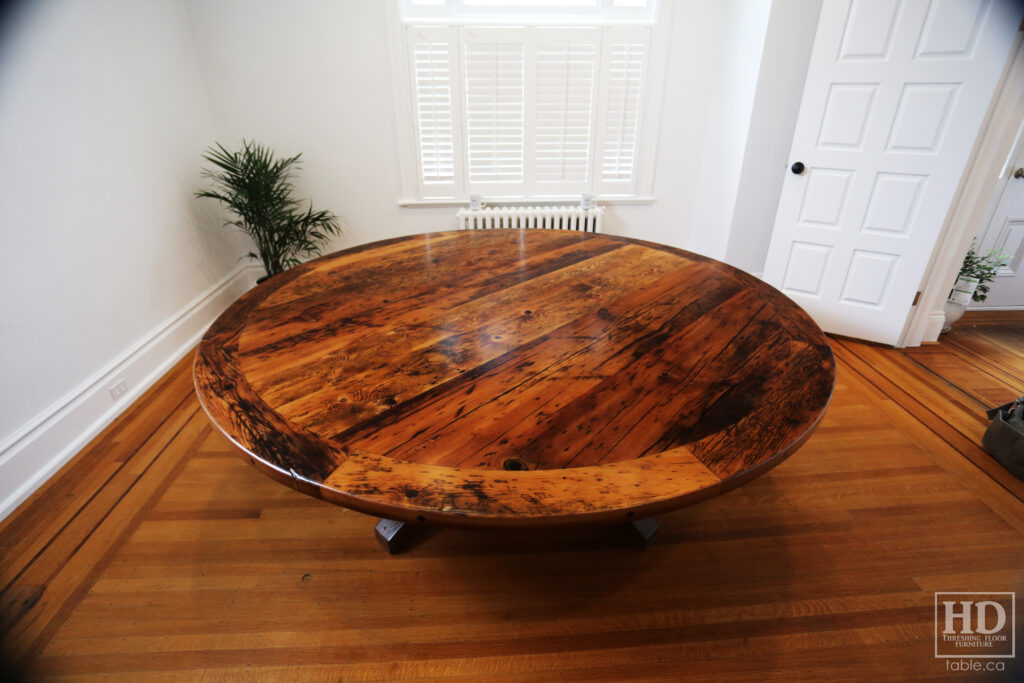 Project summary: 84″ Reclaimed Ontario Barnwood Round Table we made for a Dundas office – Old Growth Hemlock Threshing Floor Construction – Hand-Hewn Beam Base Option – Black Stain Option – Original edges + distressing maintained – Premium epoxy + matte polyurethane finish – www.table.ca