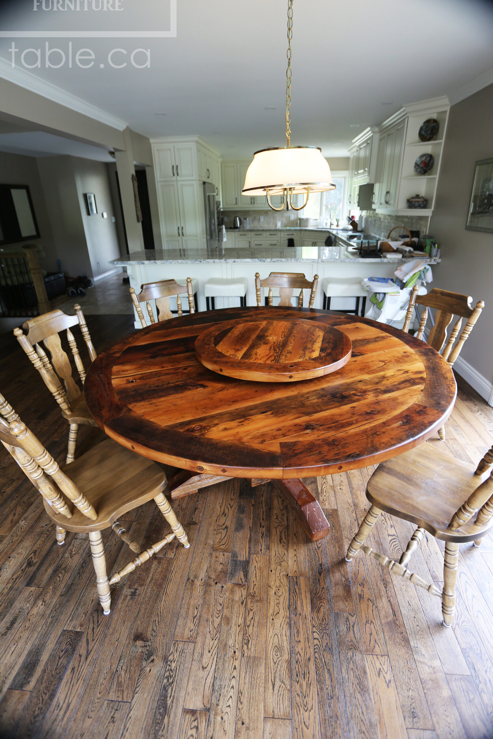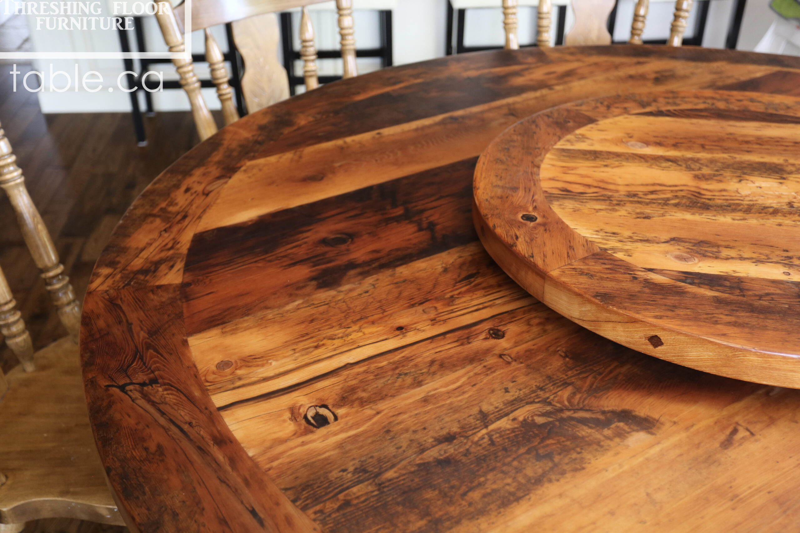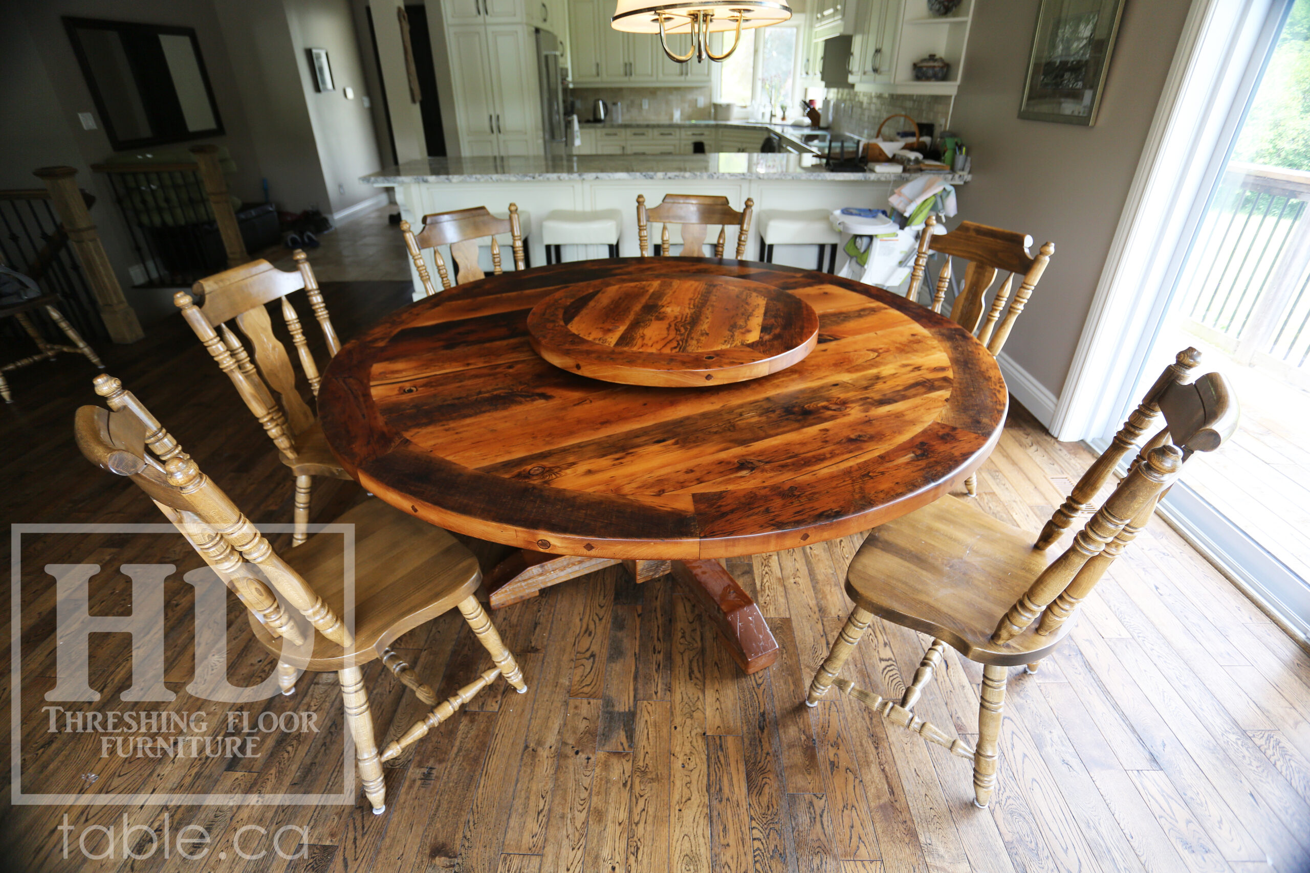 Project details: 72″ Round Ontario Barnwood Table we made for a Meaford, Ontario home – Hand-Hewn Beam Post Base – 2″ Hemlock Threshing Floor Top – Original edges & distressing maintained – Premium epoxy + matte polyurethane finish – [Matching] 32″ Round Lazy Susan – www.table.ca