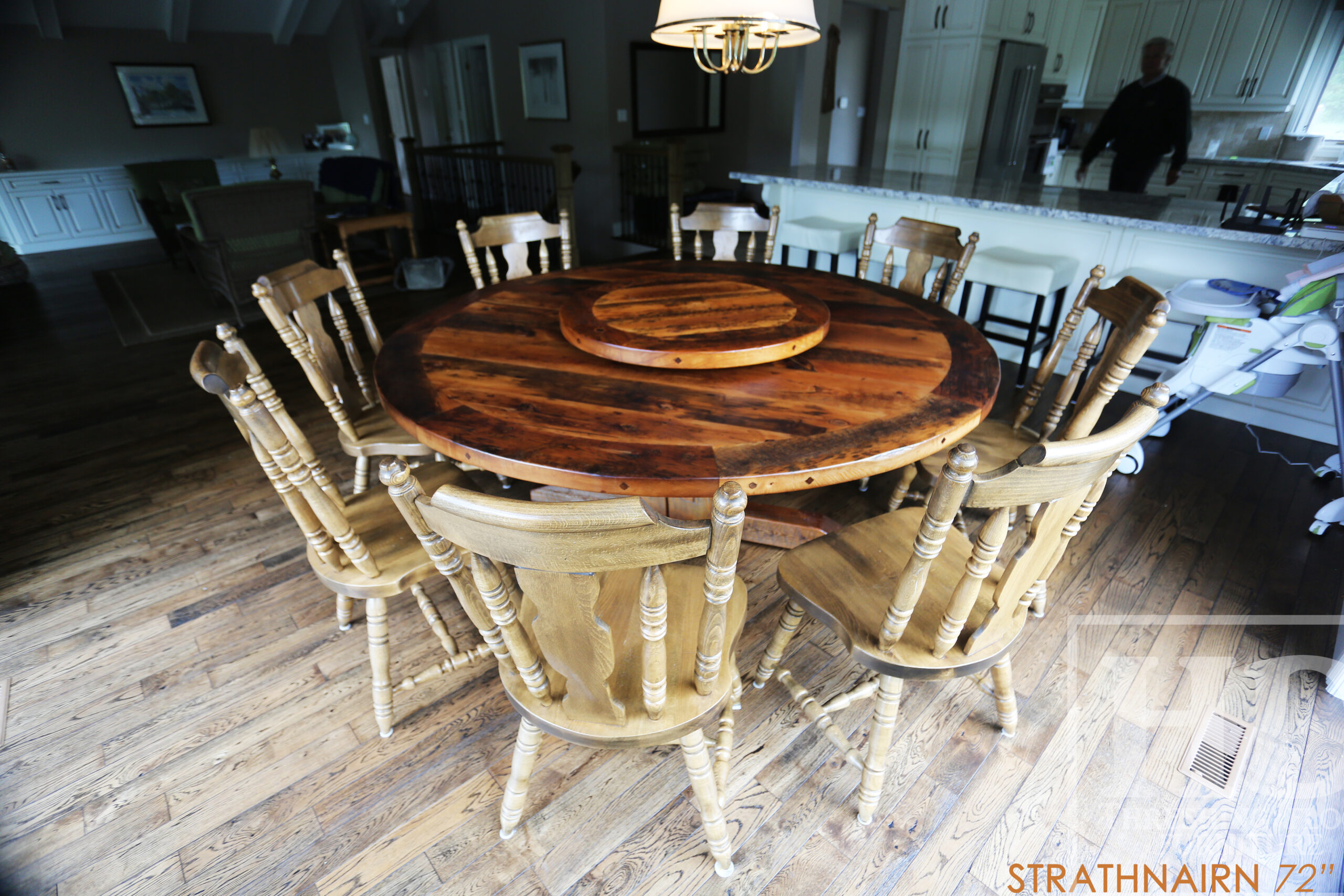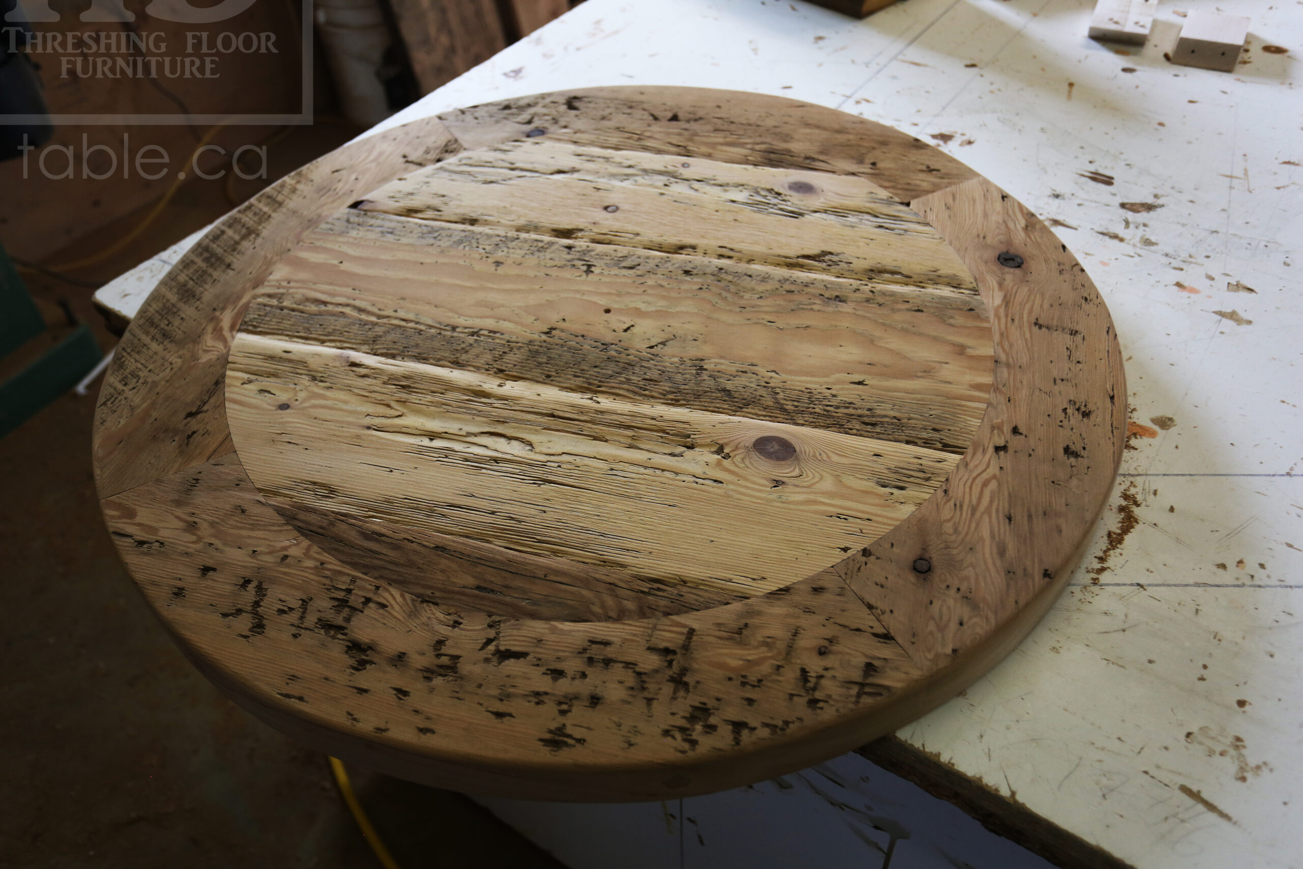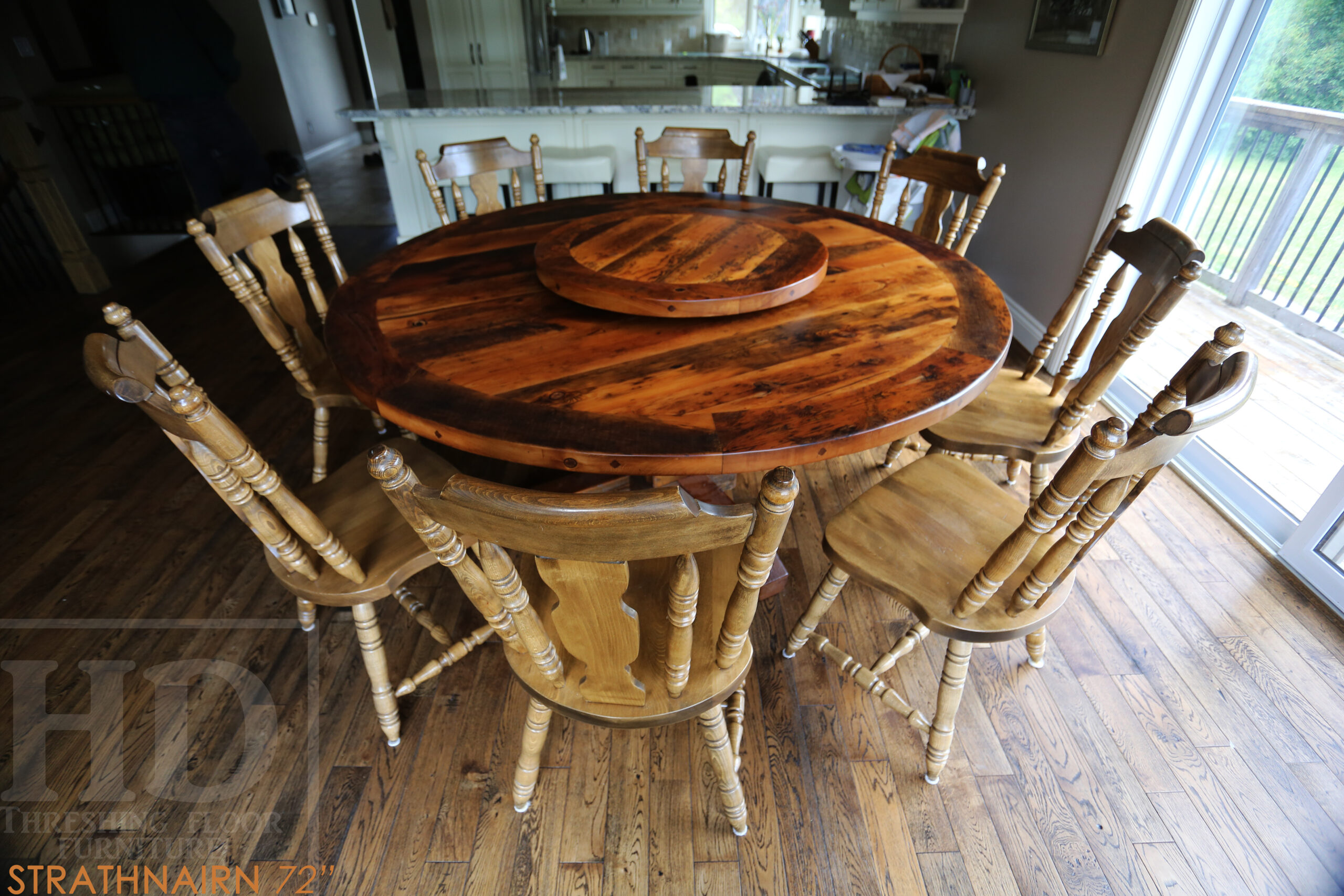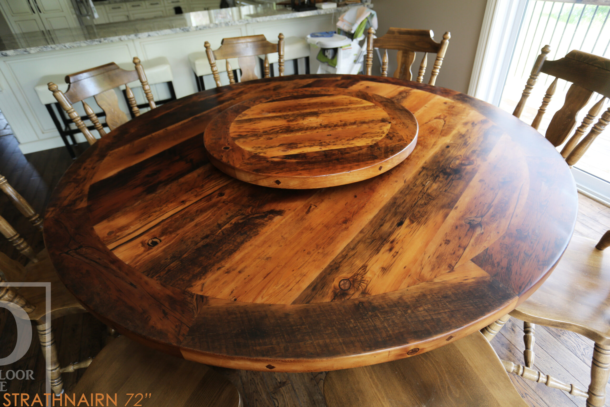 Project details: 72″ Round Ontario Barnwood Table we made for a Meaford, Ontario home – Hand-Hewn Beam Post Base – 2″ Hemlock Threshing Floor Top – Original edges & distressing maintained – Premium epoxy + matte polyurethane finish – [Matching] 32″ Round Lazy Susan – www.table.ca