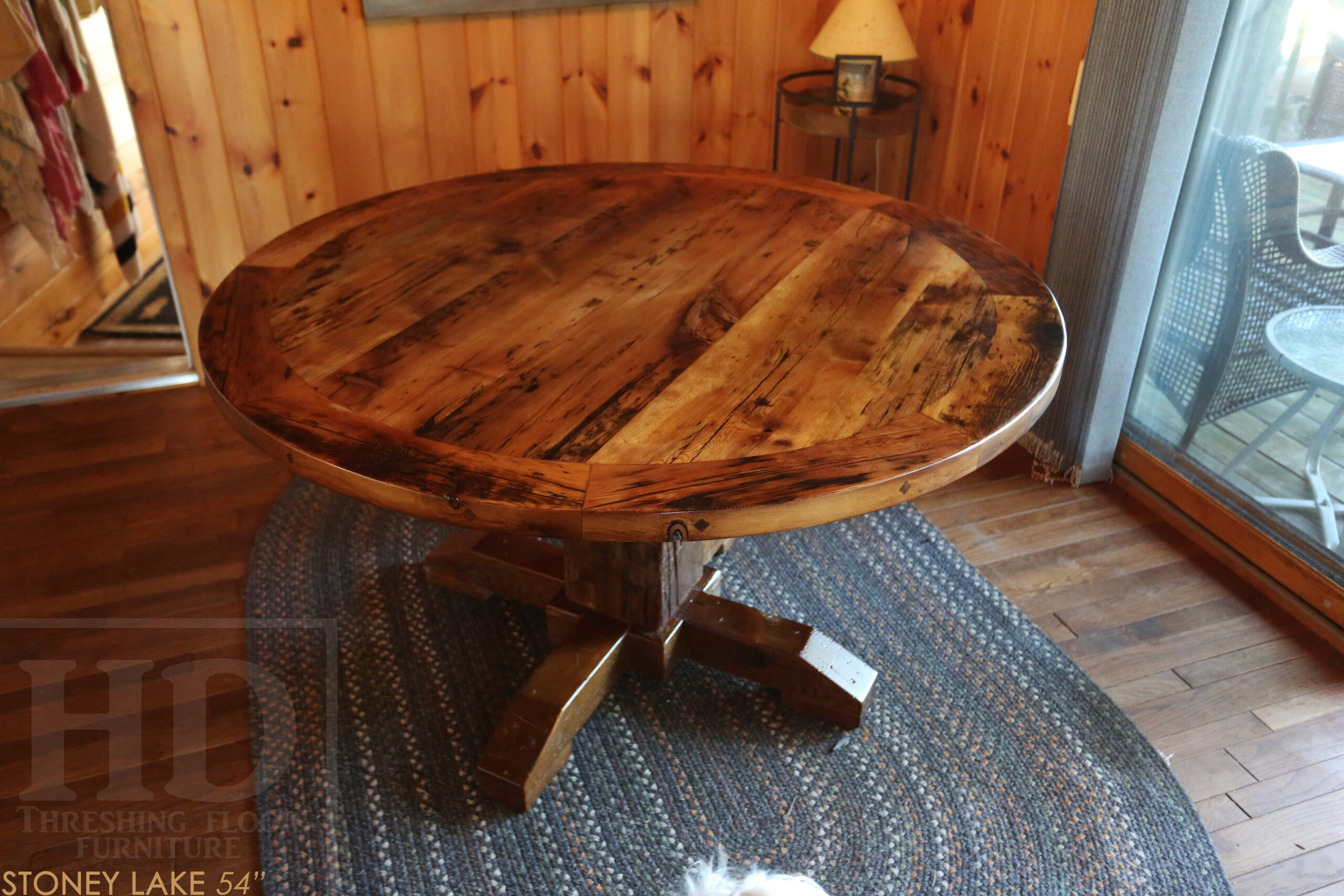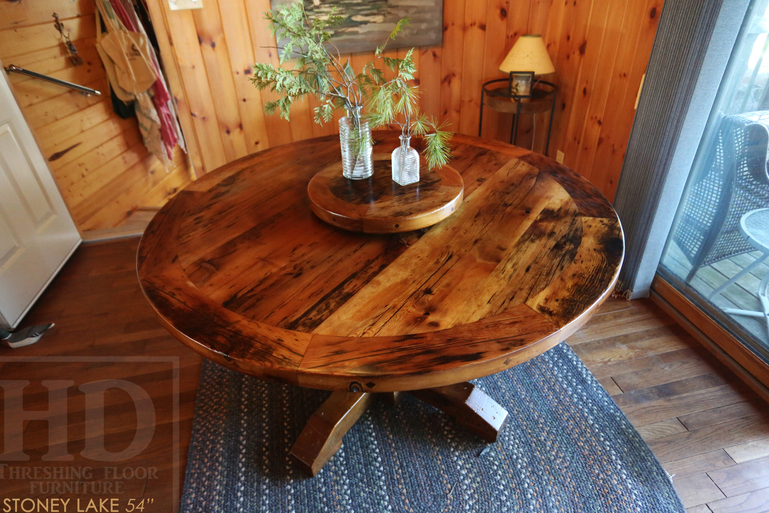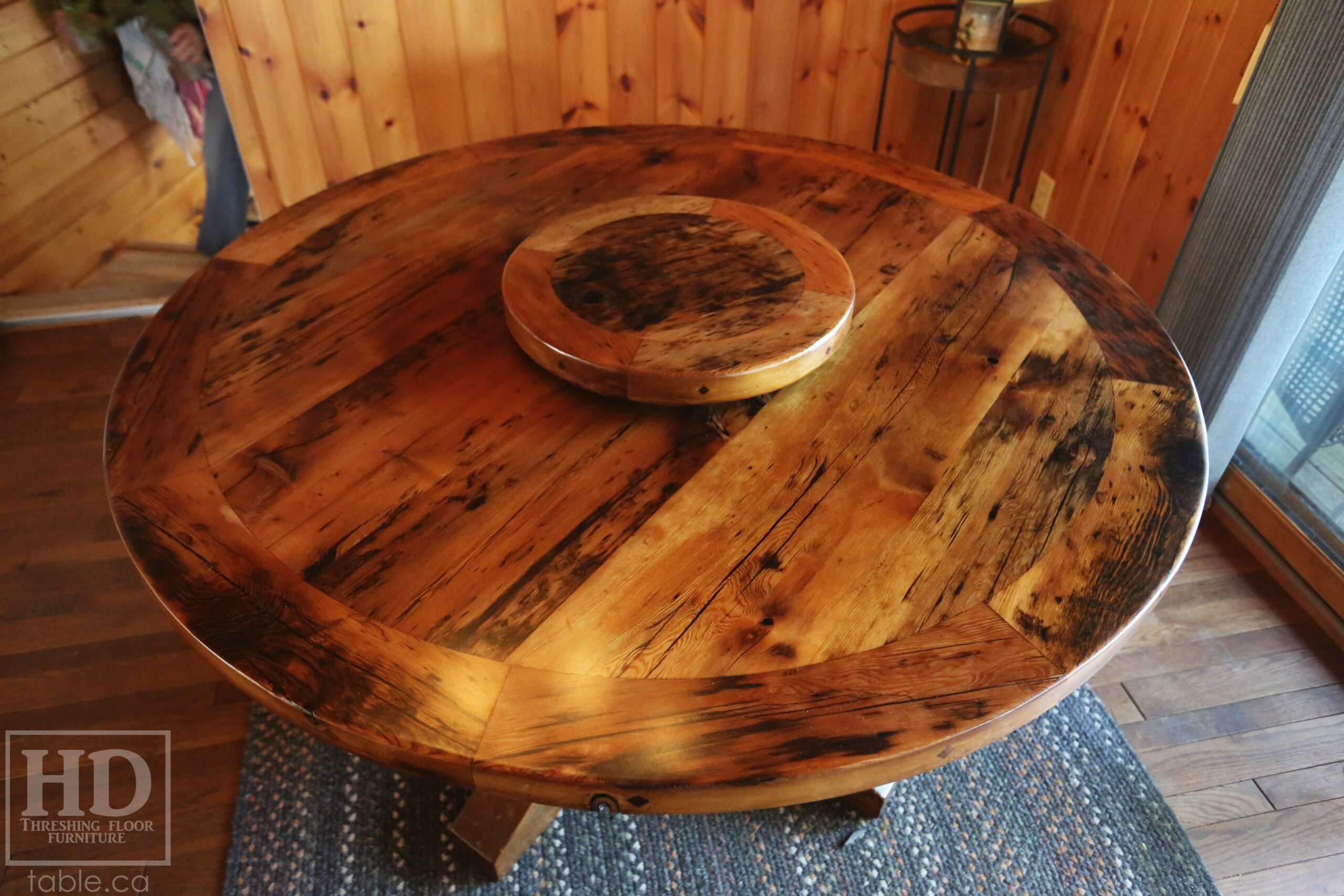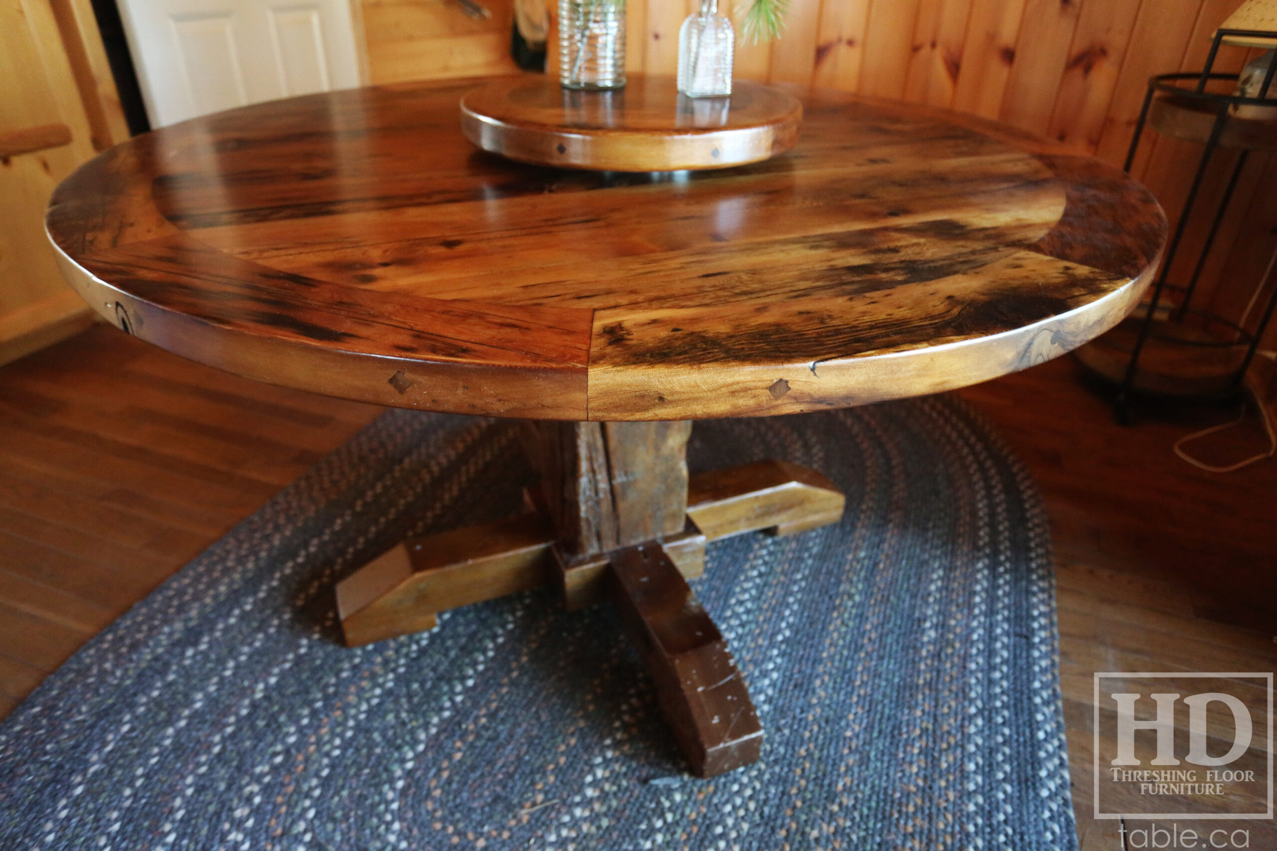 Project summary: 54†Reclaimed Ontario Barnwood Round Table we made for a Stoney Lake, Ontario cottage – Old Growth Hemlock Threshing Floor Construction – Hand-Hewn Beam Pedestal Base – Original edges & distressing maintained – Circular Bread Edge Boards – Premium epoxy + satin polyurethane finish – 18†Round Lazy Susan – www.table.ca
