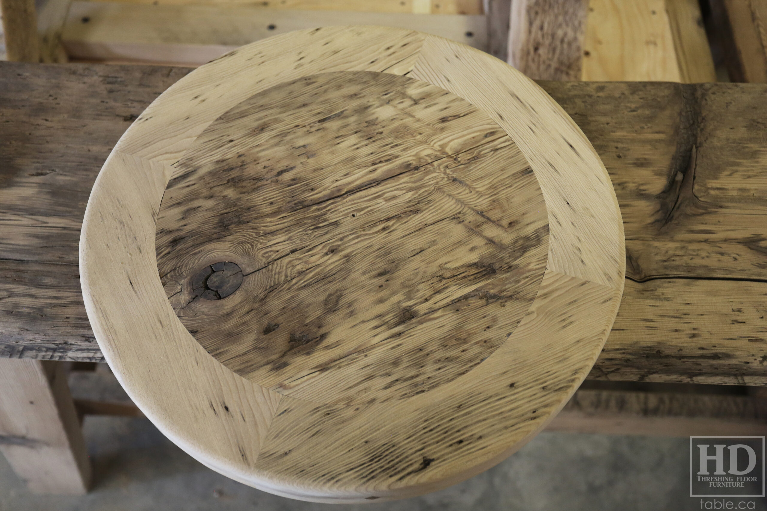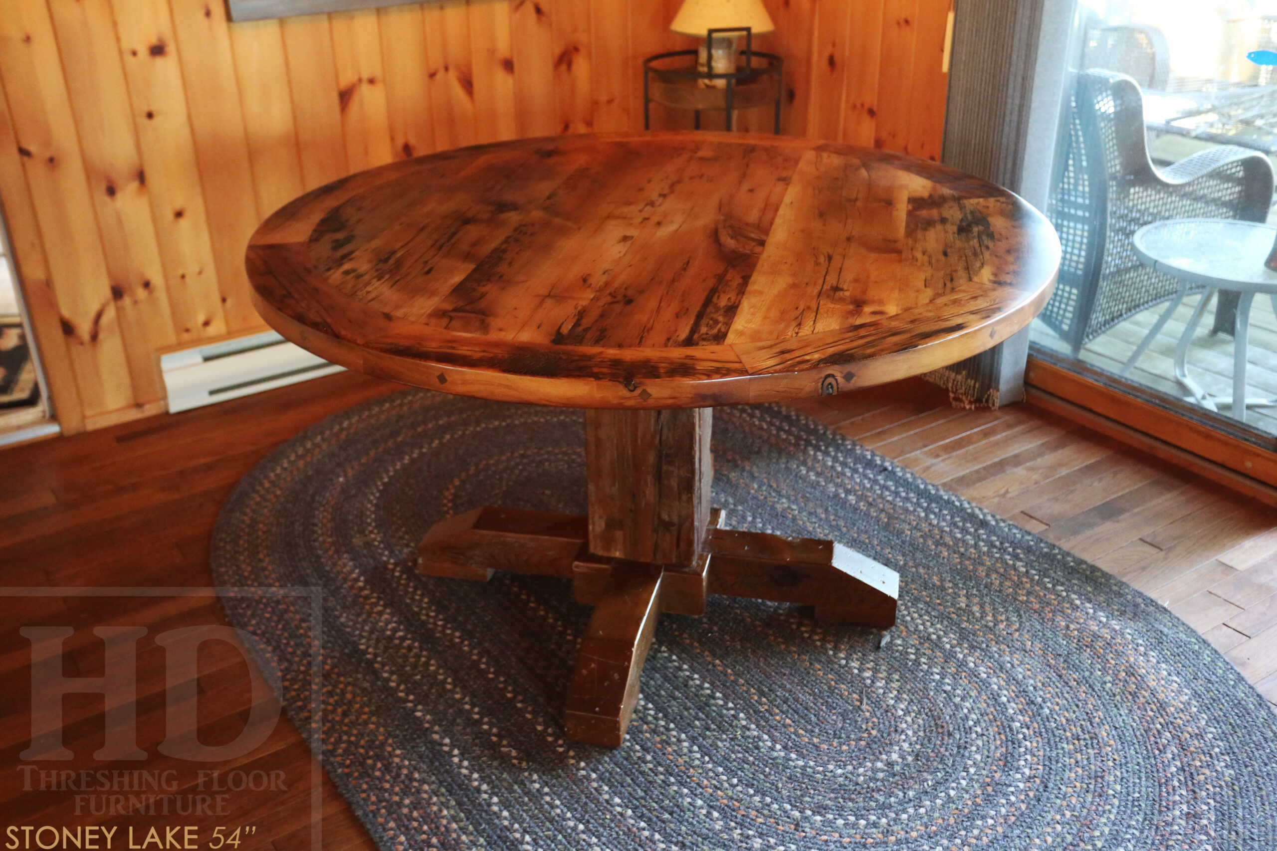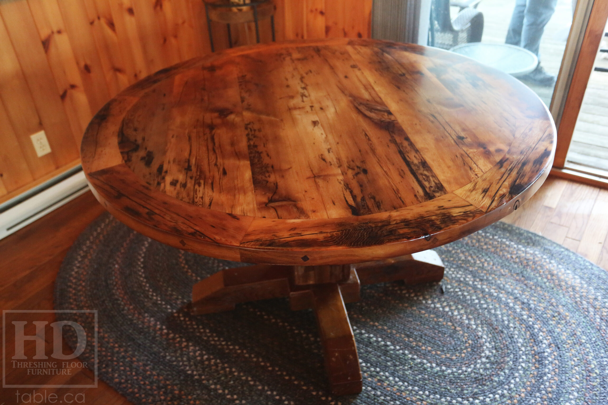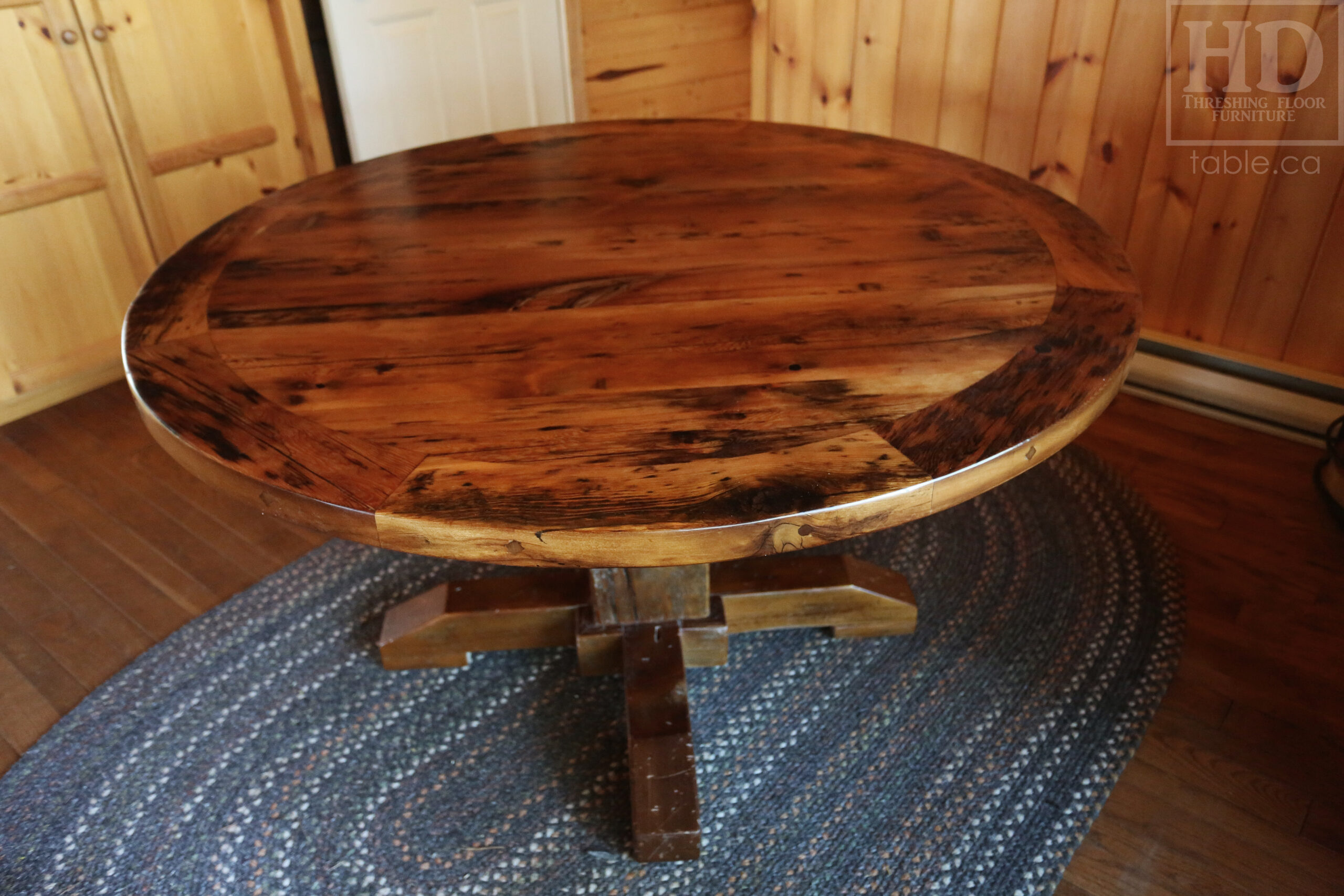 Project summary: 54†Reclaimed Ontario Barnwood Round Table we made for a Stoney Lake, Ontario cottage – Old Growth Hemlock Threshing Floor Construction – Hand-Hewn Beam Pedestal Base – Original edges & distressing maintained – Circular Bread Edge Boards – Premium epoxy + satin polyurethane finish – 18†Round Lazy Susan – www.table.ca