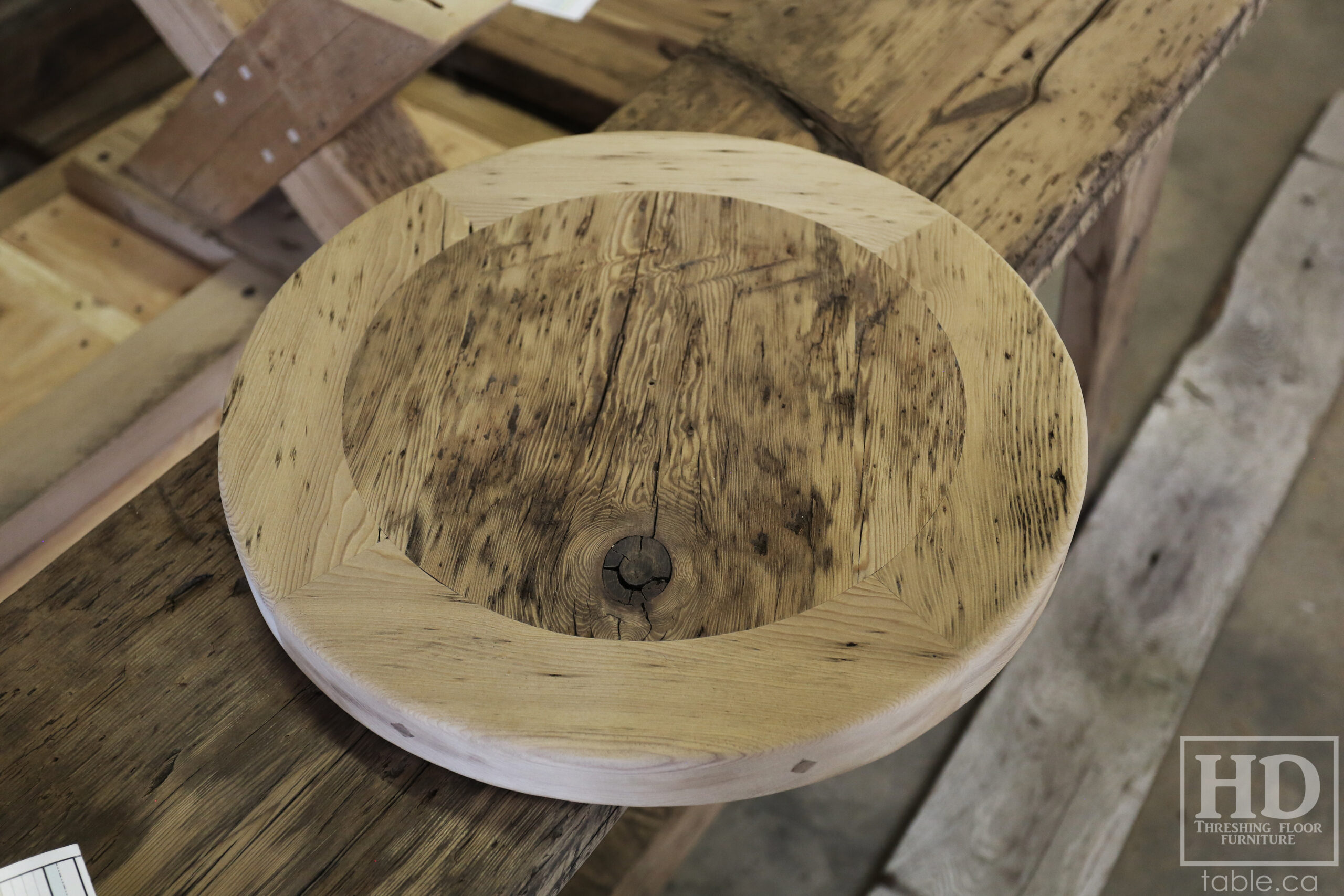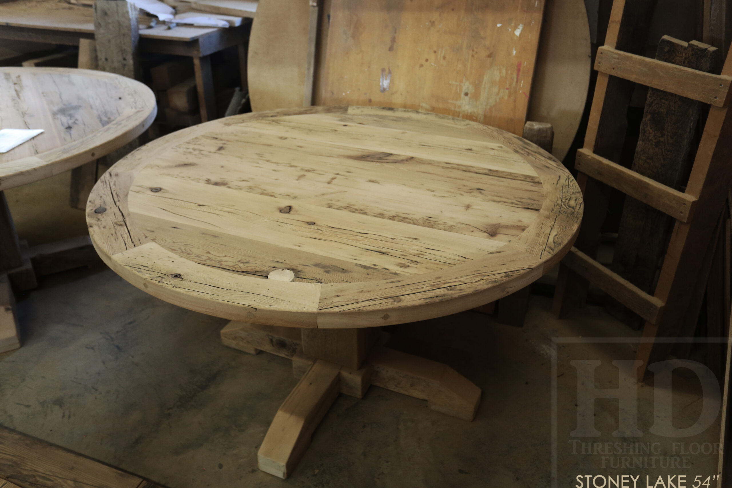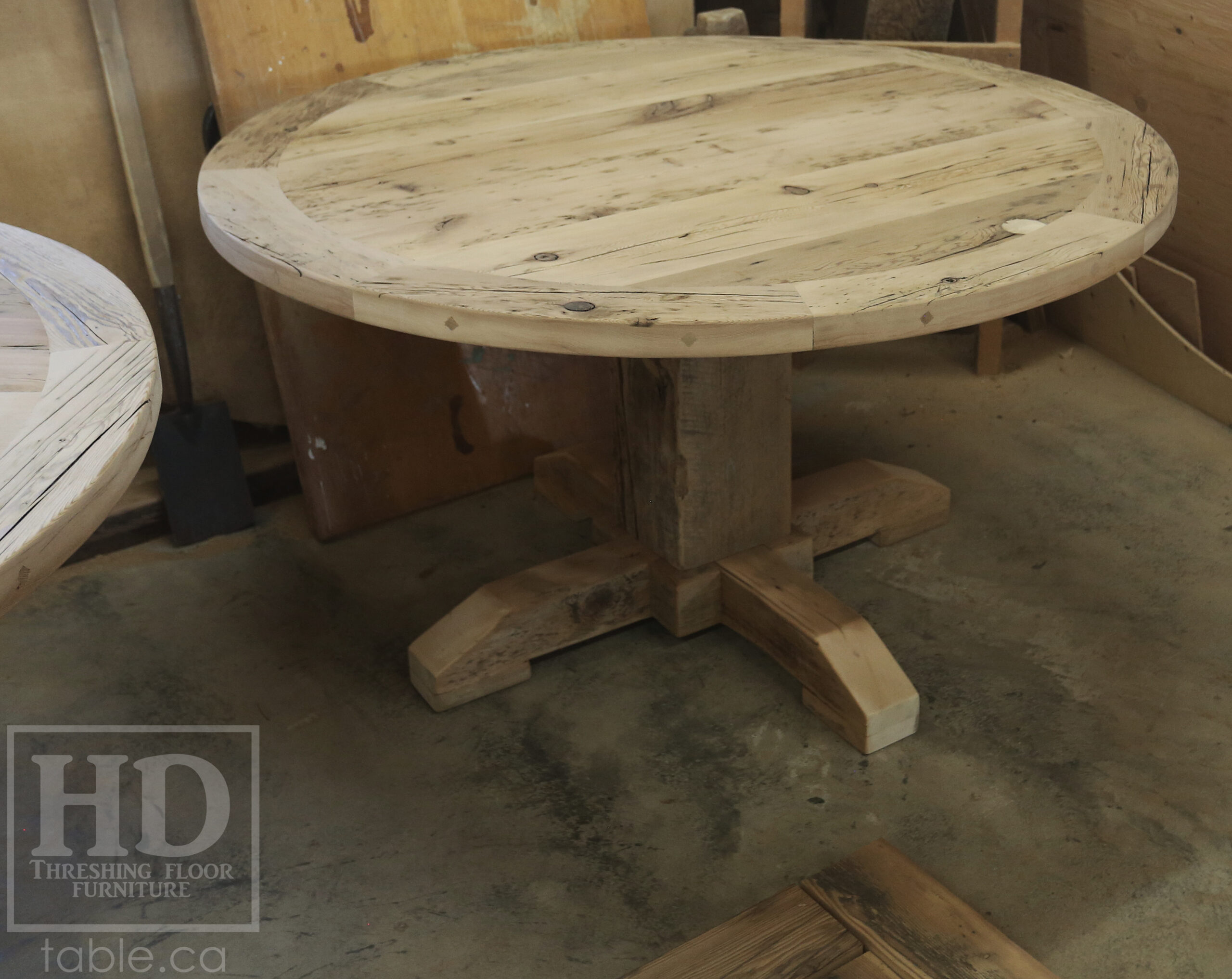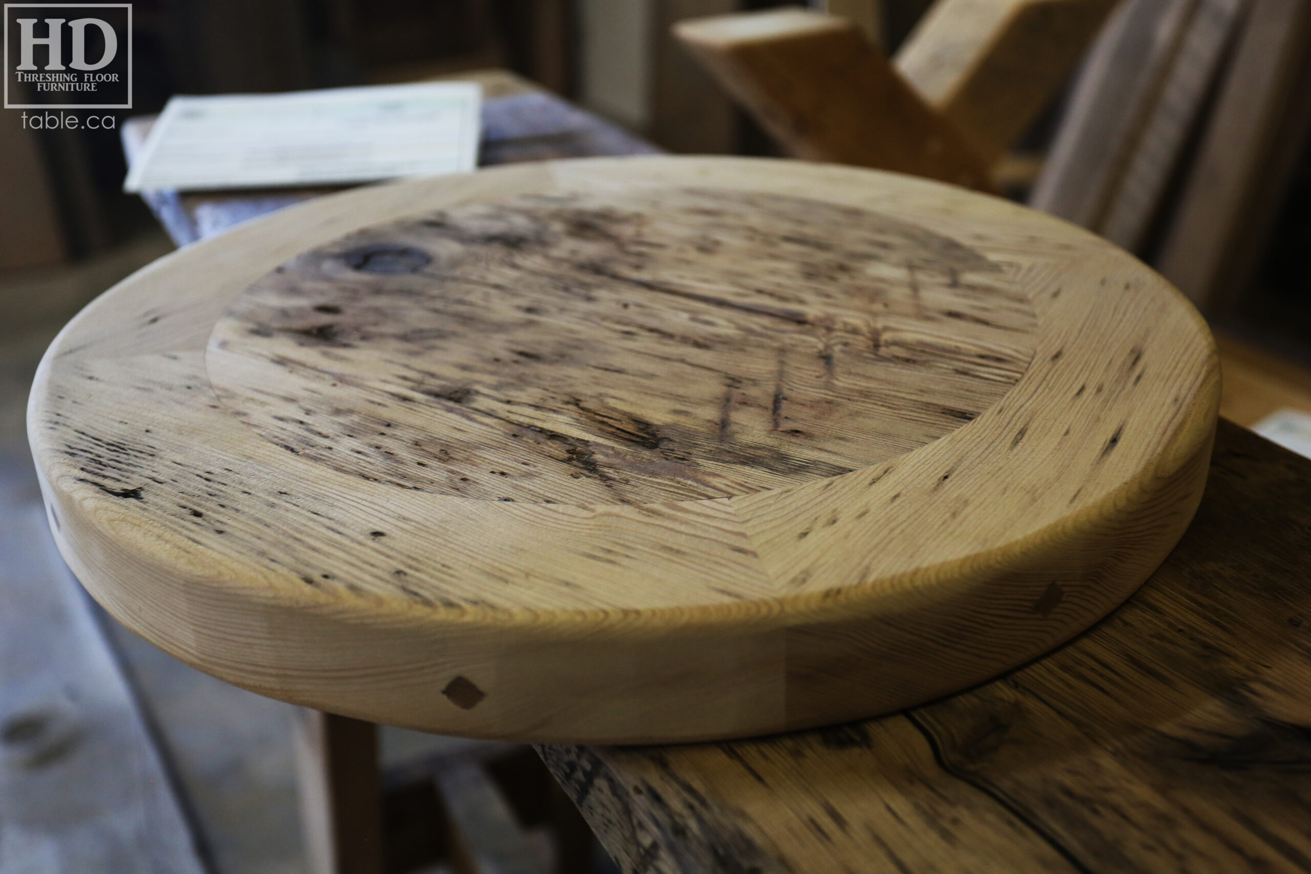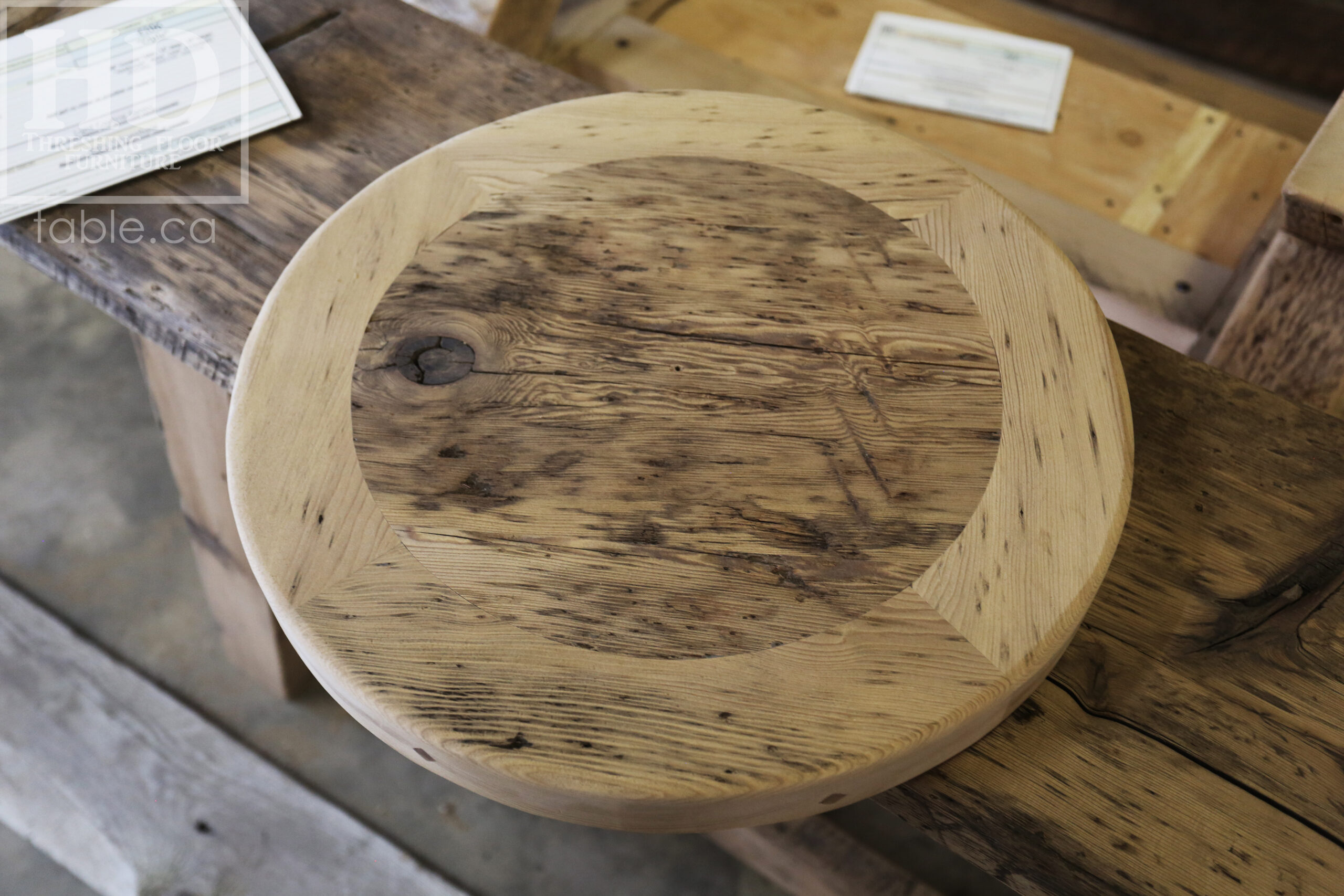 Project summary: 54†Reclaimed Ontario Barnwood Round Table we made for a Stoney Lake, Ontario cottage – Old Growth Hemlock Threshing Floor Construction – Hand-Hewn Beam Pedestal Base – Original edges & distressing maintained – Circular Bread Edge Boards – Premium epoxy + satin polyurethane finish – 18†Round Lazy Susan – www.table.ca