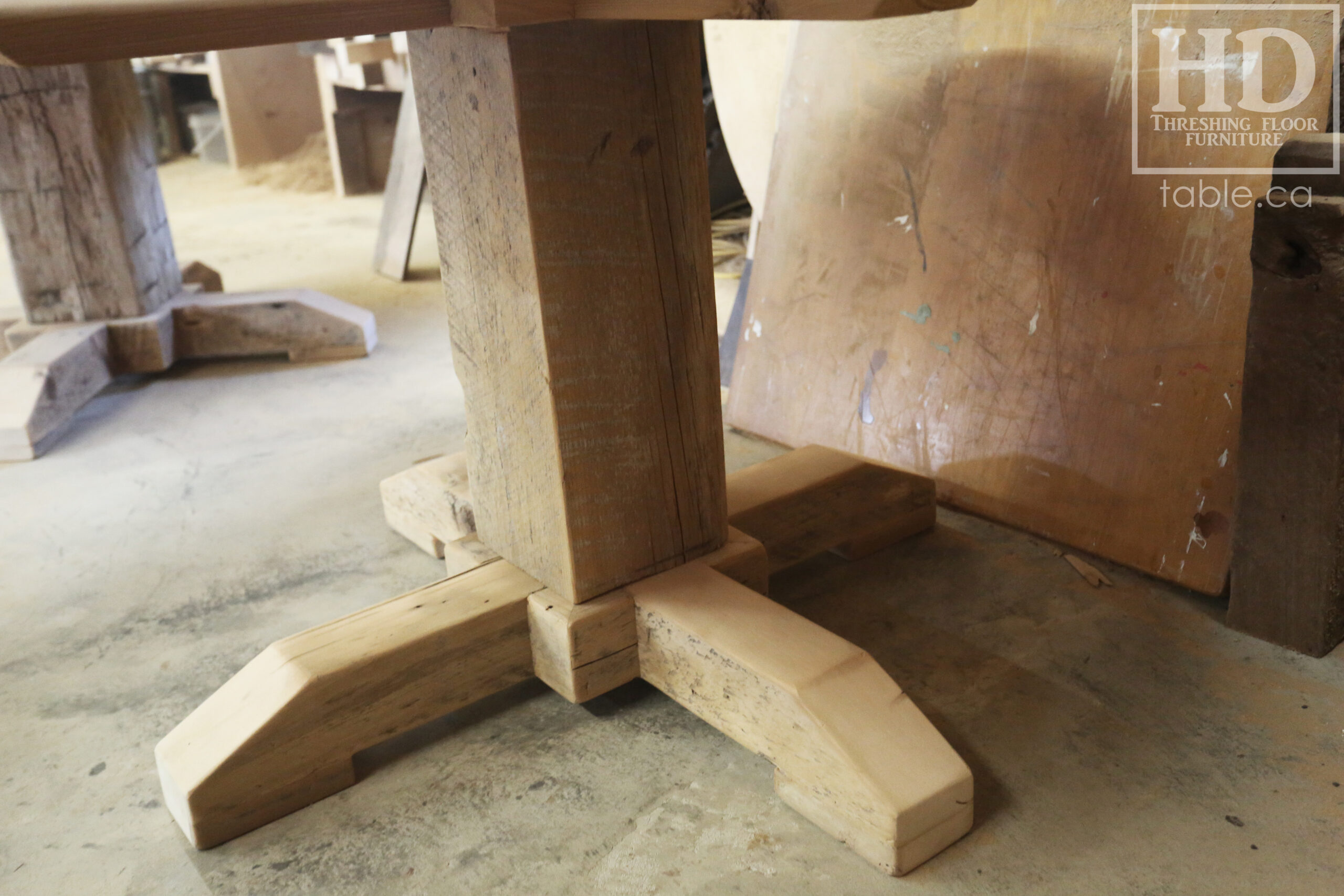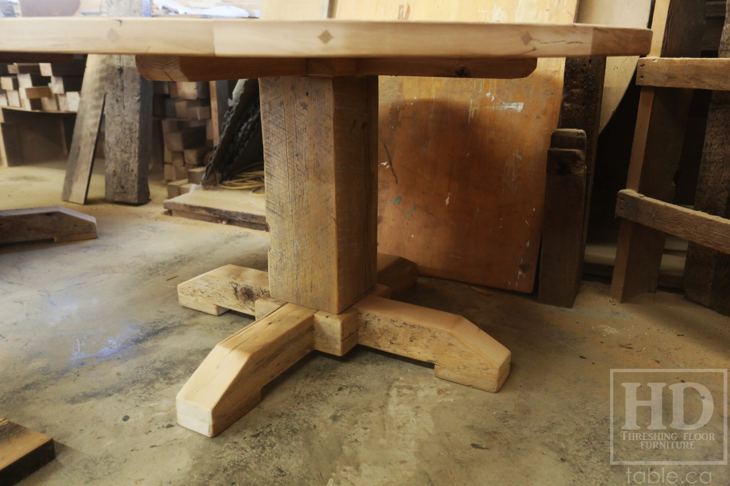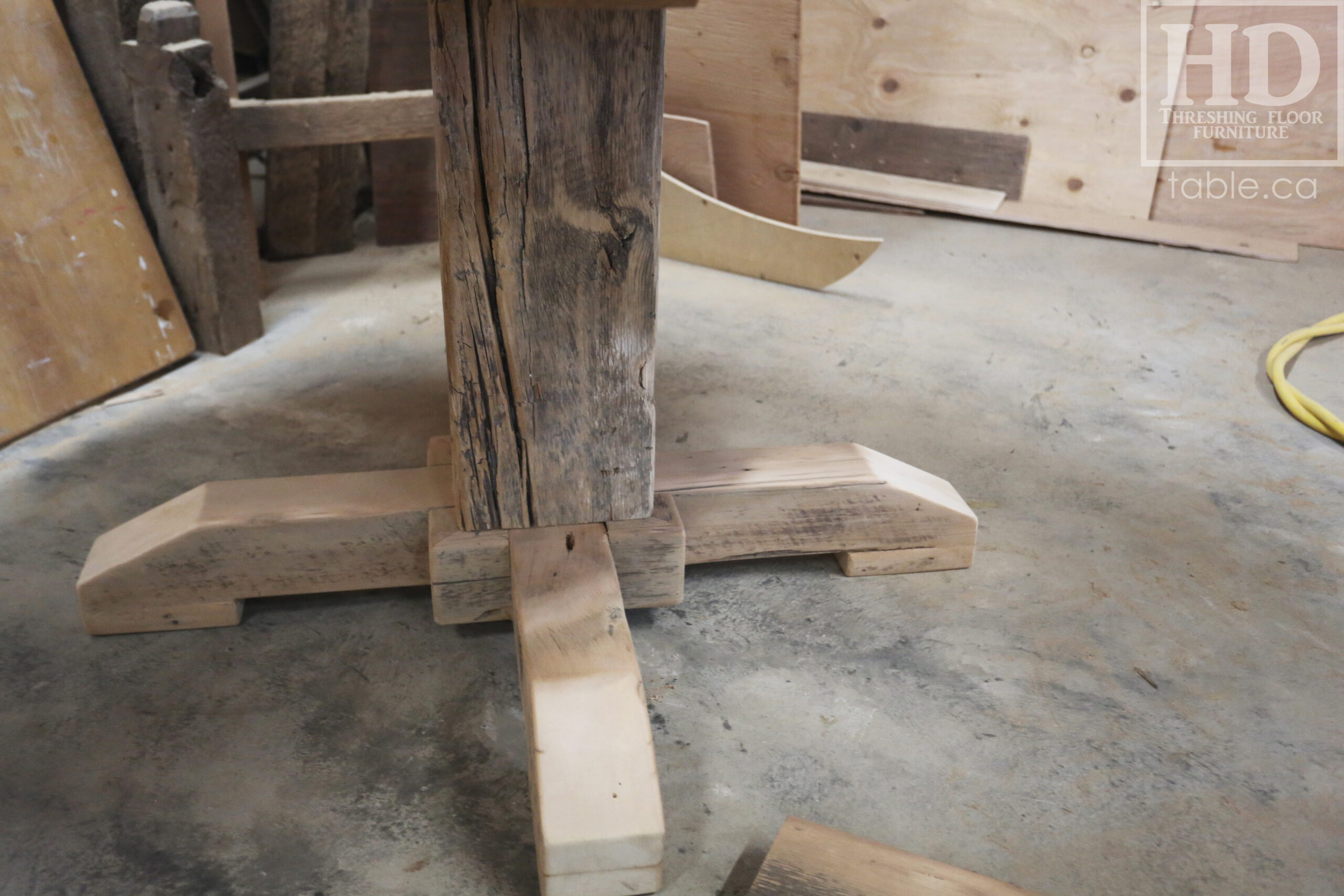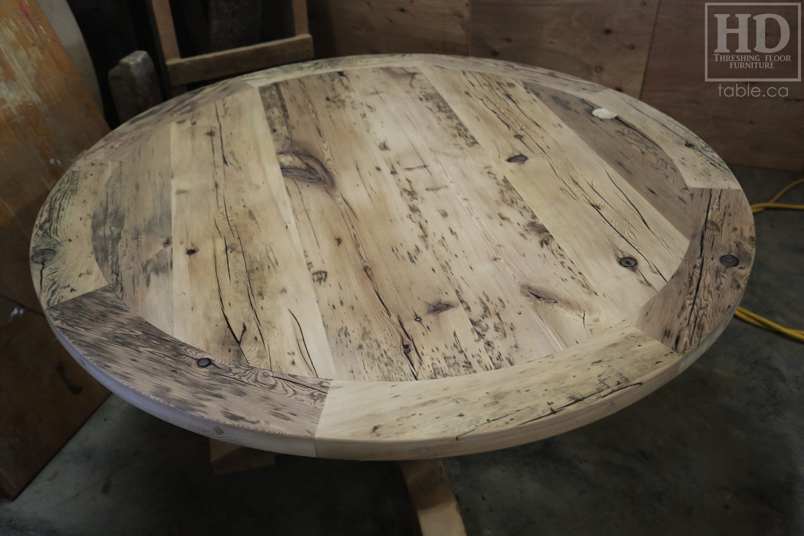Project summary: 54†Reclaimed Ontario Barnwood Round Table we made for a Stoney Lake, Ontario cottage – Old Growth Hemlock Threshing Floor Construction – Hand-Hewn Beam Pedestal Base – Original edges & distressing maintained – Circular Bread Edge Boards – Premium epoxy + satin polyurethane finish – 18†Round Lazy Susan – www.table.ca