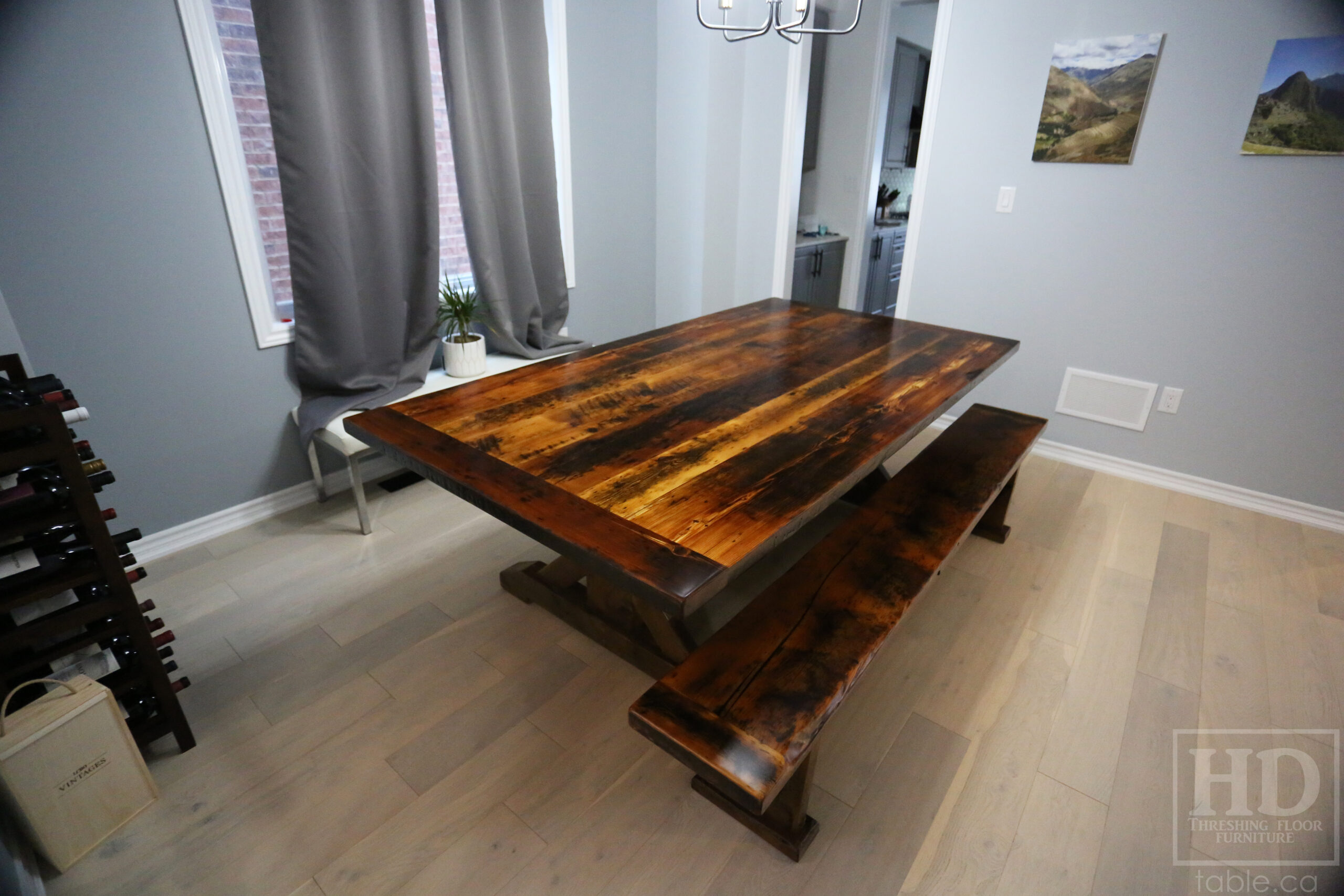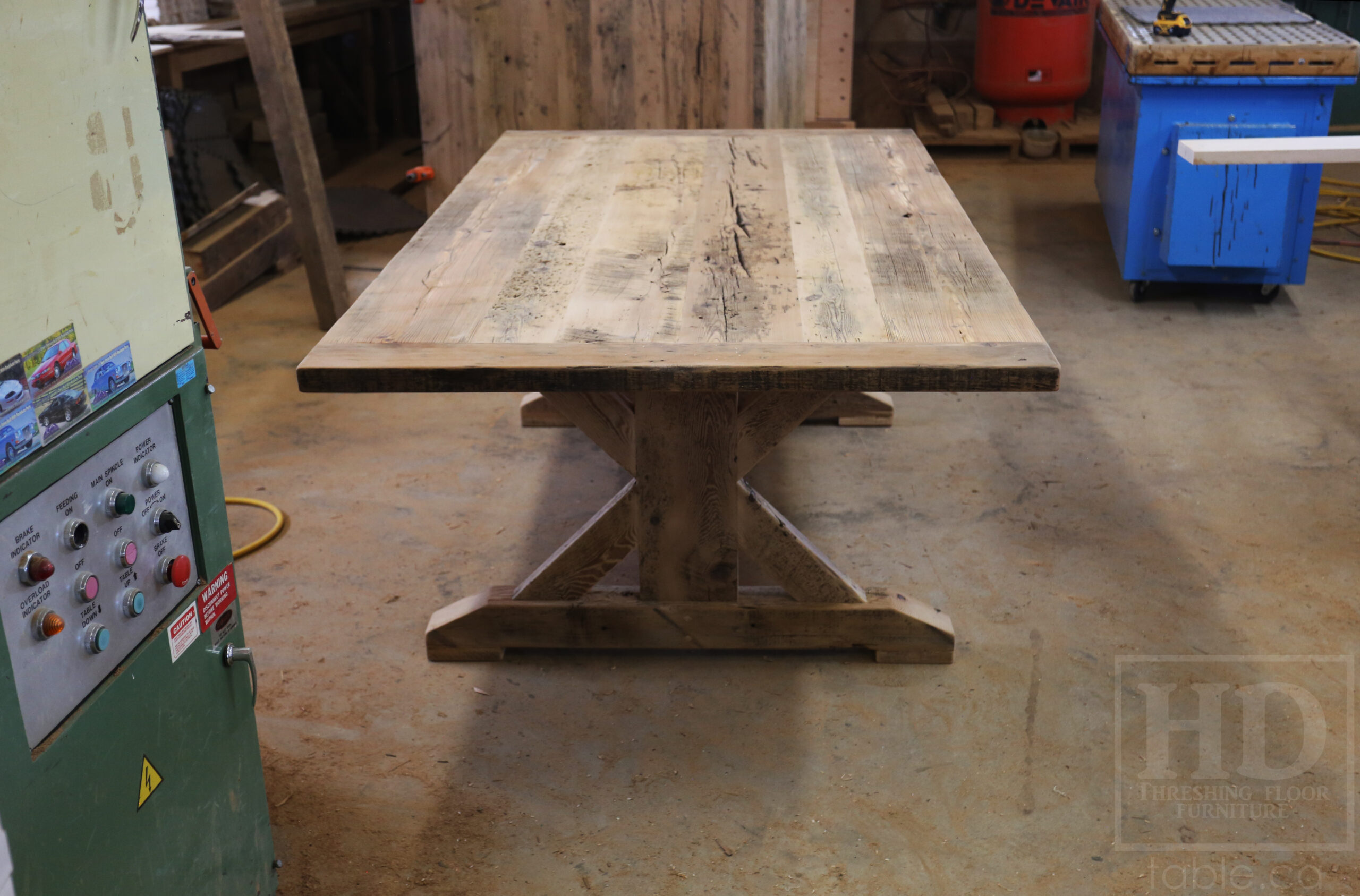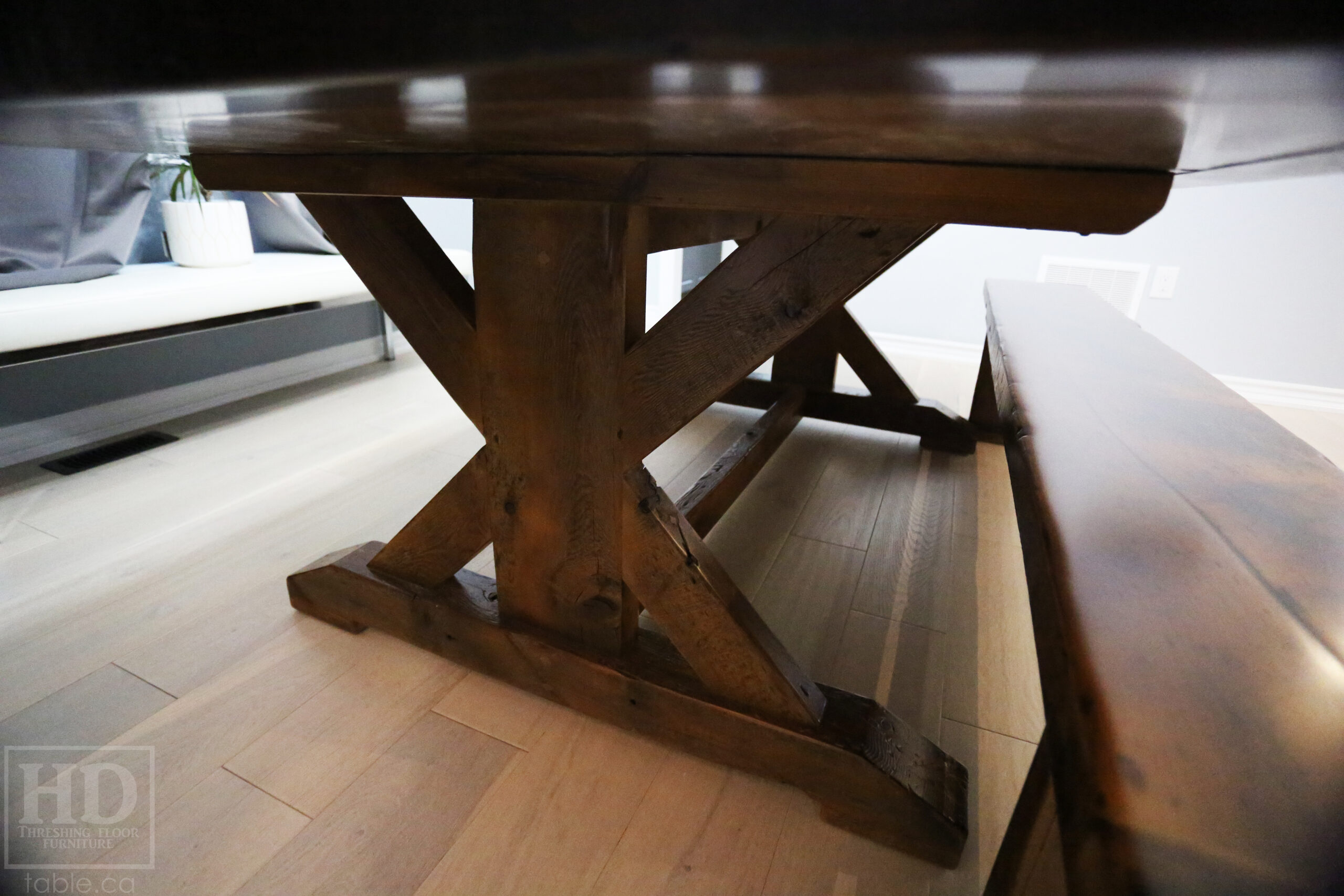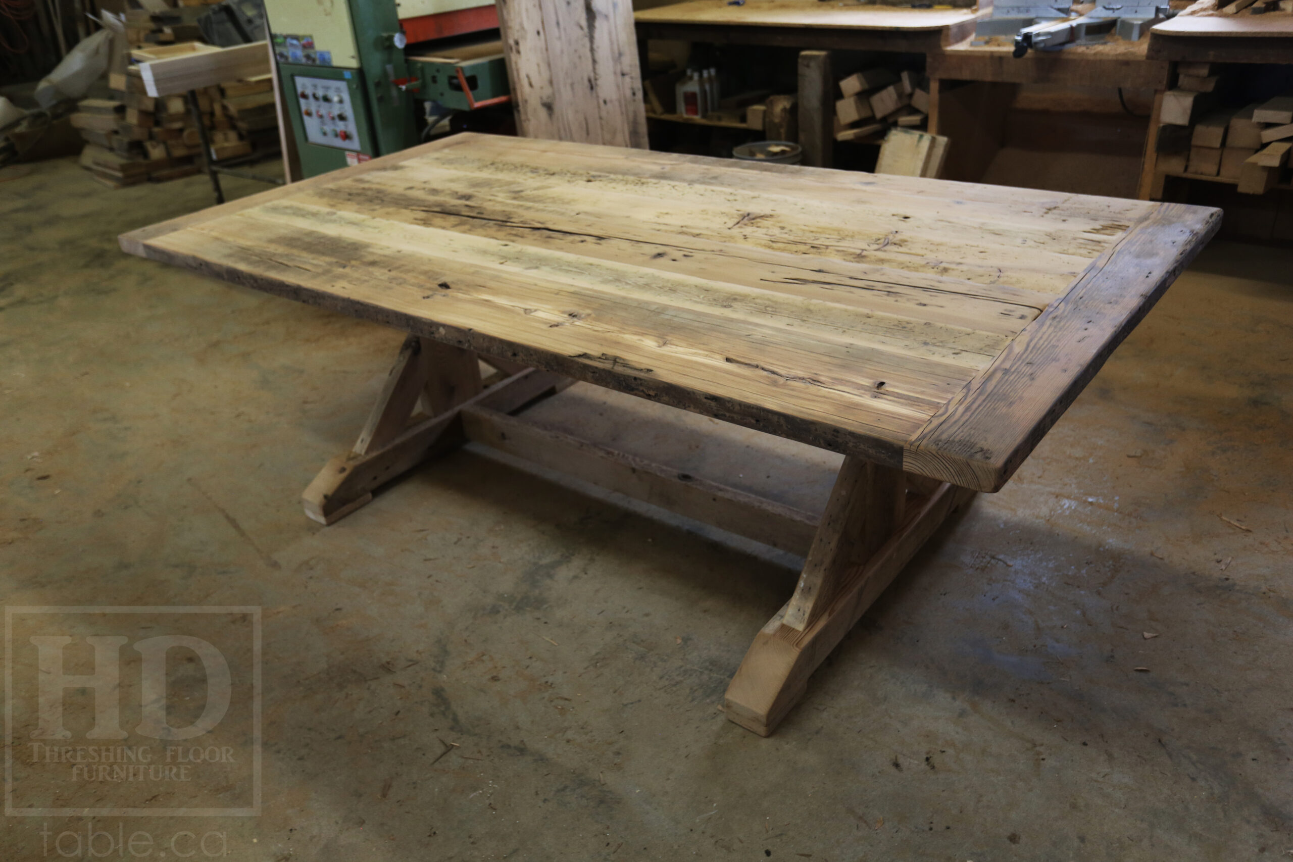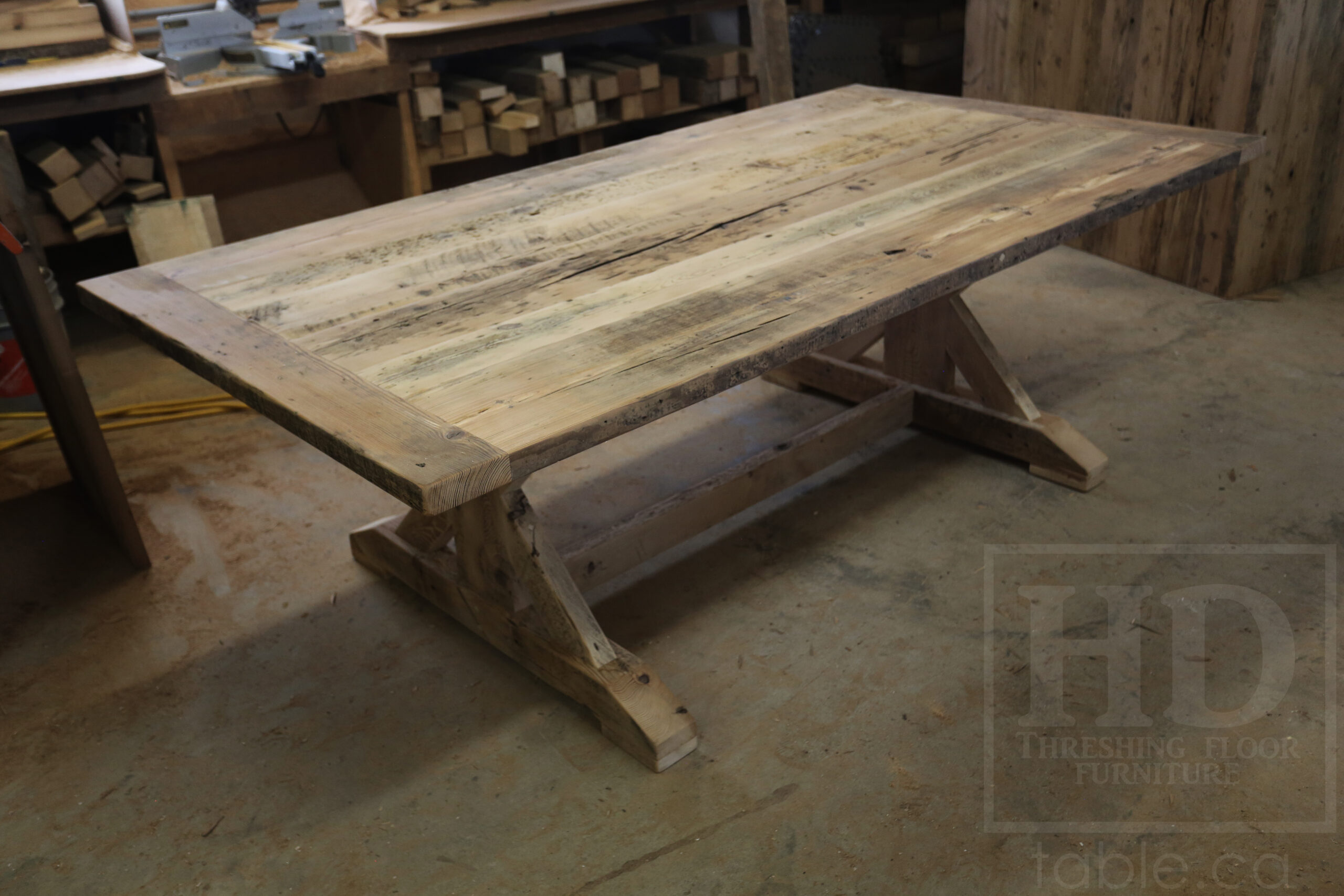 Project Summary: 7’ 6†Reclaimed Ontario Barnwood Table we made for a Fergus, Ontario home – 48†wide – Sawbuck Base – Old Growth Hemlock Threshing Floor Construction – Original edges & distressing maintained – Bread Edge Boards – Premium epoxy + satin polyurethane finish – 7’ 6†[matching] Trestle Bench – www.table.ca