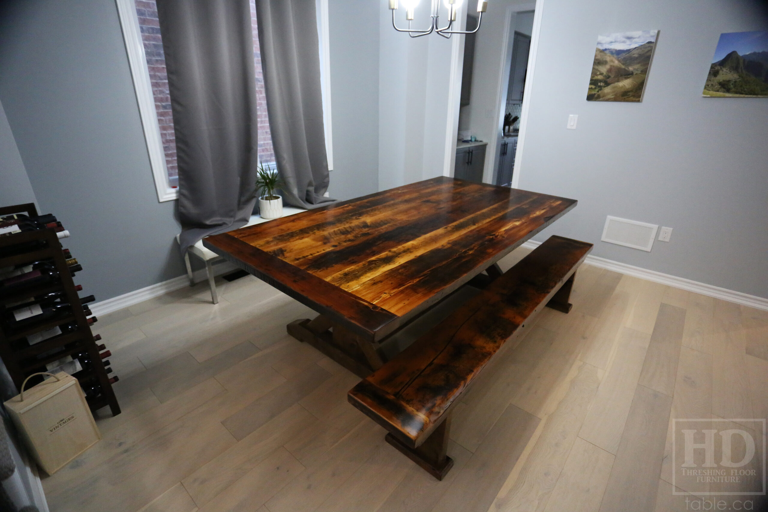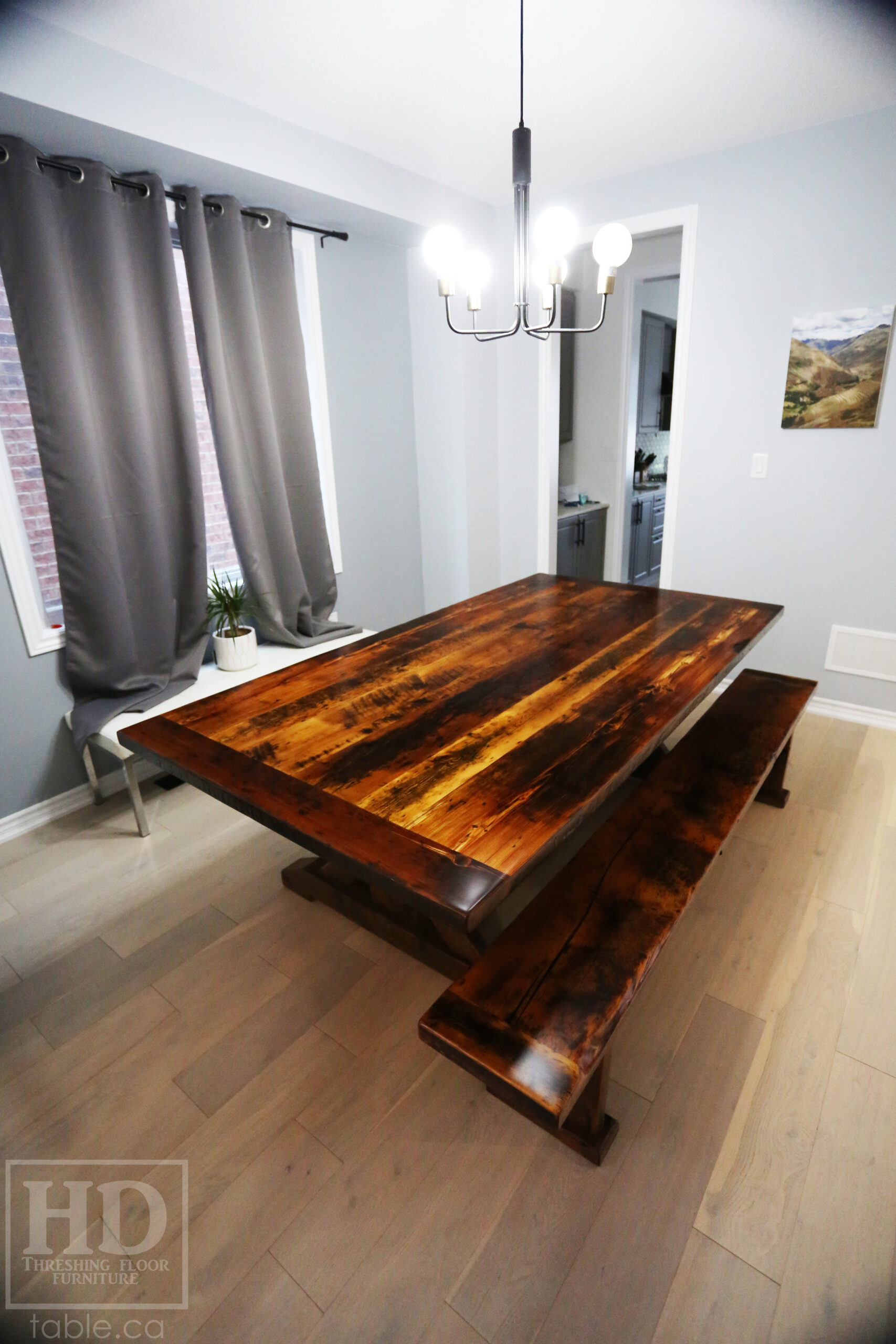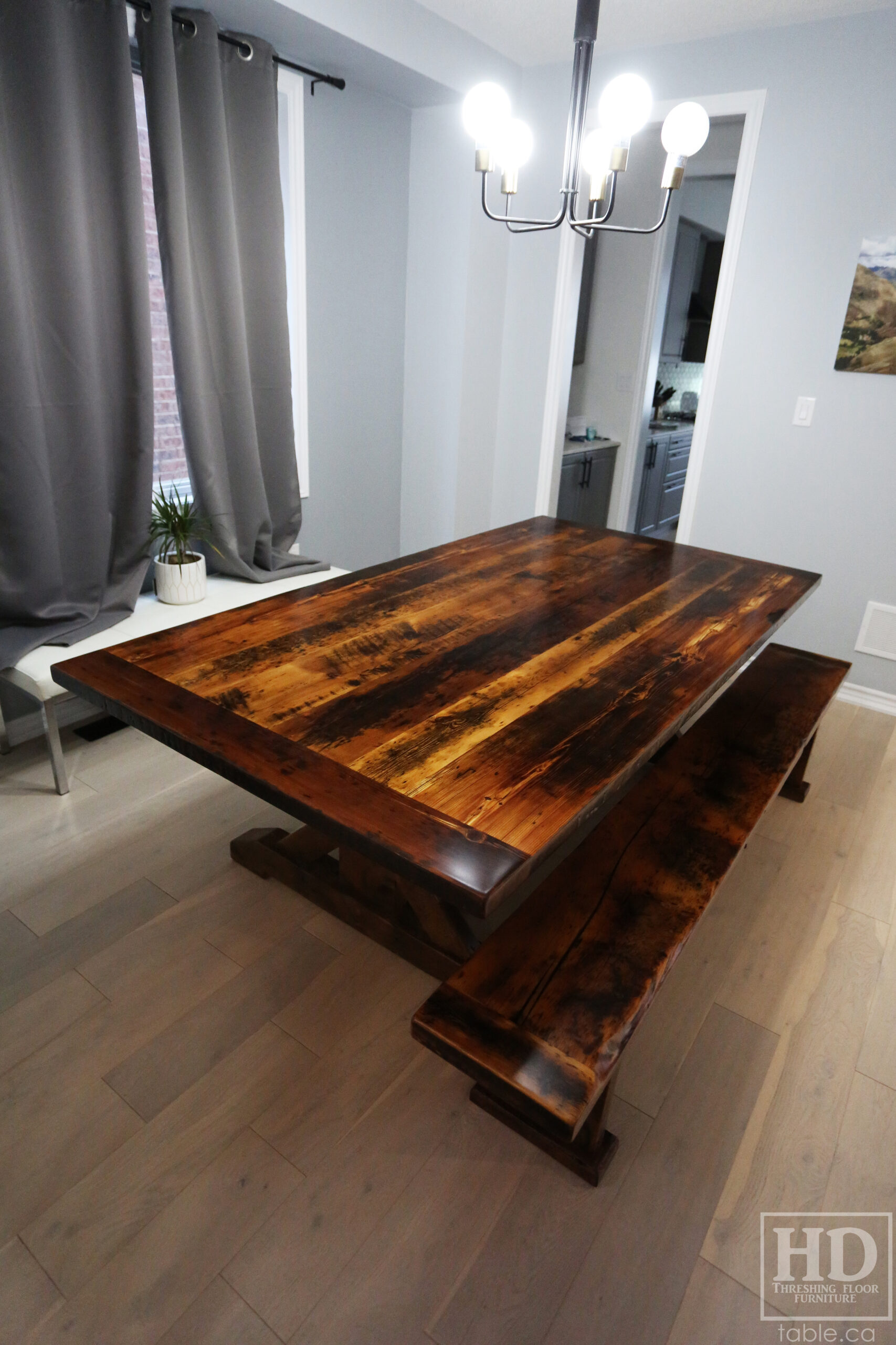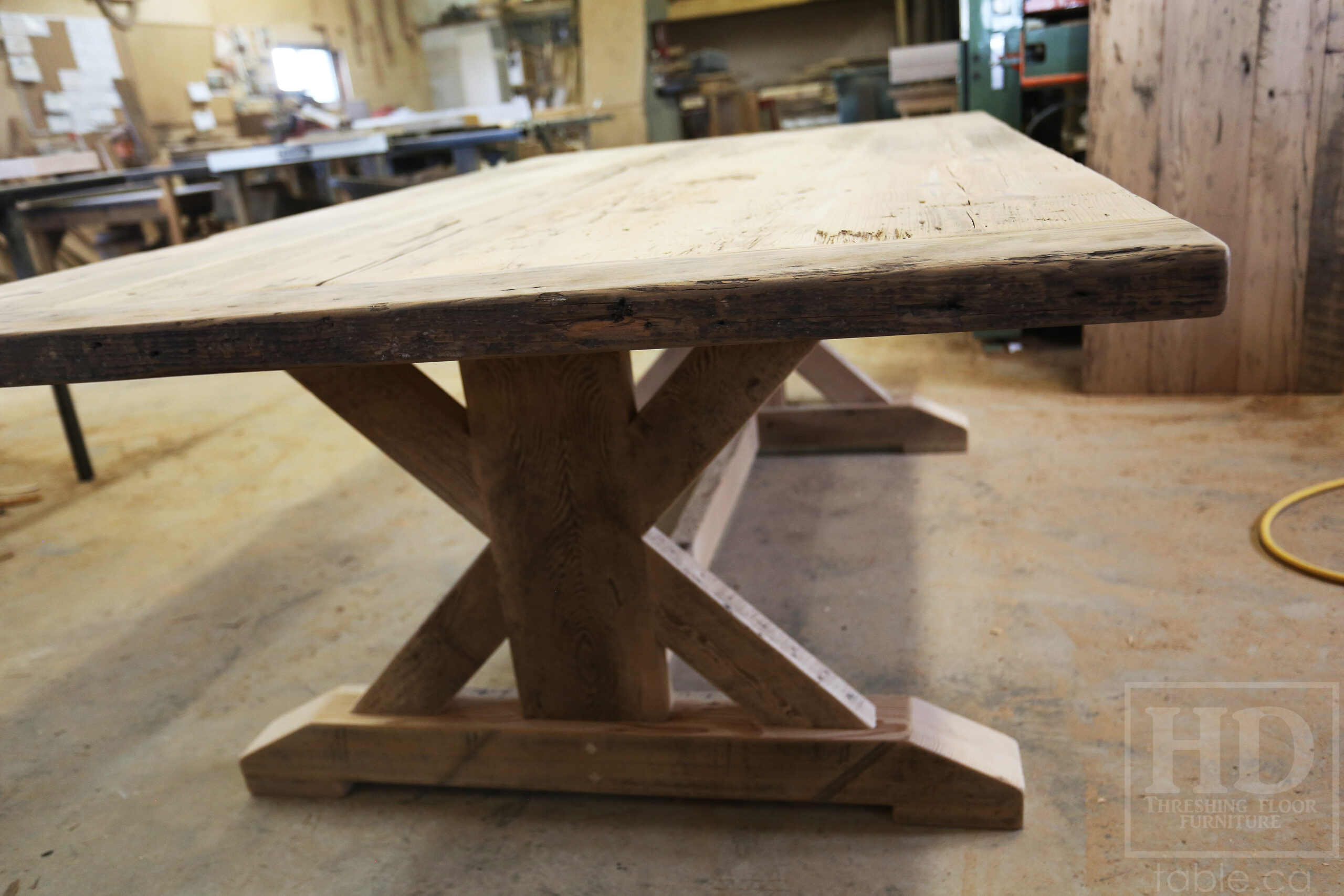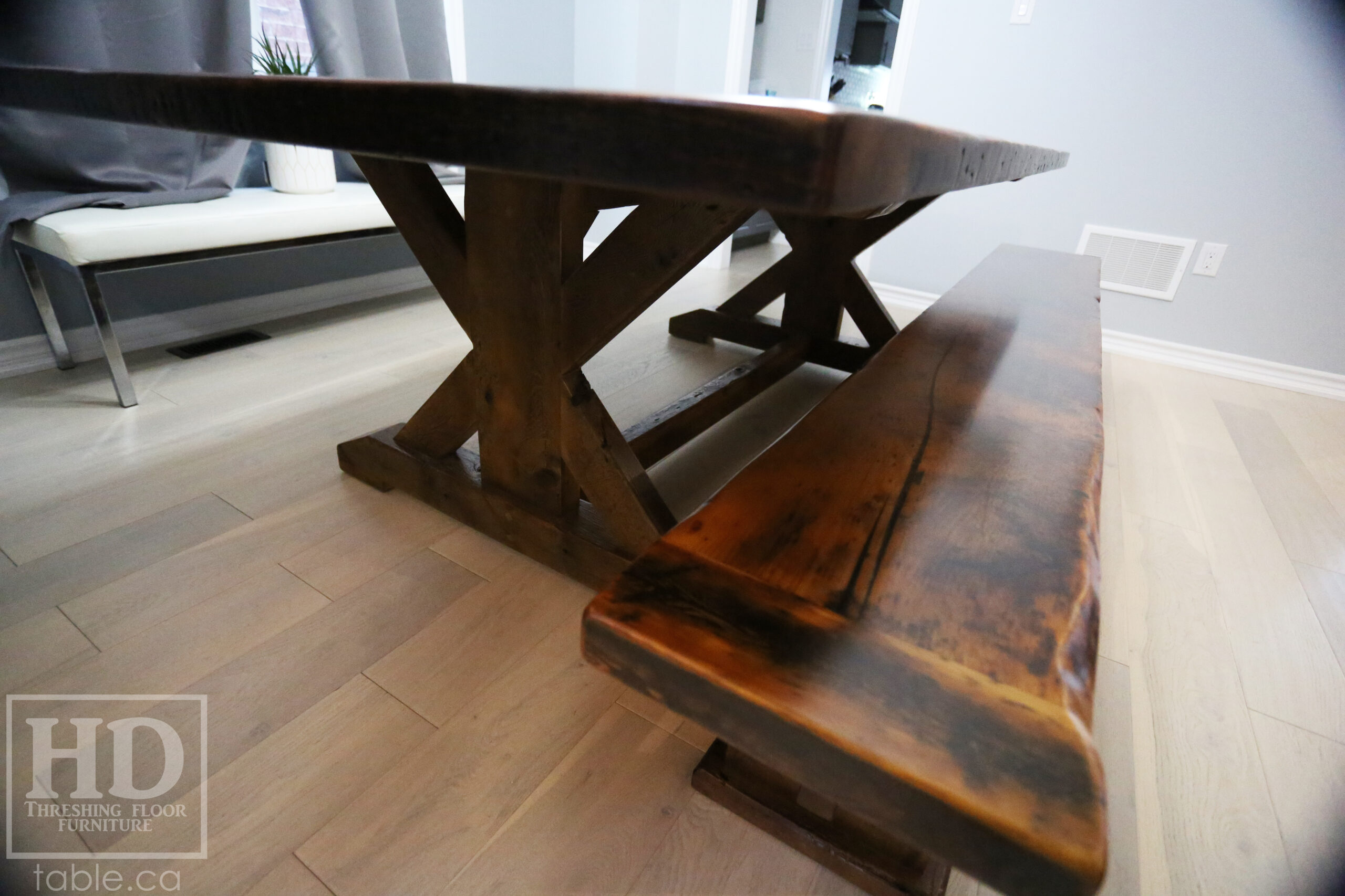 Project Summary: 7’ 6†Reclaimed Ontario Barnwood Table we made for a Fergus, Ontario home – 48†wide – Sawbuck Base – Old Growth Hemlock Threshing Floor Construction – Original edges & distressing maintained – Bread Edge Boards – Premium epoxy + satin polyurethane finish – 7’ 6†[matching] Trestle Bench – www.table.ca