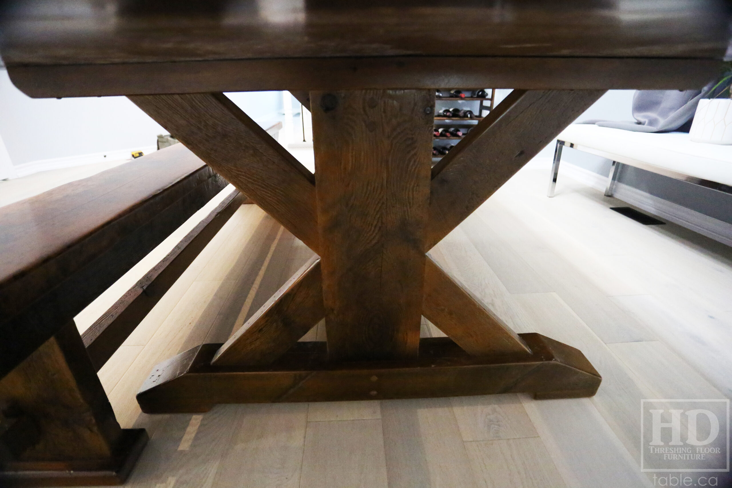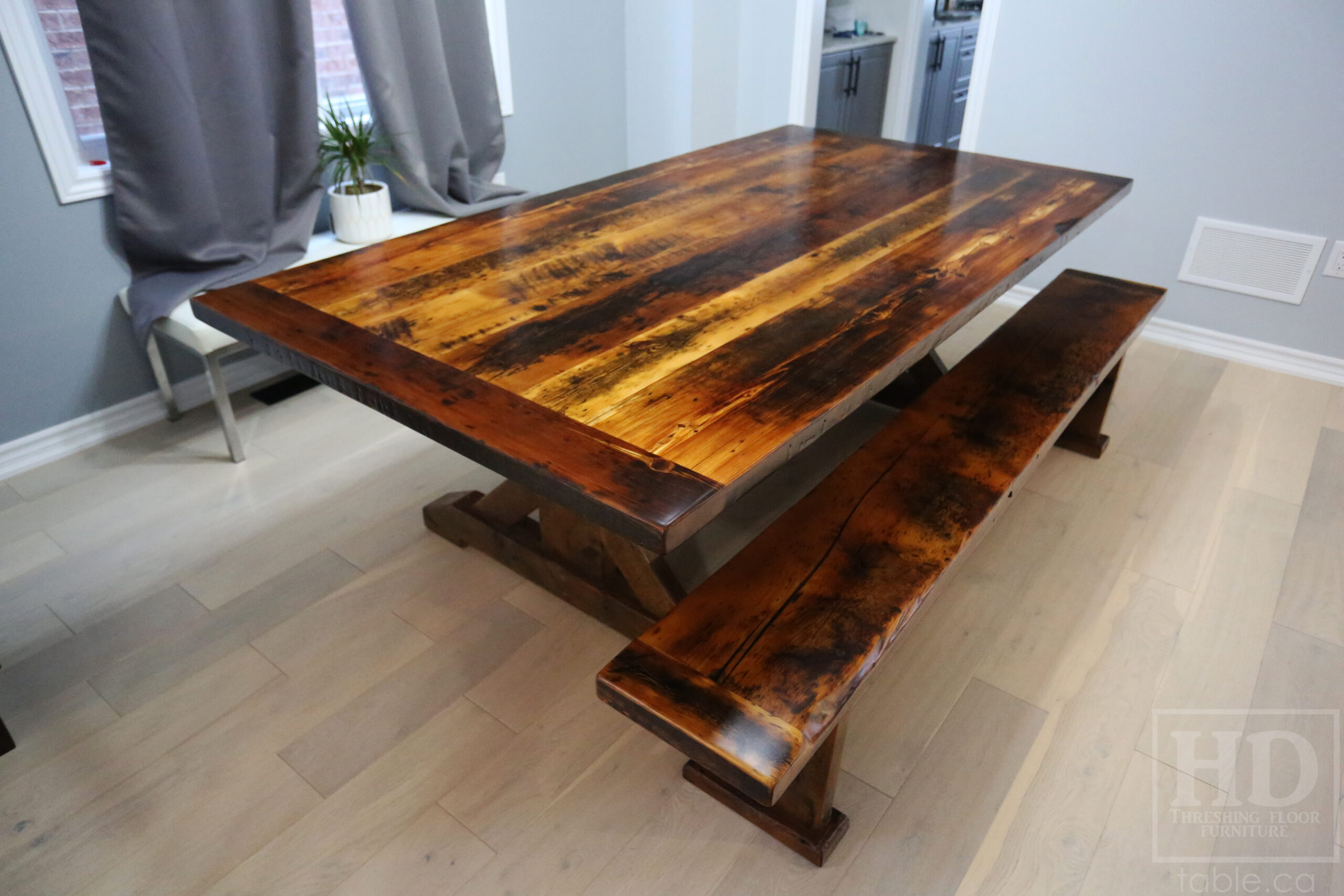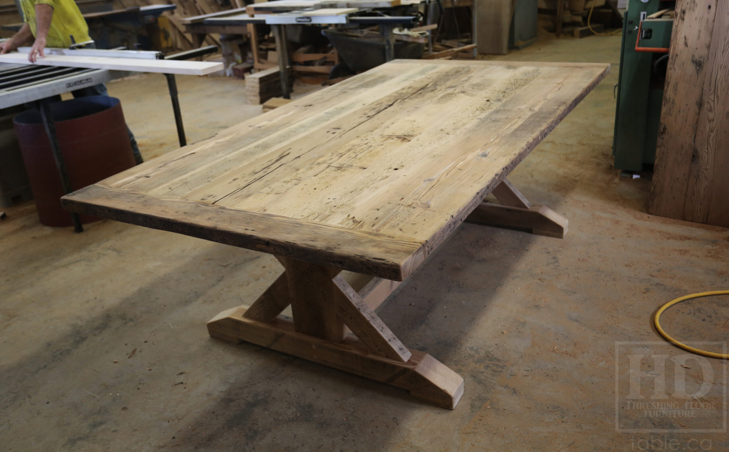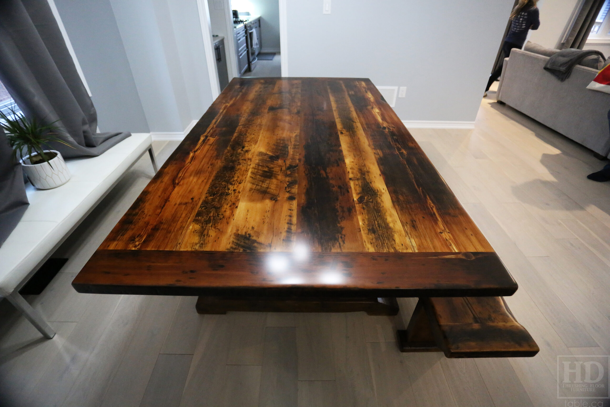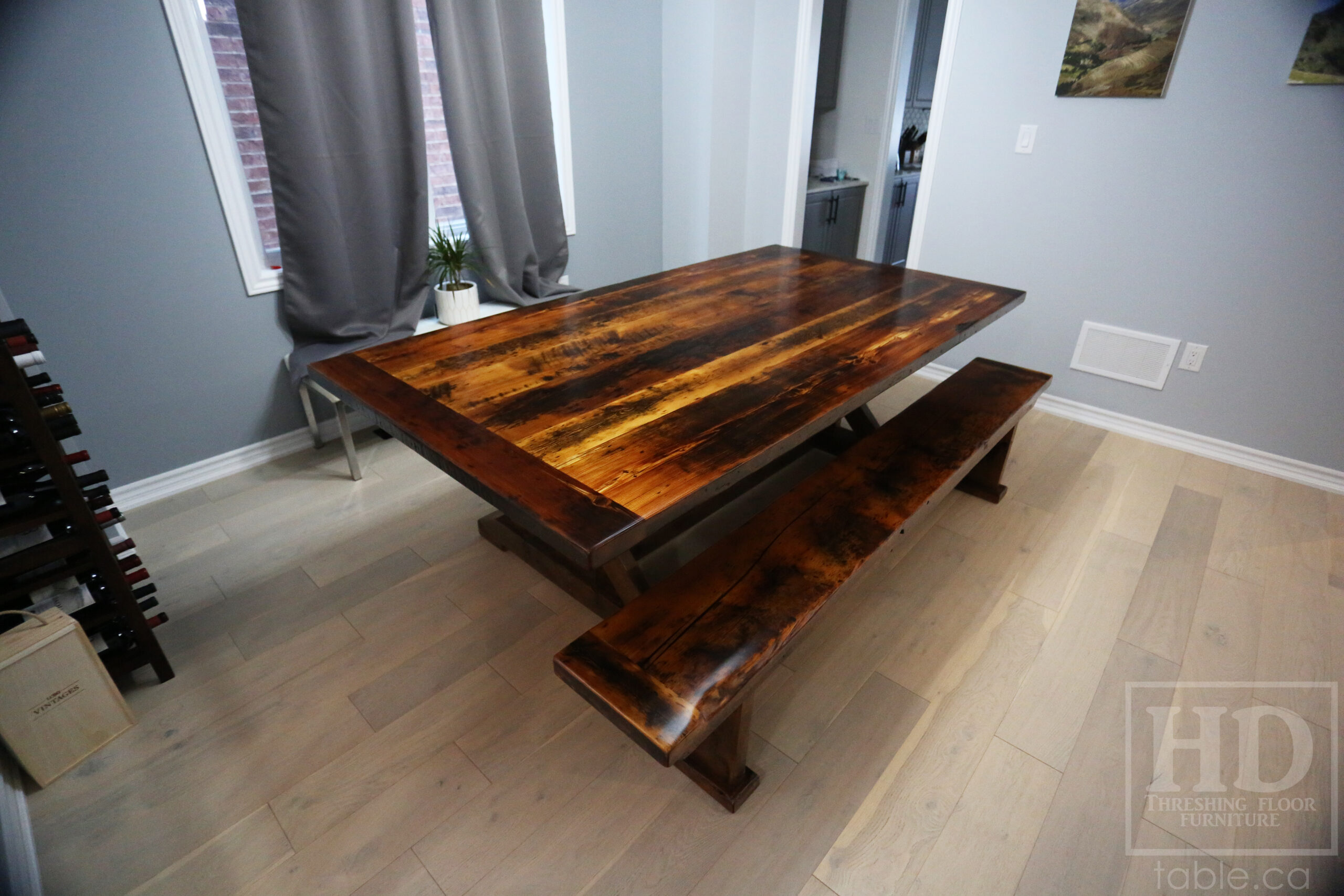 Project Summary: 7’ 6†Reclaimed Ontario Barnwood Table we made for a Fergus, Ontario home – 48†wide – Sawbuck Base – Old Growth Hemlock Threshing Floor Construction – Original edges & distressing maintained – Bread Edge Boards – Premium epoxy + satin polyurethane finish – 7’ 6†[matching] Trestle Bench – www.table.ca
