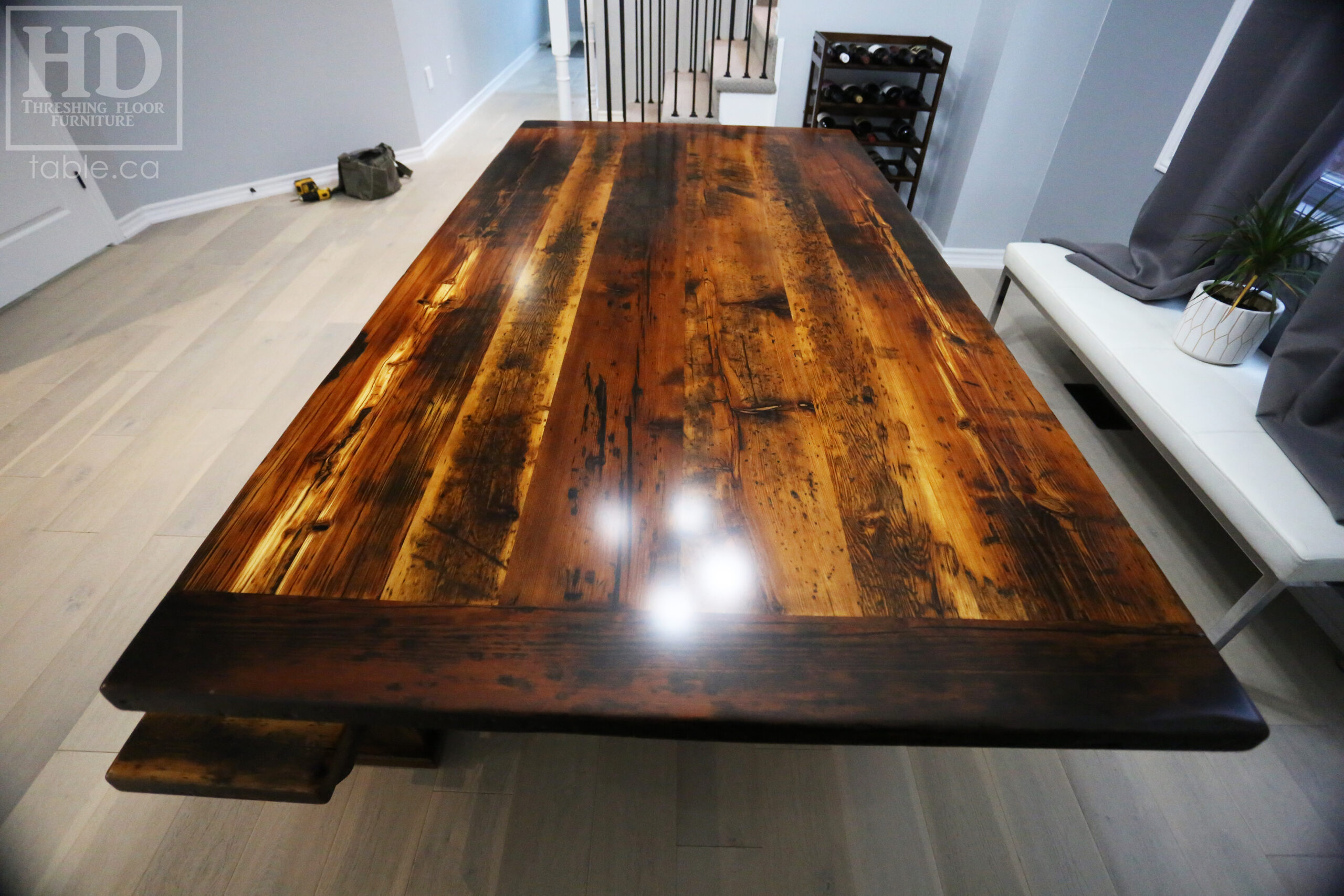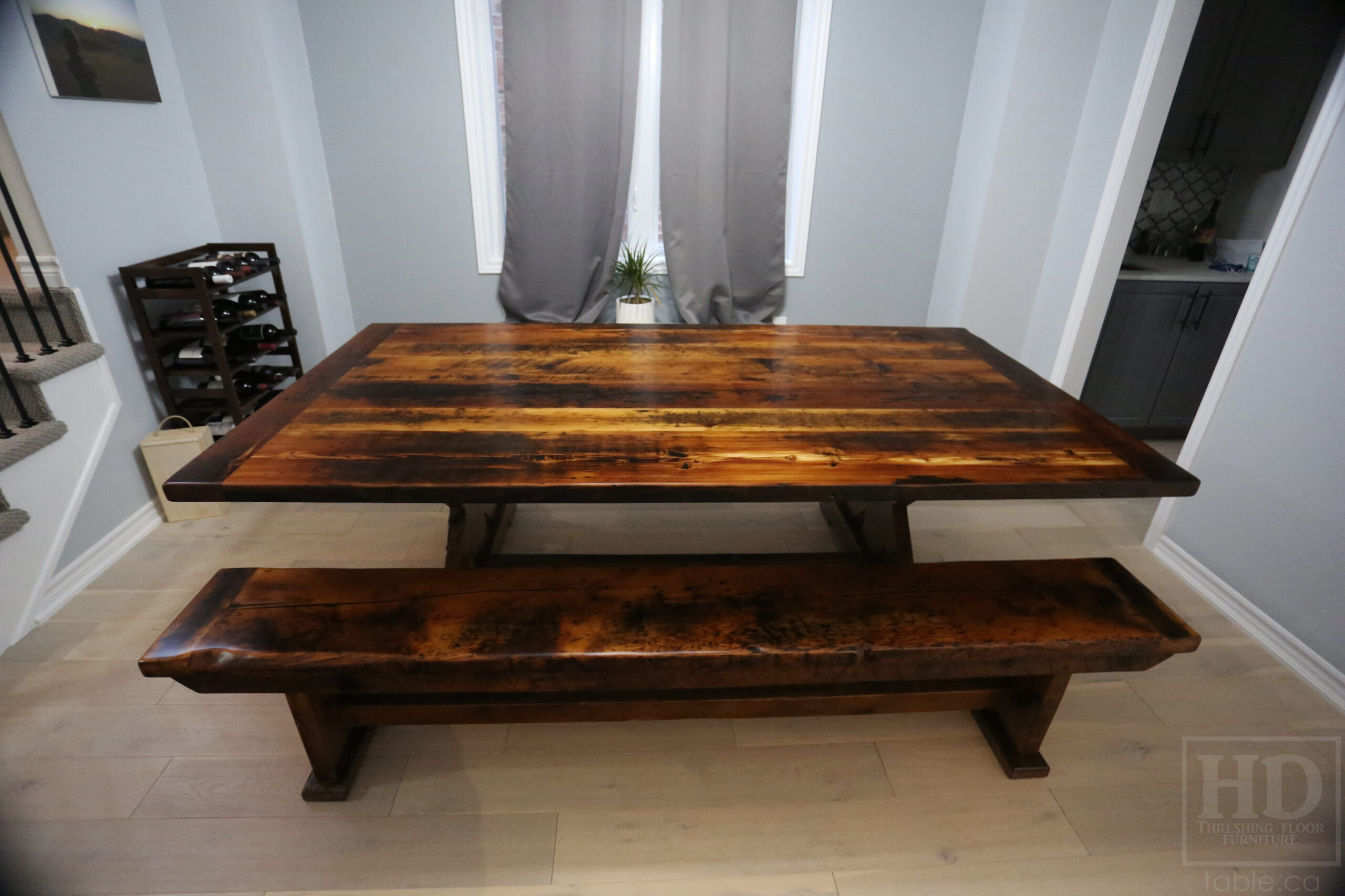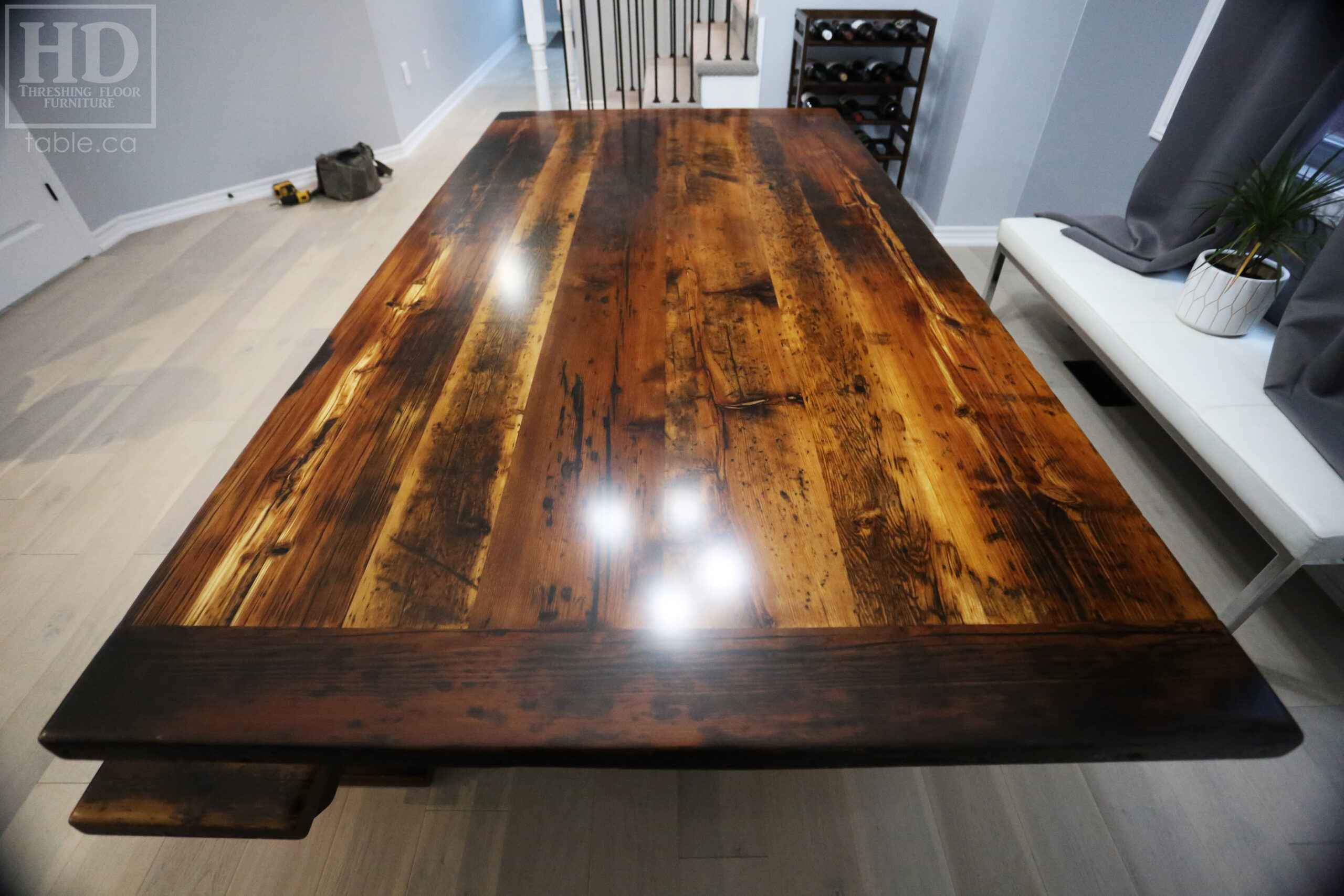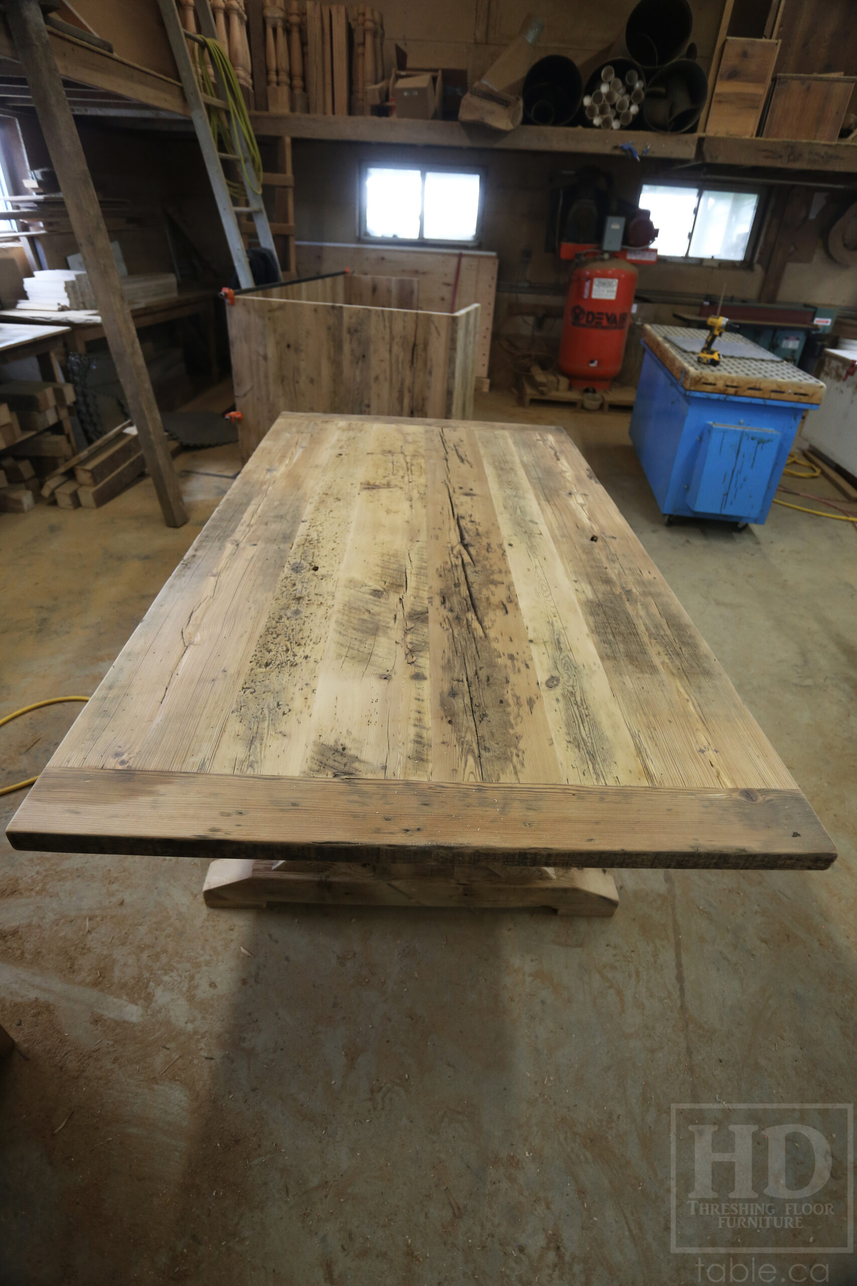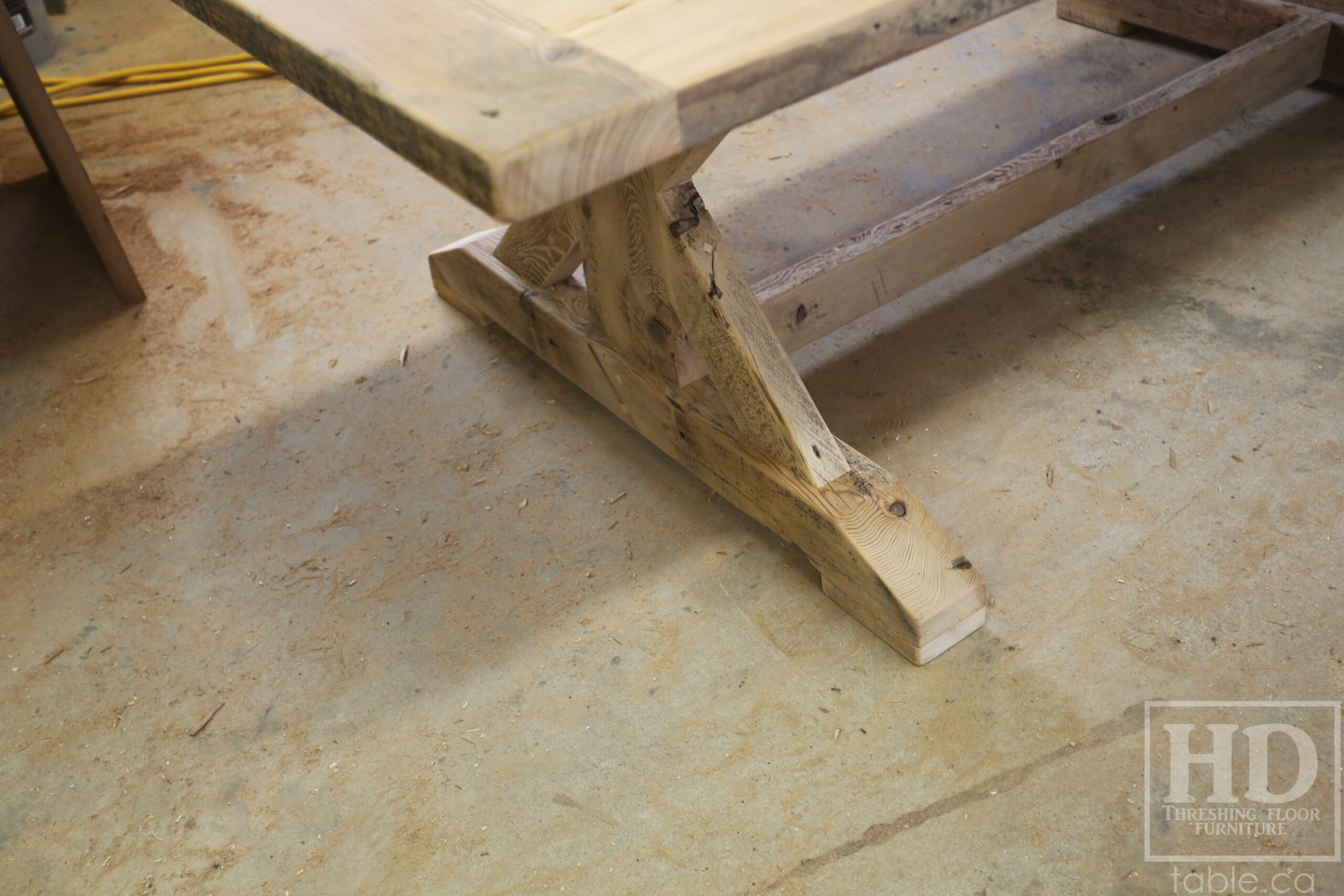 Project Summary: 7’ 6†Reclaimed Ontario Barnwood Table we made for a Fergus, Ontario home – 48†wide – Sawbuck Base – Old Growth Hemlock Threshing Floor Construction – Original edges & distressing maintained – Bread Edge Boards – Premium epoxy + satin polyurethane finish – 7’ 6†[matching] Trestle Bench – www.table.ca