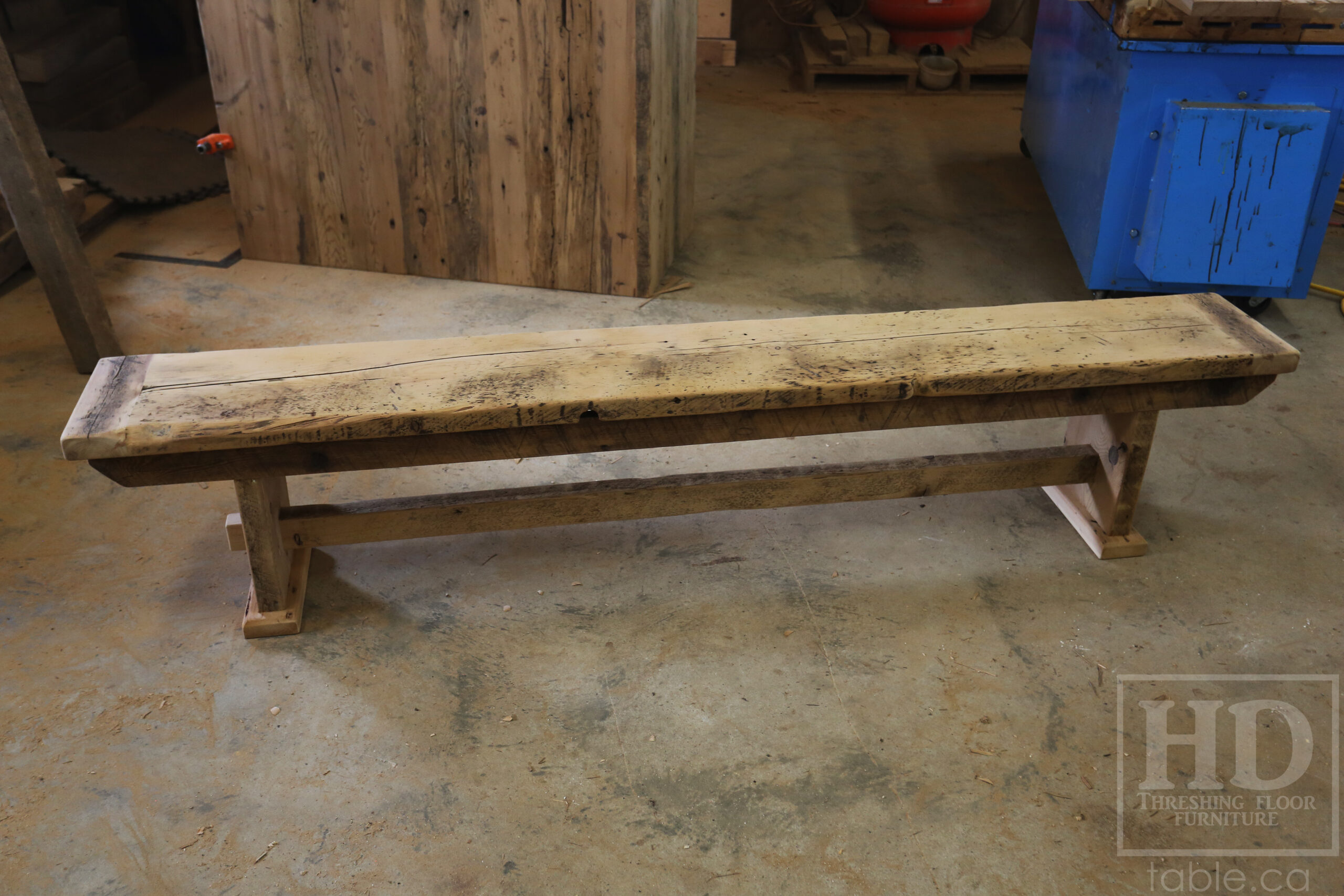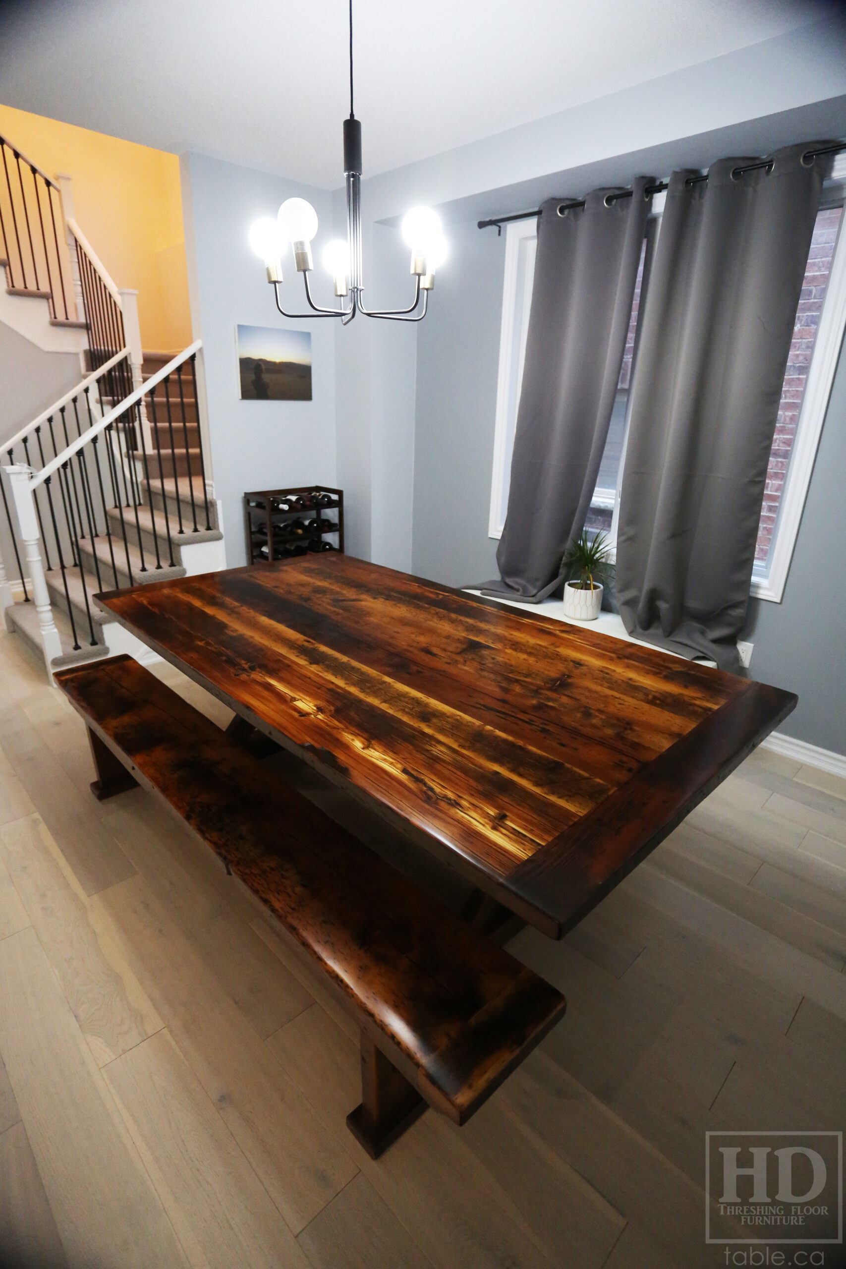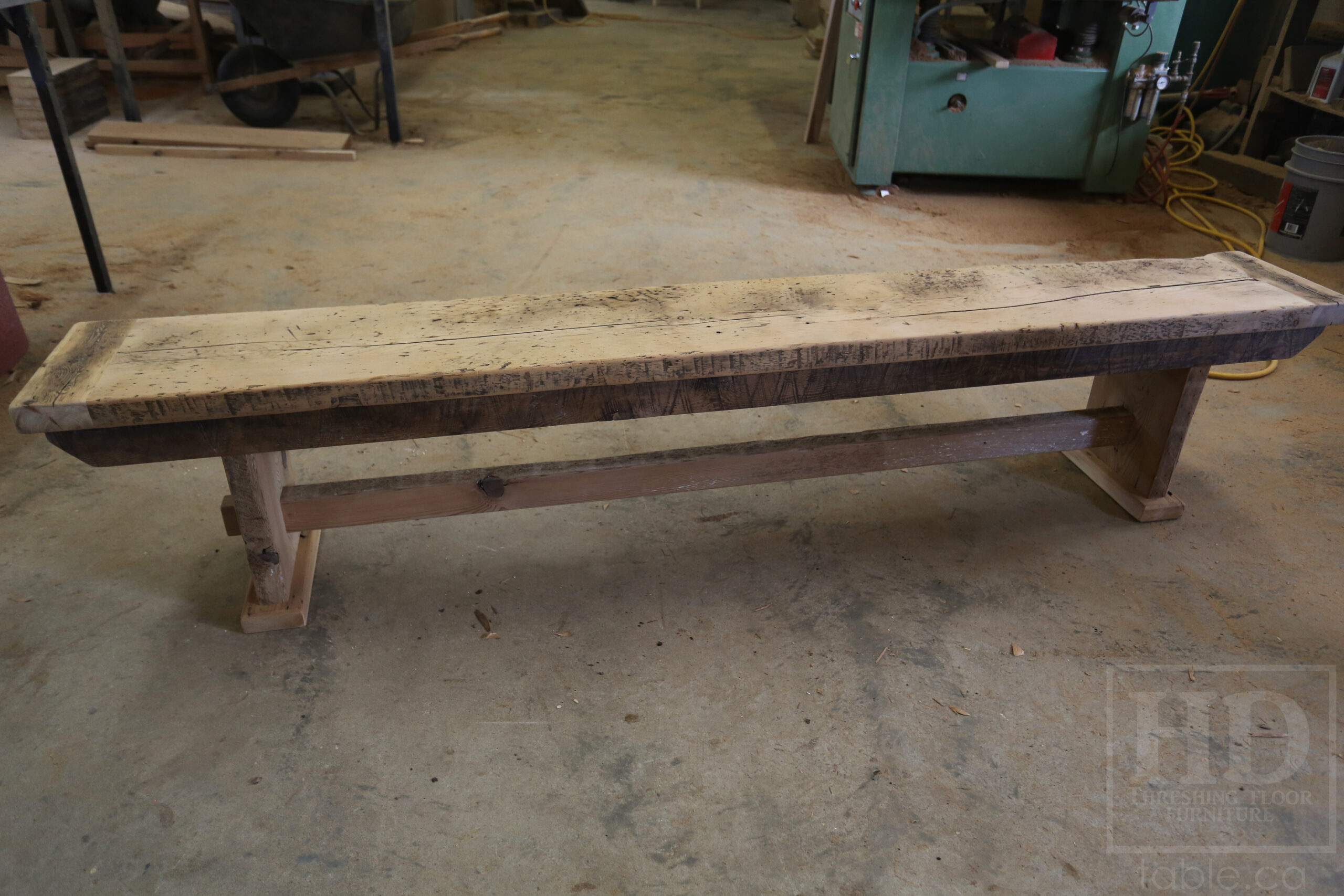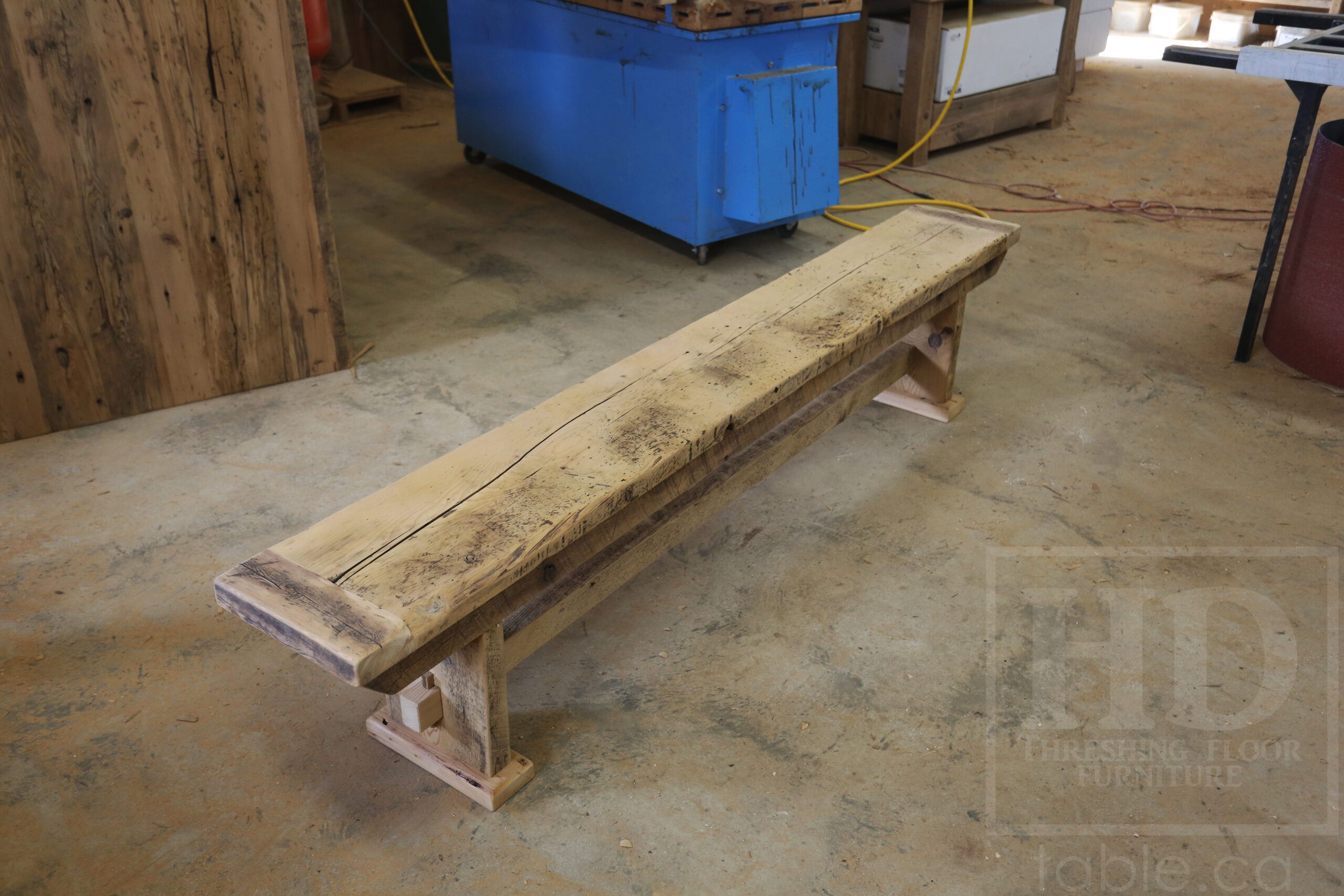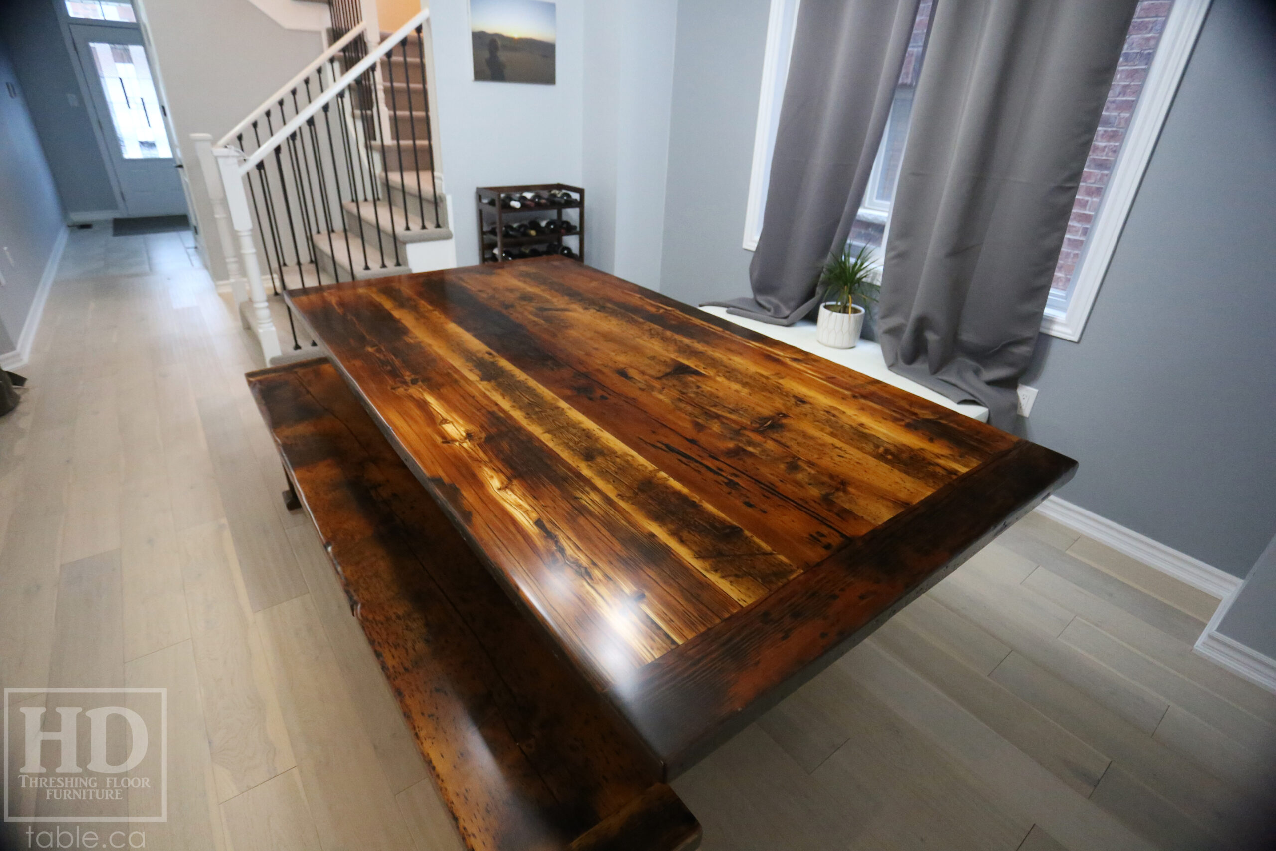 Project Summary: 7’ 6†Reclaimed Ontario Barnwood Table we made for a Fergus, Ontario home – 48†wide – Sawbuck Base – Old Growth Hemlock Threshing Floor Construction – Original edges & distressing maintained – Bread Edge Boards – Premium epoxy + satin polyurethane finish – 7’ 6†[matching] Trestle Bench – www.table.ca