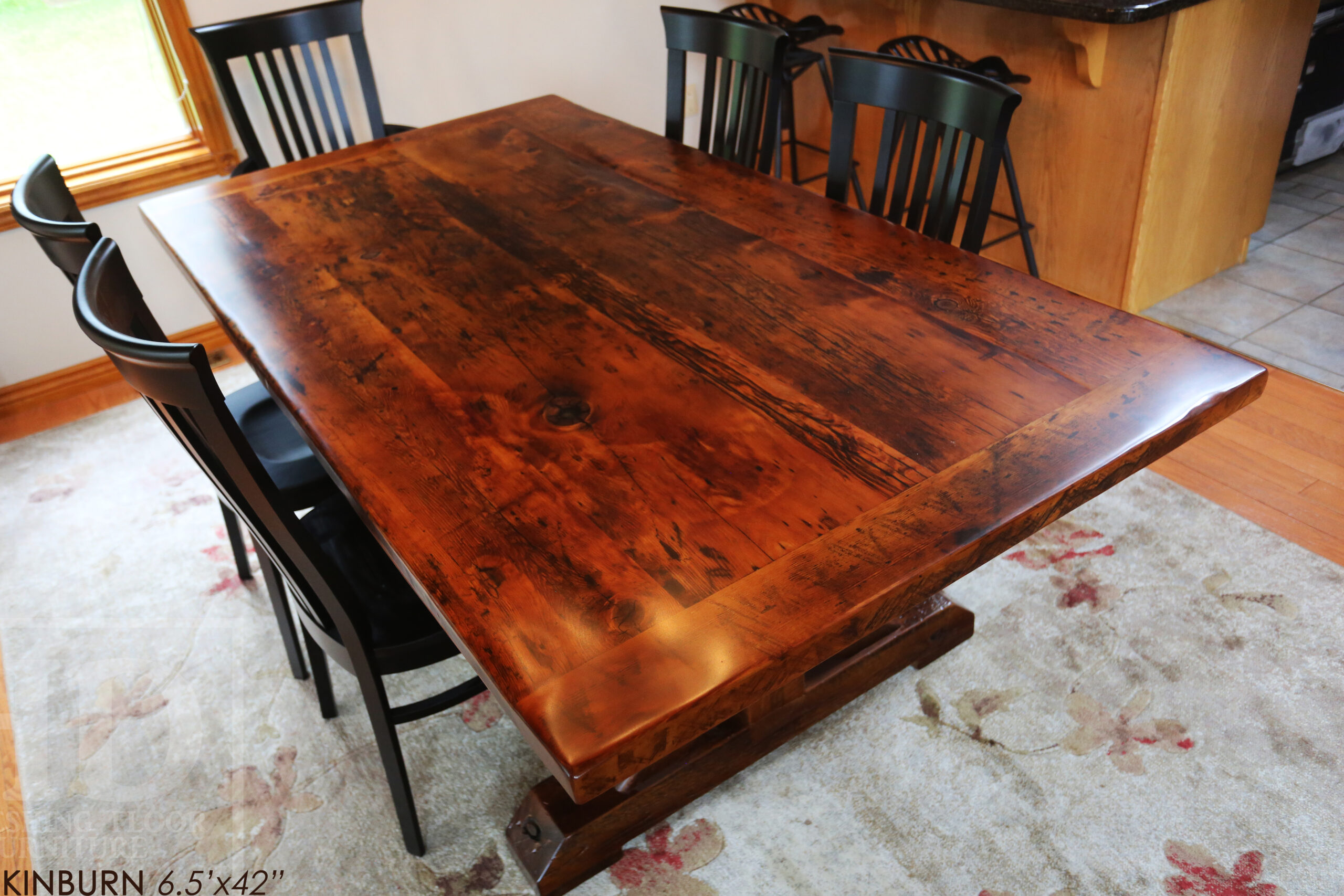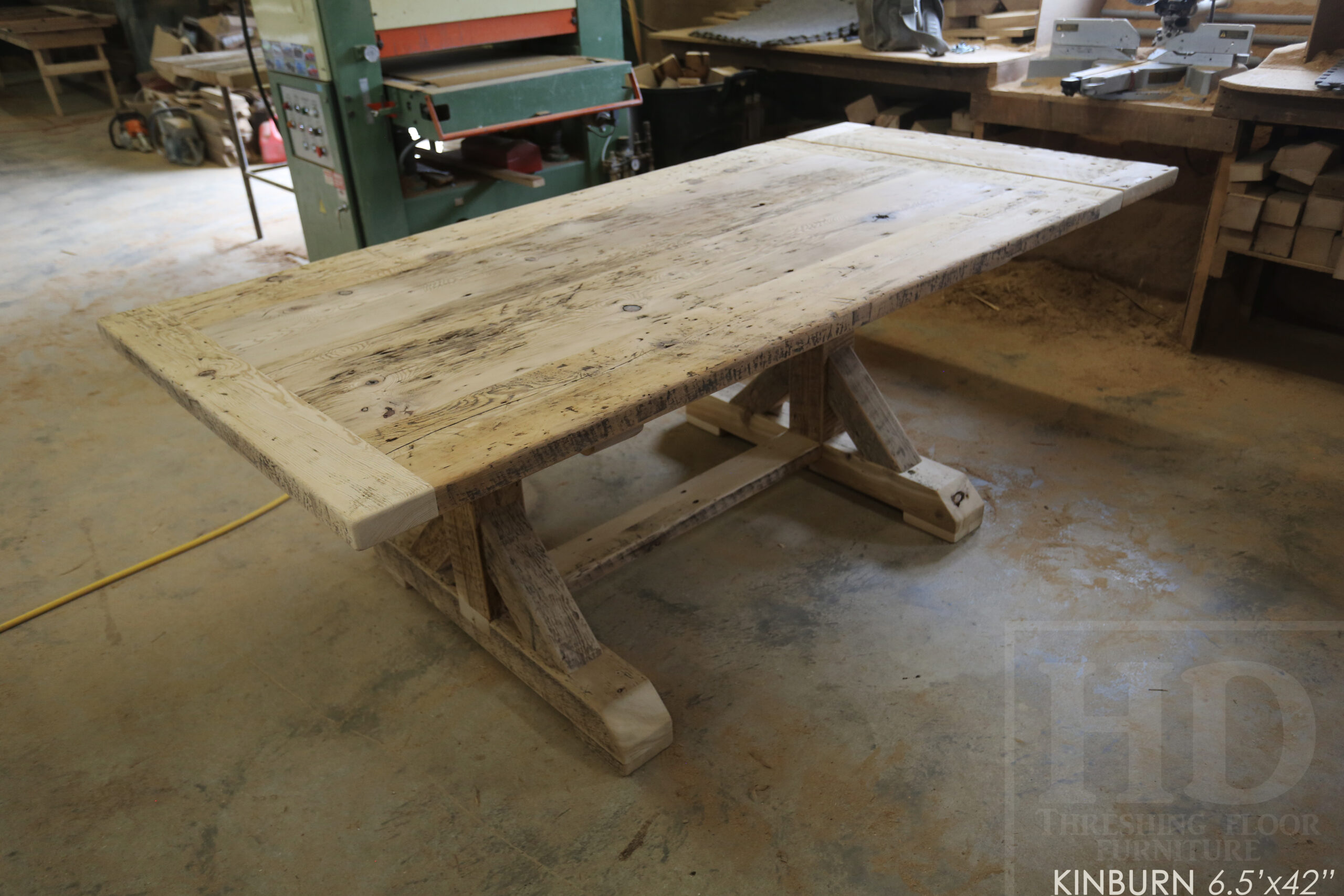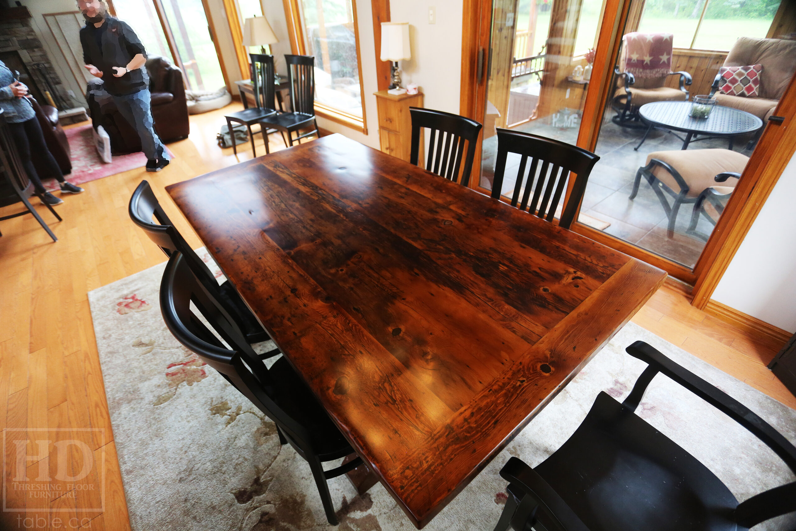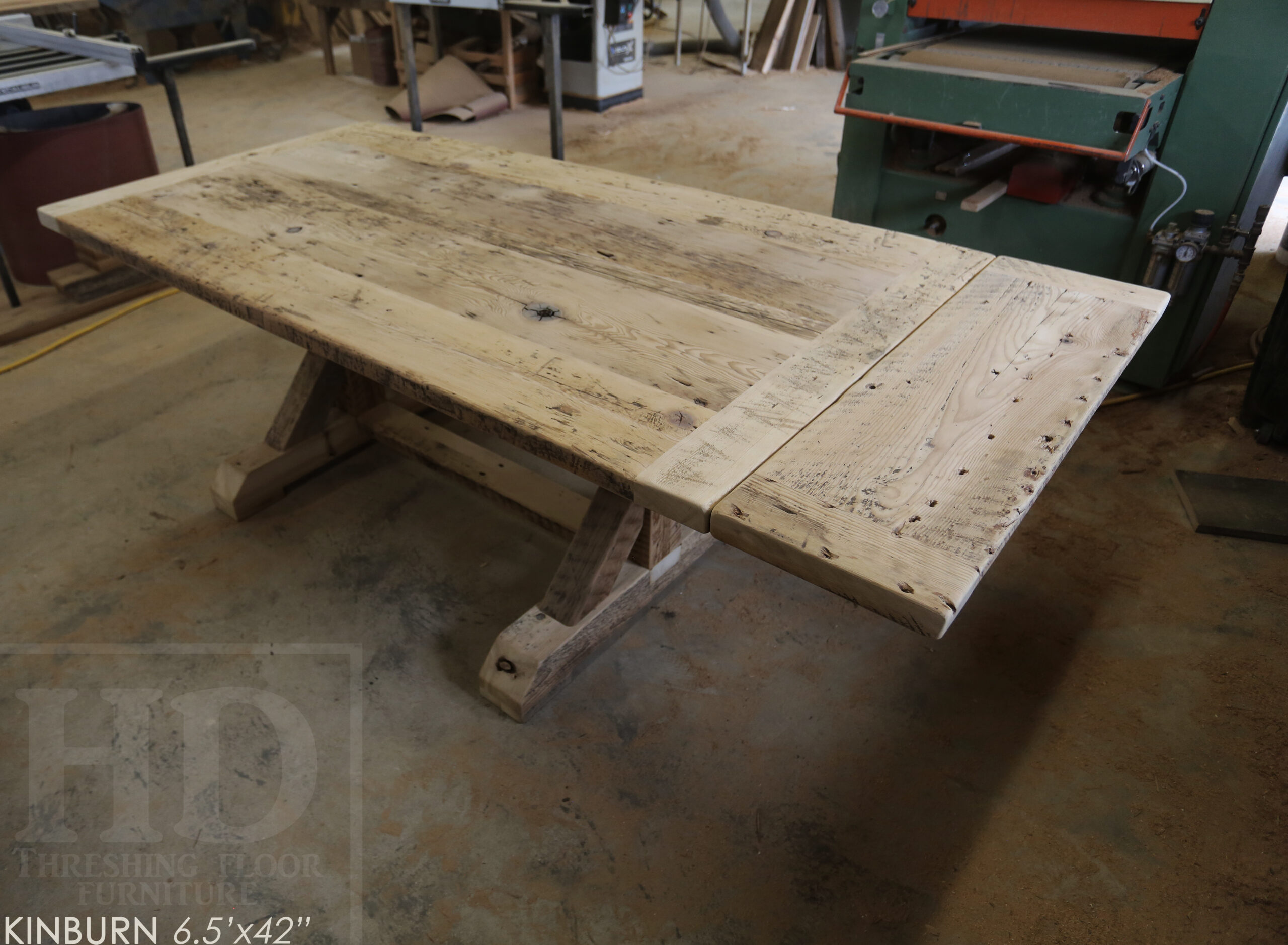 Project Summary: 6.5’ Reclaimed Barnwood Table we made for a Pakenham, Ontario home – 42†wide – Sawbuck Beam Option Base – Old Growth Hemlock Threshing Floor 2†Construction – Original edges & distressing maintained – Bread Edge Boards – Premium epoxy [light coating / less thick option] + satin polyurethane finish – One 12†Leaf – Wormy Maple Athena Chairs / Painted Solid Black – www.table.ca