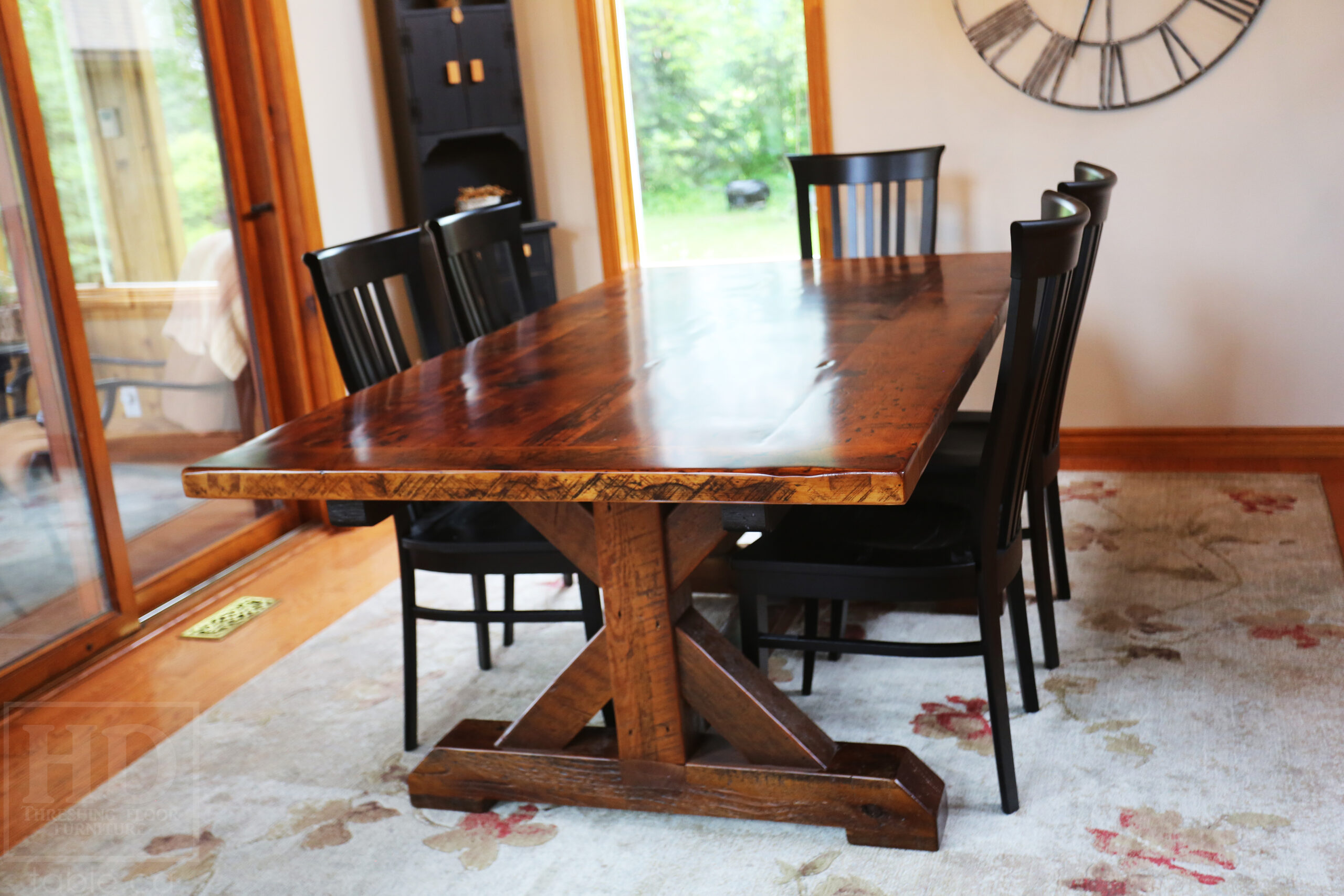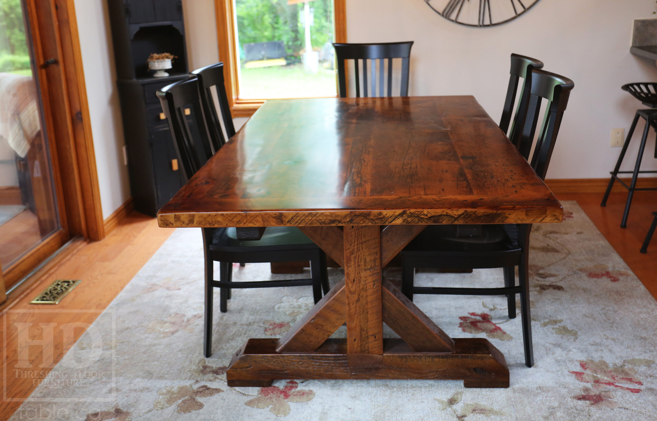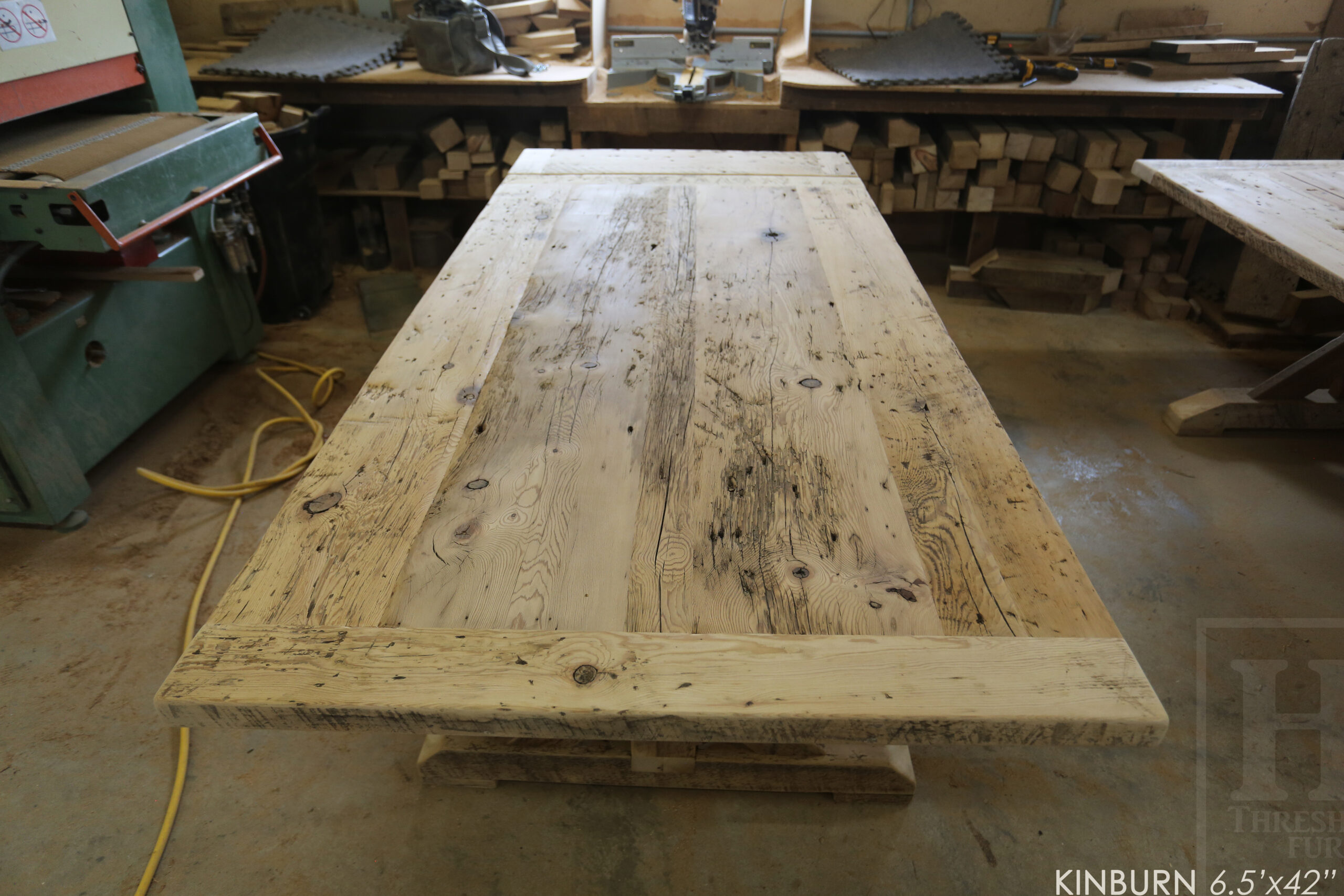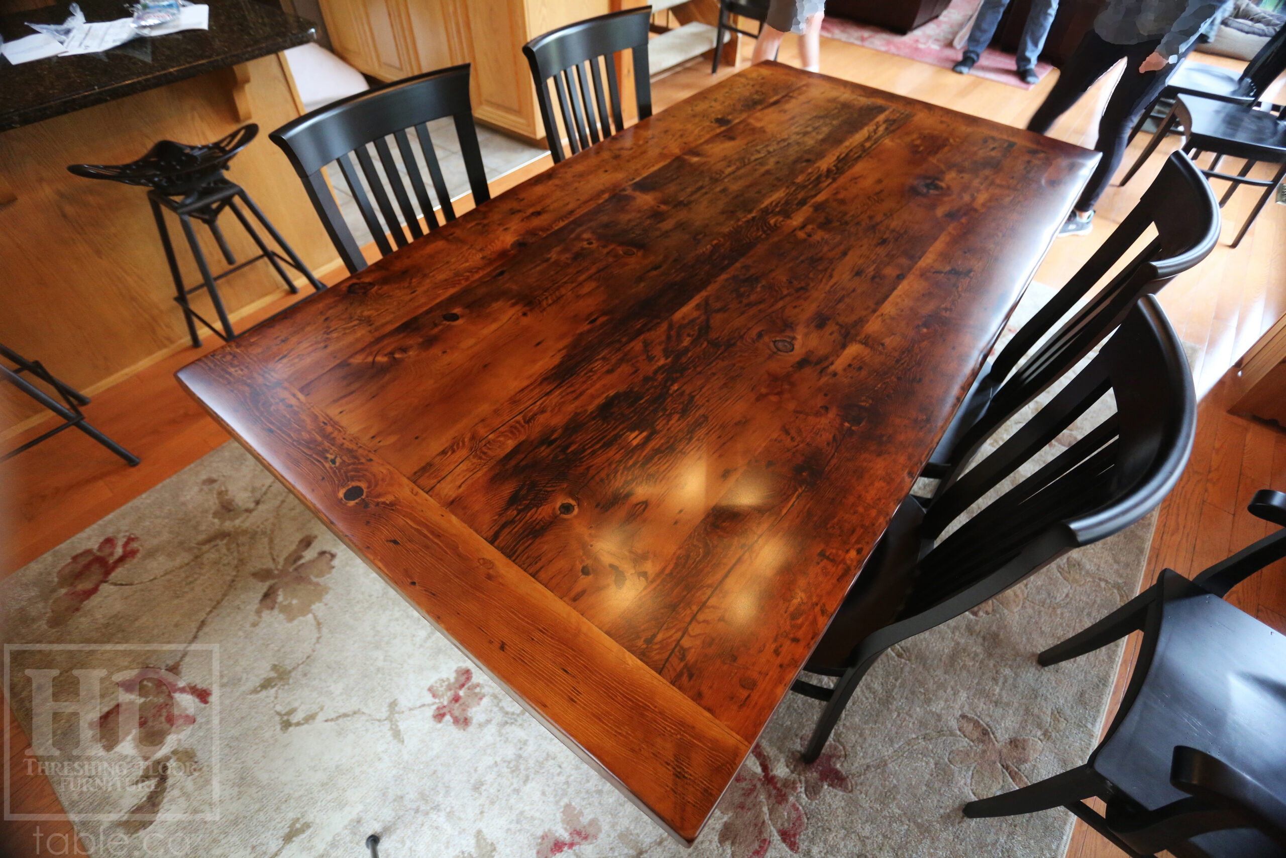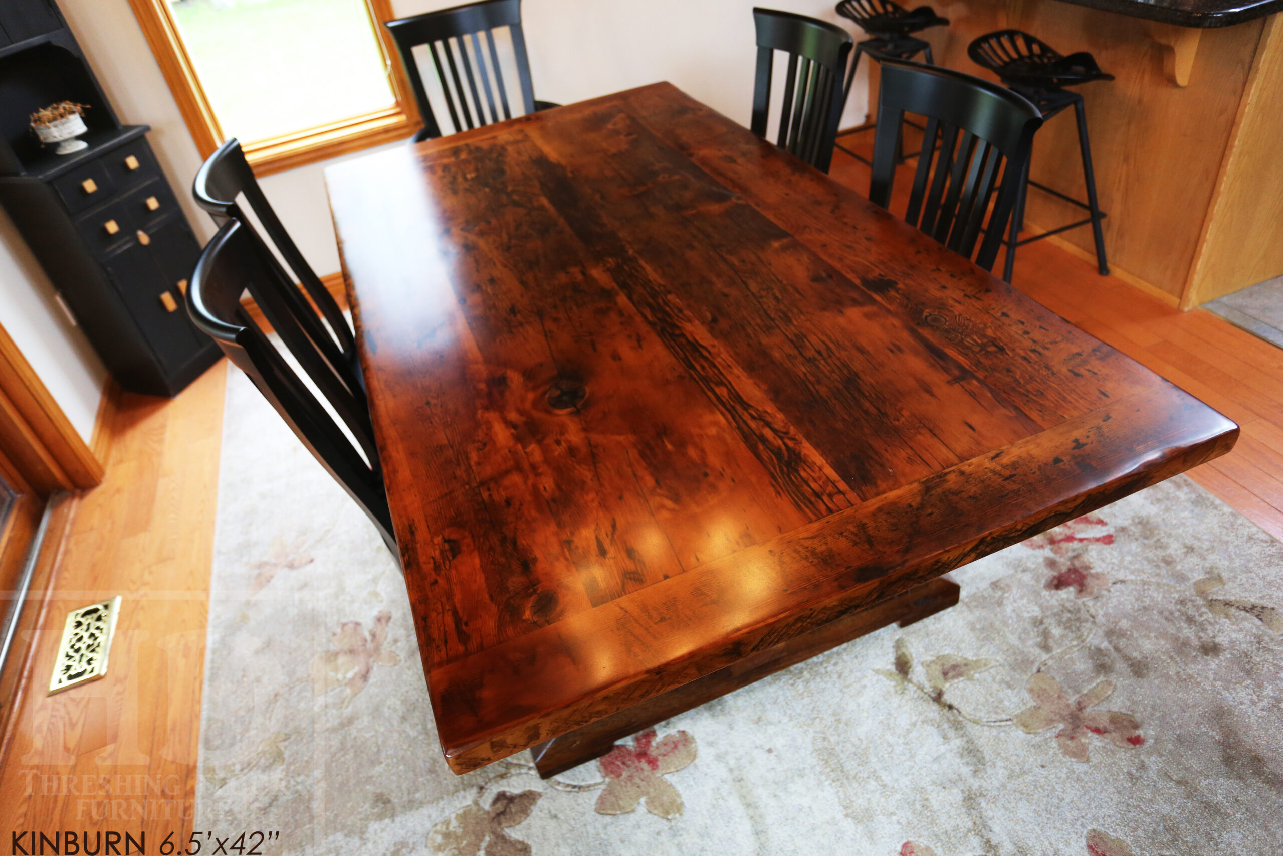 Project Summary: 6.5’ Reclaimed Barnwood Table we made for a Pakenham, Ontario home – 42†wide – Sawbuck Beam Option Base – Old Growth Hemlock Threshing Floor 2†Construction – Original edges & distressing maintained – Bread Edge Boards – Premium epoxy [light coating / less thick option] + satin polyurethane finish – One 12†Leaf – Wormy Maple Athena Chairs / Painted Solid Black – www.table.ca