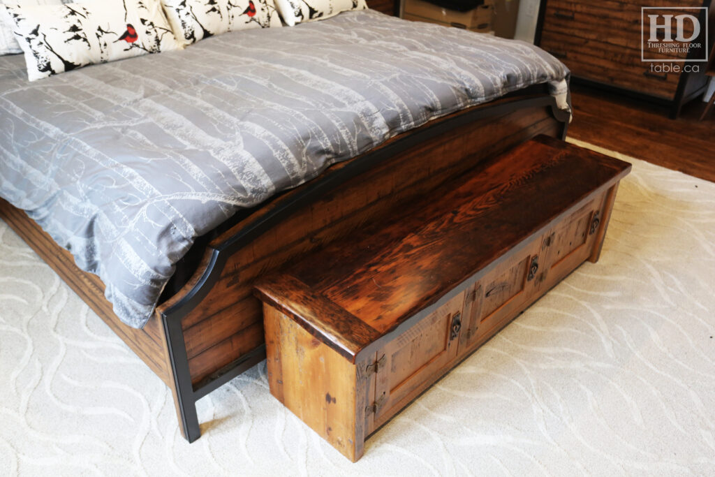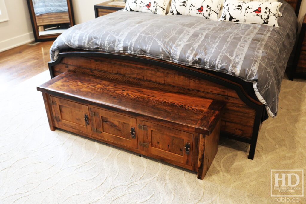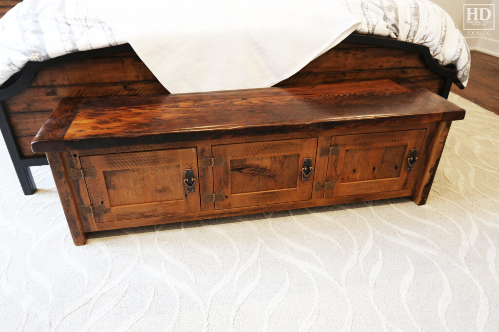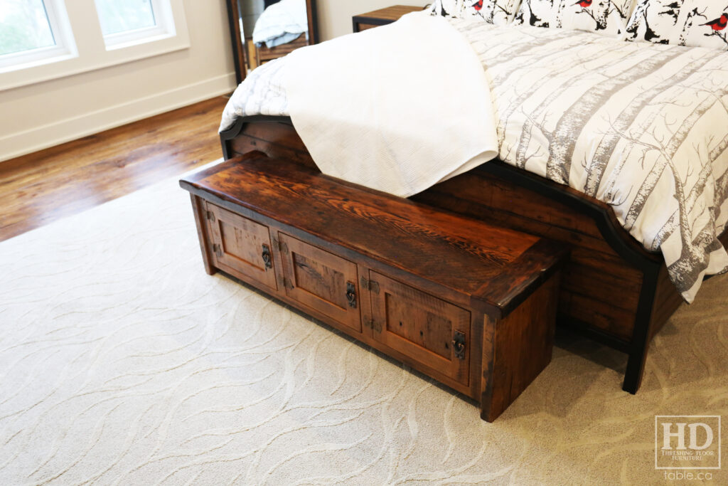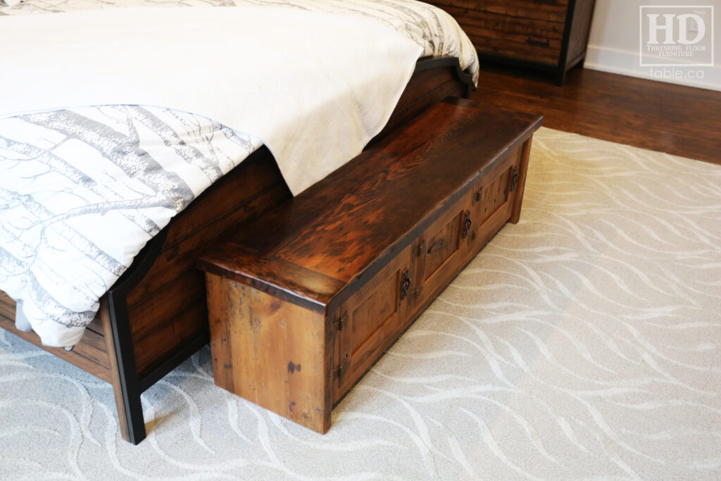 For additional storage and practical extra seating, consider a bedroom bench with storage. Check out this reclaimed wood storage bench we made for a Parry Sound home: