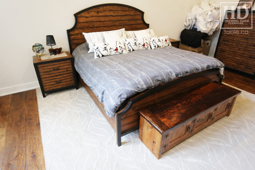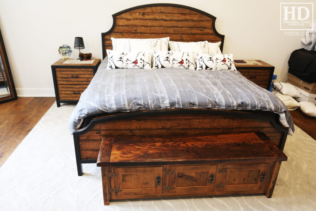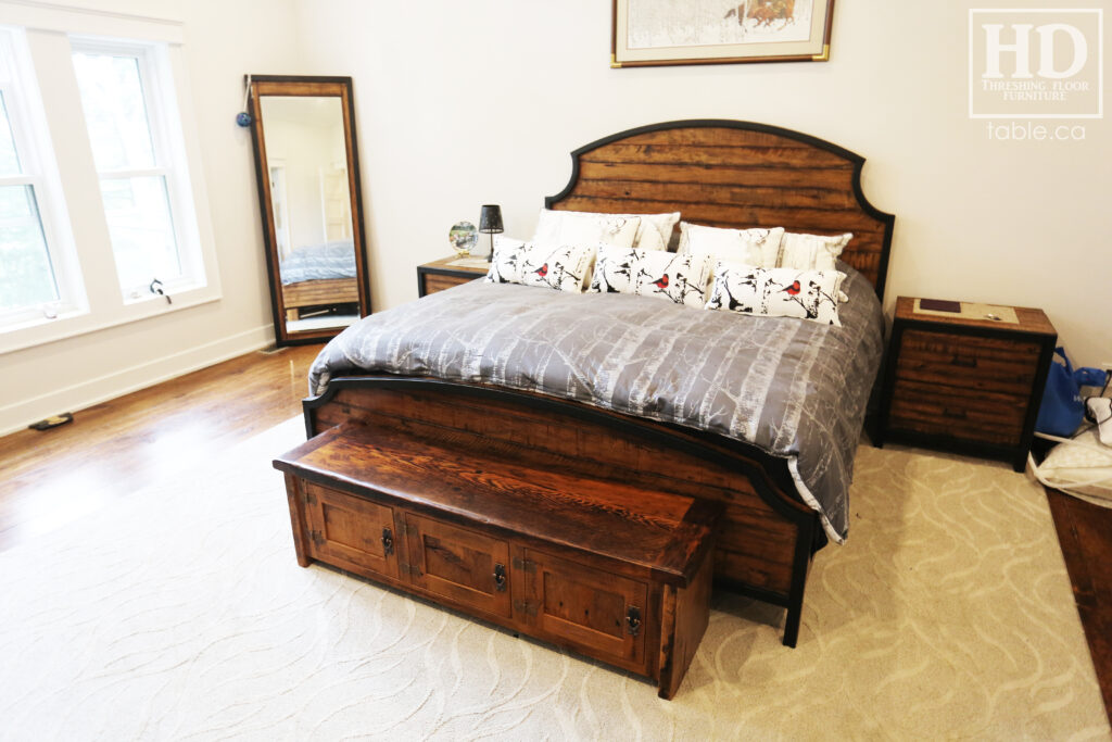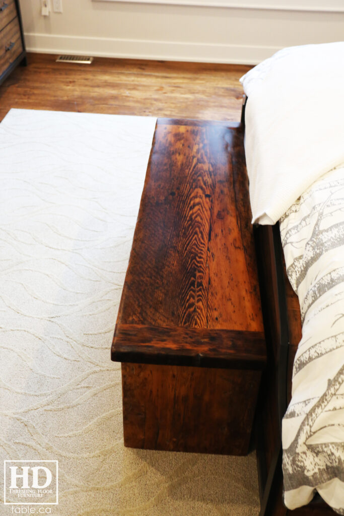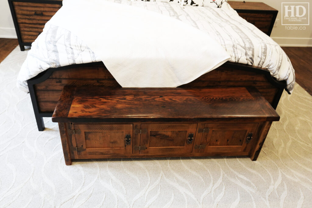 For additional storage and practical extra seating, consider a bedroom bench with storage. Check out this reclaimed wood storage bench we made for a Parry Sound home: