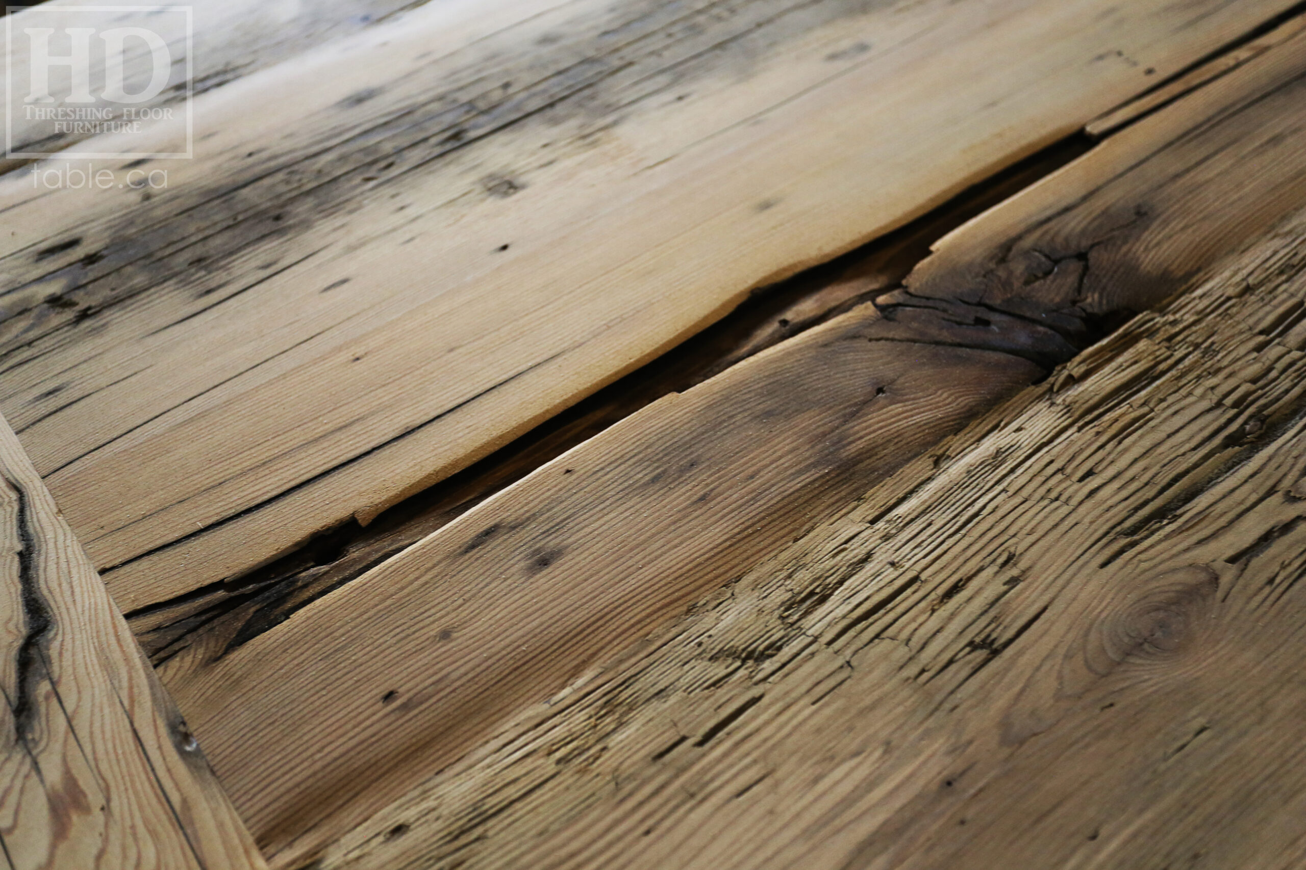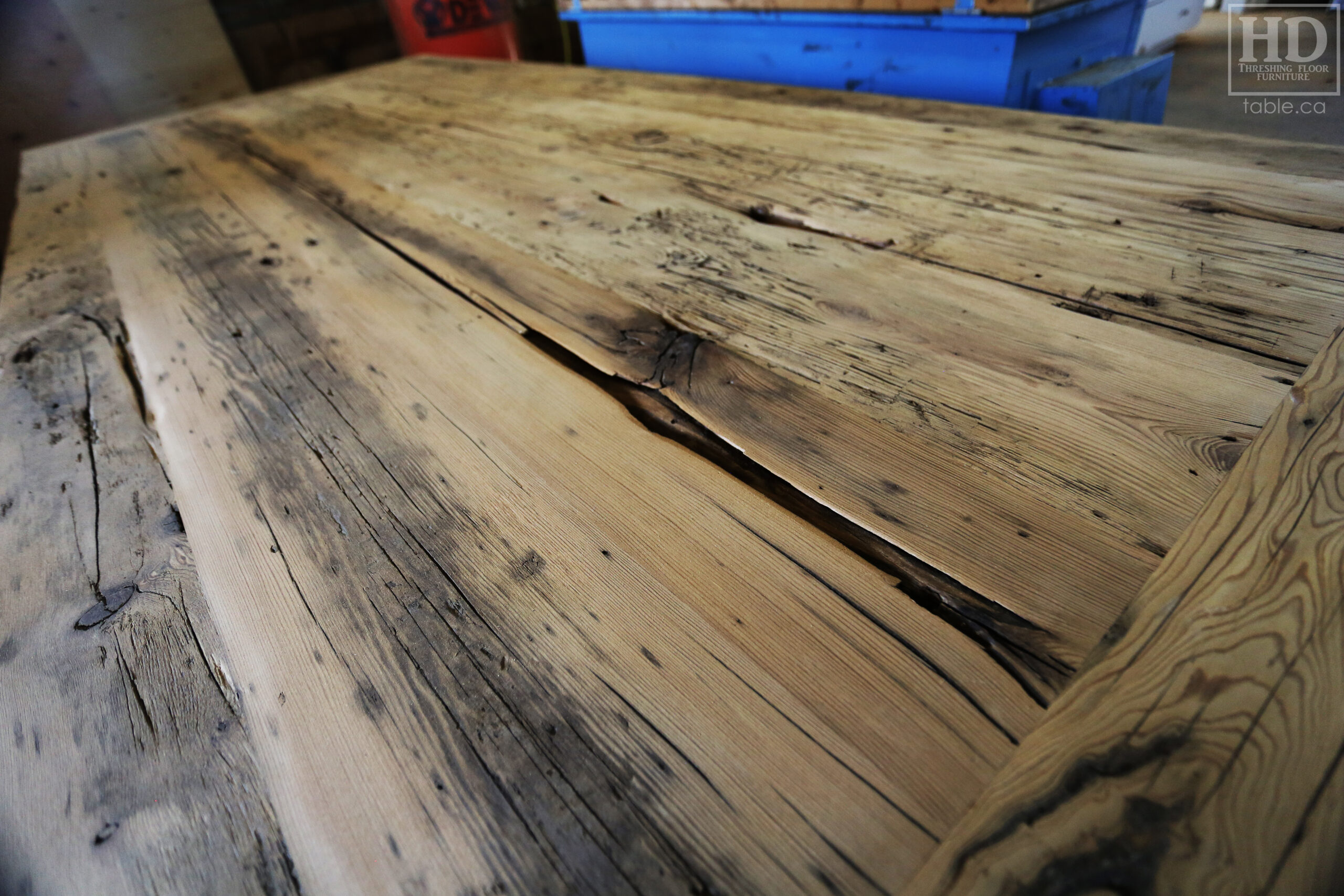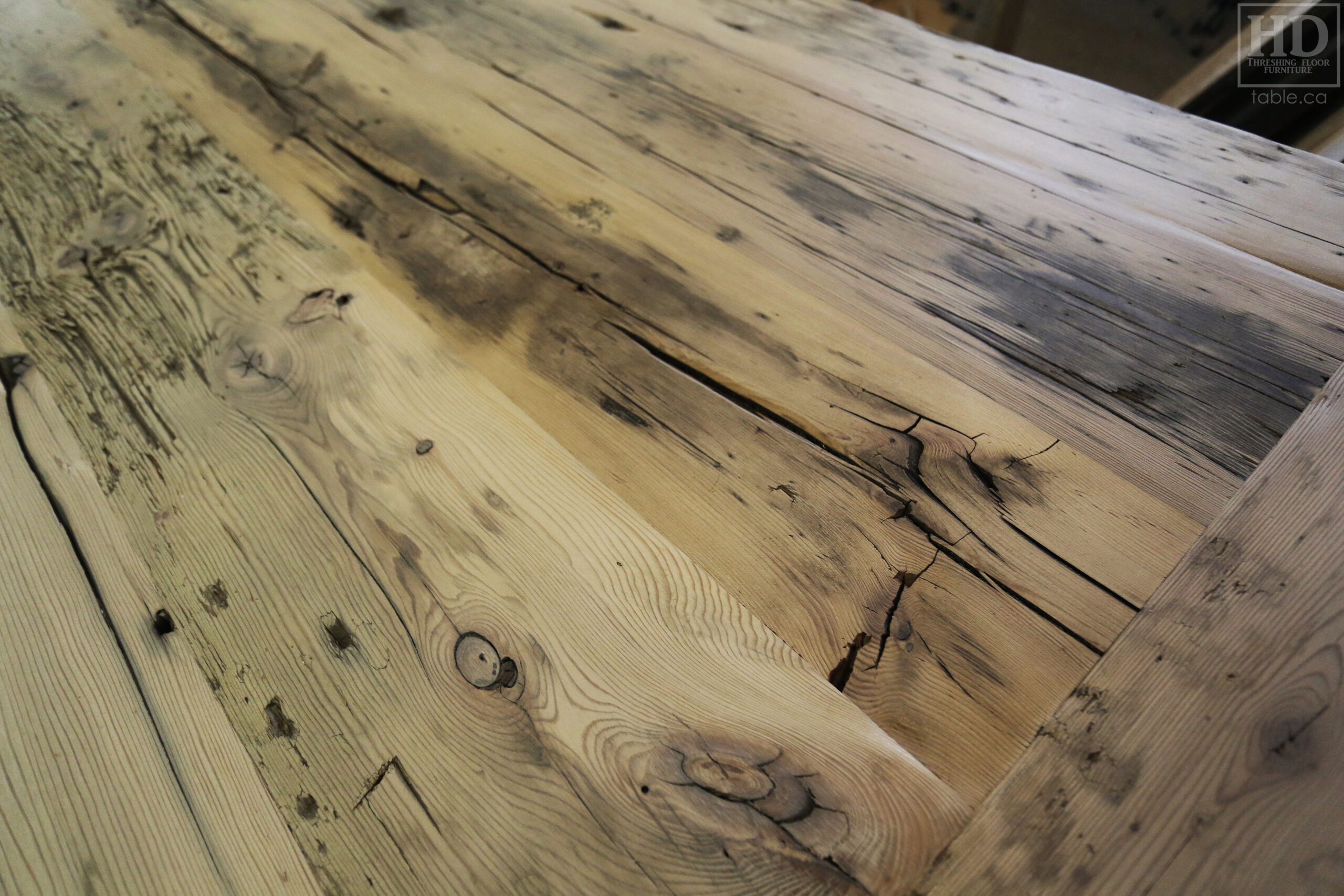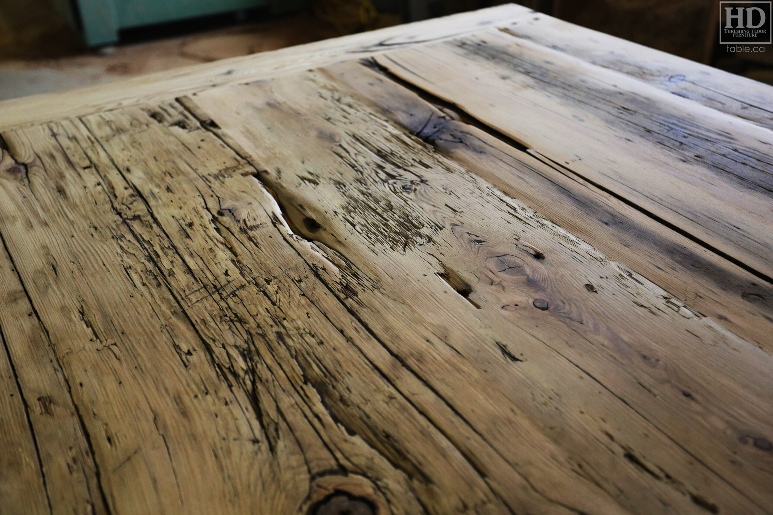 Old pioneer barnwood shows Canadian history in the barn floor boards. We maintain this history and make practical with our clearcoat finish. Check out this recent reclaimed wood sawbuck table project: