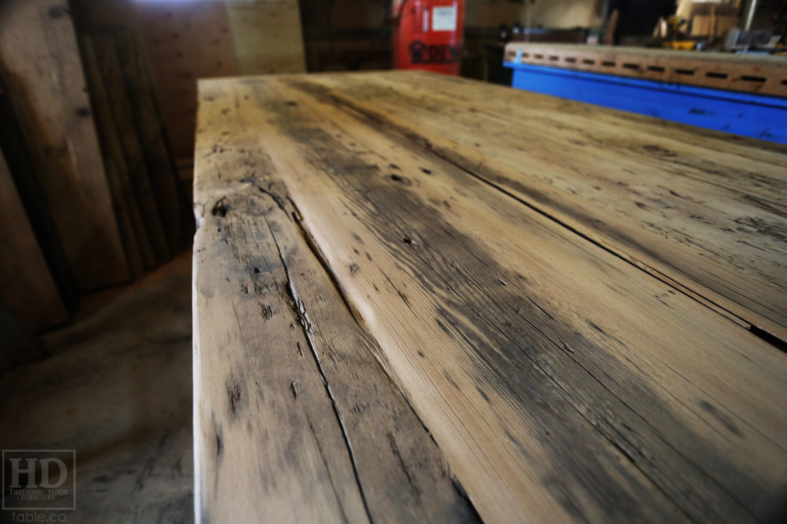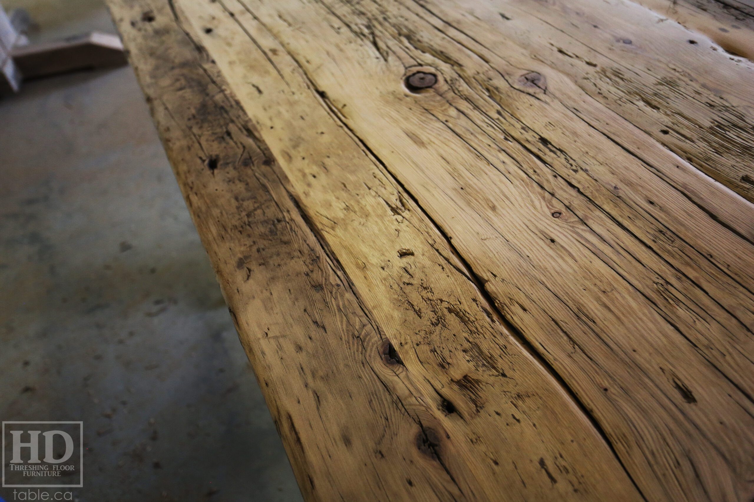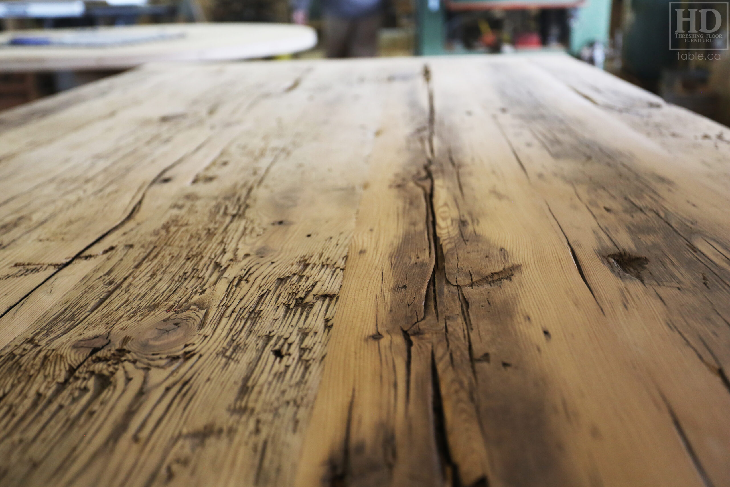 Old pioneer barnwood shows Canadian history in the barn floor boards. We maintain this history and make practical with our clearcoat finish. Check out this recent reclaimed wood sawbuck table project: