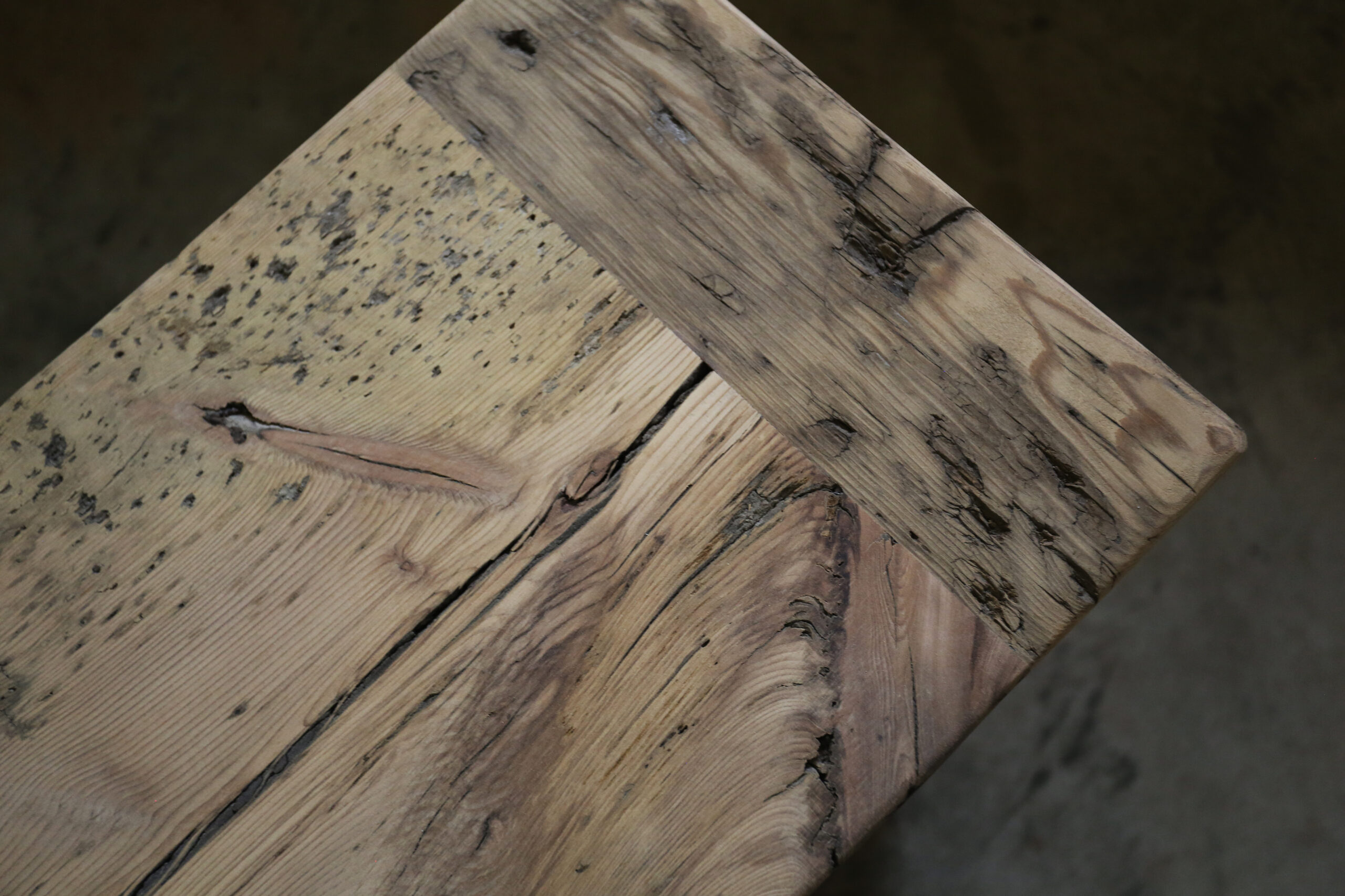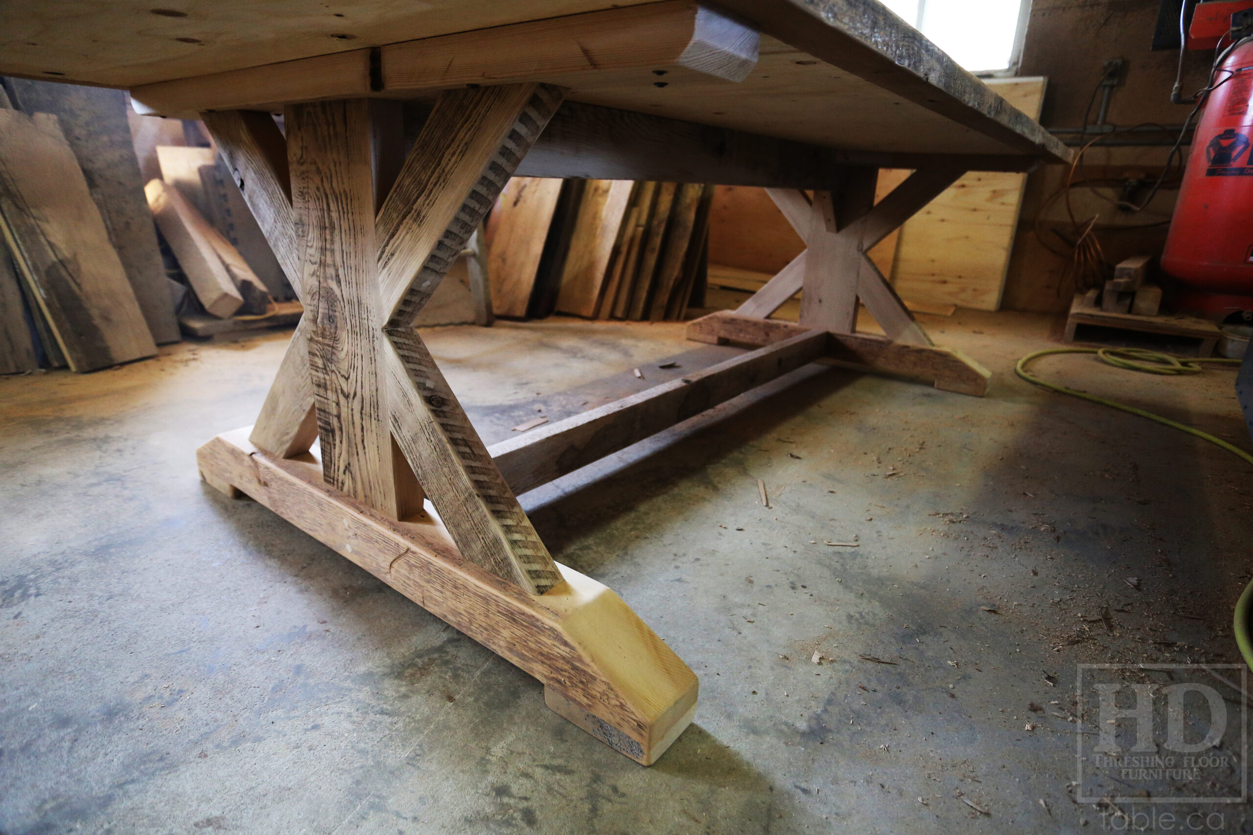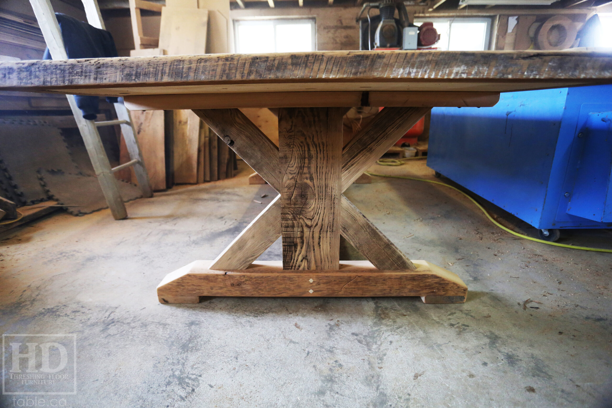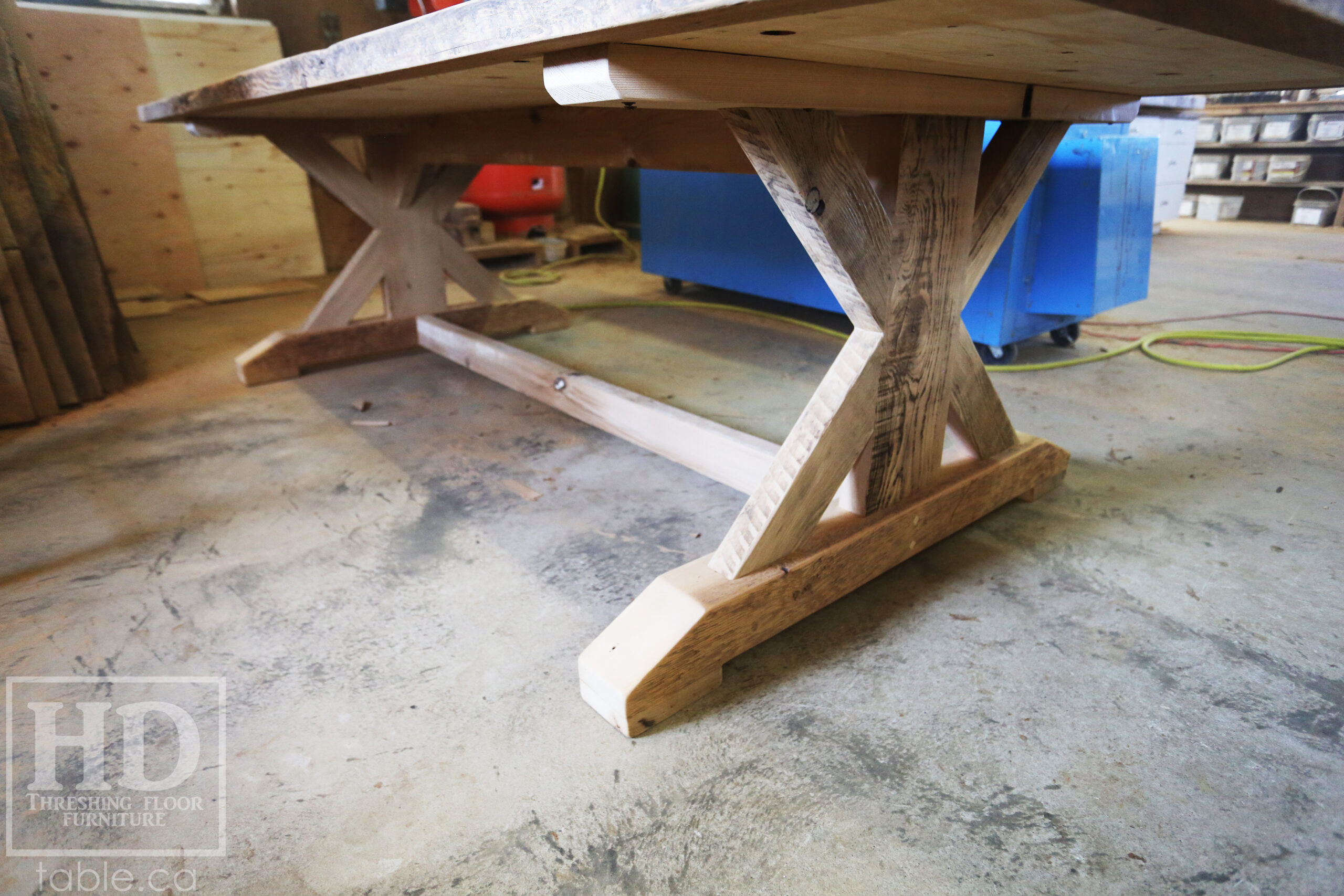 Old pioneer barnwood shows Canadian history in the barn floor boards. We maintain this history and make practical with our clearcoat finish. Check out this recent reclaimed wood sawbuck table project: