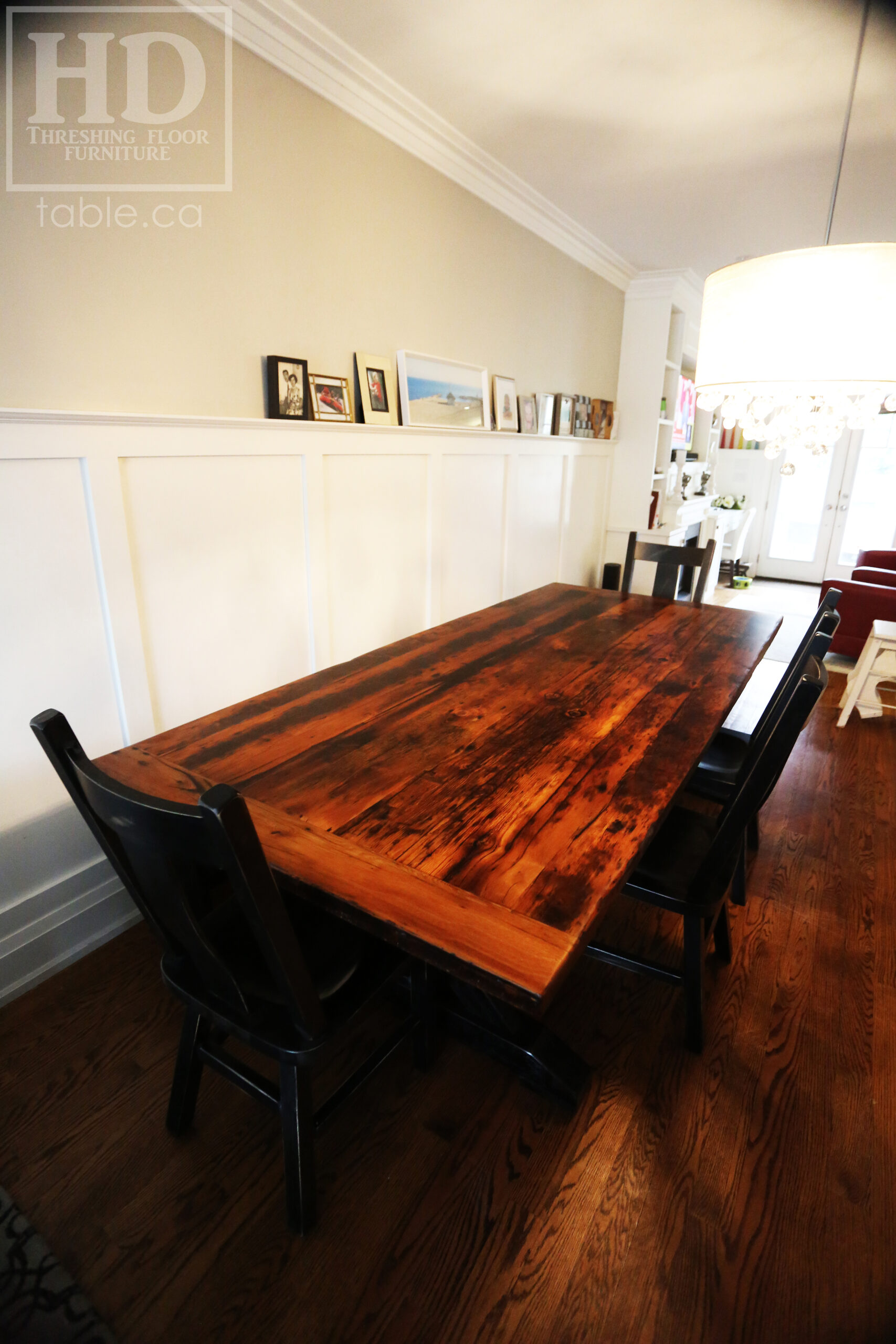 Project details: 9’ Reclaimed Ontario Barnwood Table we made for a Toronto, Ontario home – 48†wide – Sawbuck Base – Old Growth Hemlock Threshing Floor Construction – Original edges & distressing maintained – Bread Edge Ends – Black with Sandthroughs Base – Premium epoxy + satin polyurethane finish – [2] Matching 4’ Benches – 4 Plank Back Chairs / Wormy Maple / Black with Sandthroughs Frame / Polyurethane clearcoat finish – www.table.ca