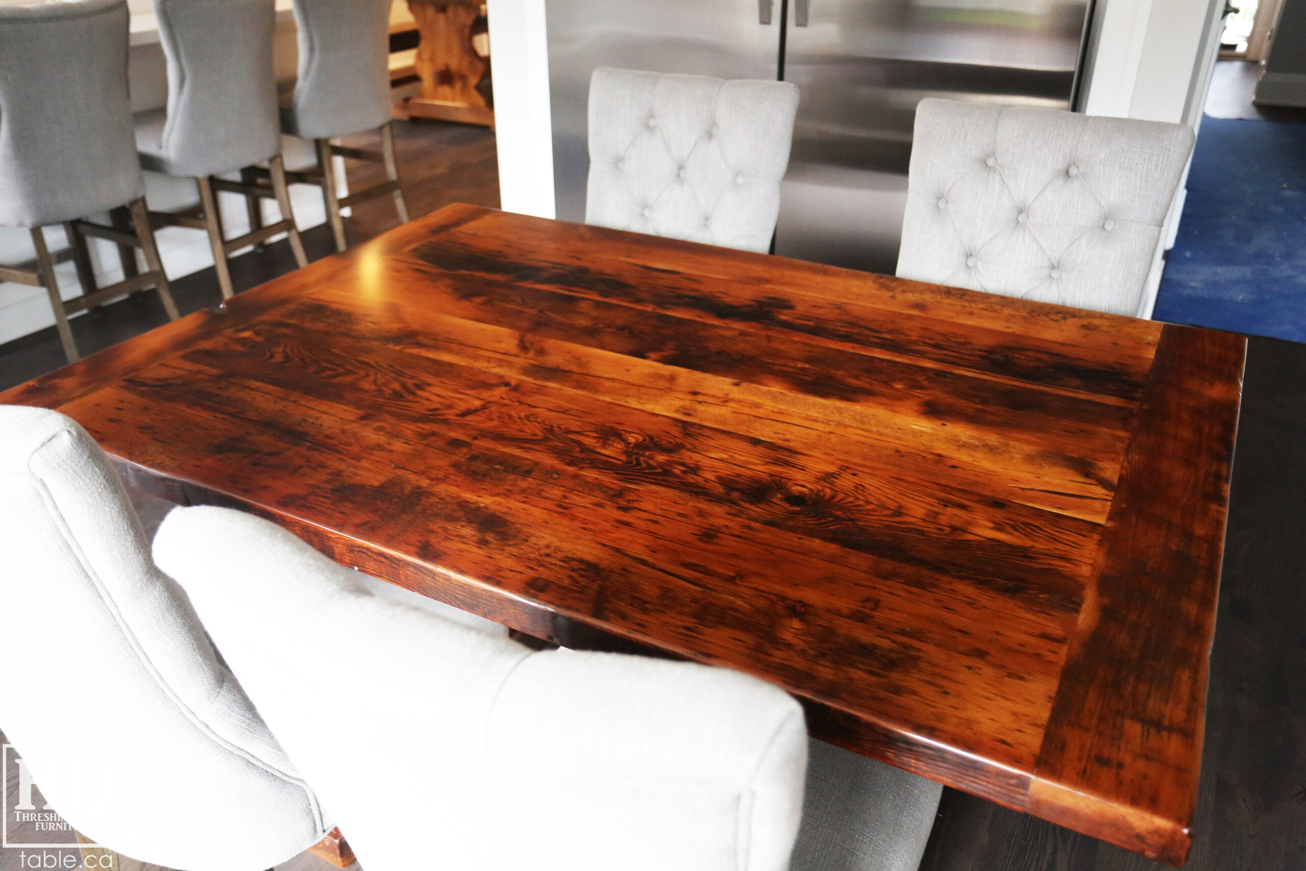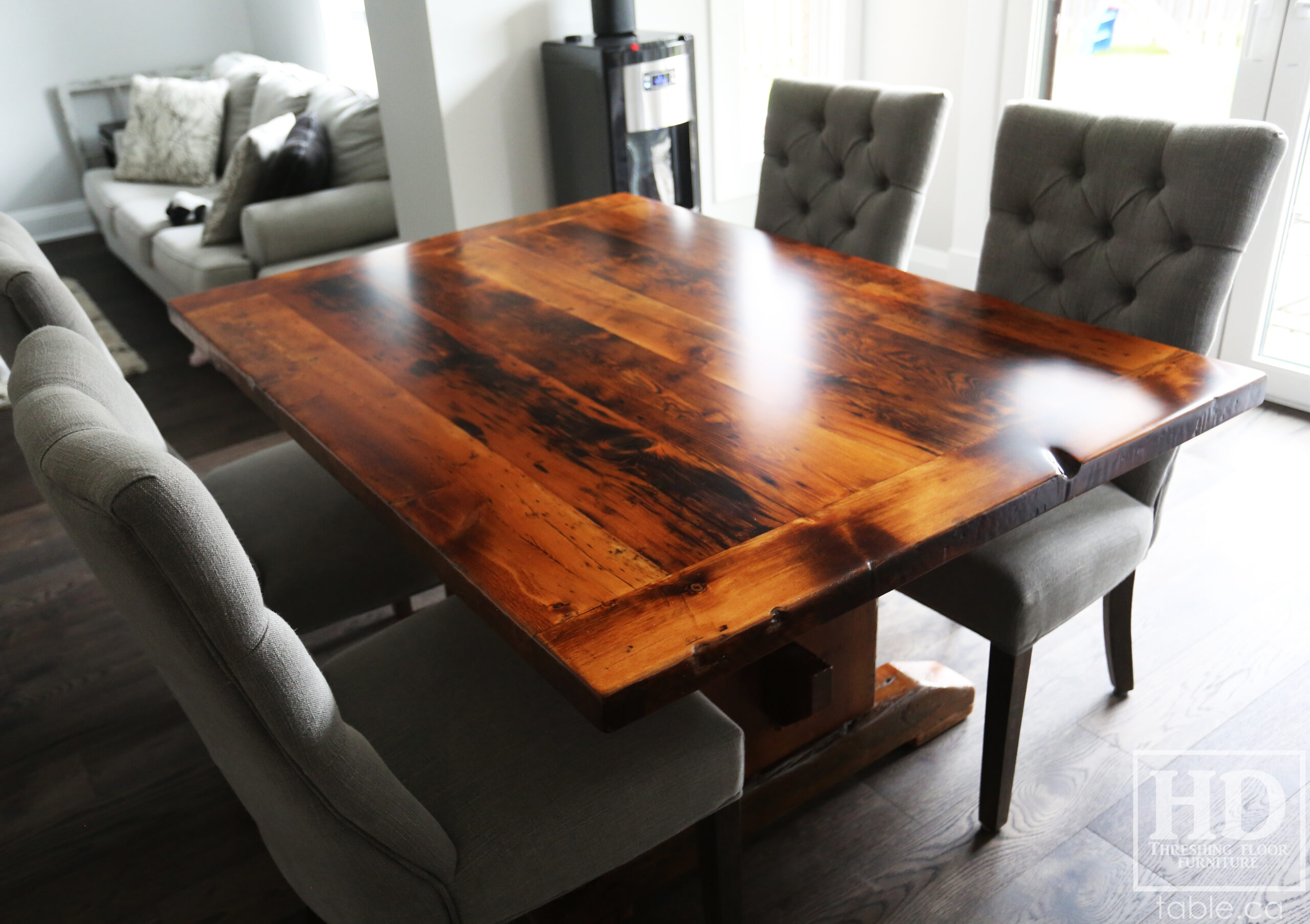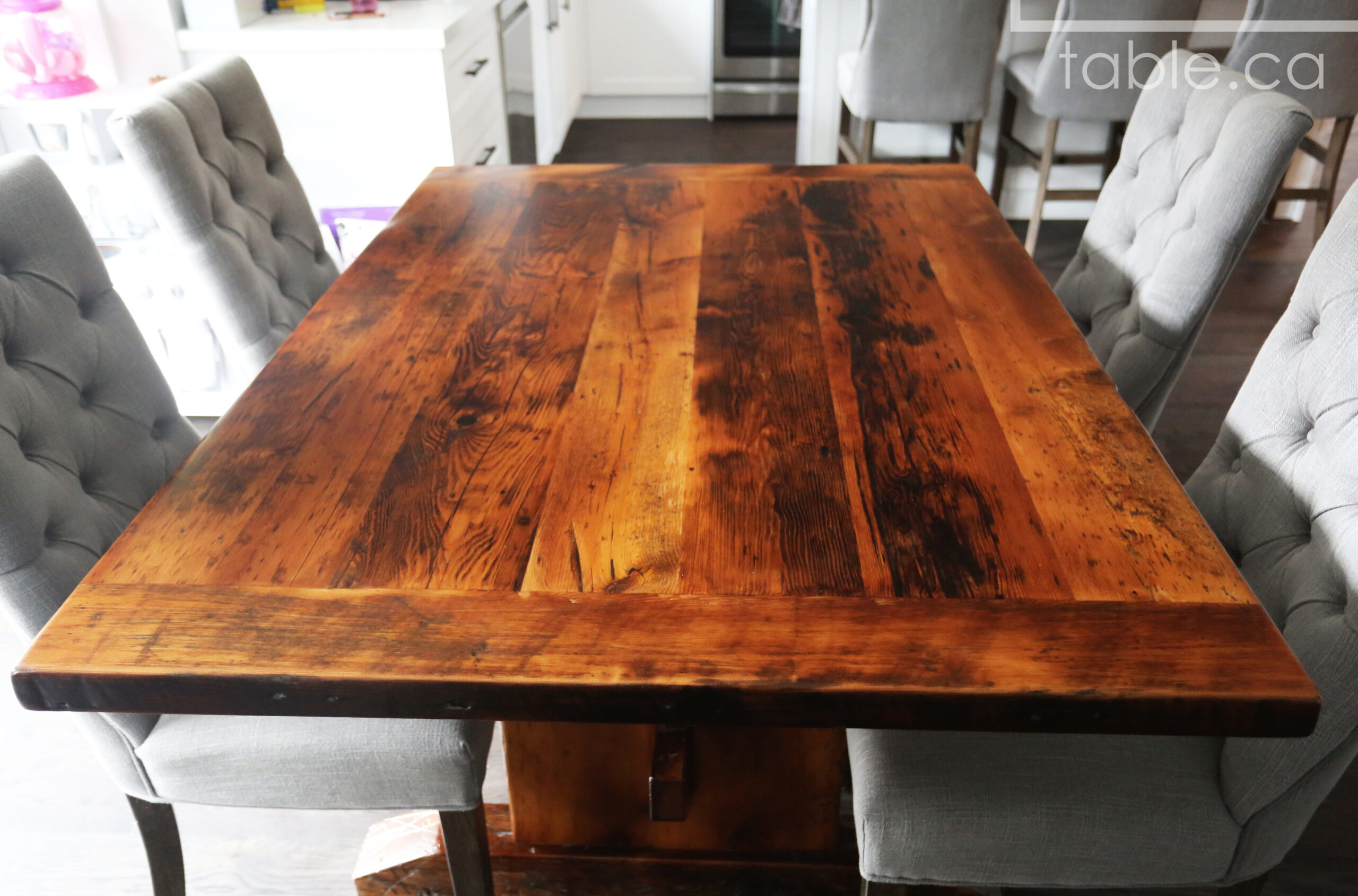 Project Summary: 5’ Ontario Barnwood Table we made for a Burlington, Ontario home – 42†wide – Trestle Base – Reclaimed Hemlock Threshing Floor Construction – Original distressing & edges maintained – Premium epoxy + satin polyurethane finish – www.table.ca