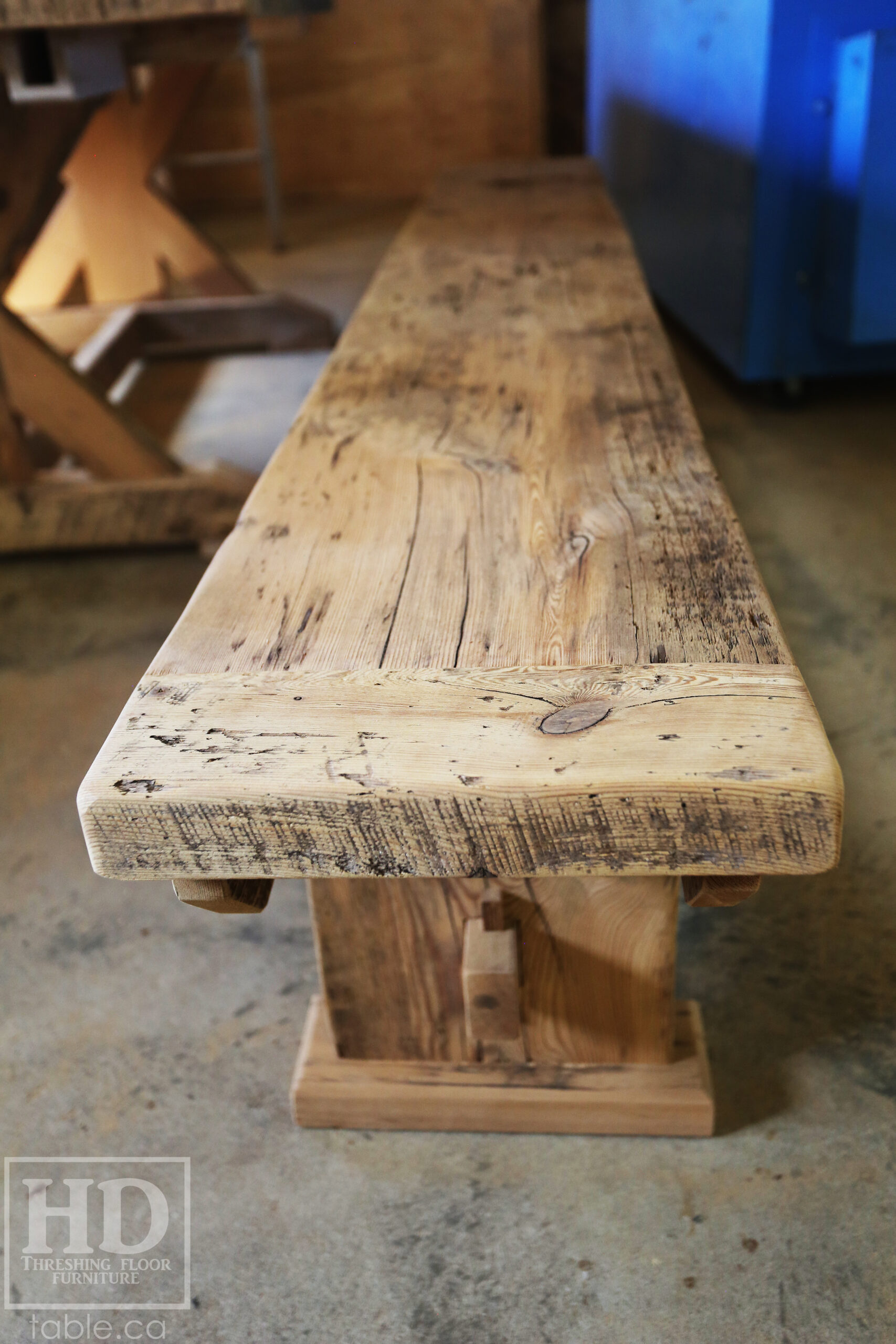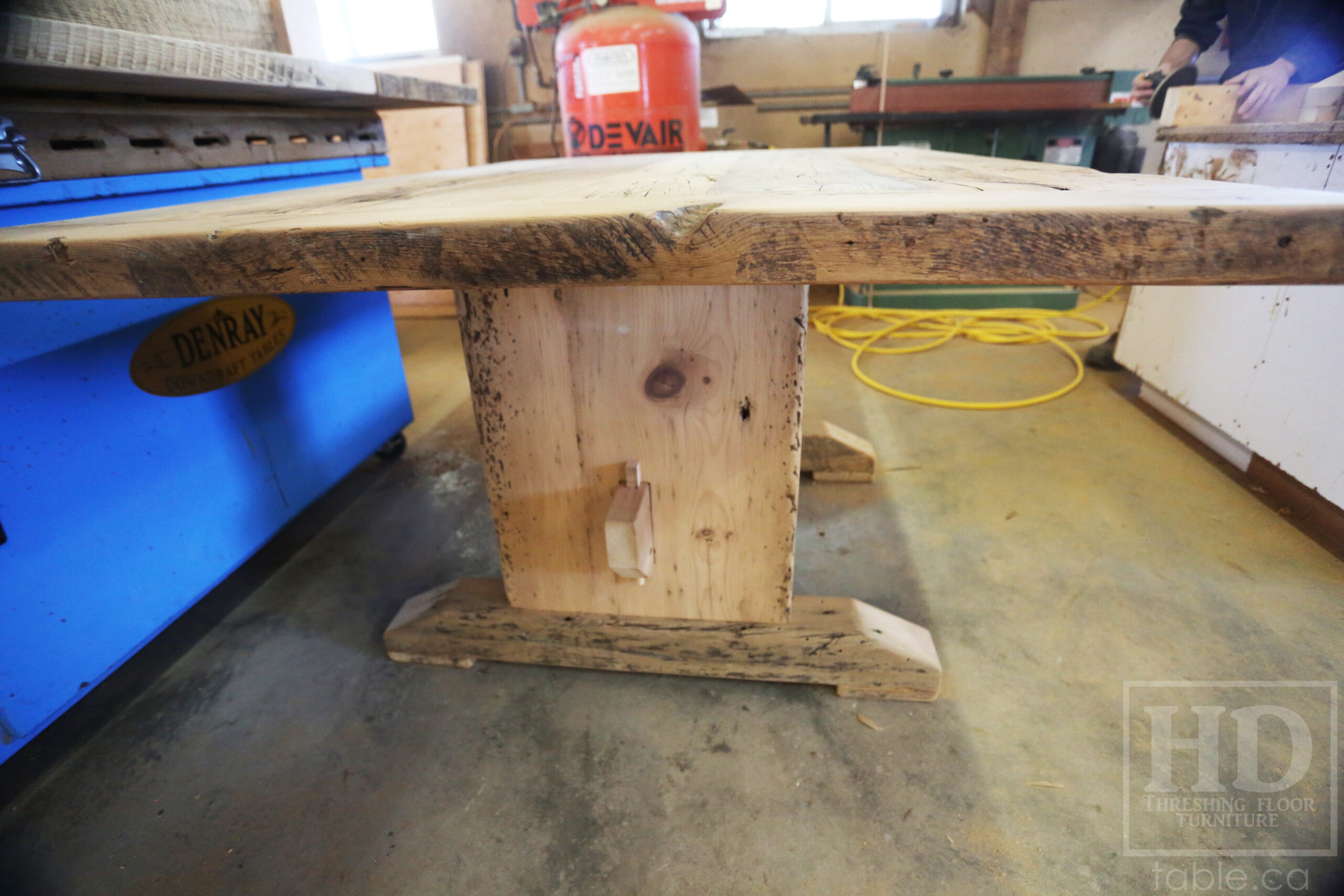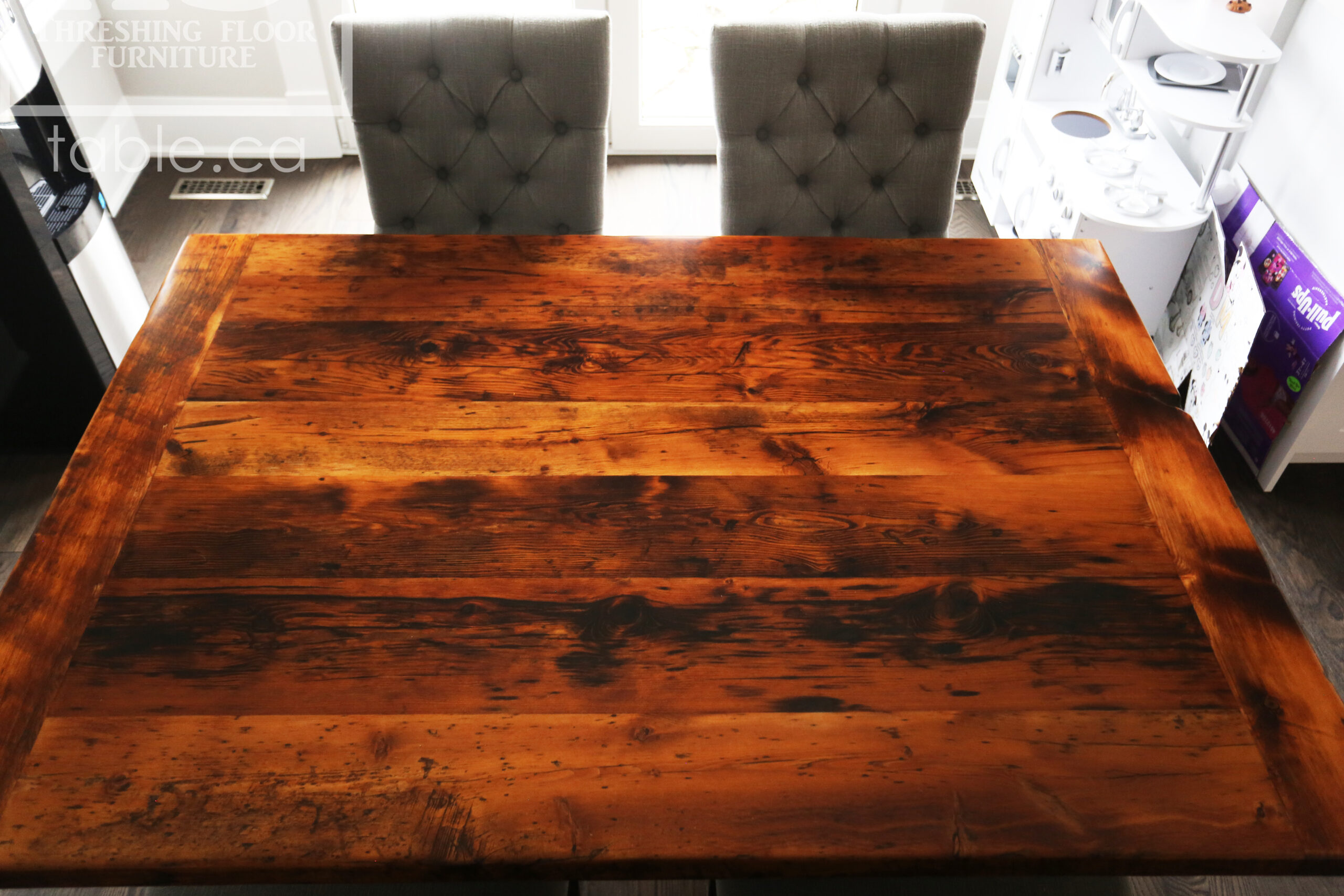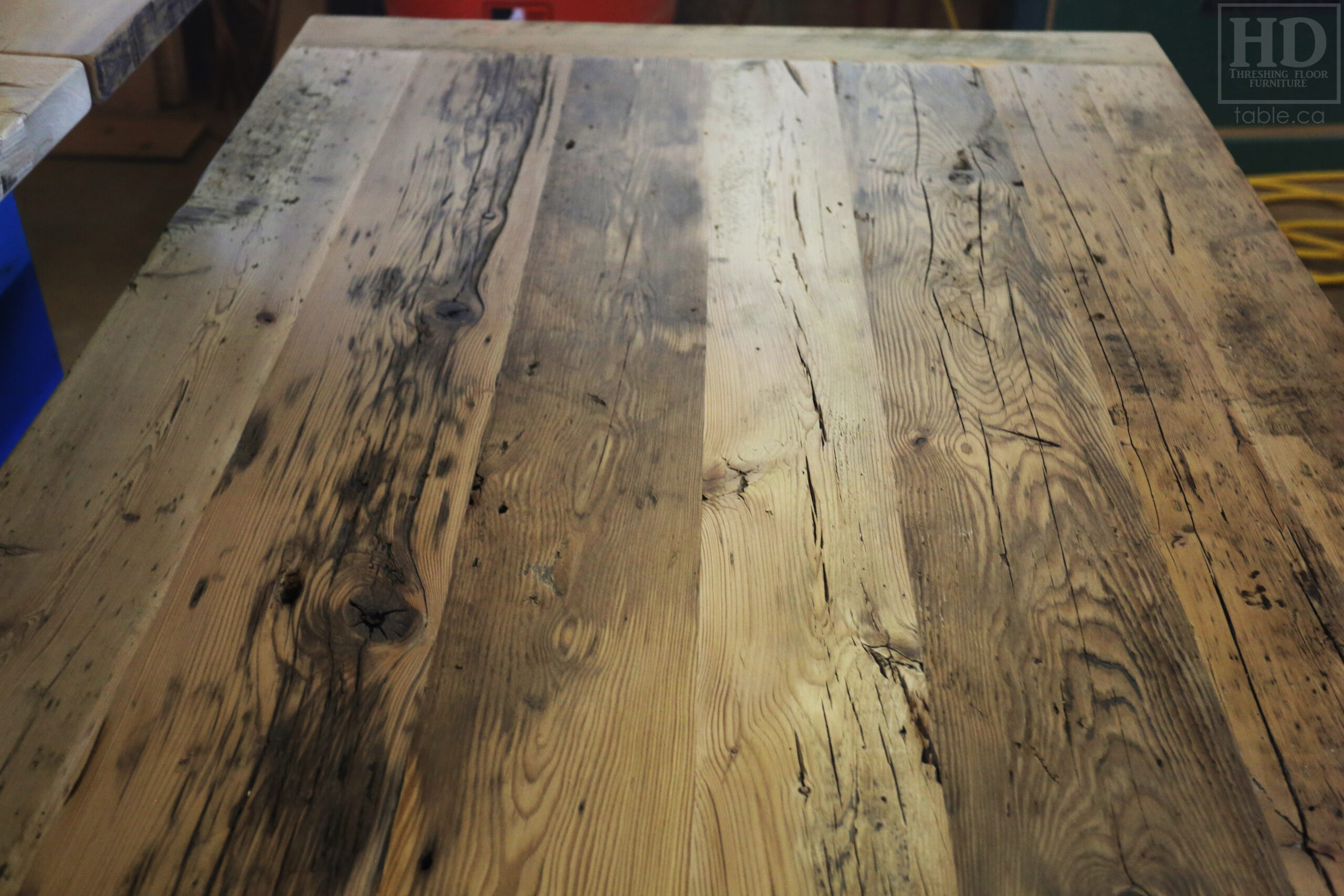 Project Summary: 5’ Ontario Barnwood Table we made for a Burlington, Ontario home – 42†wide – Trestle Base – Reclaimed Hemlock Threshing Floor Construction – Original distressing & edges maintained – Premium epoxy + satin polyurethane finish – www.table.ca