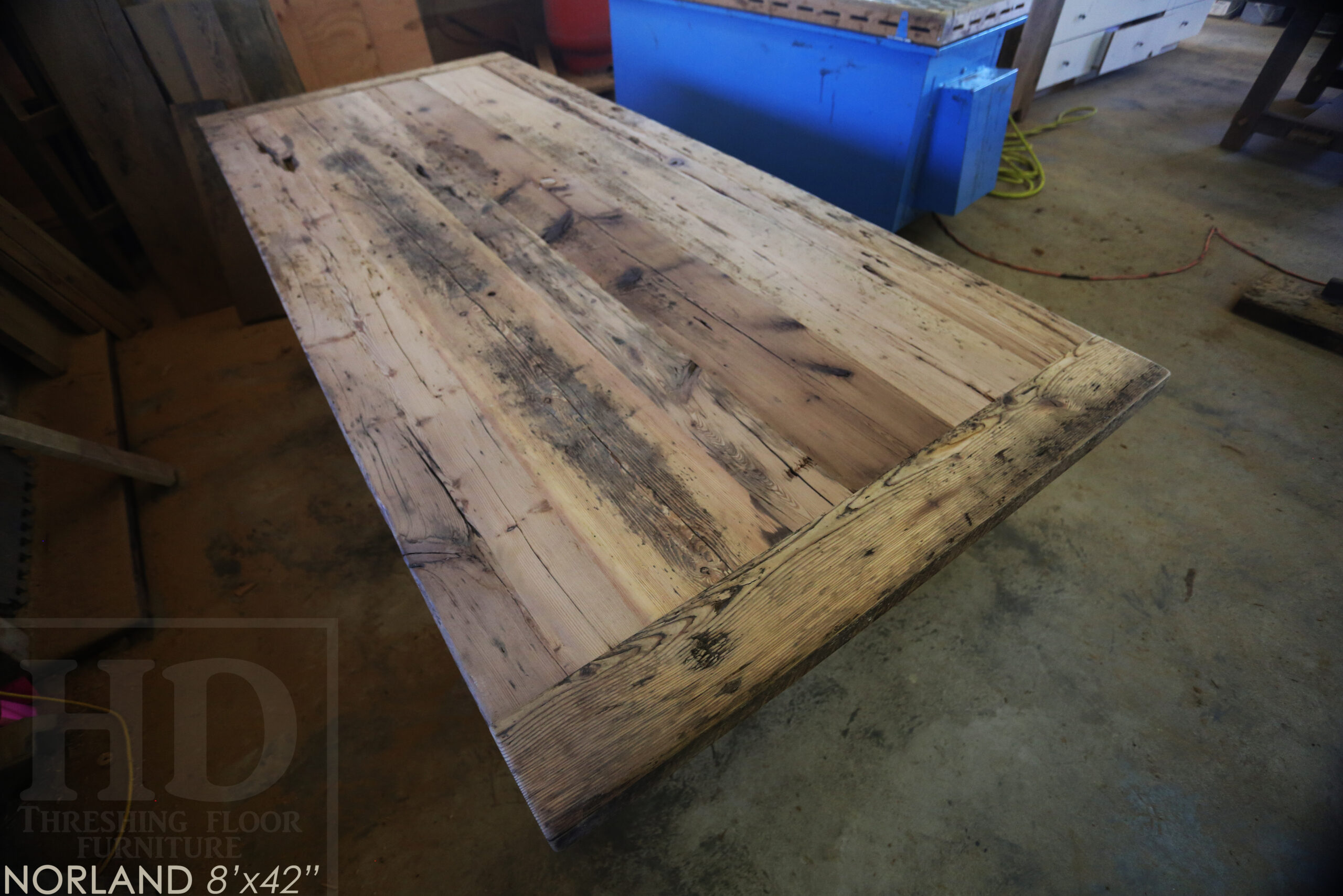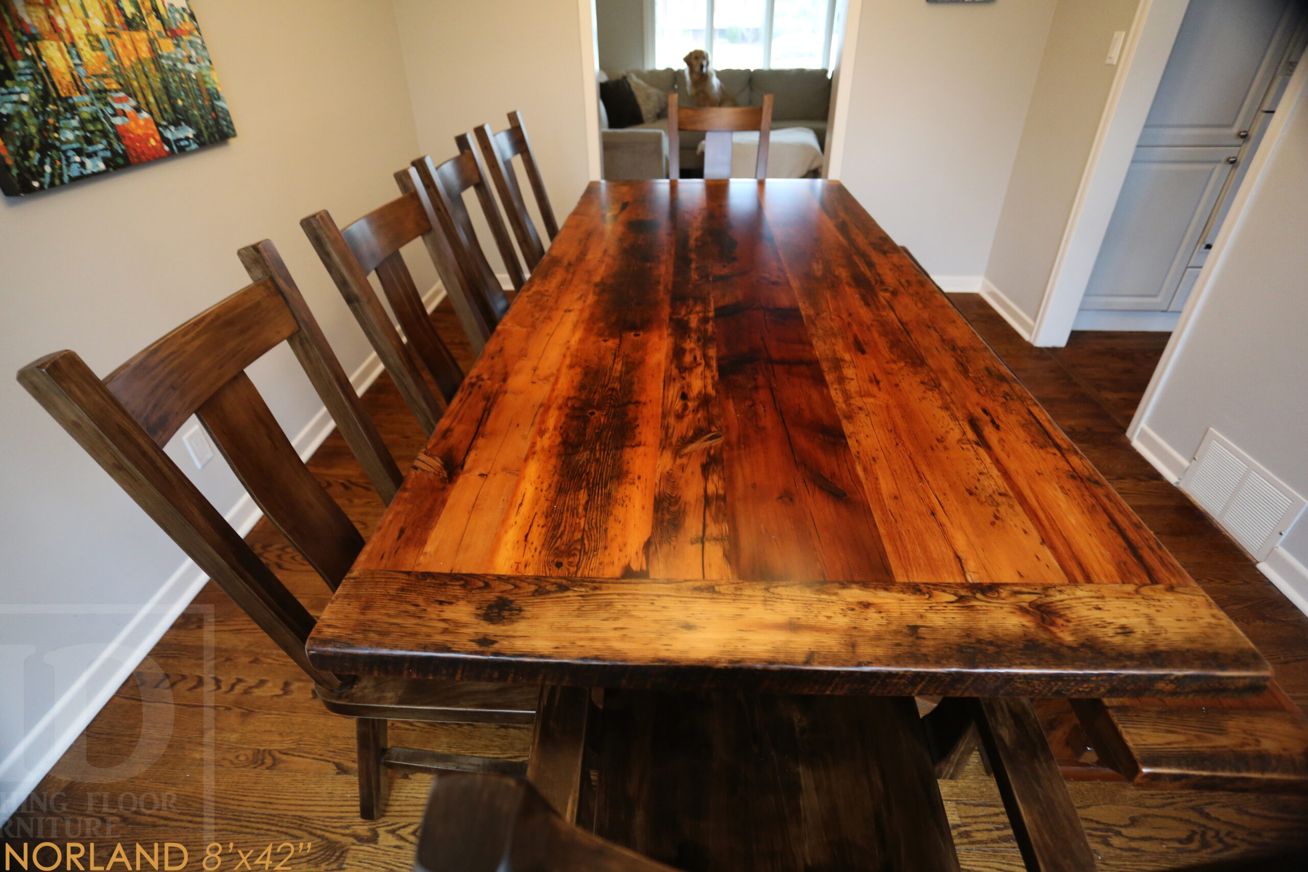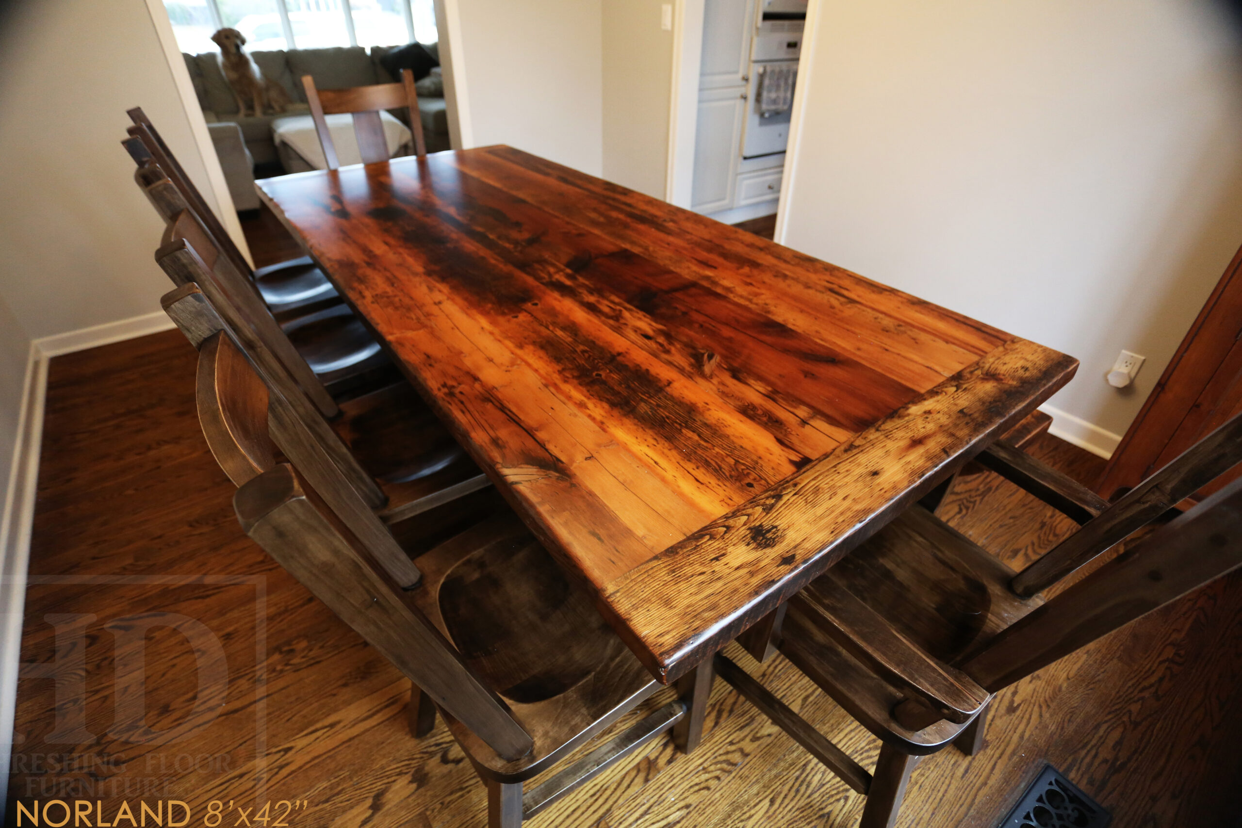 Project details: 8′ Ontario Barnwood Table we made for a Burlington, Ontario home – 42″ wide – Sawbuck base – Original edges & distressing maintained – Old growth Hemlock Threshing Floor 2″ Top – Premium epoxy + satin polyurethane finish – 8′ [matching] bench – 6 Plank Back Chairs / Wormy Maple www.table.ca