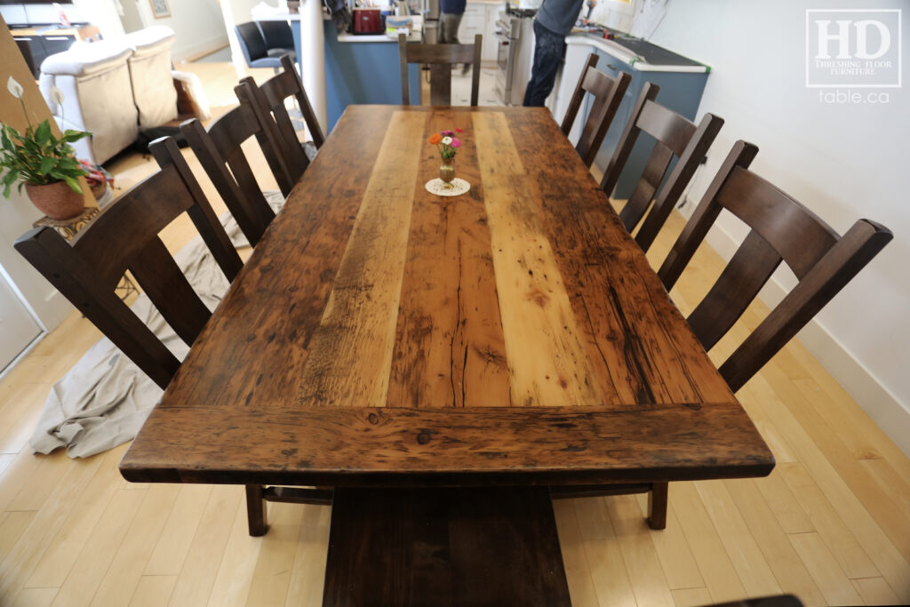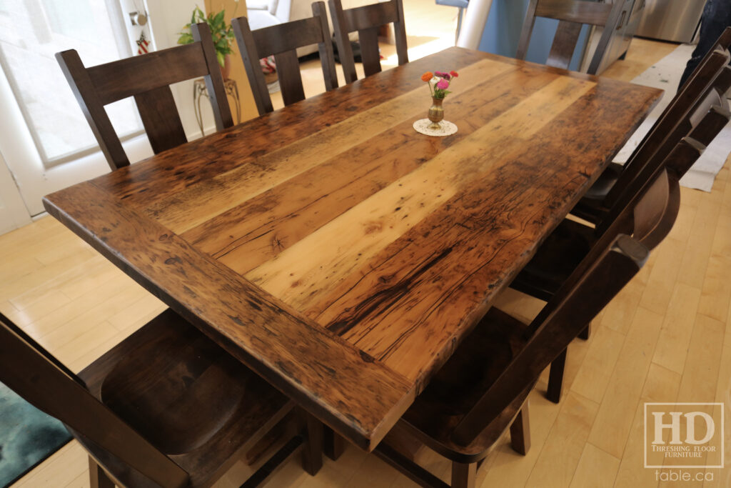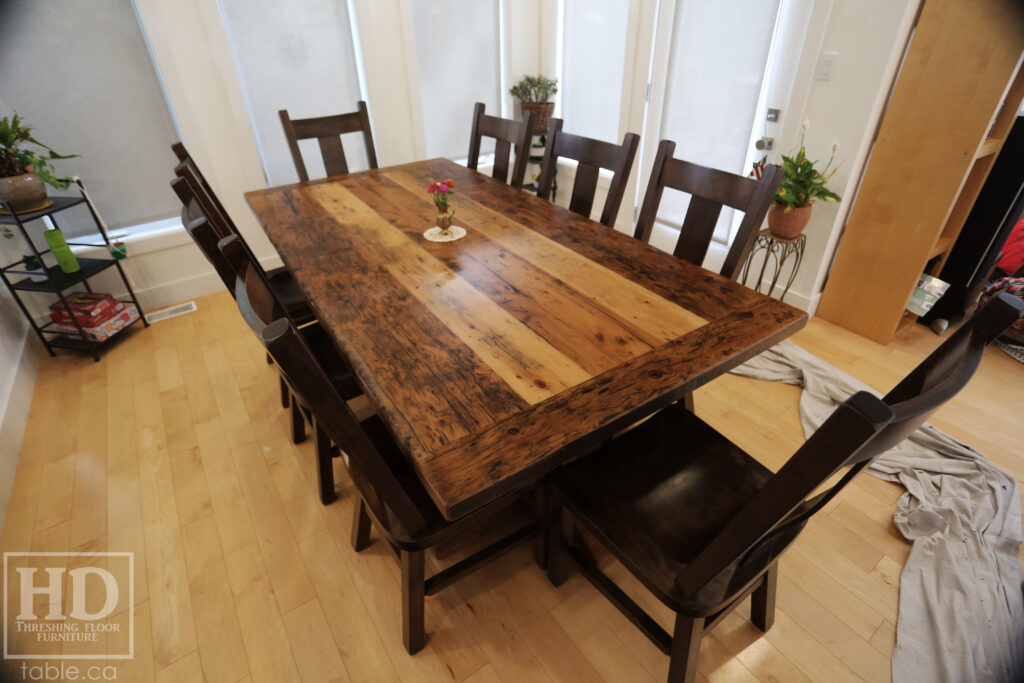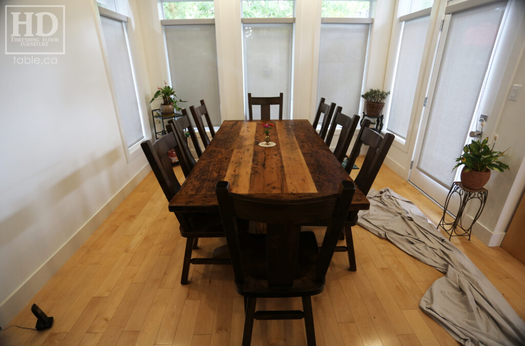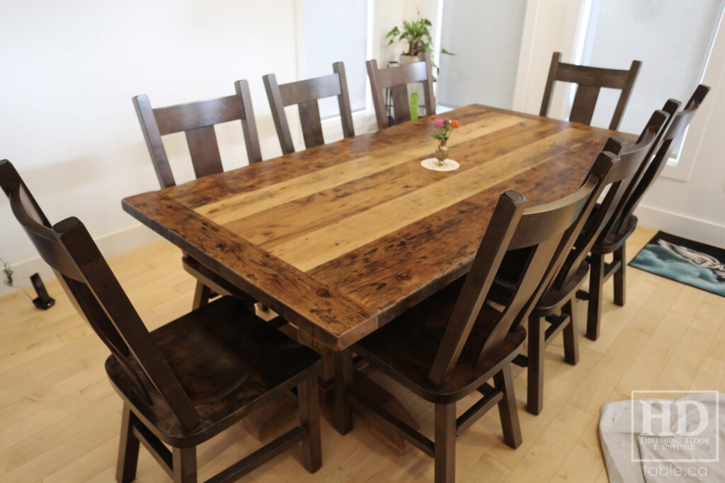 Project Summary: 7′ Ontario Barnwood Table we made for a Guelph Home – 42″ wide – Hand Hewn Pedestals Base – Old Growth Hemlock Threshing Floor Construction – Original edges & distressing maintained – Premium epoxy + polyurethane finish – 6 Plank Back Chairs / Wormy Maple – www.table.ca