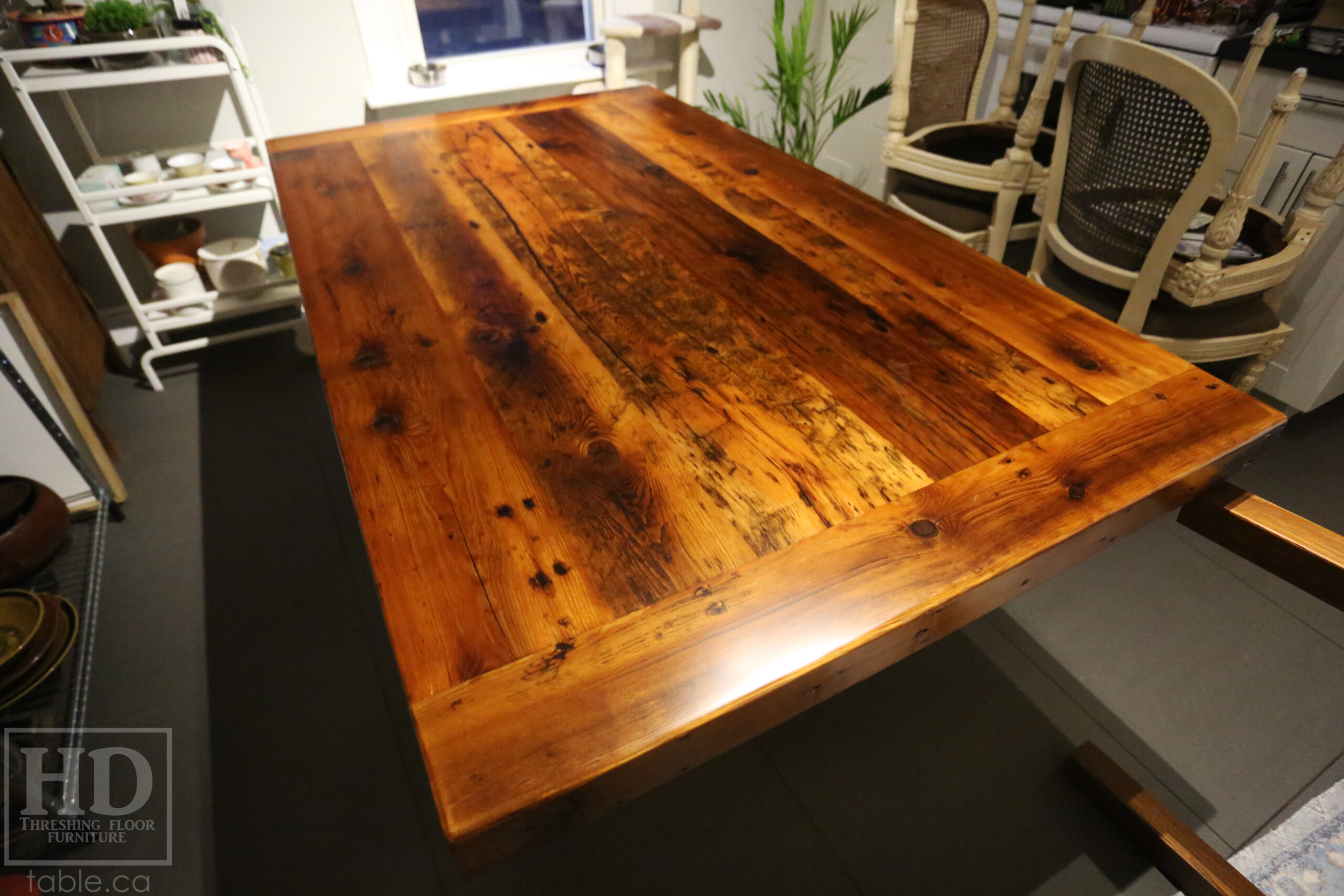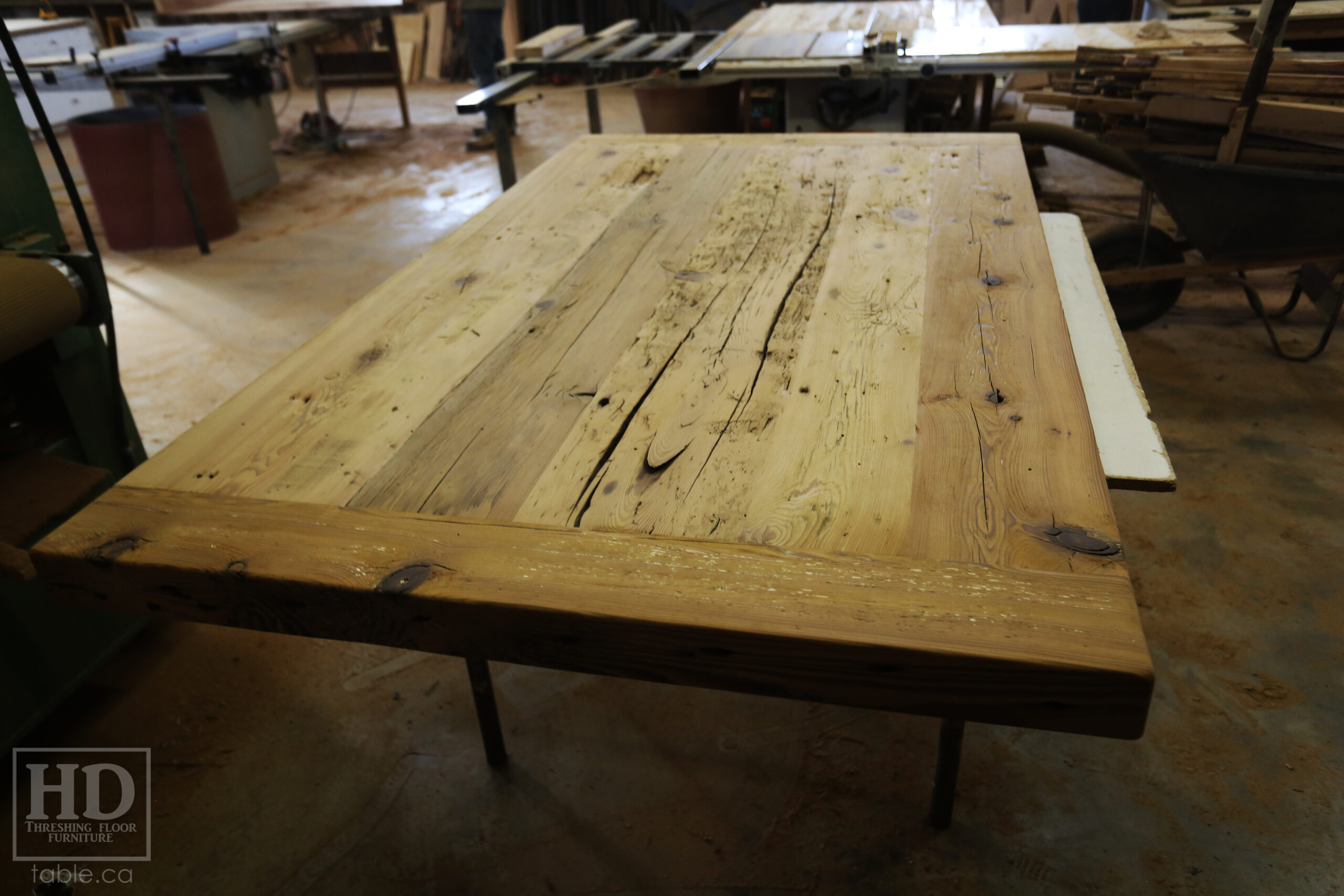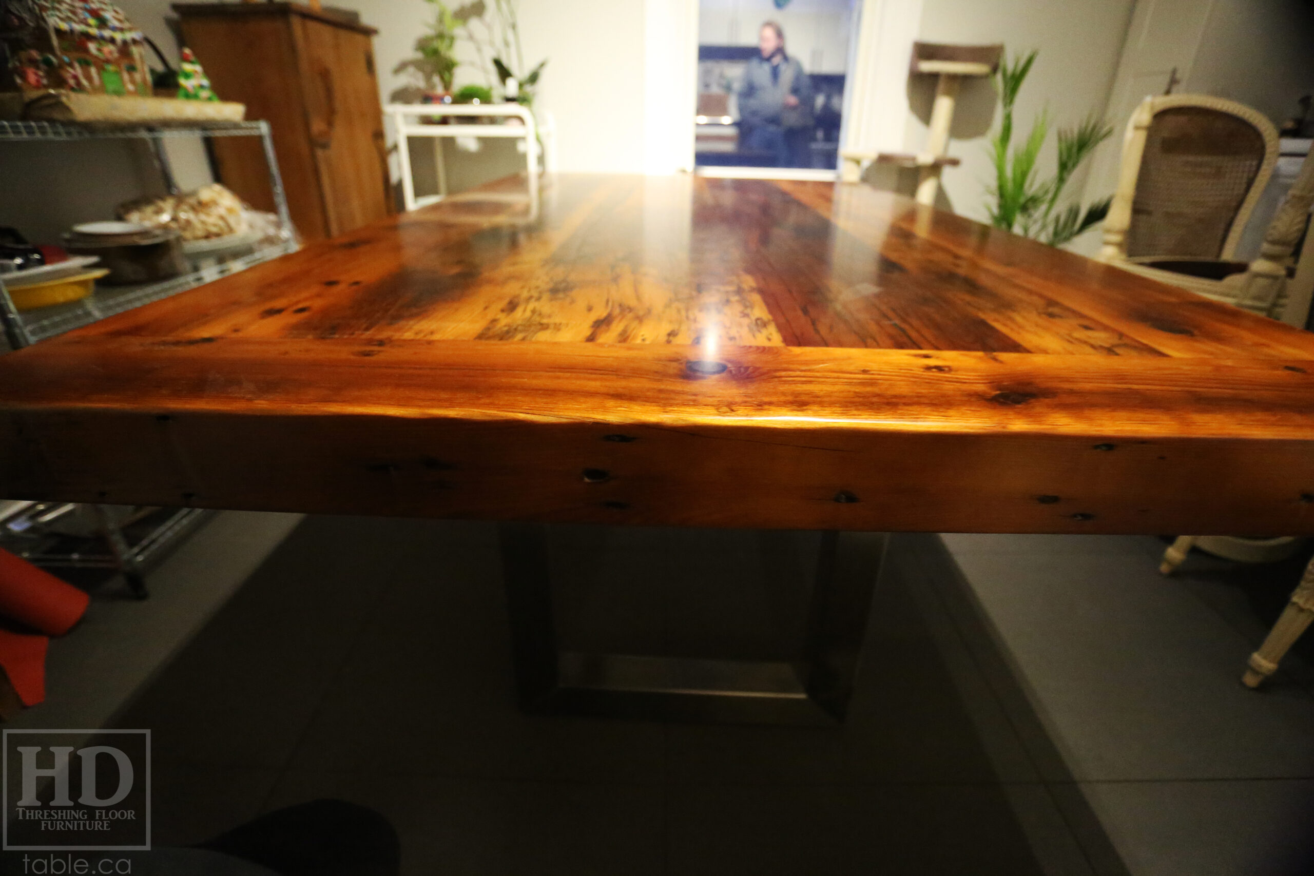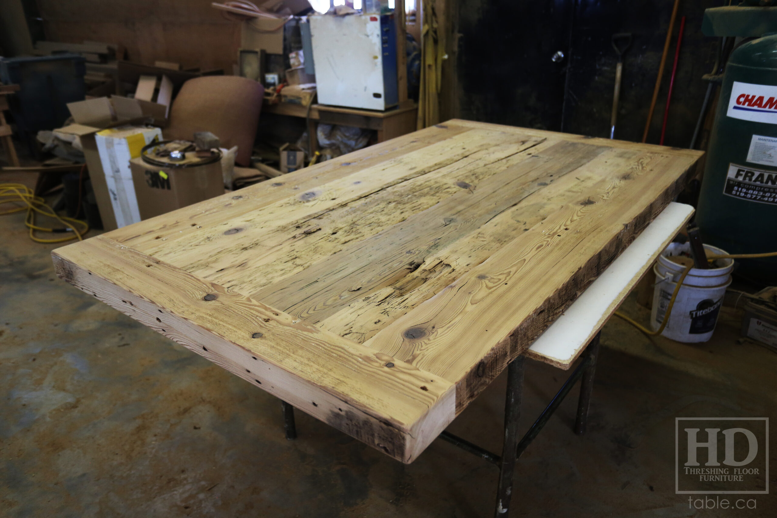 For an even heavier duty look, we offer a 3″ top option [as opposed to our typical 2″]. Here’s a recent reclaimed wood table project we did for a Guelph customer with this option: