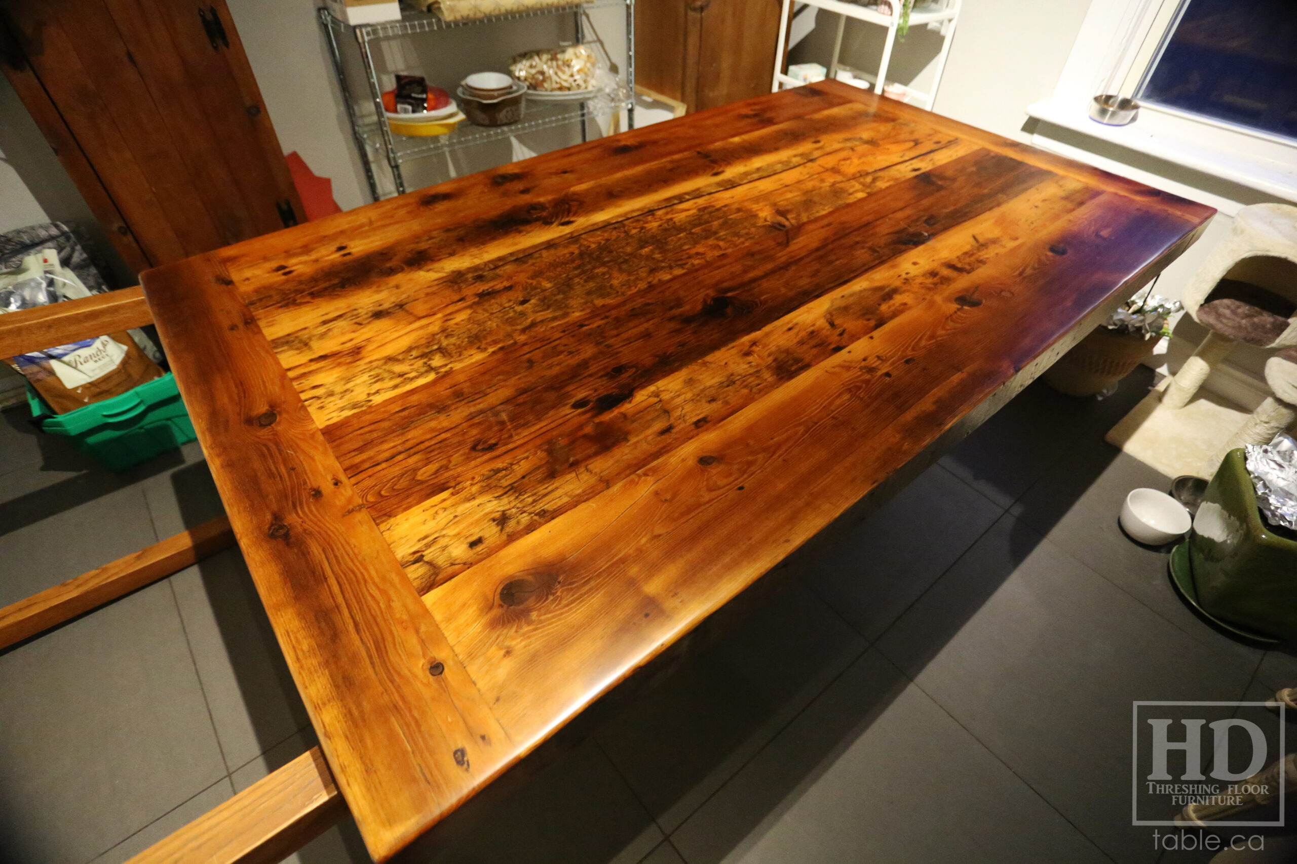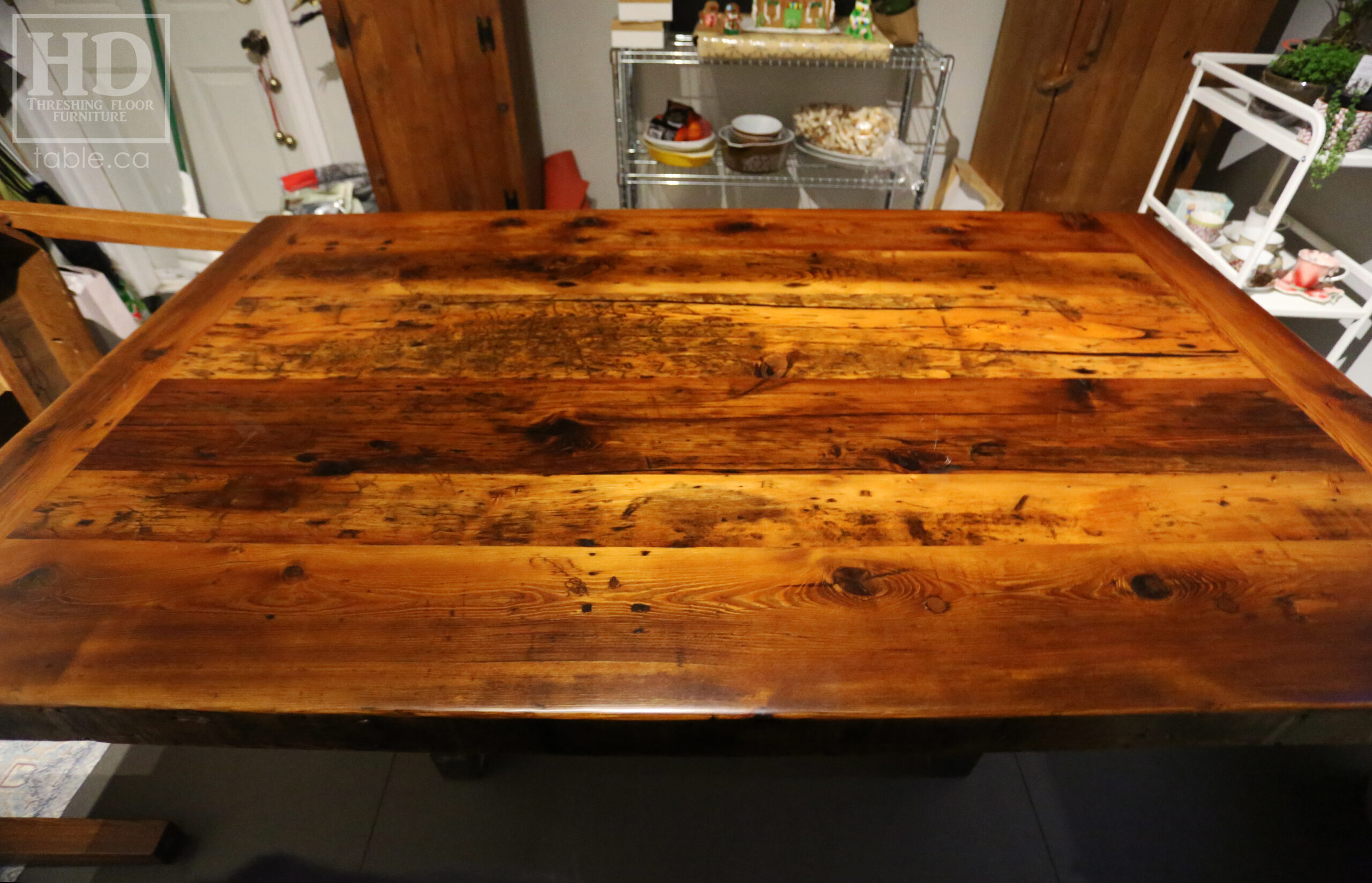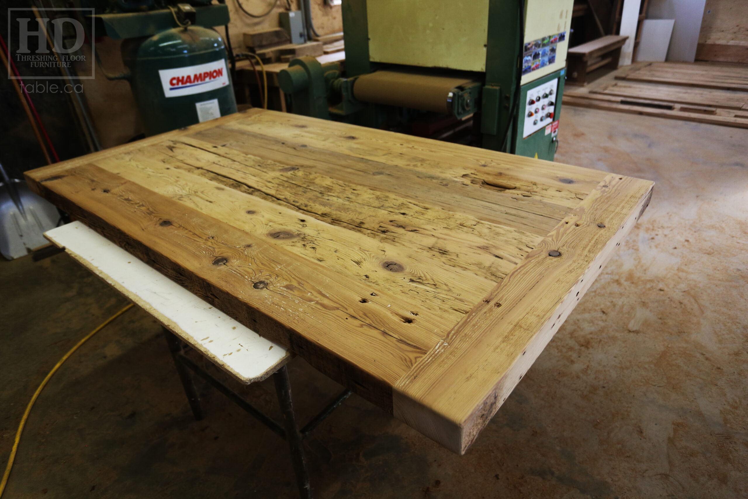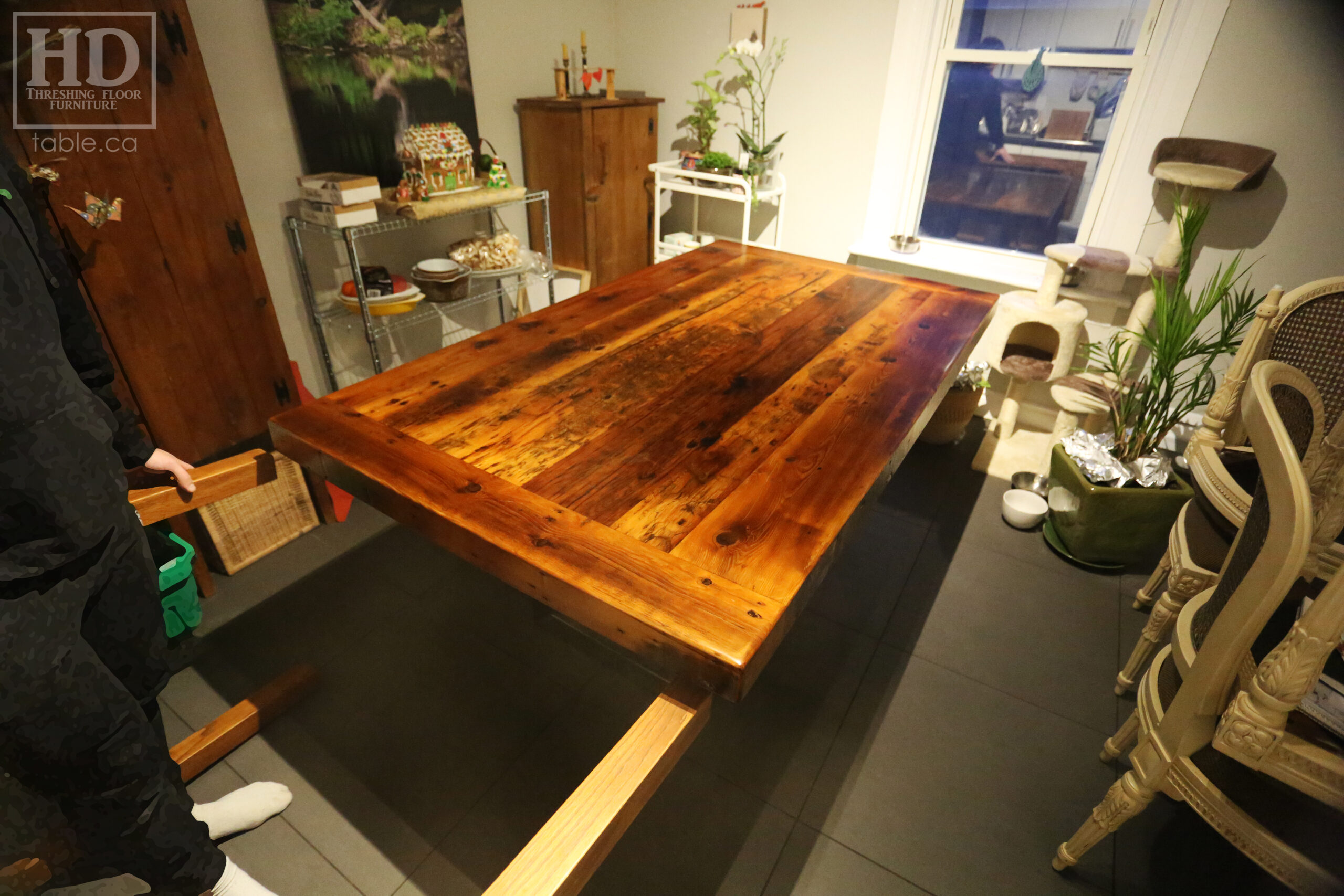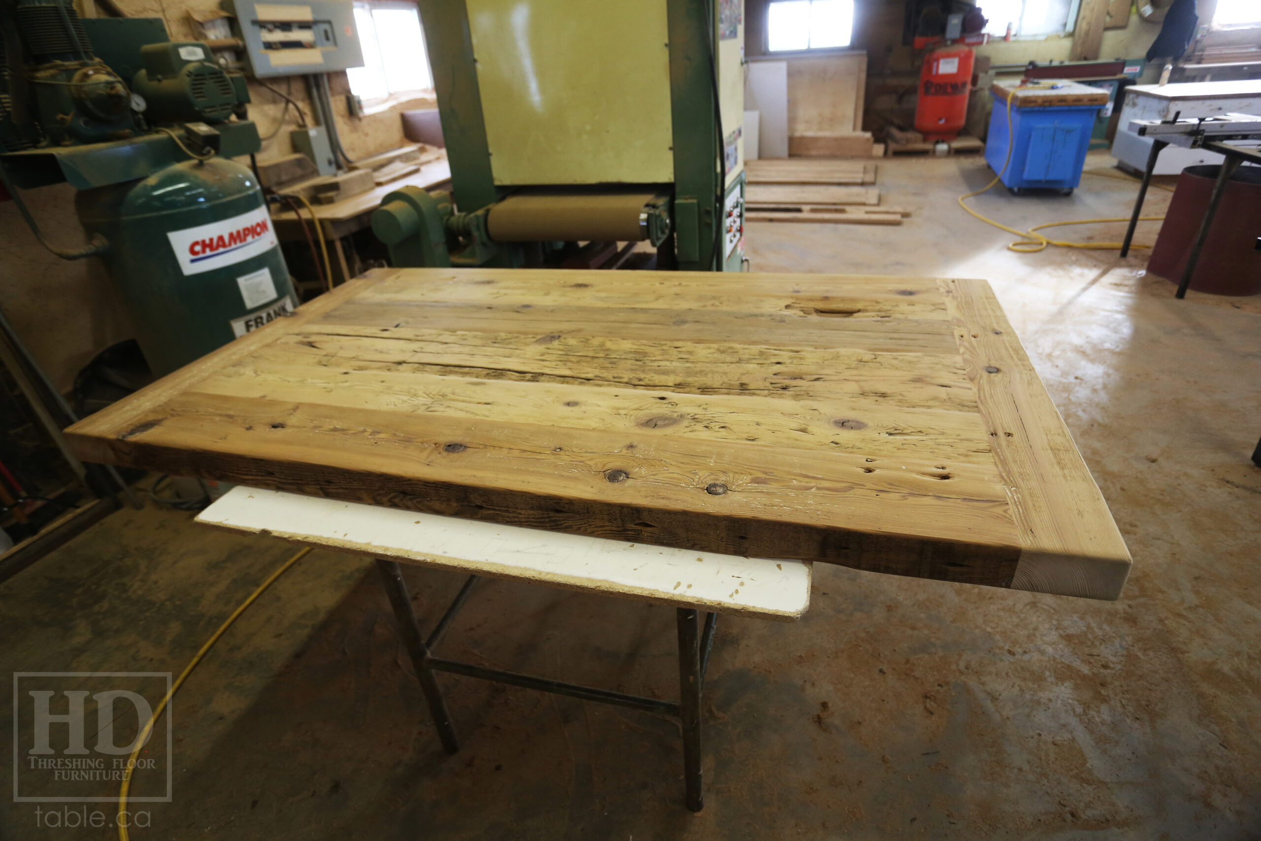 For an even heavier duty look, we offer a 3″ top option [as opposed to our typical 2″]. Here’s a recent reclaimed wood table project we did for a Guelph customer with this option: