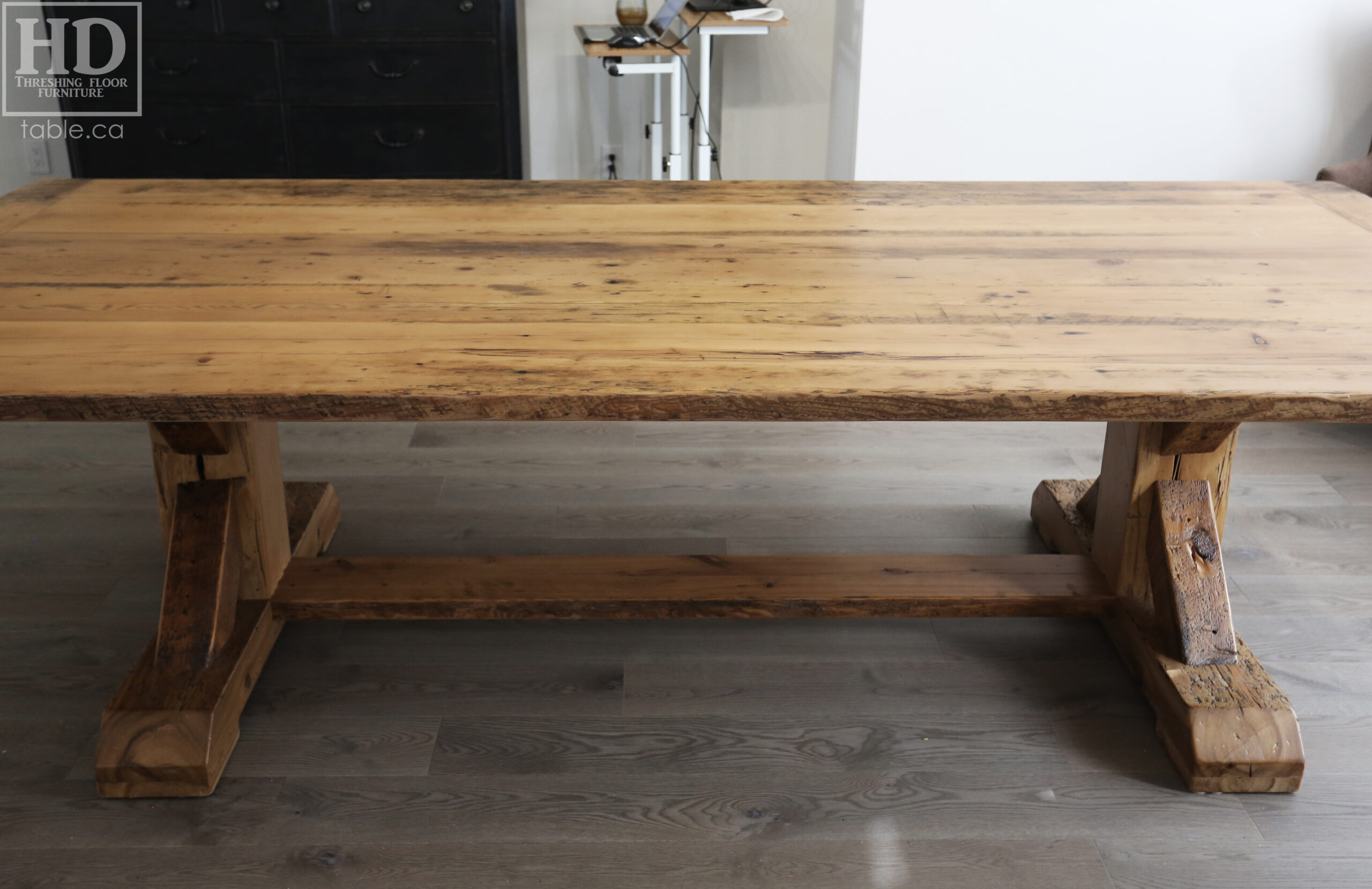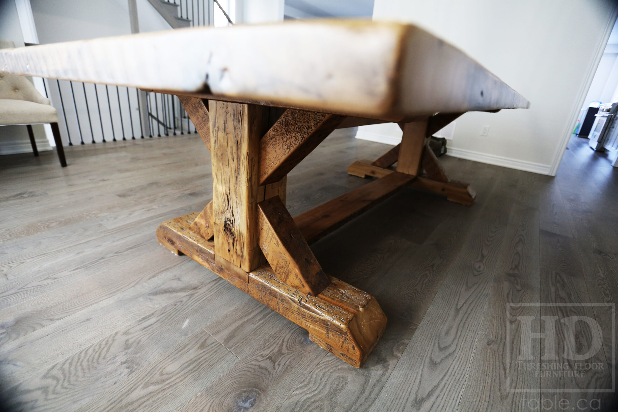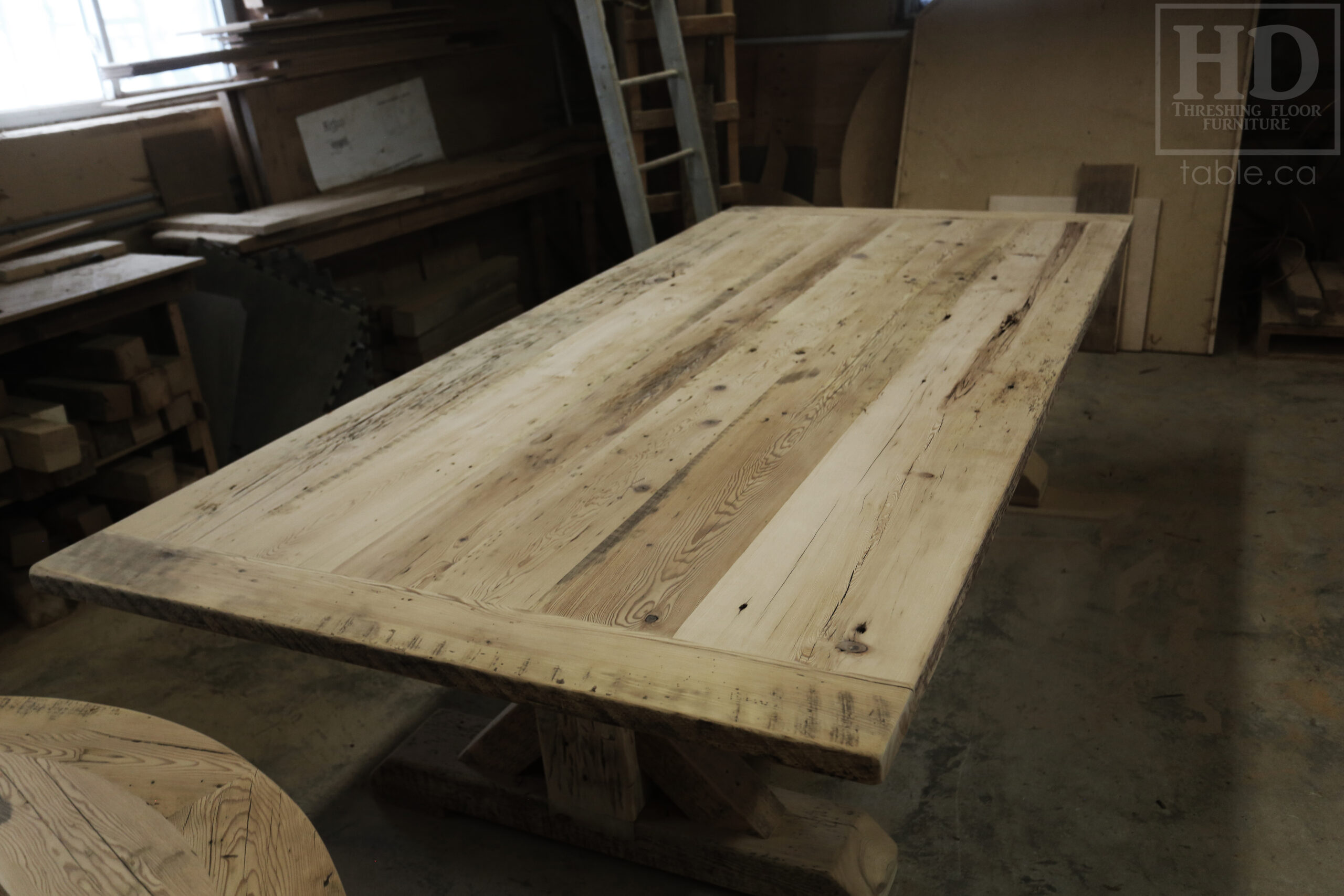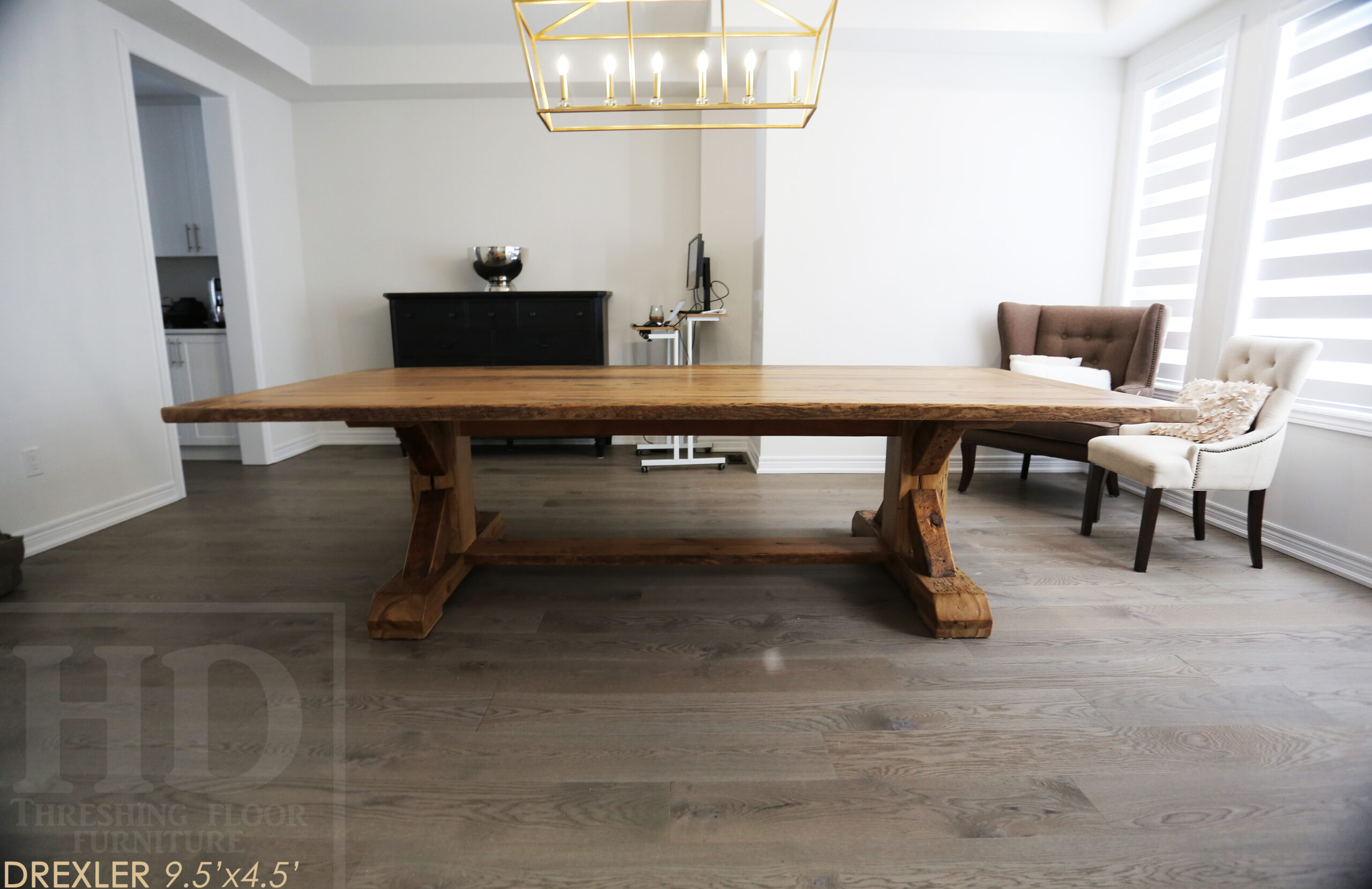 Project Summary: 9.5’ Reclaimed Ontario Barnwood Table we made for a Rockwood, Ontario home – 4.5’ wide – Sawbuck Base [Beam Type Option] – Old Growth Hemlock Threshing Floor Construction – Original edges & distressing maintained – Bread Edge Boards – Premium epoxy + matte polyurethane finish – www.table.ca