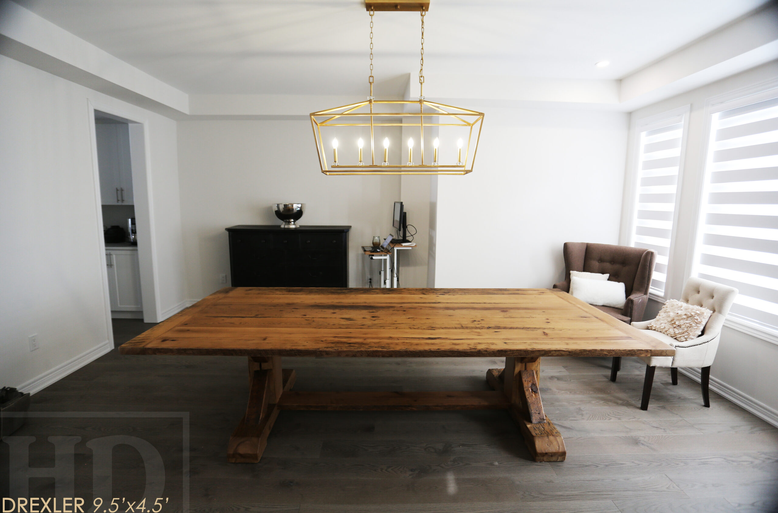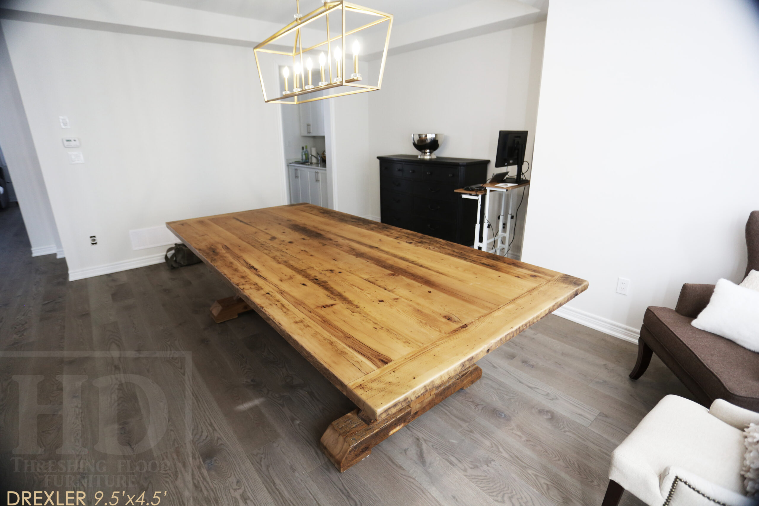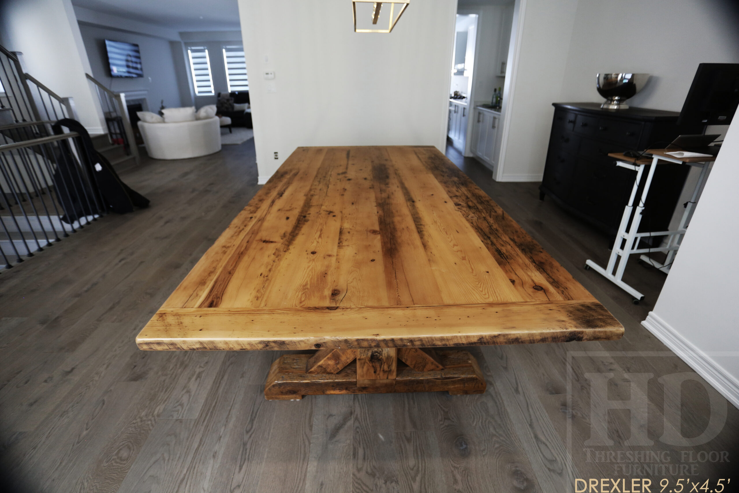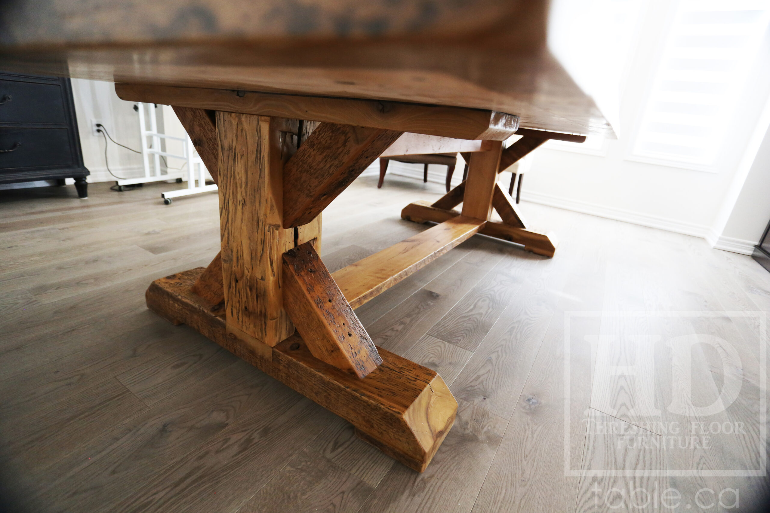 Project Summary: 9.5’ Reclaimed Ontario Barnwood Table we made for a Rockwood, Ontario home – 4.5’ wide – Sawbuck Base [Beam Type Option] – Old Growth Hemlock Threshing Floor Construction – Original edges & distressing maintained – Bread Edge Boards – Premium epoxy + matte polyurethane finish – www.table.ca