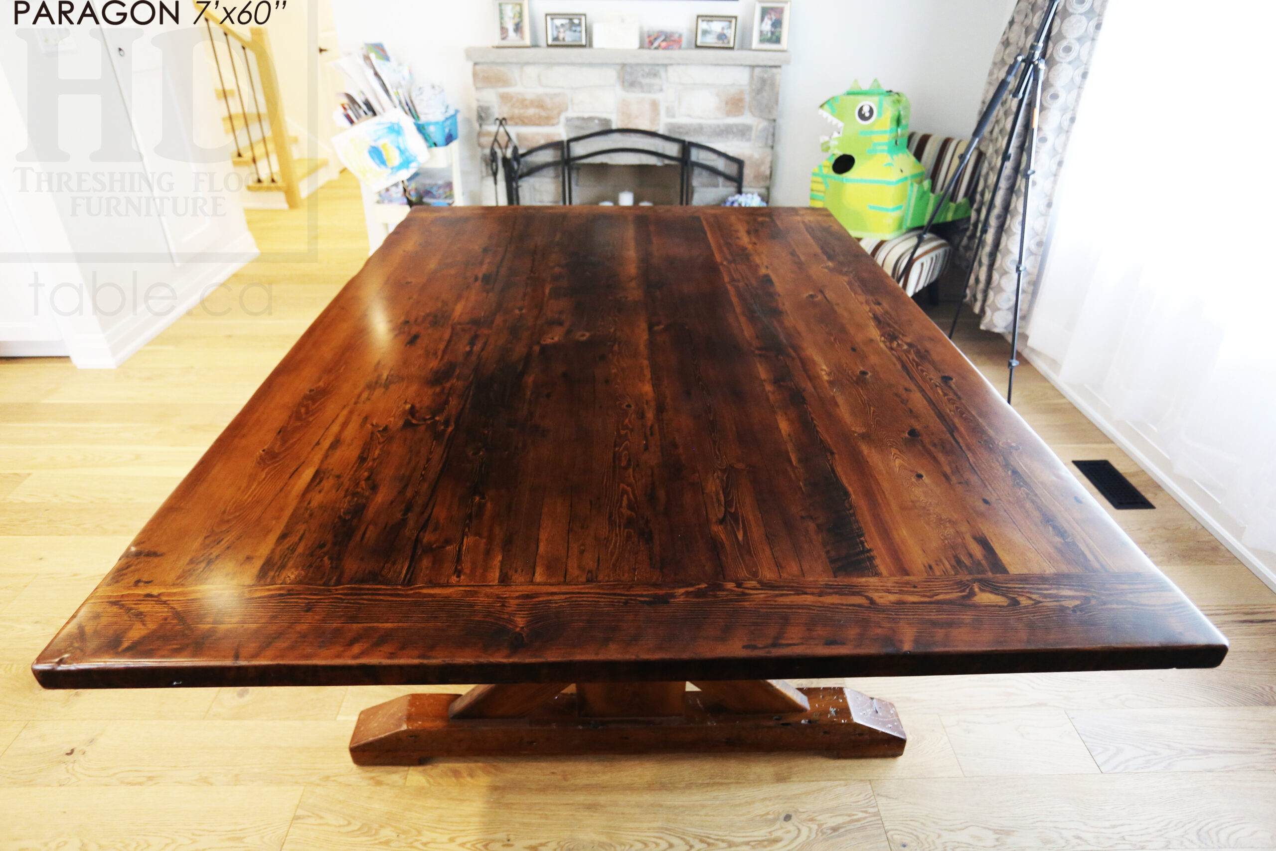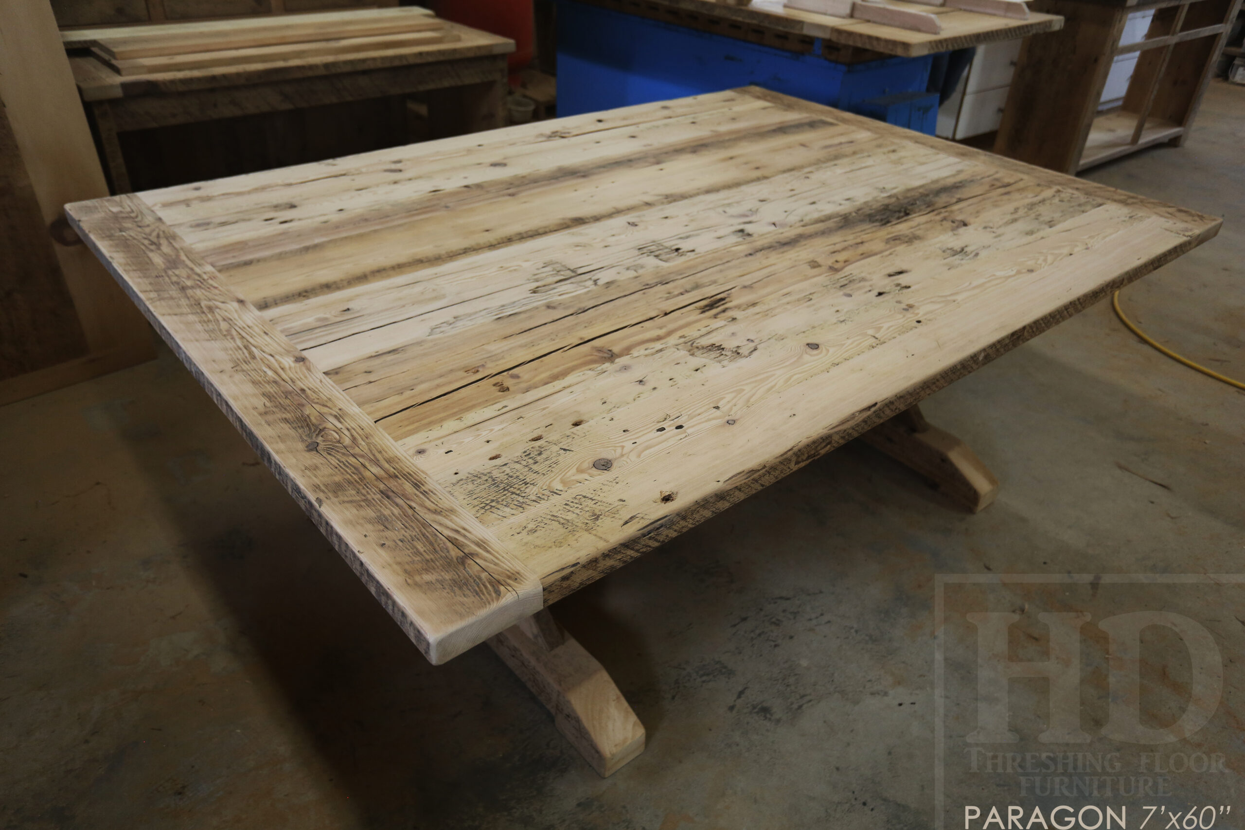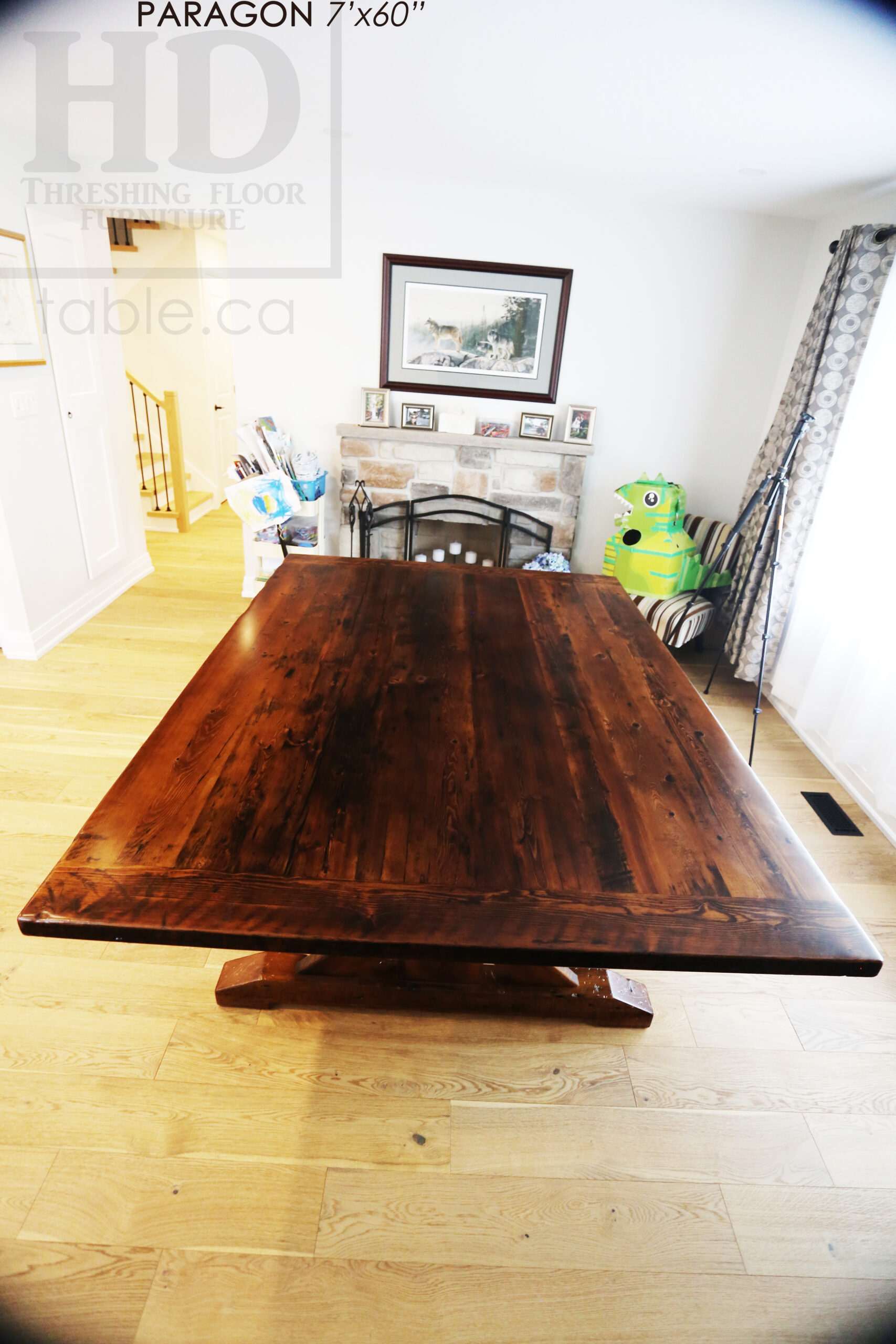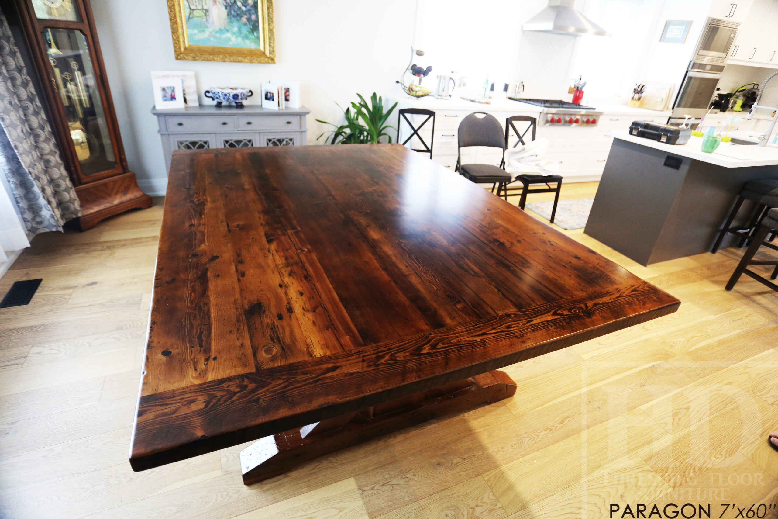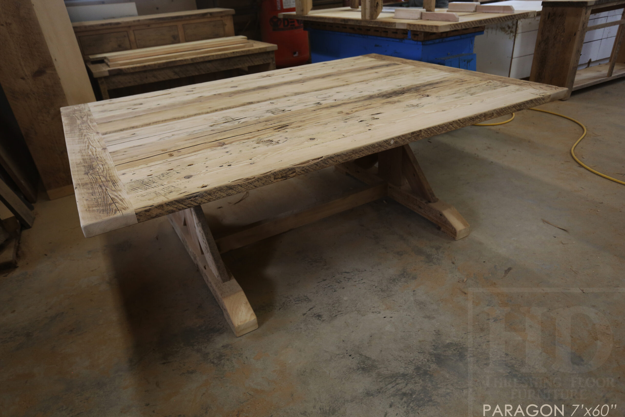 Project Summary: 7’ Reclaimed Barnwood Table we made for a Toronto, Ontario home – 60†wide – Sawbuck Base – Old Growth Ontario Hemlock Threshing Floor Construction – Original edges & distressing maintained – Bread Edge Boards – Premium epoxy + satin polyurethane finish – www.table.ca