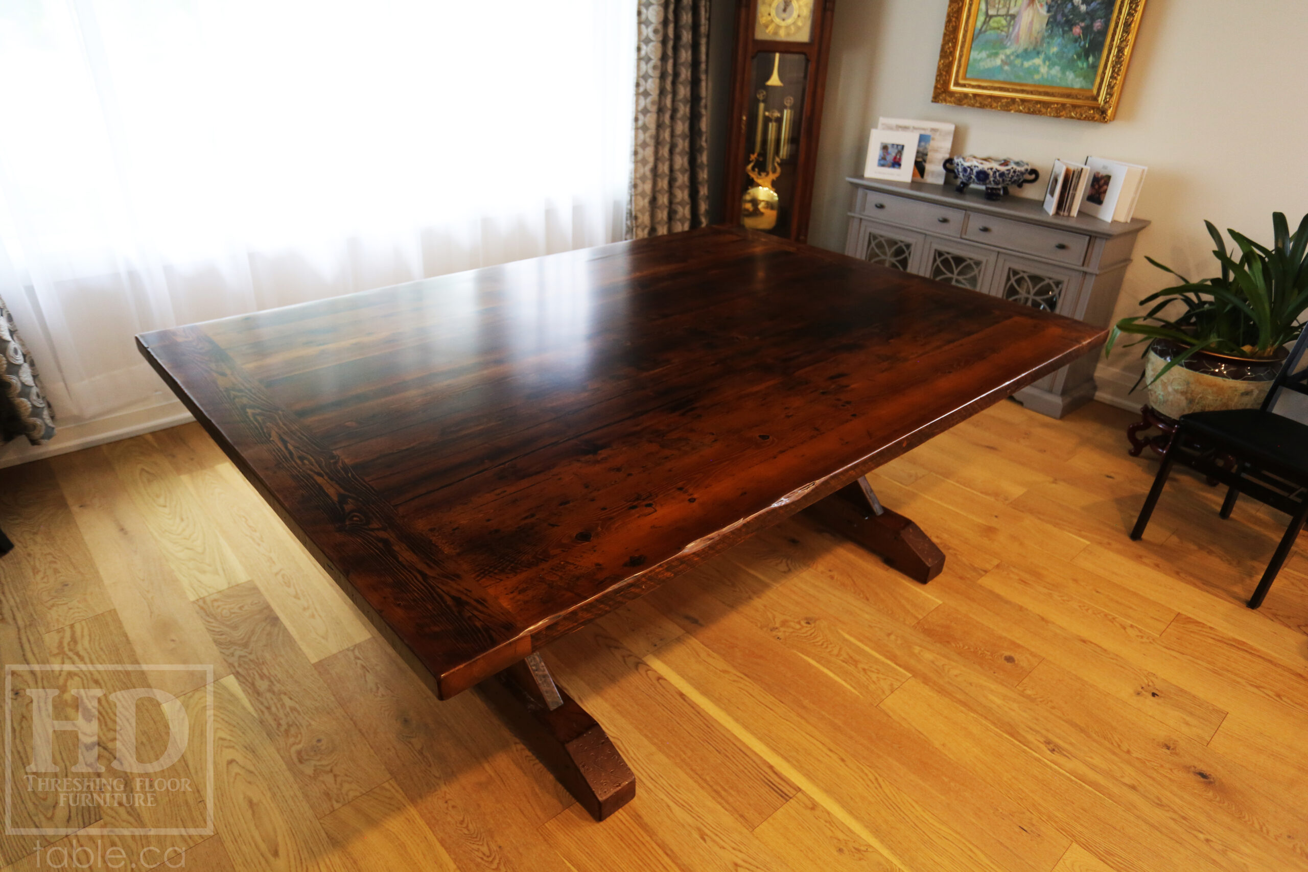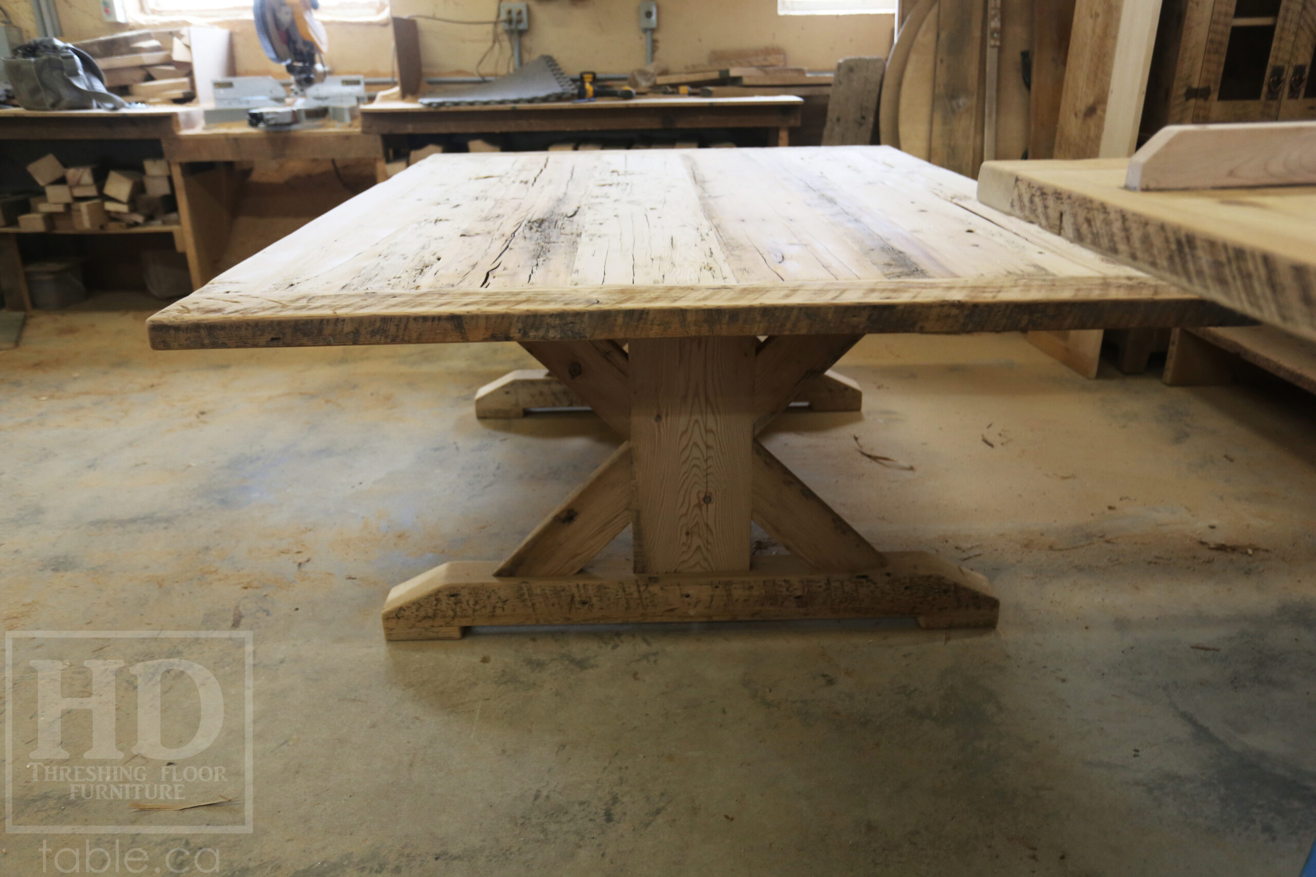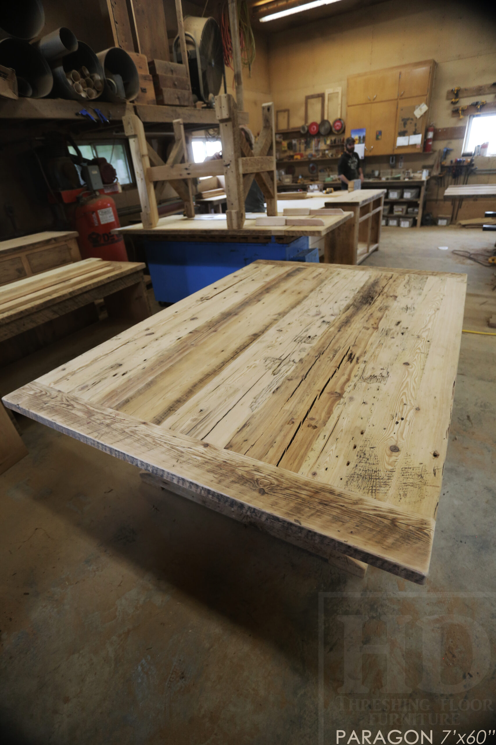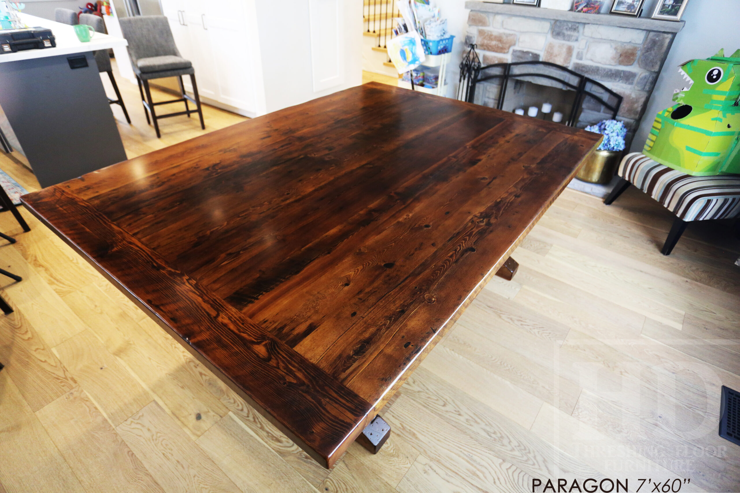 Project Summary: 7’ Reclaimed Barnwood Table we made for a Toronto, Ontario home – 60†wide – Sawbuck Base – Old Growth Ontario Hemlock Threshing Floor Construction – Original edges & distressing maintained – Bread Edge Boards – Premium epoxy + satin polyurethane finish – www.table.ca