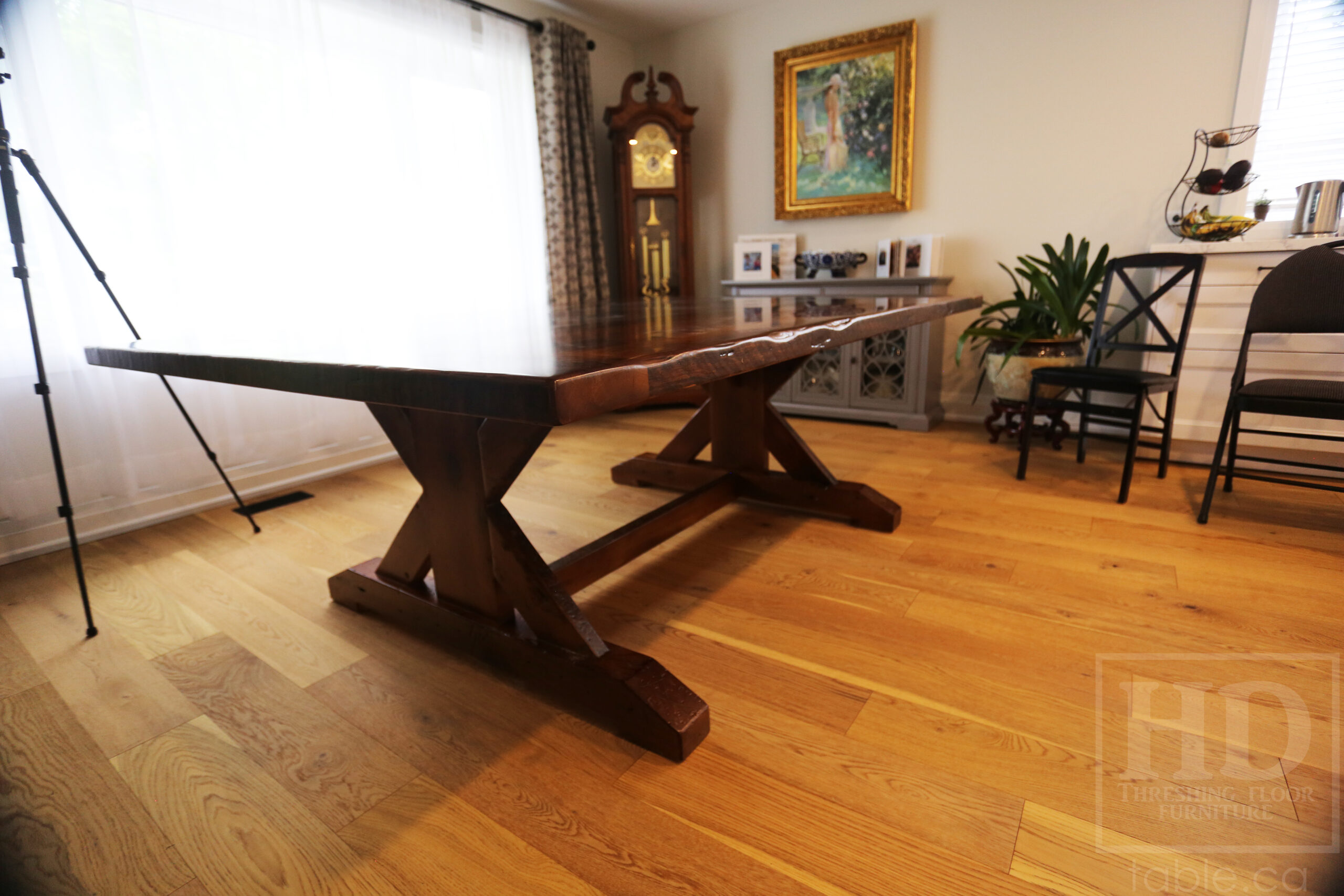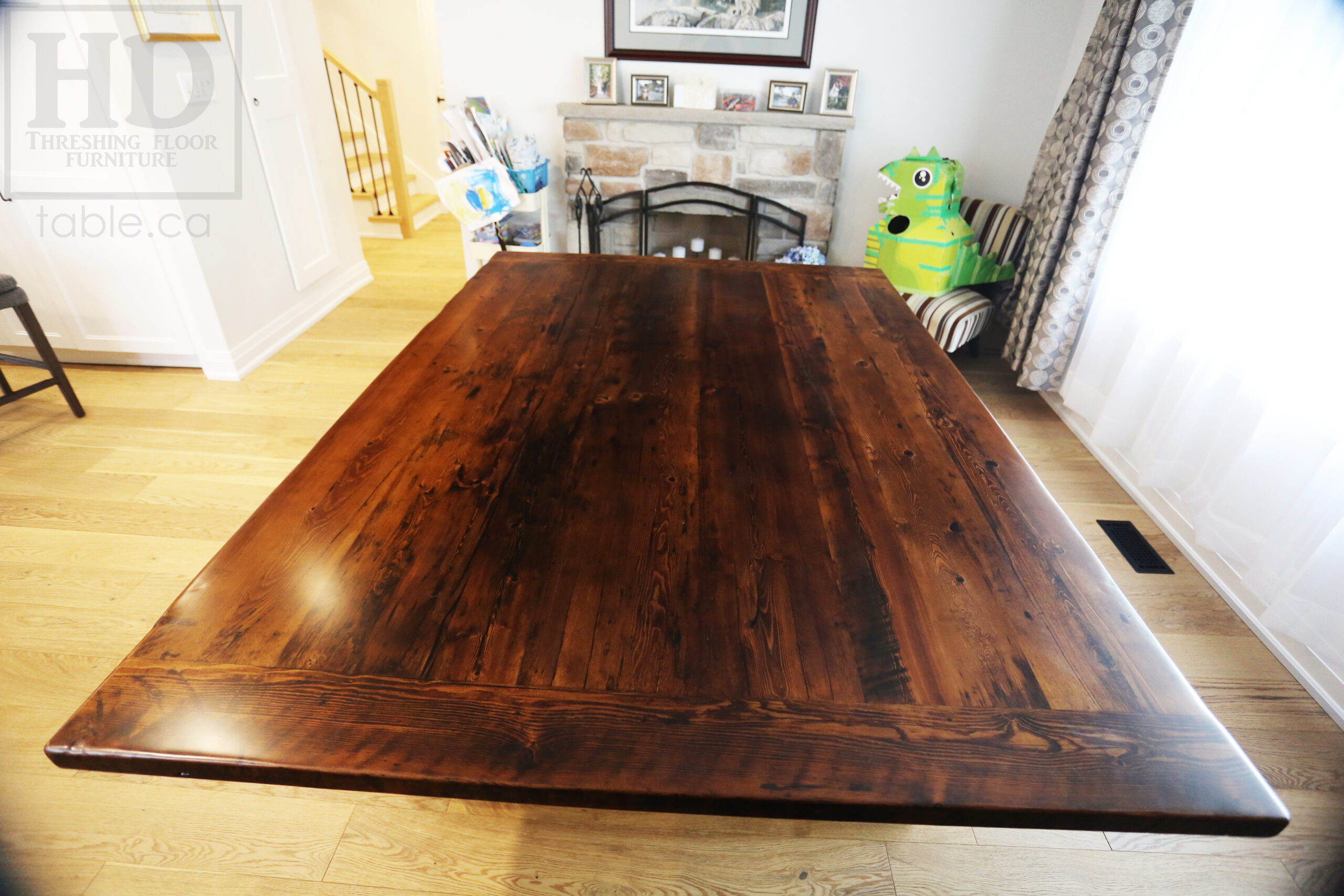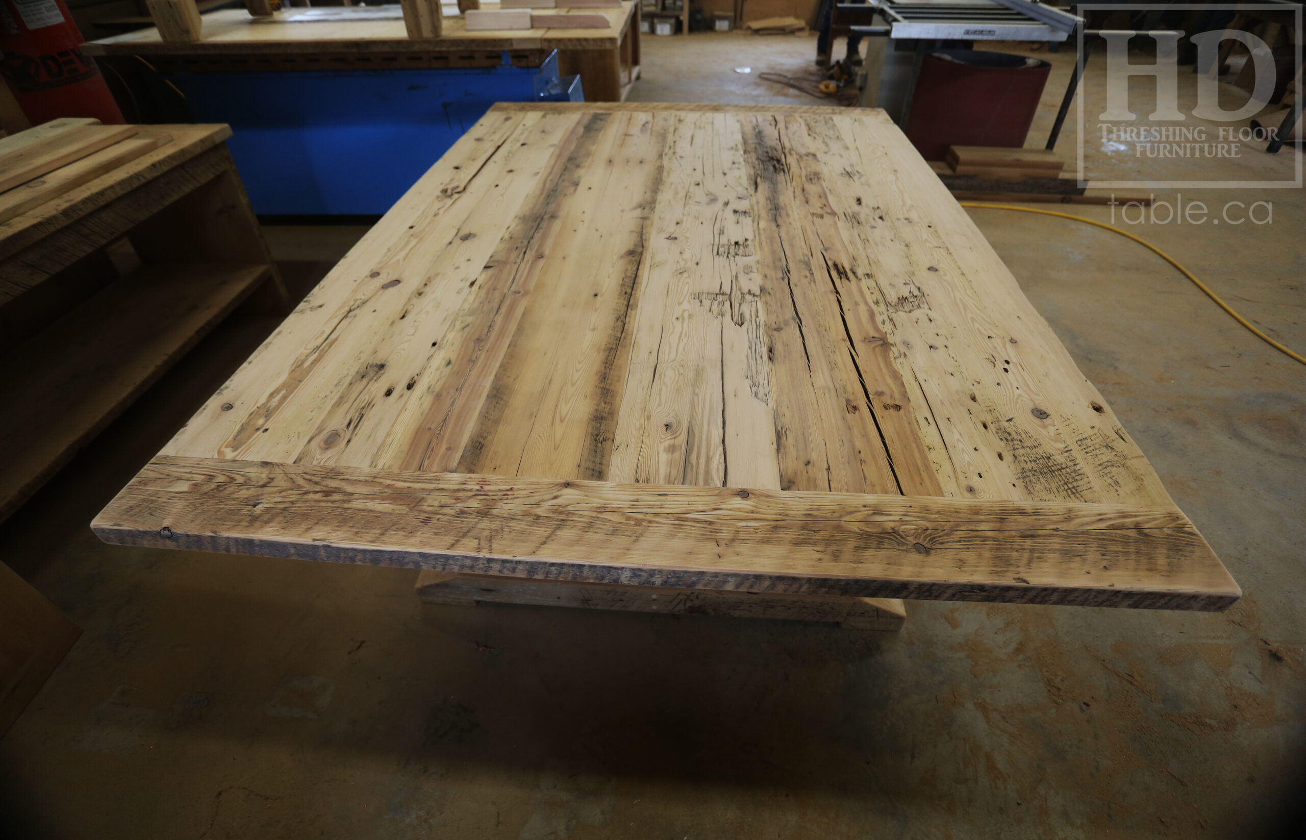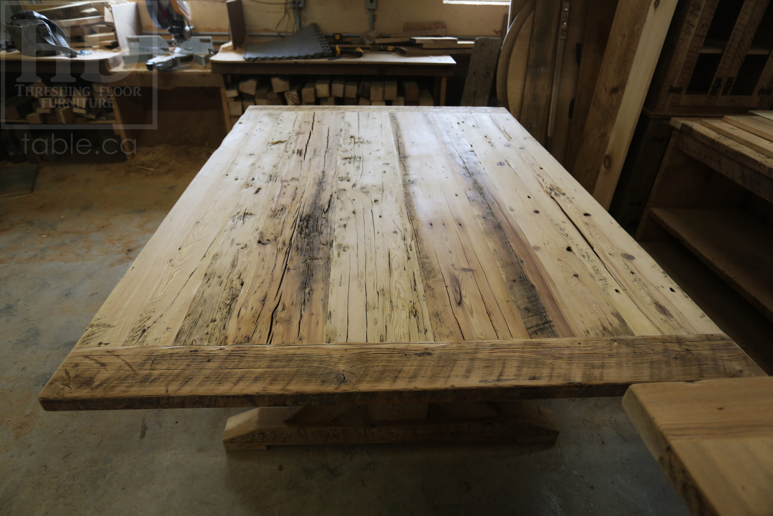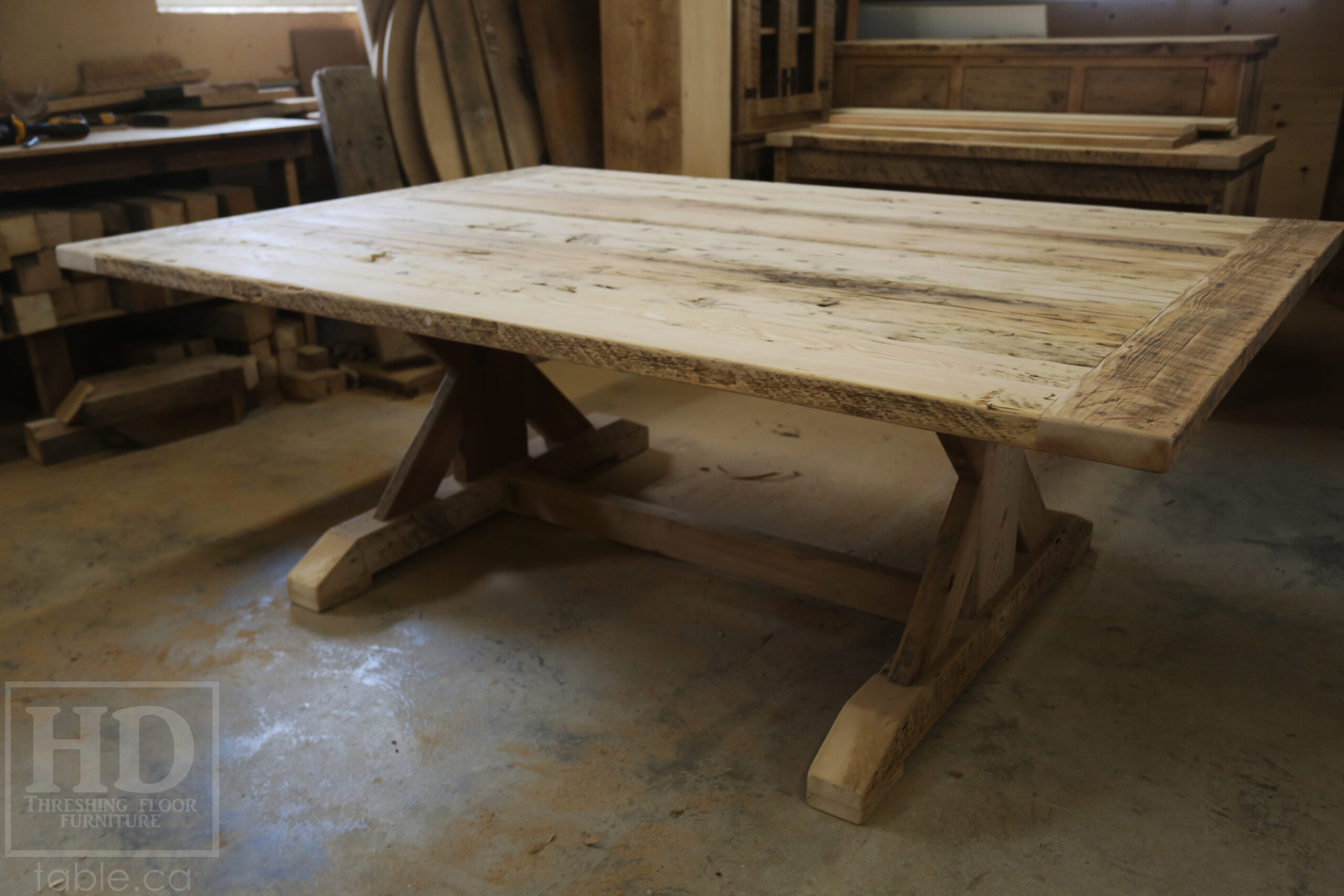 Project Summary: 7’ Reclaimed Barnwood Table we made for a Toronto, Ontario home – 60†wide – Sawbuck Base – Old Growth Ontario Hemlock Threshing Floor Construction – Original edges & distressing maintained – Bread Edge Boards – Premium epoxy + satin polyurethane finish – www.table.ca