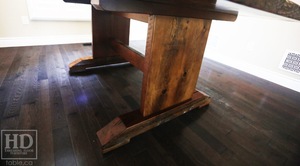 Project details: 6’ Reclaimed Ontario Barnwood Table we made for a Waterdown, Ontario home – Trestle Base [No bottom rail option] – Old Growth Hemlock Threshing Floor Construction – Original edges & distressing maintained –Bread Edges – Premium epoxy + satin polyurethane finish – www.table.ca