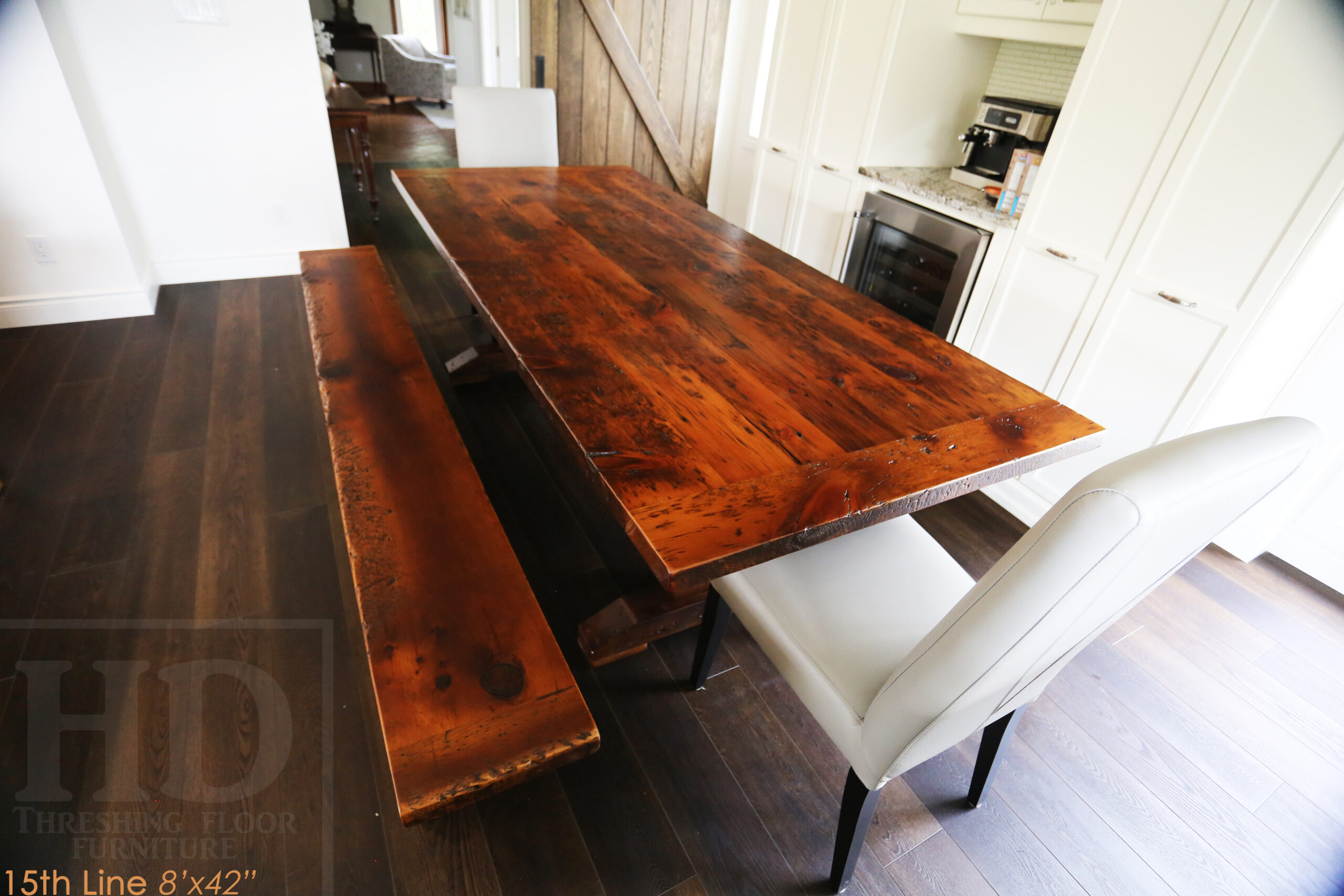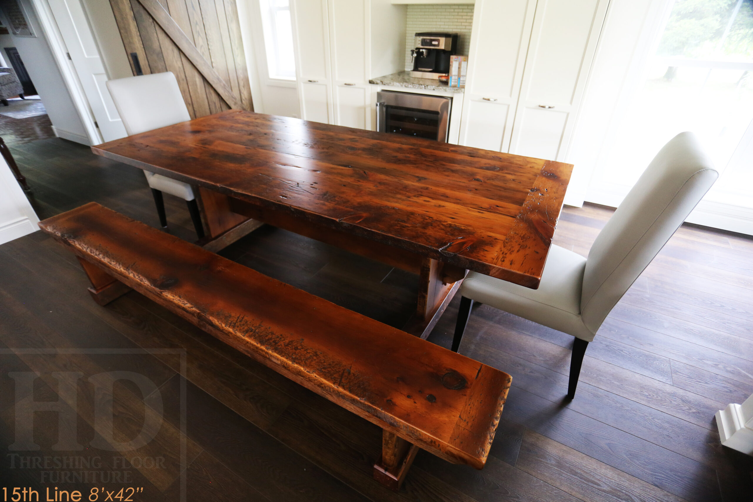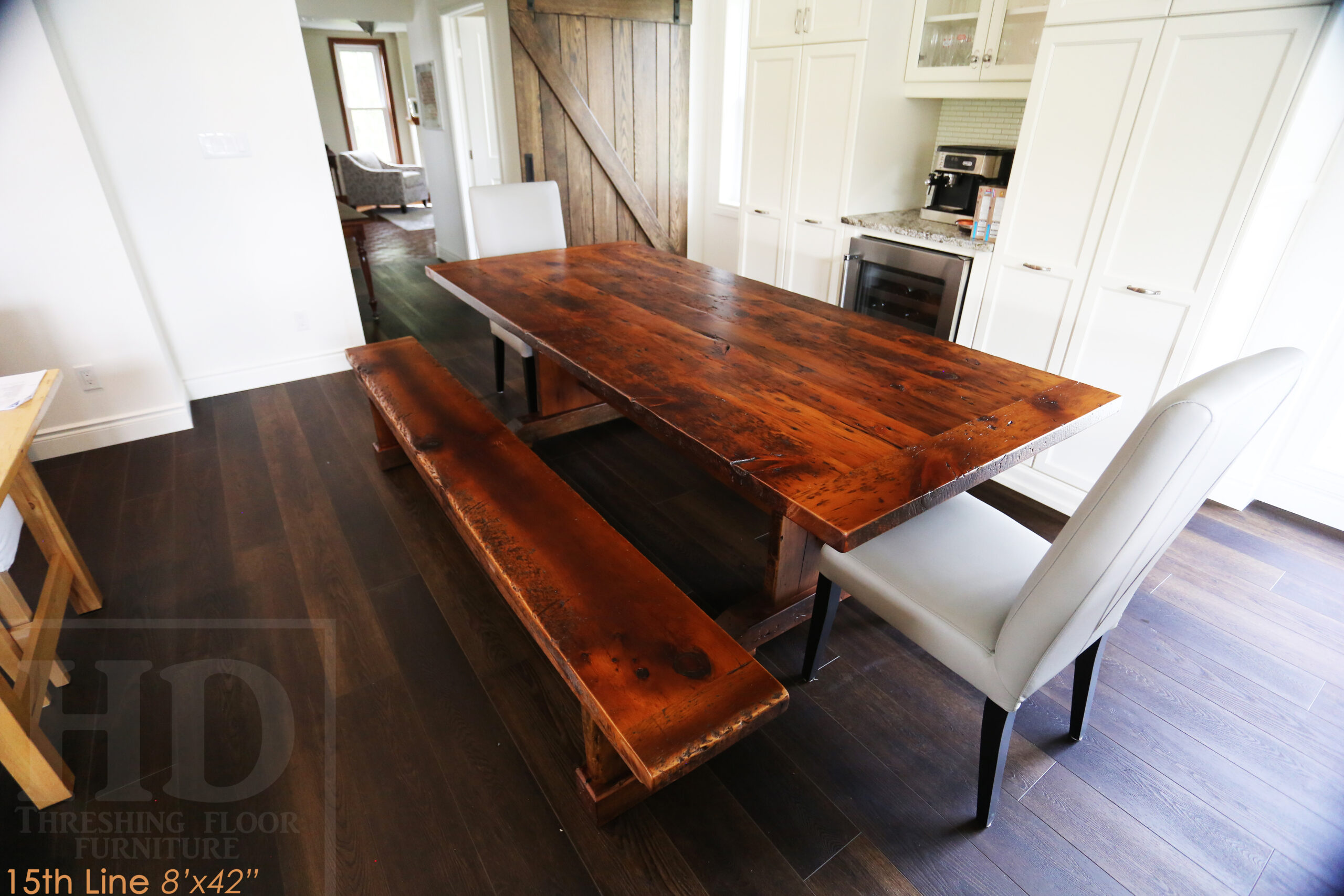Project summary: 8’ Reclaimed Ontario Barnwood Table we made for a Woodstock, Ontario home – 42†wide – Trestle Base – Old Growth Pine Threshing Floor Construction – Original edges & distressing maintained – Matte Option polyurethane finish [no epoxy filling] – 8’ [matching] Trestle Bench / 4†height feet – 2 Top Grain Leather Parsons Chairs / Slate Colour – www.table.ca