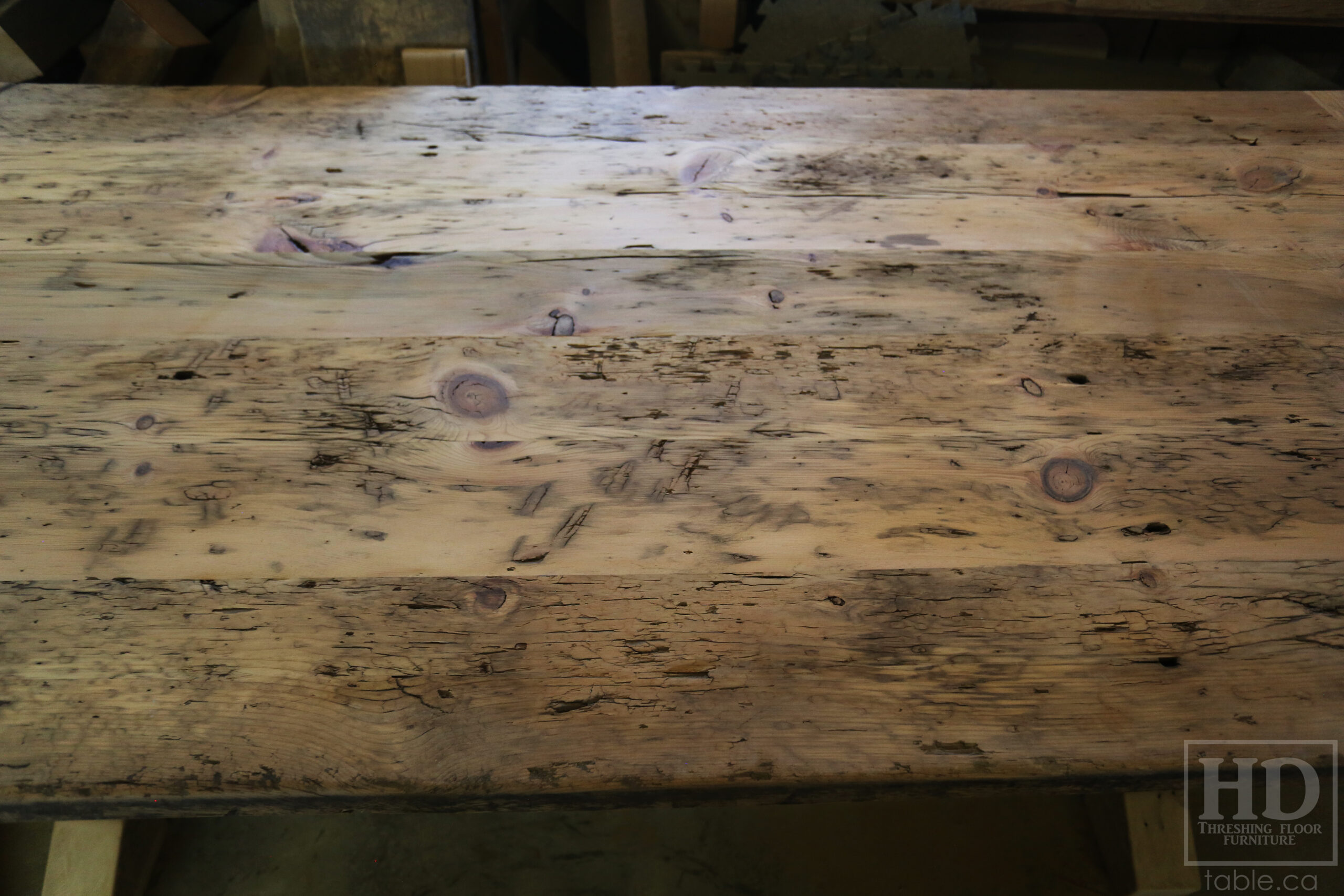 While our epoxy clearcoat finish will make our tops much more practical/durable, sometimes a polyurethane finish only may be appropriate. The main benefit to this option is you can actually feel all the original pioneer distressing. With a polyurethane only option we highly recommend old growth pine; as it’s less brittle/slivery than hemlock. Check out this recent reclaimed wood trestle table project we made for a Woodstock home: