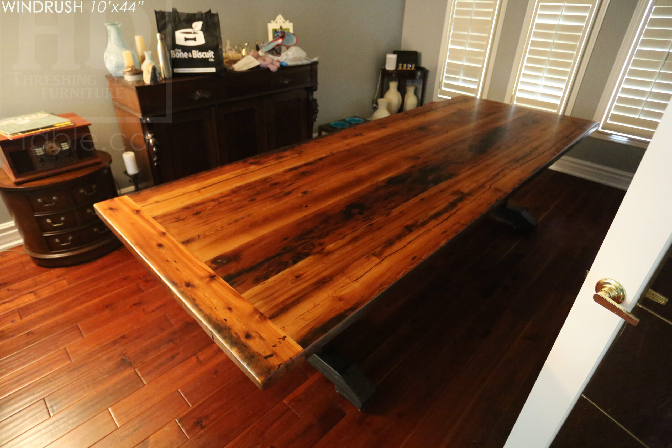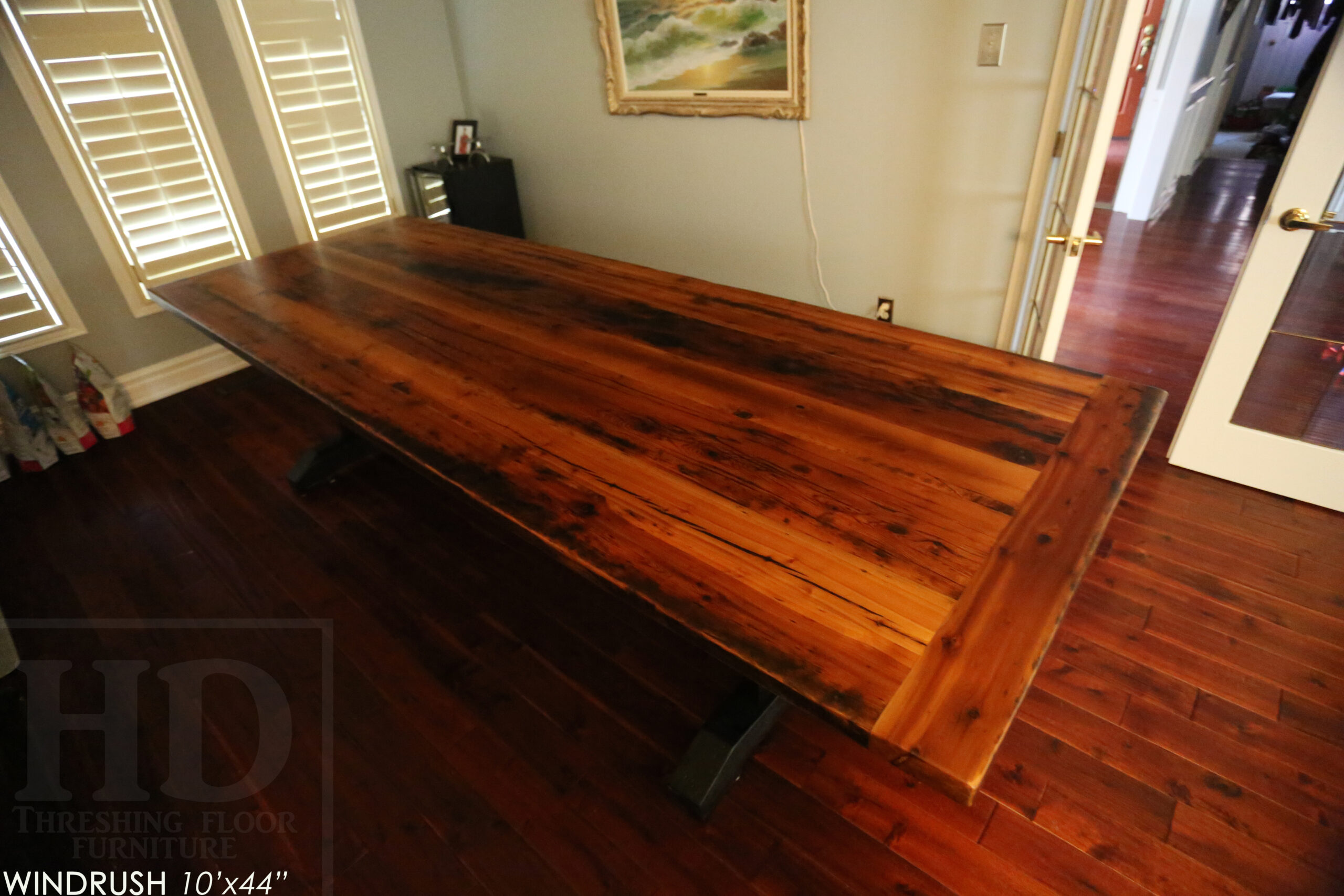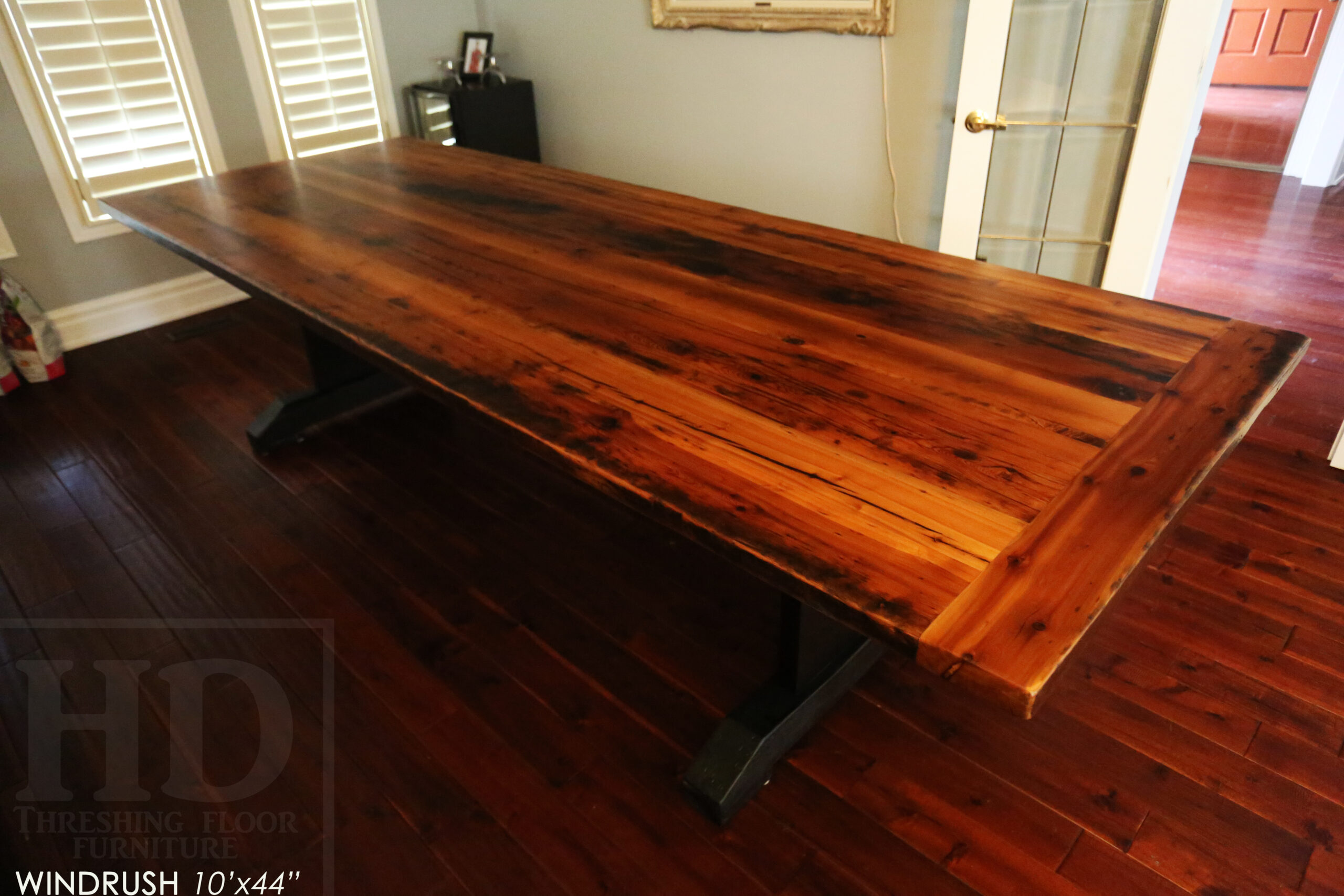 Project Summary: 10’ Reclaimed Ontario Barnwood Trestle Table we made for an Oakville, Ontario home – 44†wide – Trestle Base [Painted Black] – Old Growth Hemlock Threshing Floor Construction – Original edges & distressing maintained – Bread Edge Board Ends – Premium epoxy + matte polyurethane finish – www.table.ca