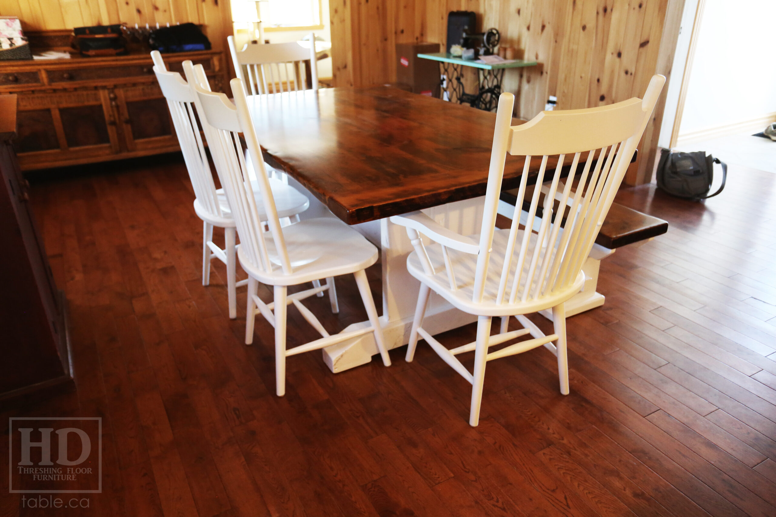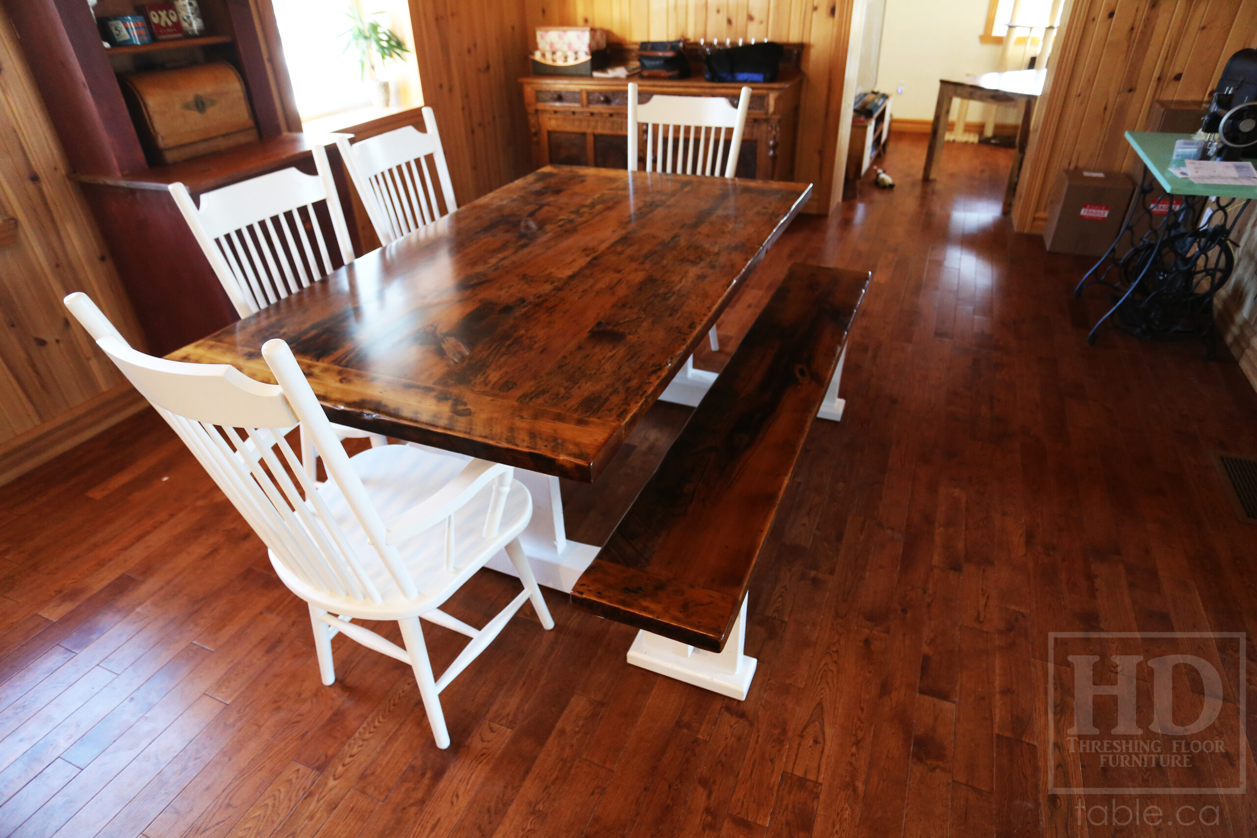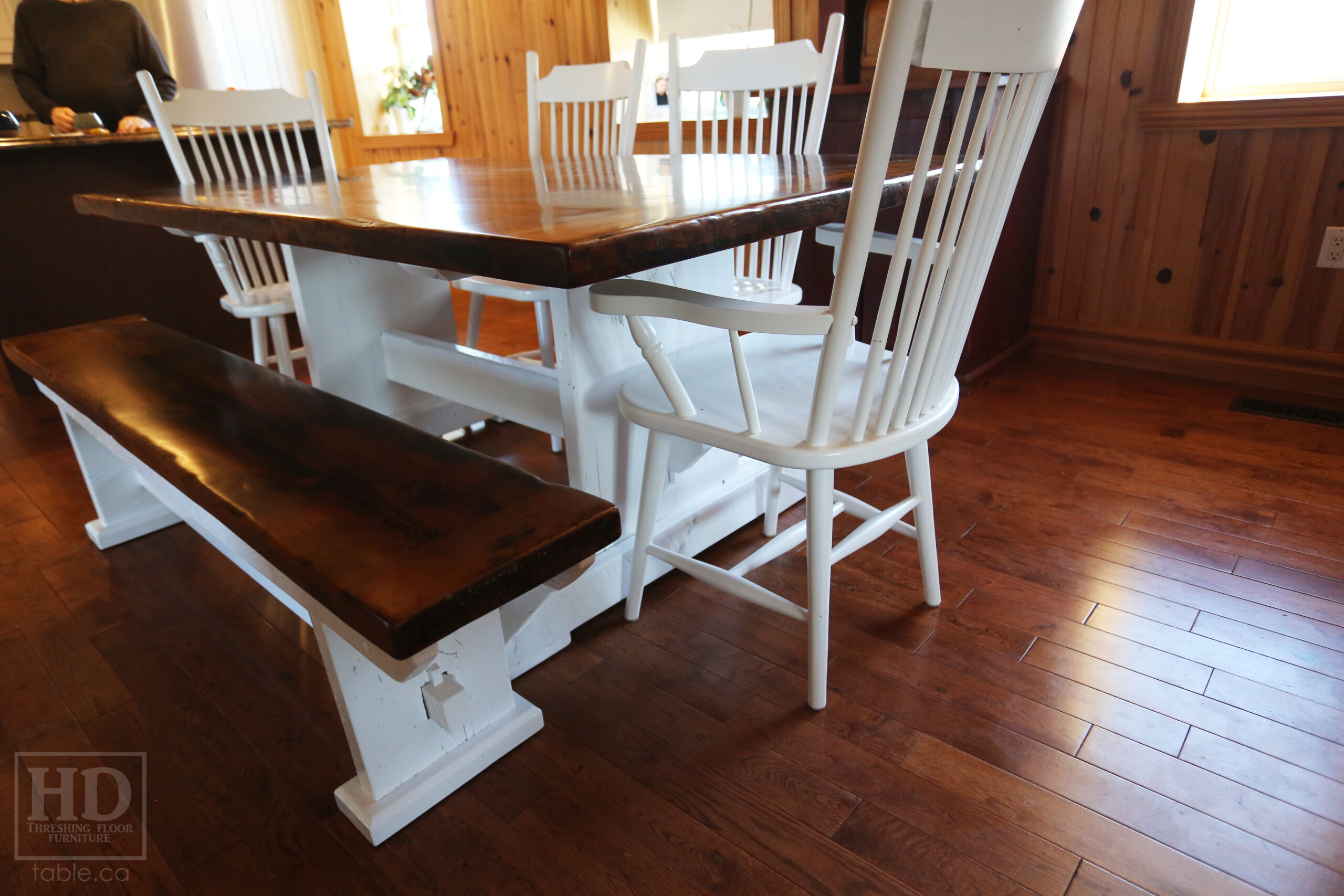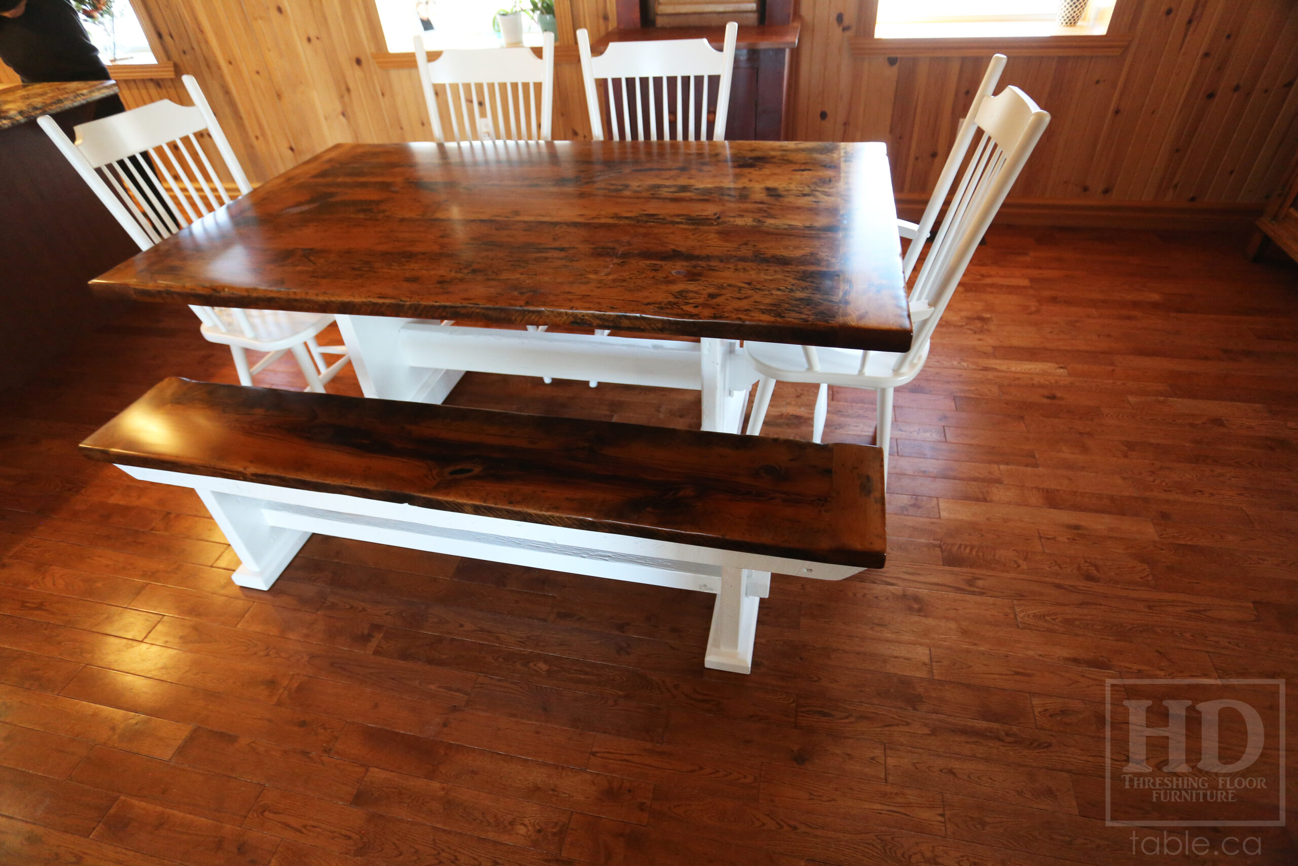 Project Summary: 6′ Reclaimed Ontario Barnwood Trestle Table we made for a Green Valley, Ontario Home – 42″ deep – Trestle Base – Old Growth Hemlock Threshing Floor Construction – Original edges & distressing maintained – White painted base option – Premium epoxy + matte polyurethane finish – [Matching] 6′ Bench – [4] Buckhorn Chairs – www.table.ca