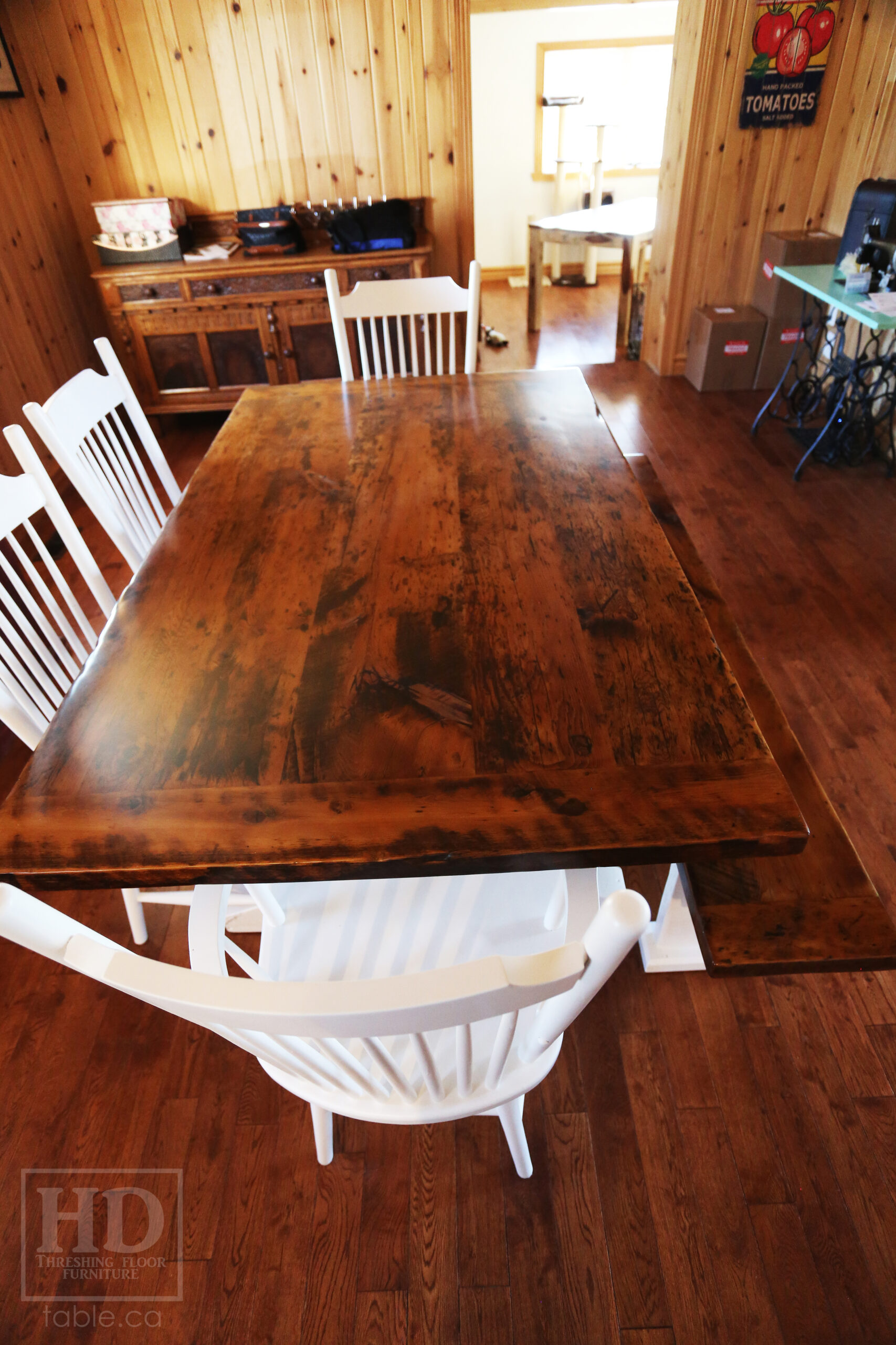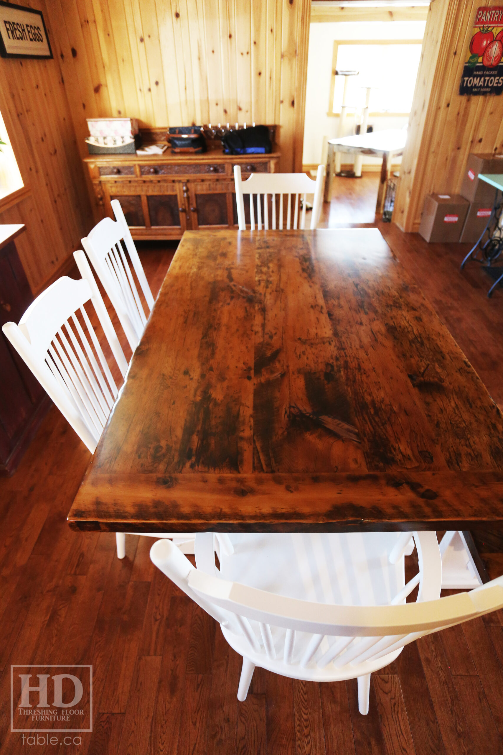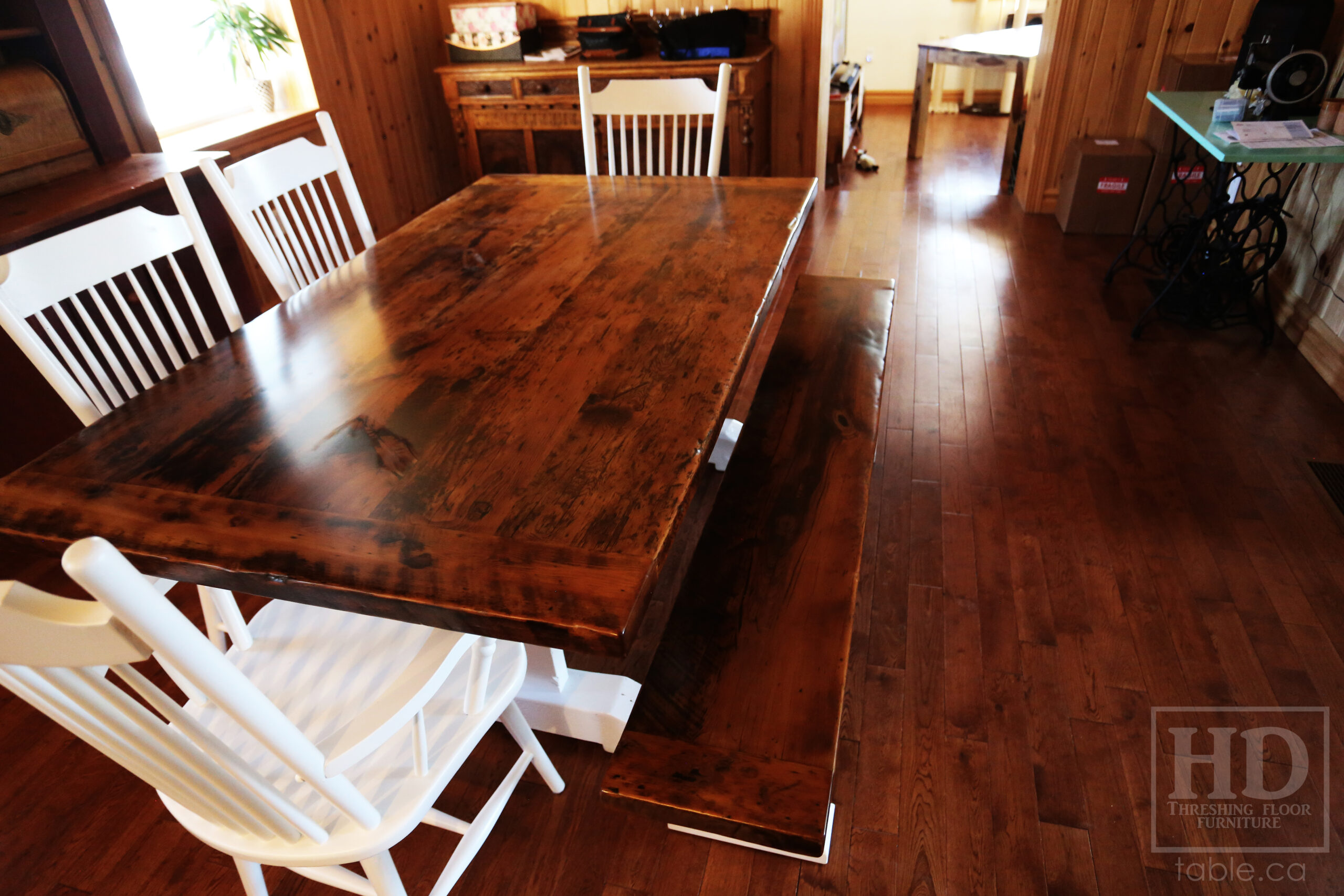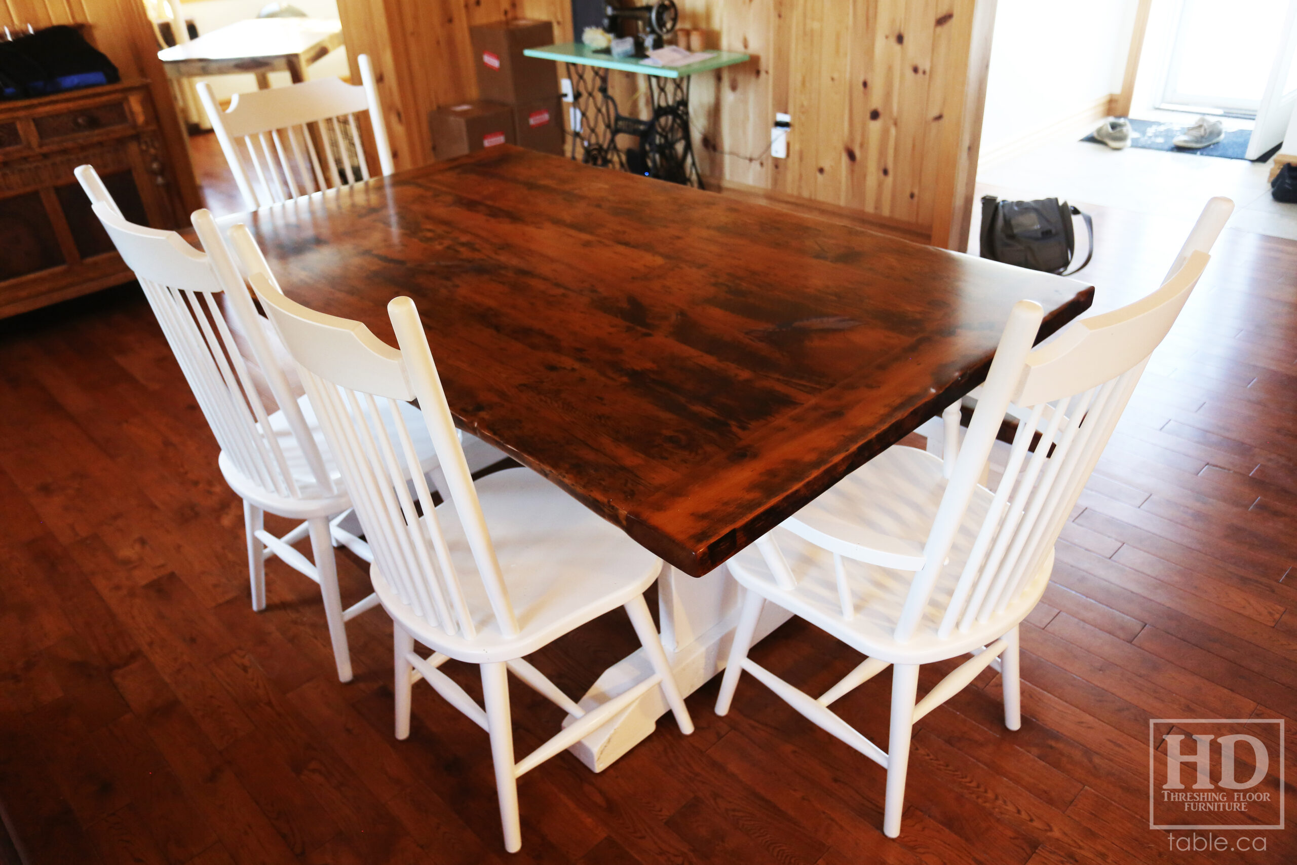 Project Summary: 6′ Reclaimed Ontario Barnwood Trestle Table we made for a Green Valley, Ontario Home – 42″ deep – Trestle Base – Old Growth Hemlock Threshing Floor Construction – Original edges & distressing maintained – White painted base option – Premium epoxy + matte polyurethane finish – [Matching] 6′ Bench – [4] Buckhorn Chairs – www.table.ca