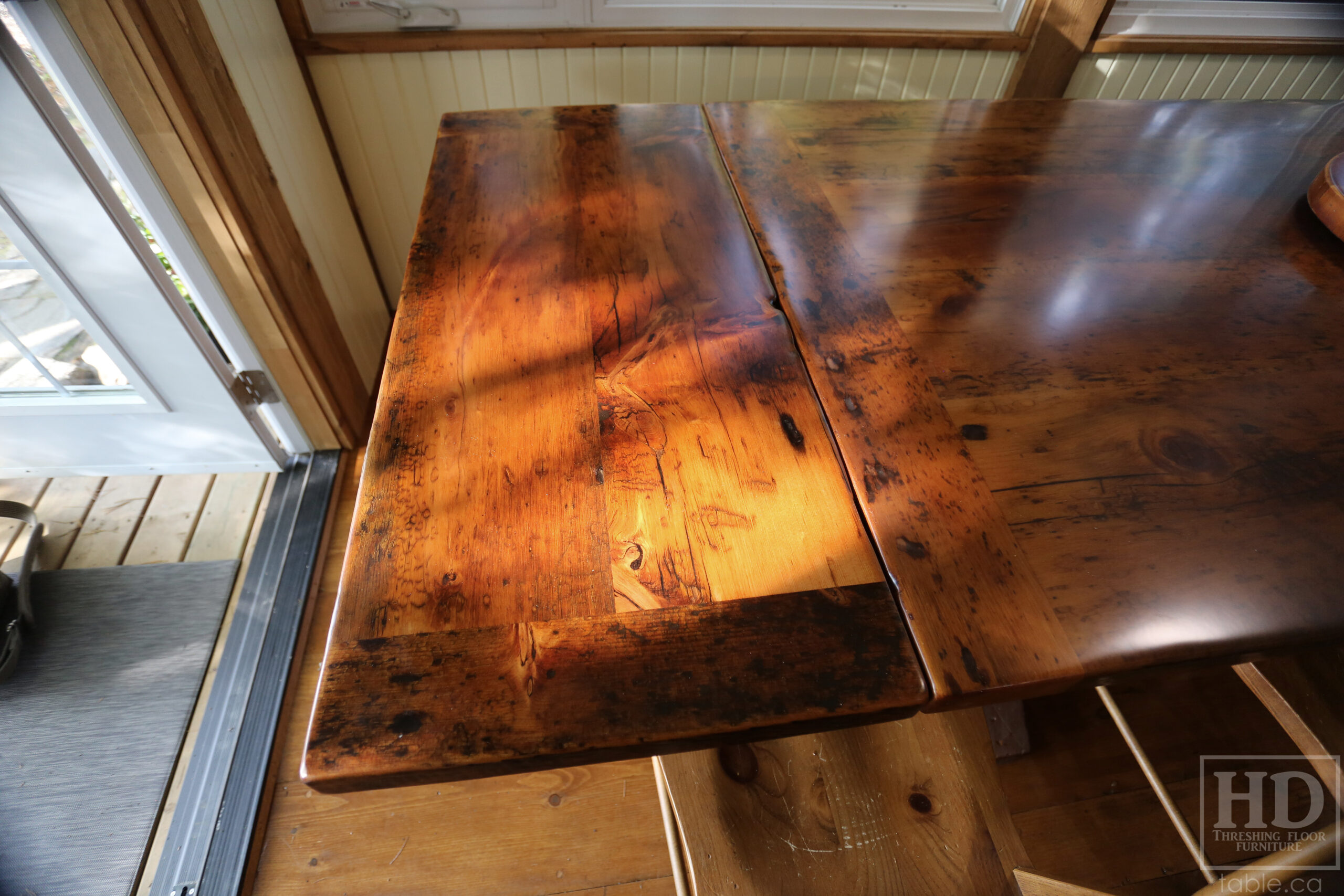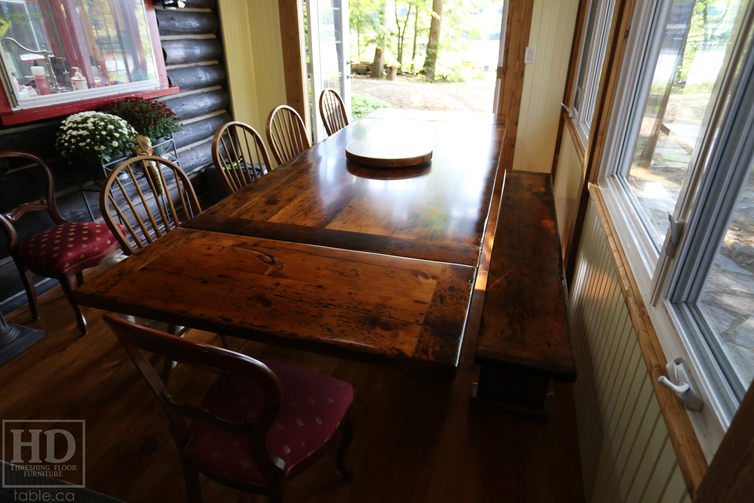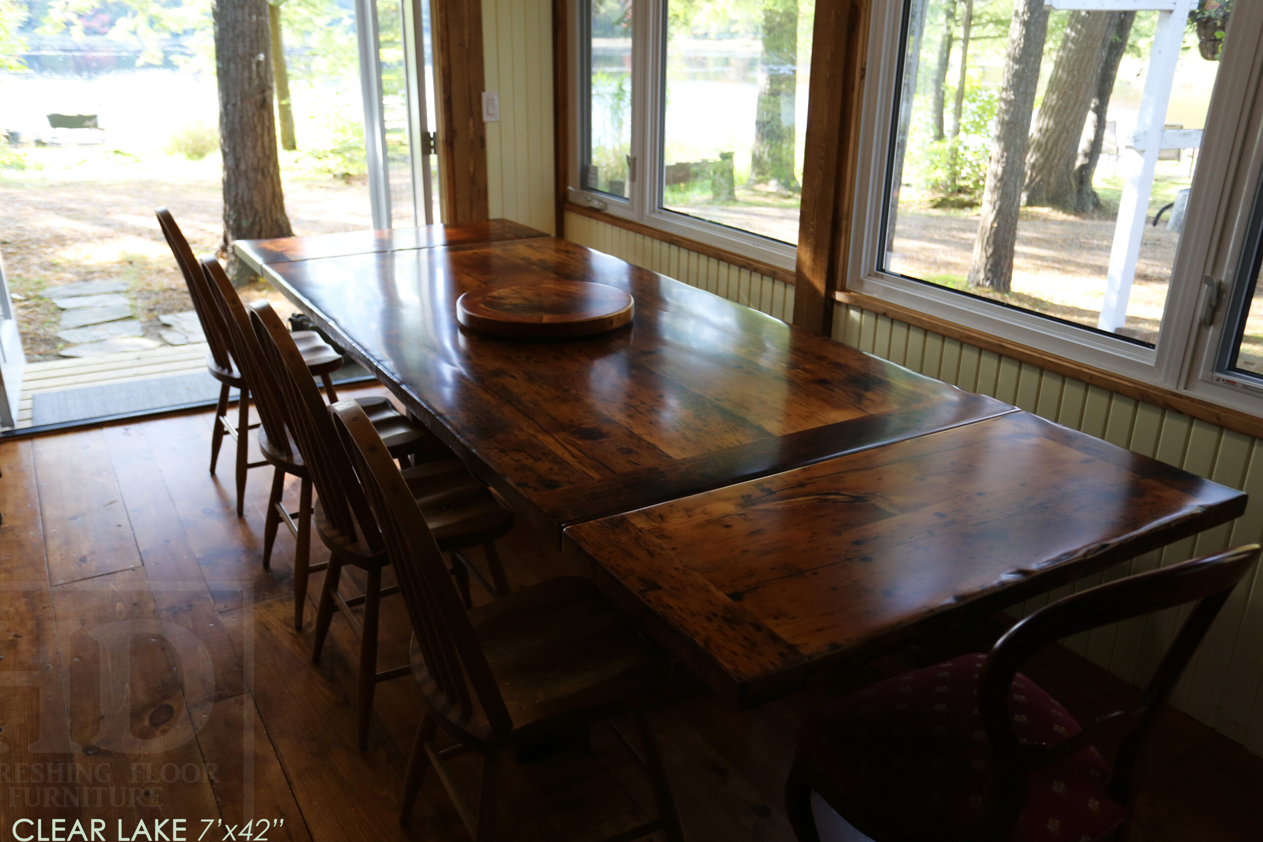 Project summary: 7’ Reclaimed Ontario Barnwood Table we made for a Sequin, Ontario cottage – 42†wide – Old Growth Hemlock Threshing Floor Construction – Original edges & distressing maintained – Bread Edge Ends – Premium epoxy + satin polyurethane finish – with two 18†leaves [making total length 10 ft when extended] – 7 ft [matching] Bench – www.table.ca