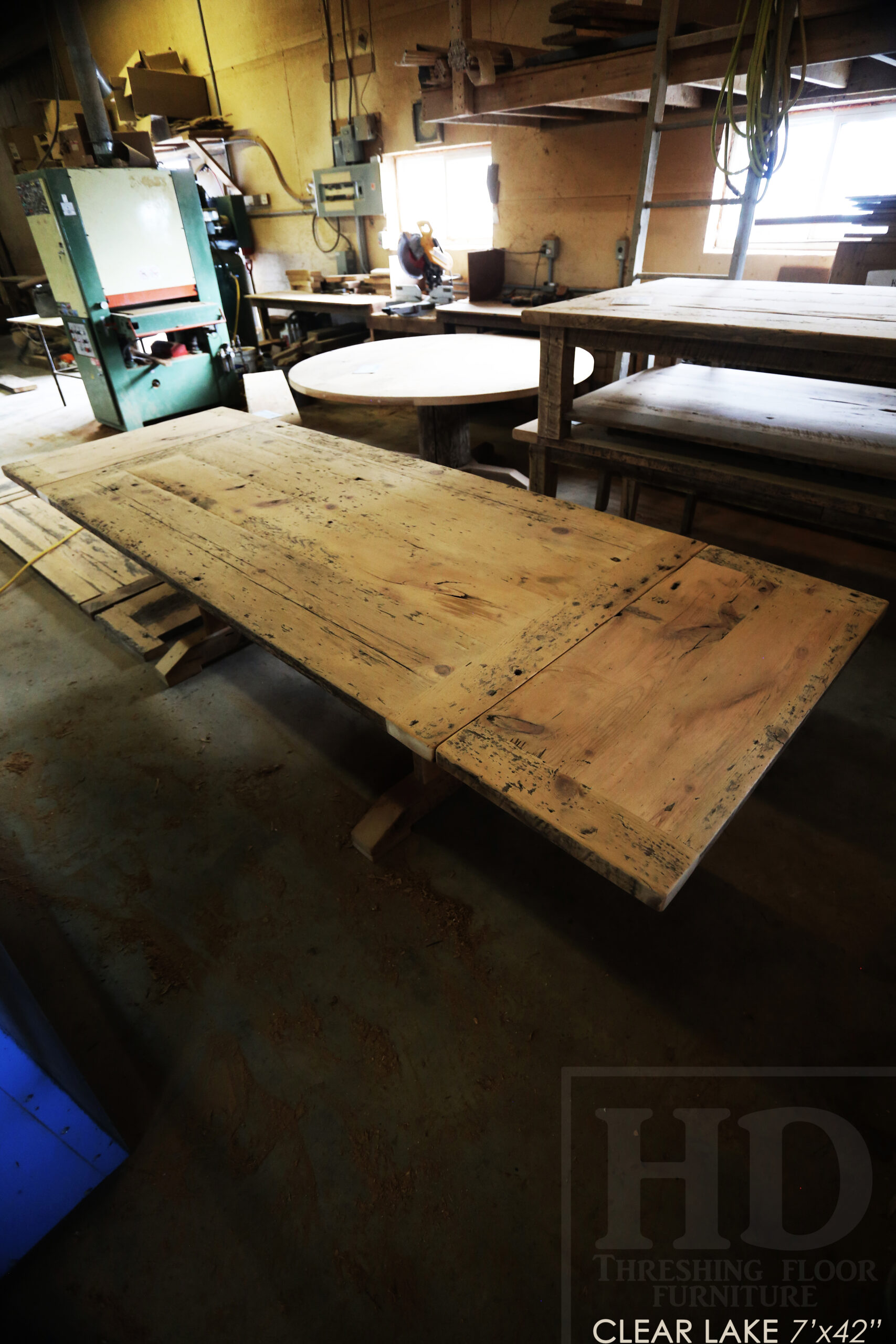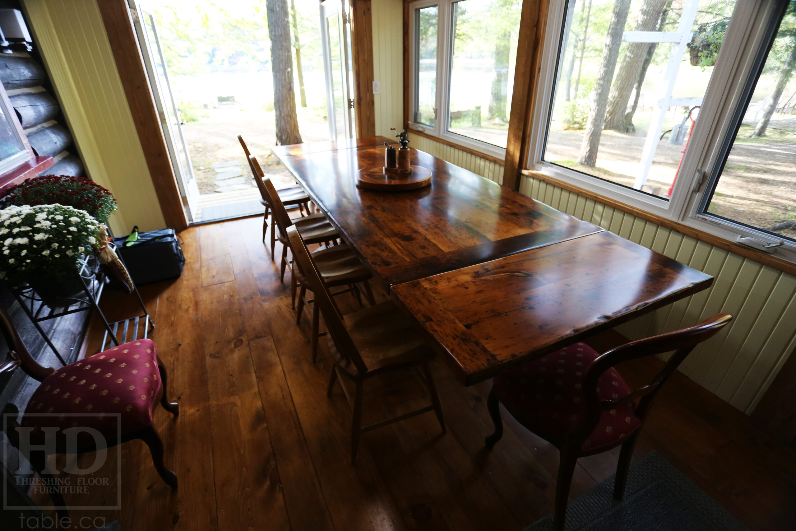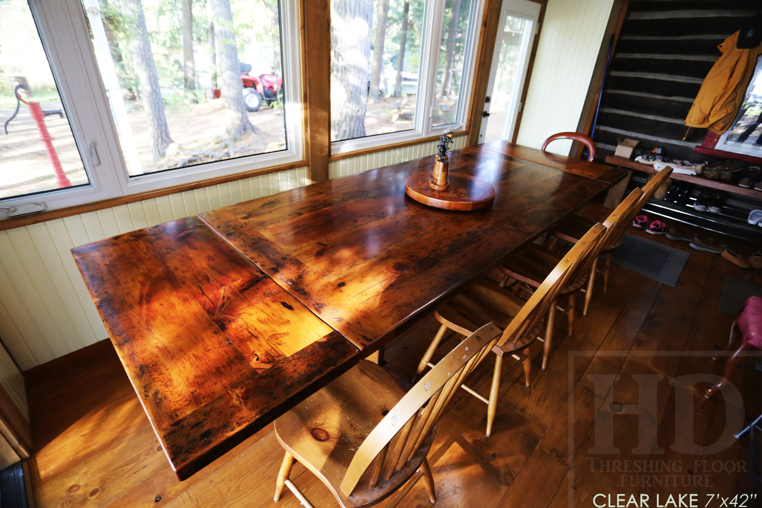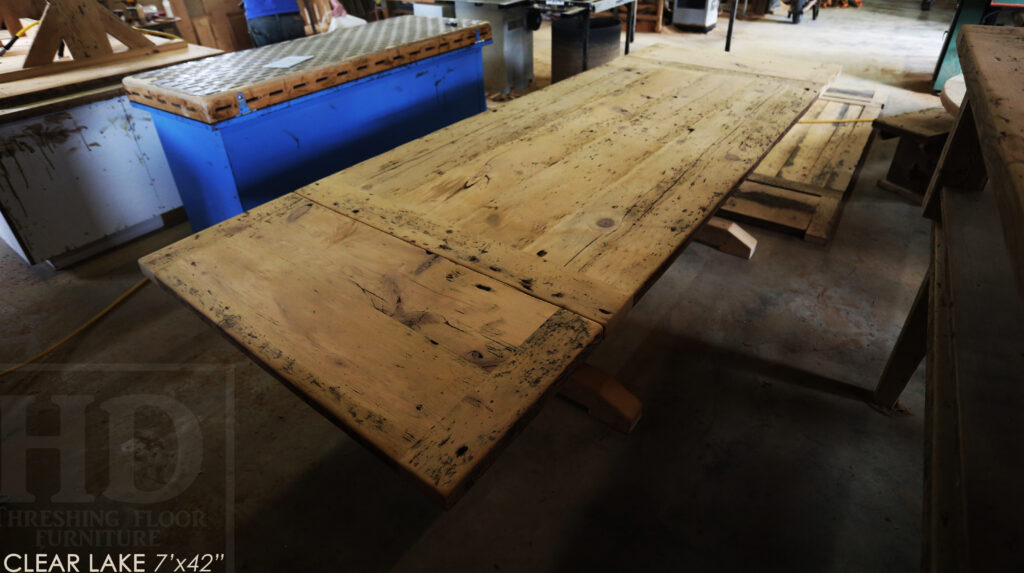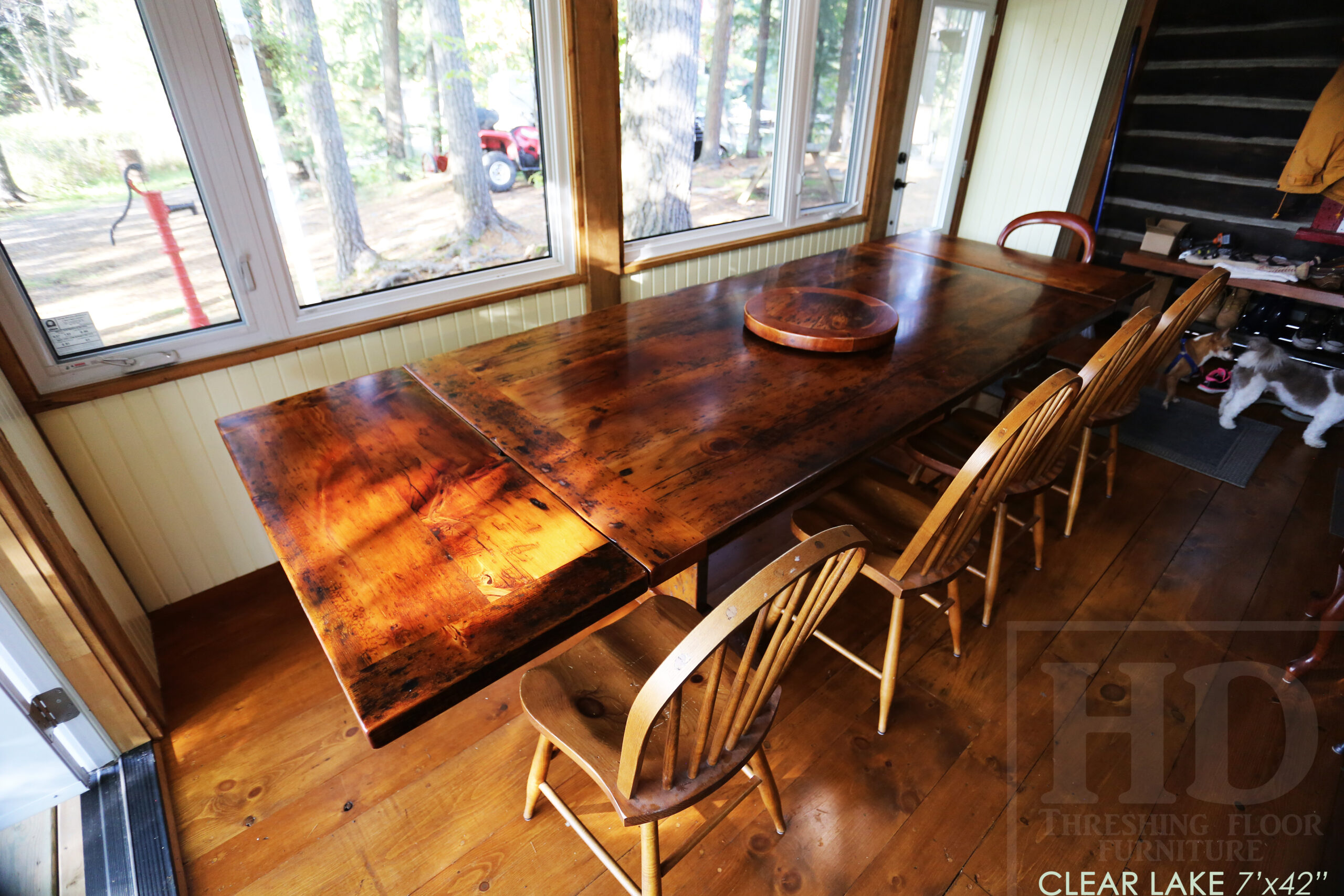 Project summary: 7’ Reclaimed Ontario Barnwood Table we made for a Sequin, Ontario cottage – 42†wide – Old Growth Hemlock Threshing Floor Construction – Original edges & distressing maintained – Bread Edge Ends – Premium epoxy + satin polyurethane finish – with two 18†leaves [making total length 10 ft when extended] – 7 ft [matching] Bench – www.table.ca