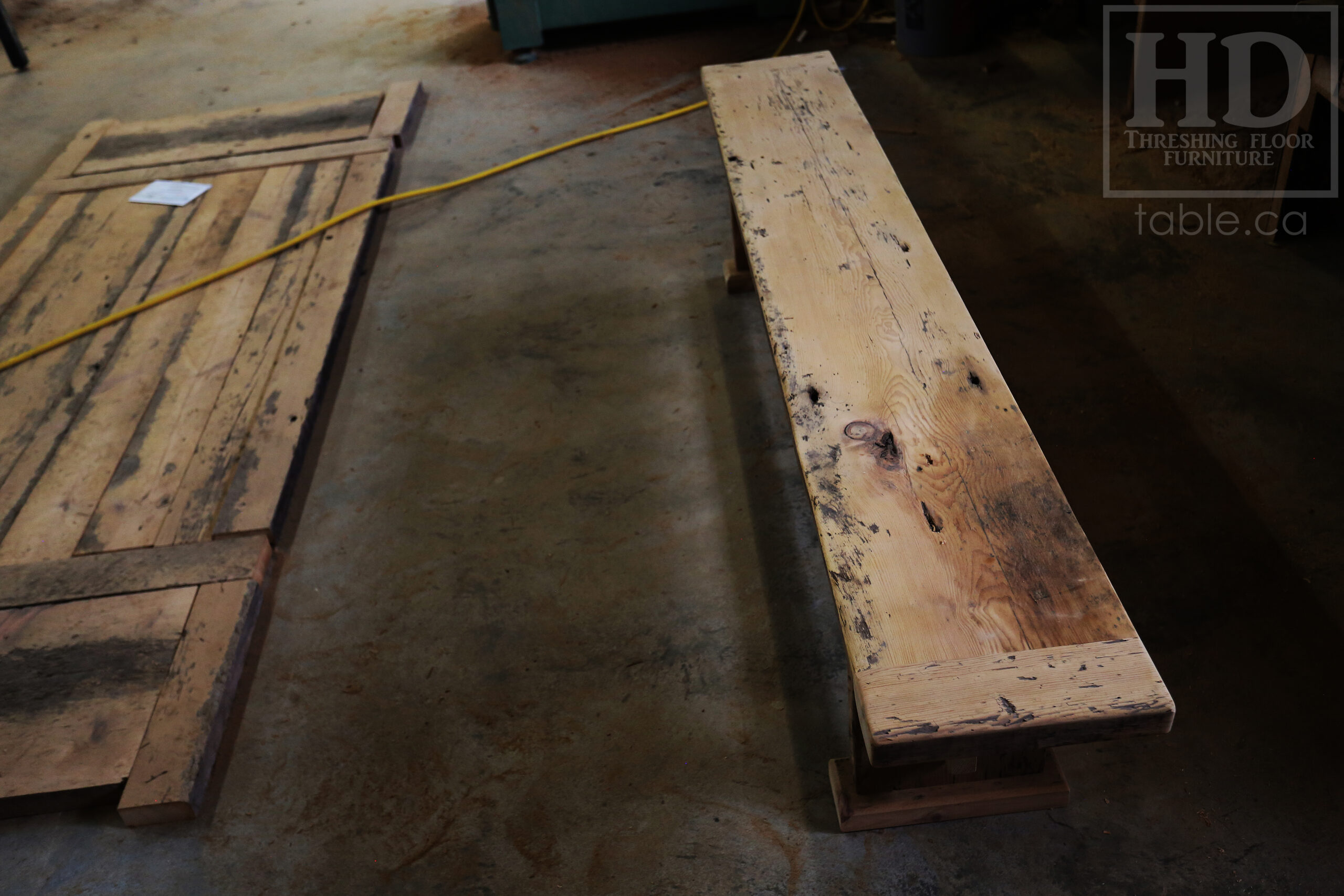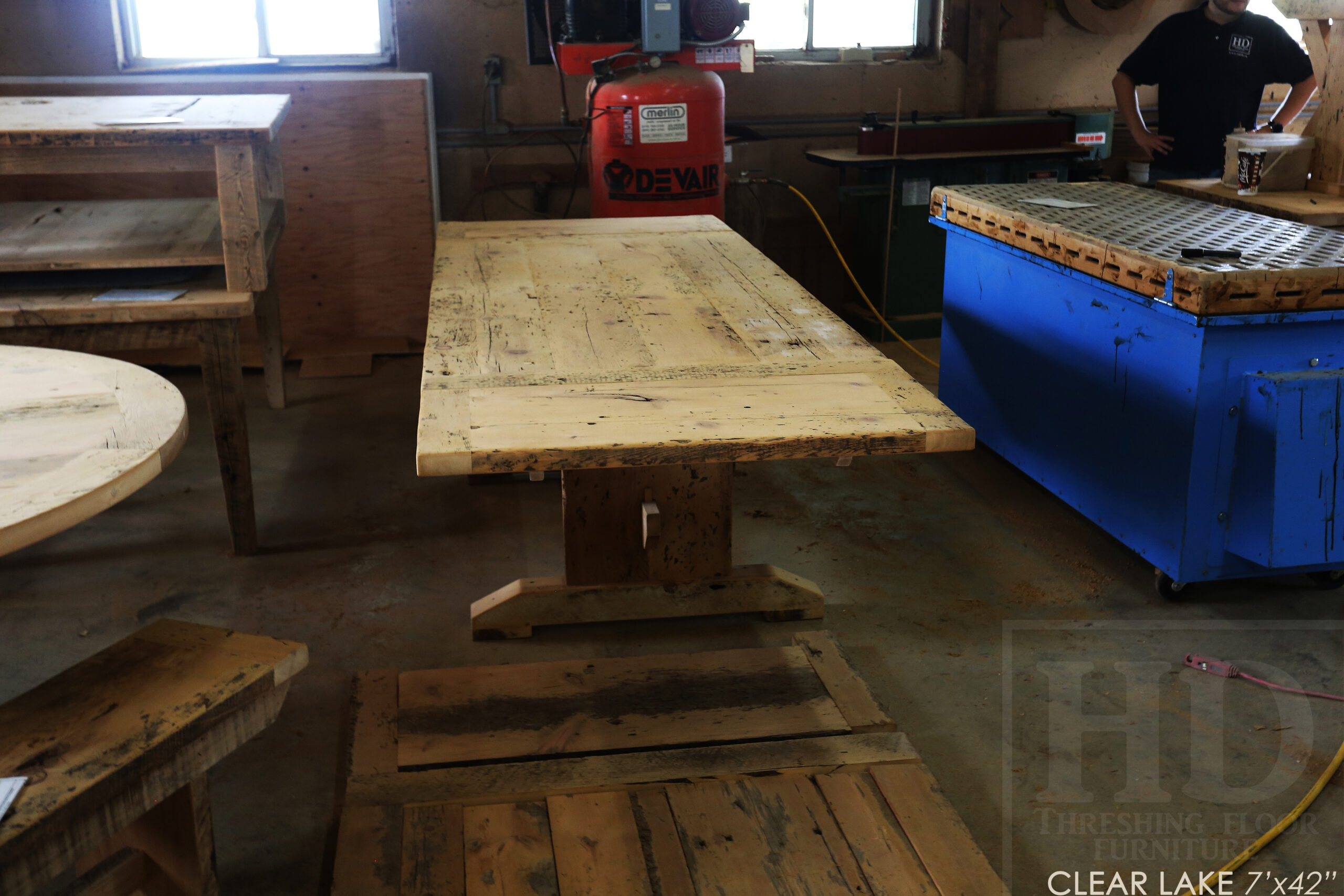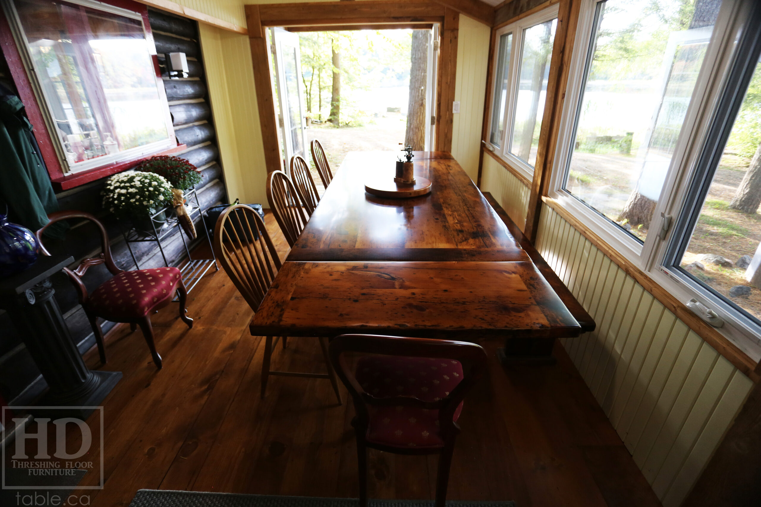 Project summary: 7’ Reclaimed Ontario Barnwood Table we made for a Sequin, Ontario cottage – 42†wide – Old Growth Hemlock Threshing Floor Construction – Original edges & distressing maintained – Bread Edge Ends – Premium epoxy + satin polyurethane finish – with two 18†leaves [making total length 10 ft when extended] – 7 ft [matching] Bench – www.table.ca