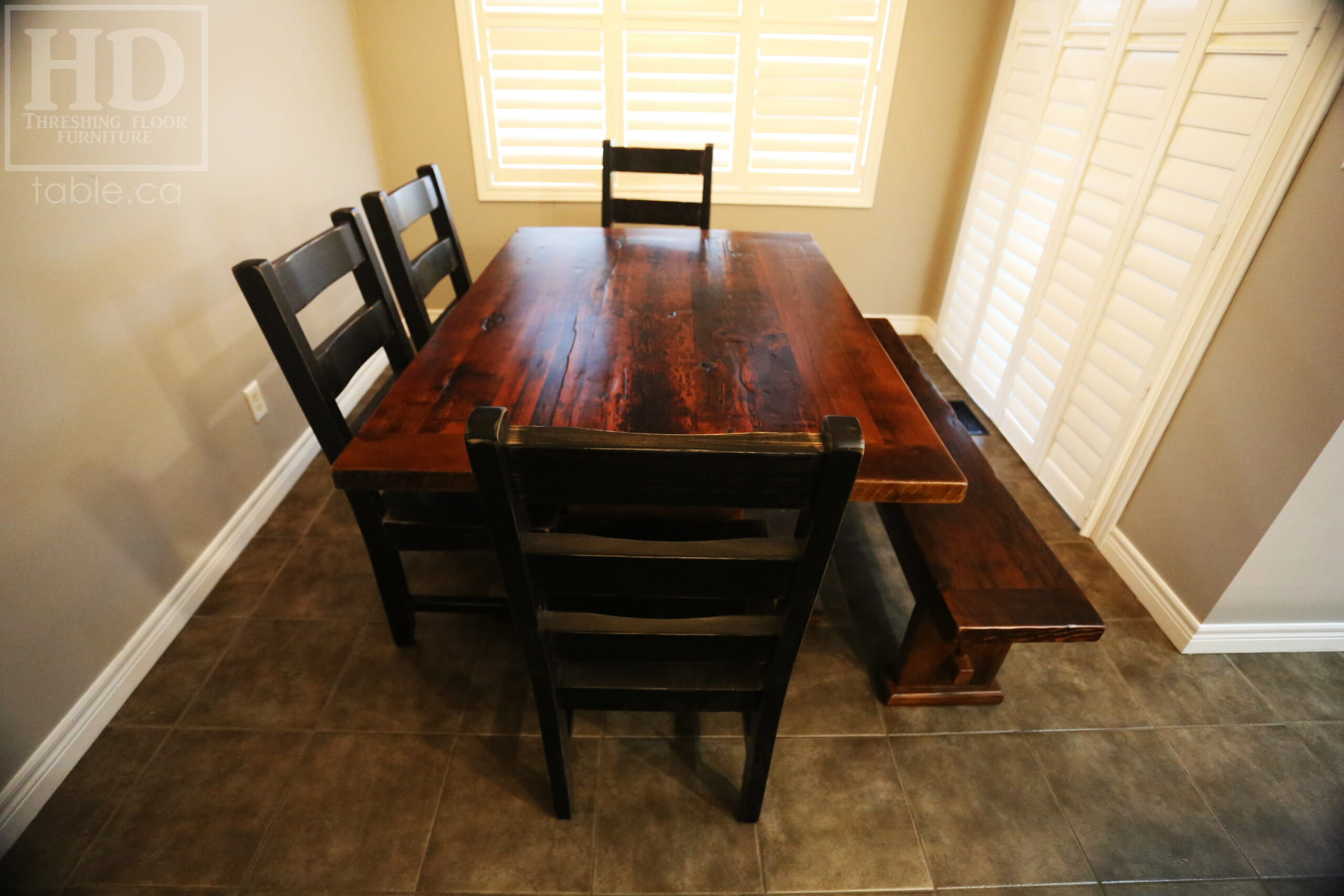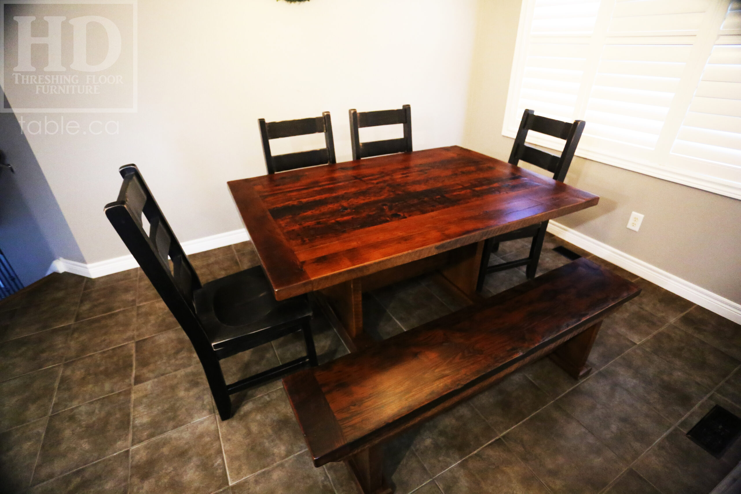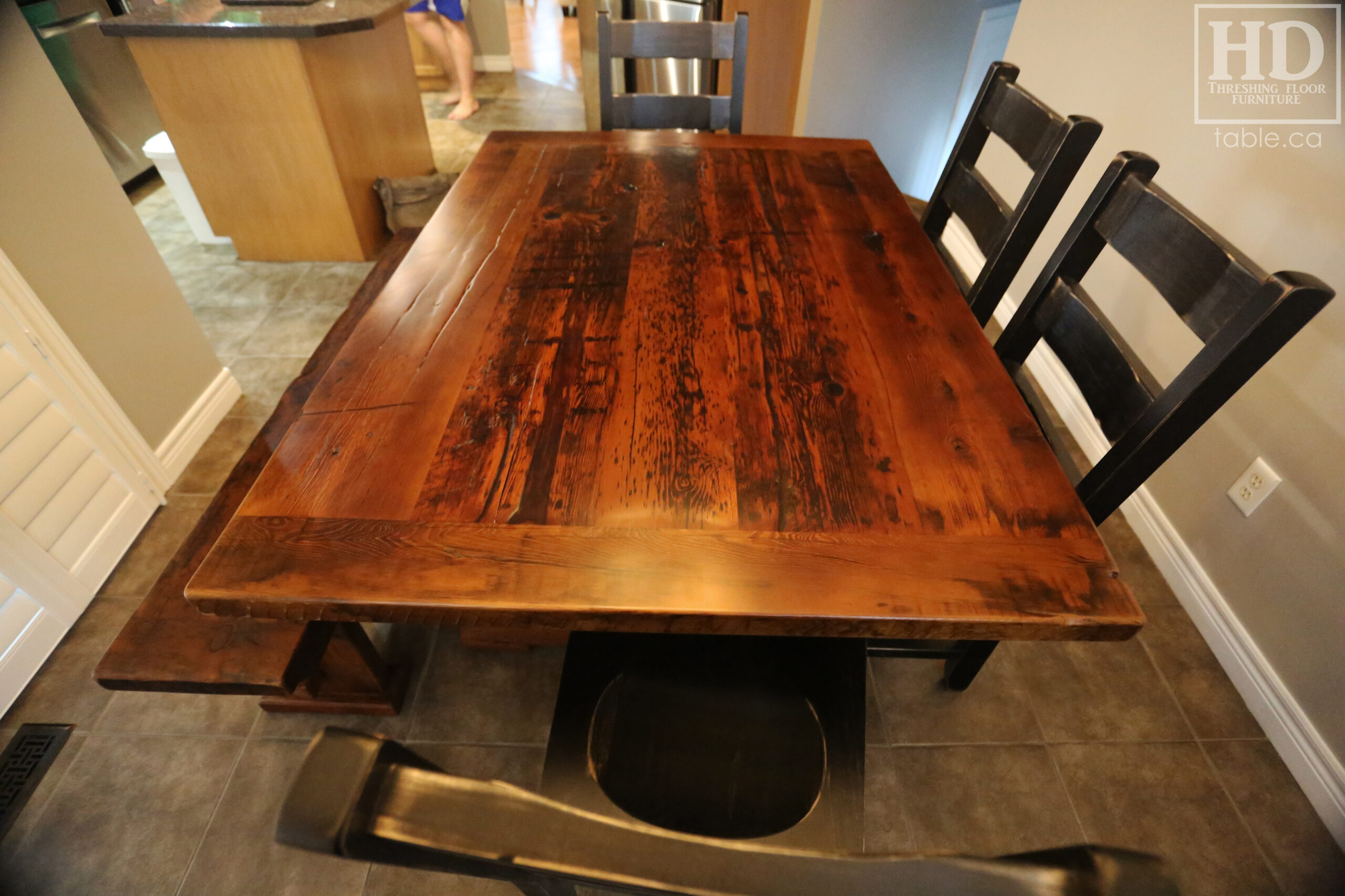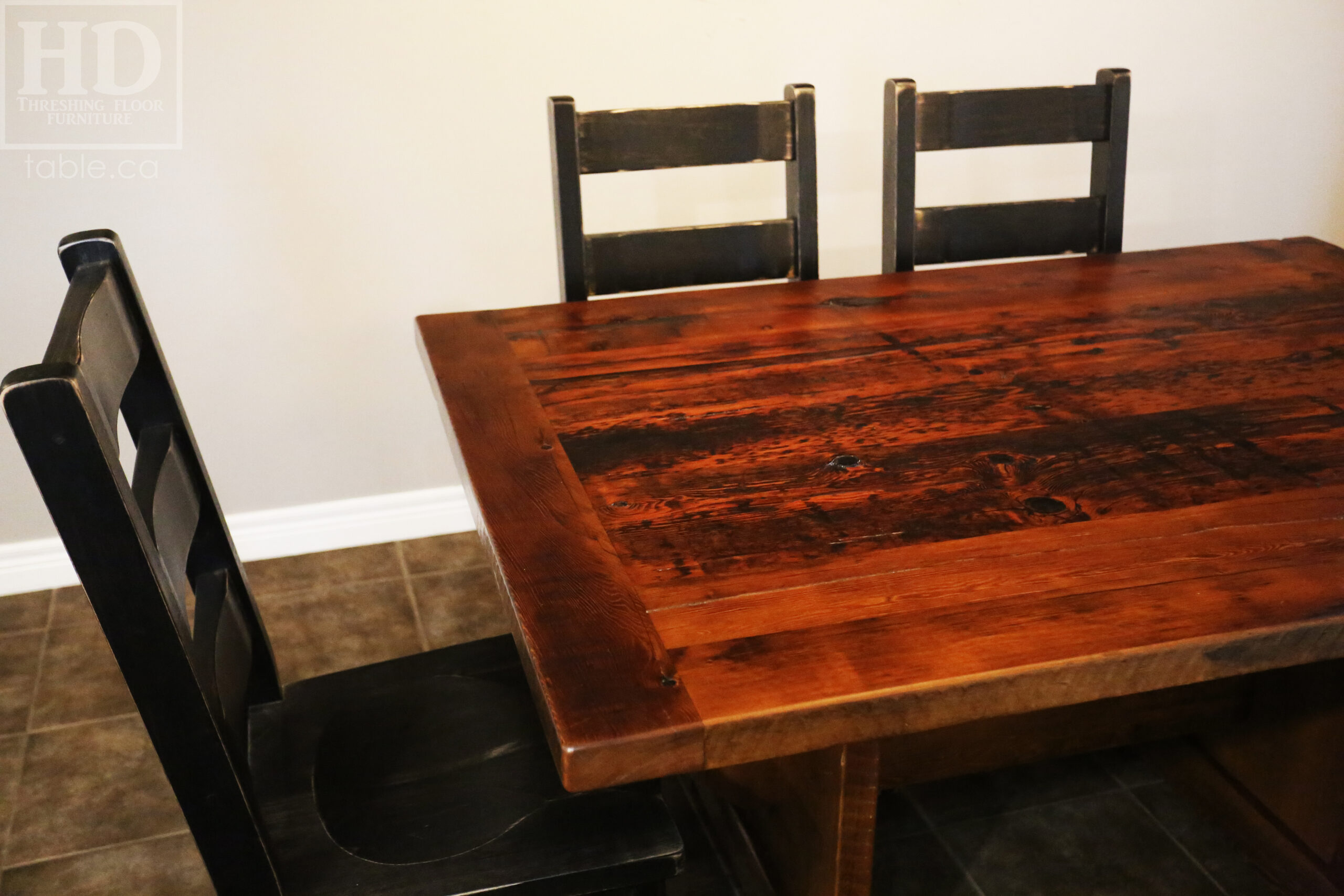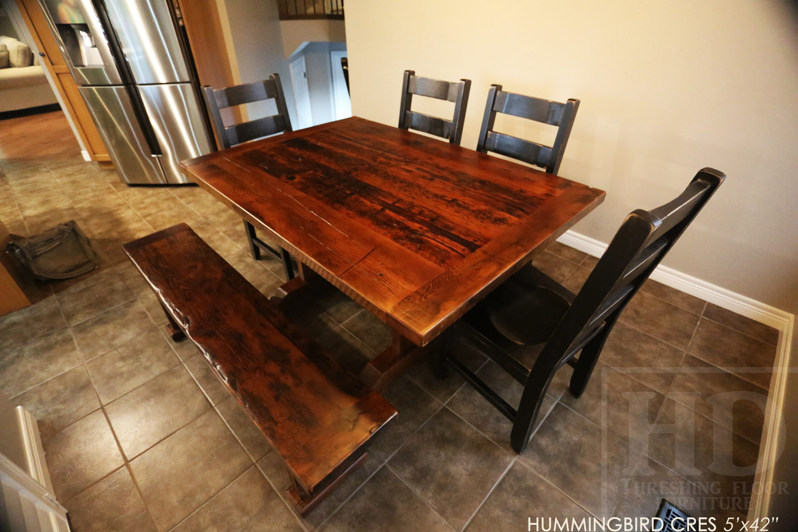 Project summary: 5 ft Reclaimed Ontario Barnwood Table we made for a Woodstock, Ontario home – 42†wide – Trestle Base – Old Growth Hemlock Threshing Floor Construction – Original edges & distressing maintained – Bread Edge Ends – Premium [light coating] epoxy + satin polyurethane finish – 5’ [matching] Bench – [4] Ladder Back Chairs / Wormy Maple / Black with Sandthroughs / Polyurethane clearcoat finish – www.table.ca