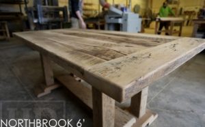 Specifications: 6 ft Reclaimed Wood Table – 36″ wide – Modified Frame Style Base – Reclaimed Hemlock Threshing Floor Construction – [Matching] 6 ft Reclaimed Wood Bench – Premium epoxy/polyurethane finish – Original barn floor board edges maintained