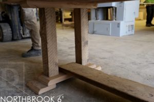 Specifications: 6 ft Reclaimed Wood Table – 36″ wide – Modified Frame Style Base – Reclaimed Hemlock Threshing Floor Construction – [Matching] 6 ft Reclaimed Wood Bench – Premium epoxy/polyurethane finish – Original barn floor board edges maintained