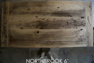 Specifications: 6 ft Reclaimed Wood Table – 36″ wide – Modified Frame Style Base – Reclaimed Hemlock Threshing Floor Construction – [Matching] 6 ft Reclaimed Wood Bench – Premium epoxy/polyurethane finish – Original barn floor board edges maintained