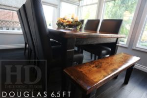 Specifications: 6.5 ft Harvest Table – 48″ wide – Reclaimed Hemlock Threshing Floor – Premium epoxy + satin polyurethane finish – Tapered with a Notch Legs – Black skirting & legs – Two [matching] 48″ benches – 6 Black Topgrain Leather Parsons Chairs – Posted by Gerald Reinink, Design + Sales