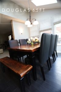 Specifications: 6.5 ft Harvest Table – 48″ wide – Reclaimed Hemlock Threshing Floor – Premium epoxy + satin polyurethane finish – Tapered with a Notch Legs – Black skirting & legs – Two [matching] 48″ benches – 6 Black Topgrain Leather Parsons Chairs – Posted by Gerald Reinink, Design + Sales