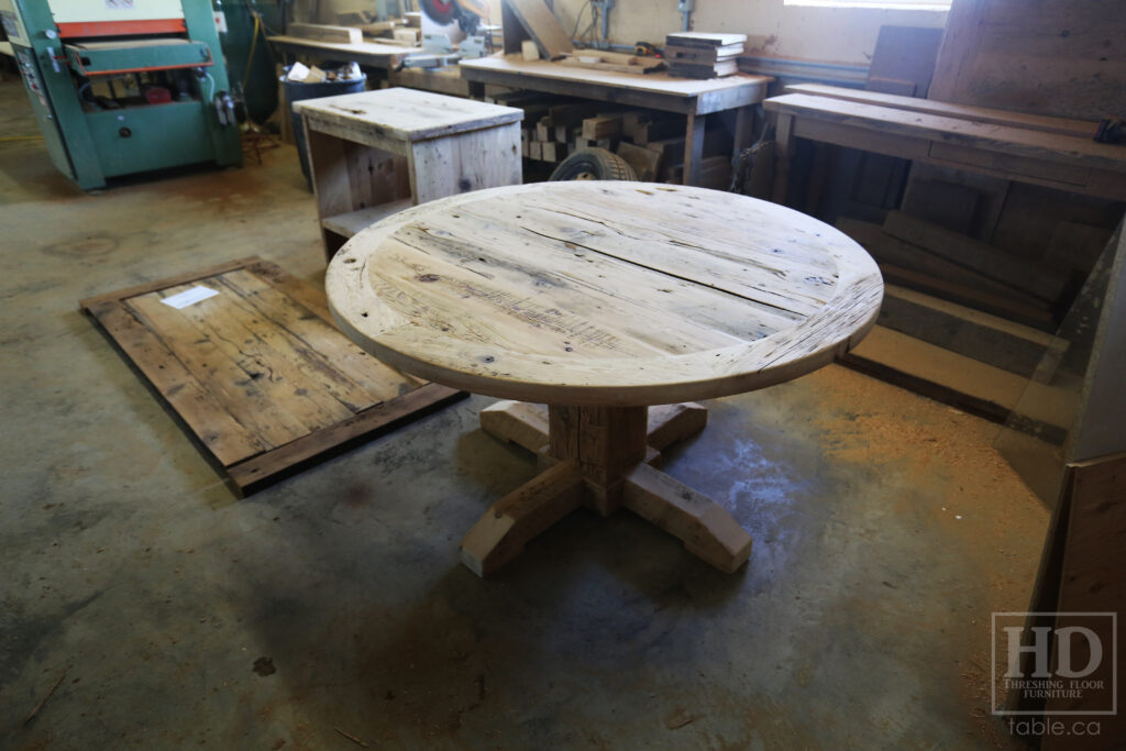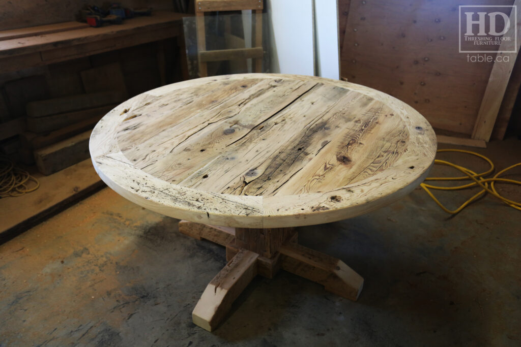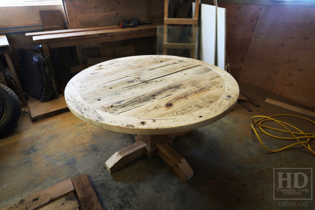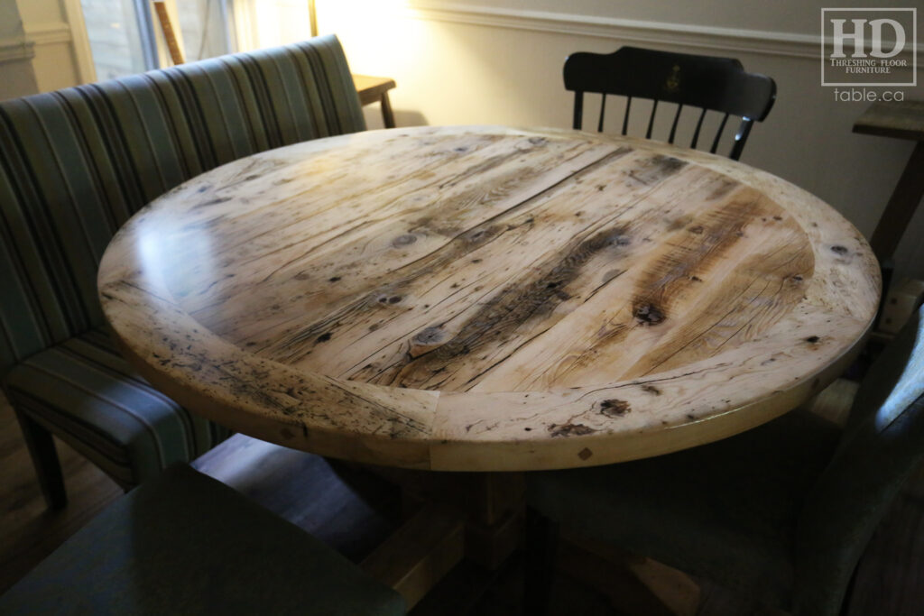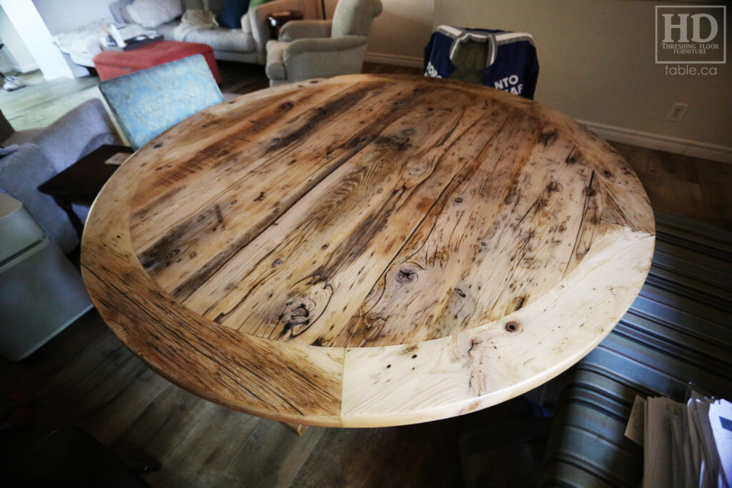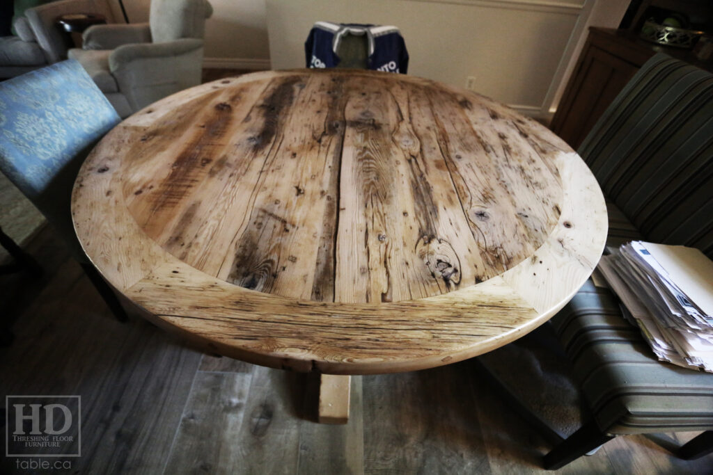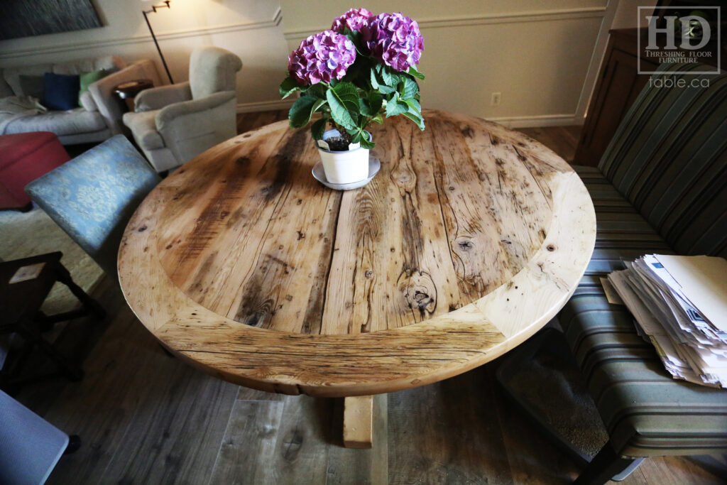 Project Summary: 54″ Ontario Barnwood Round Table we made for a Toronto home – Hand-Hewn Pedestal Base – Hemlock Threshing Floor Construction – Original distressing maintained – Premium epoxy + satin polyurethane finish – www.table.ca