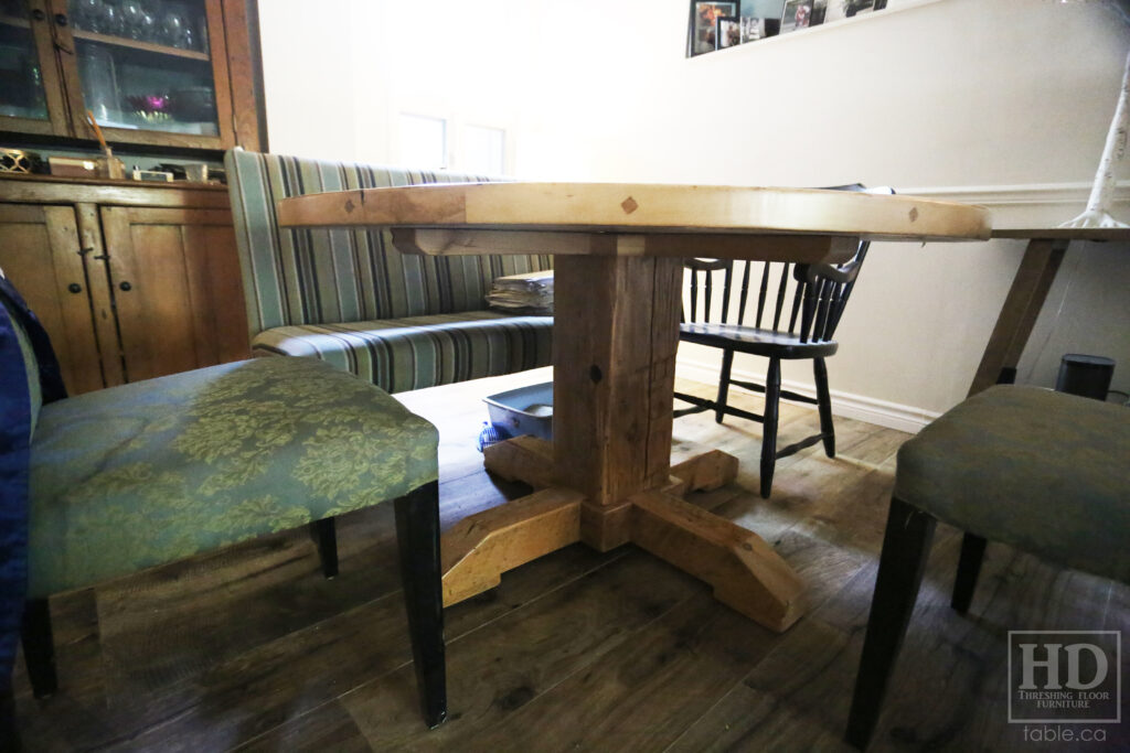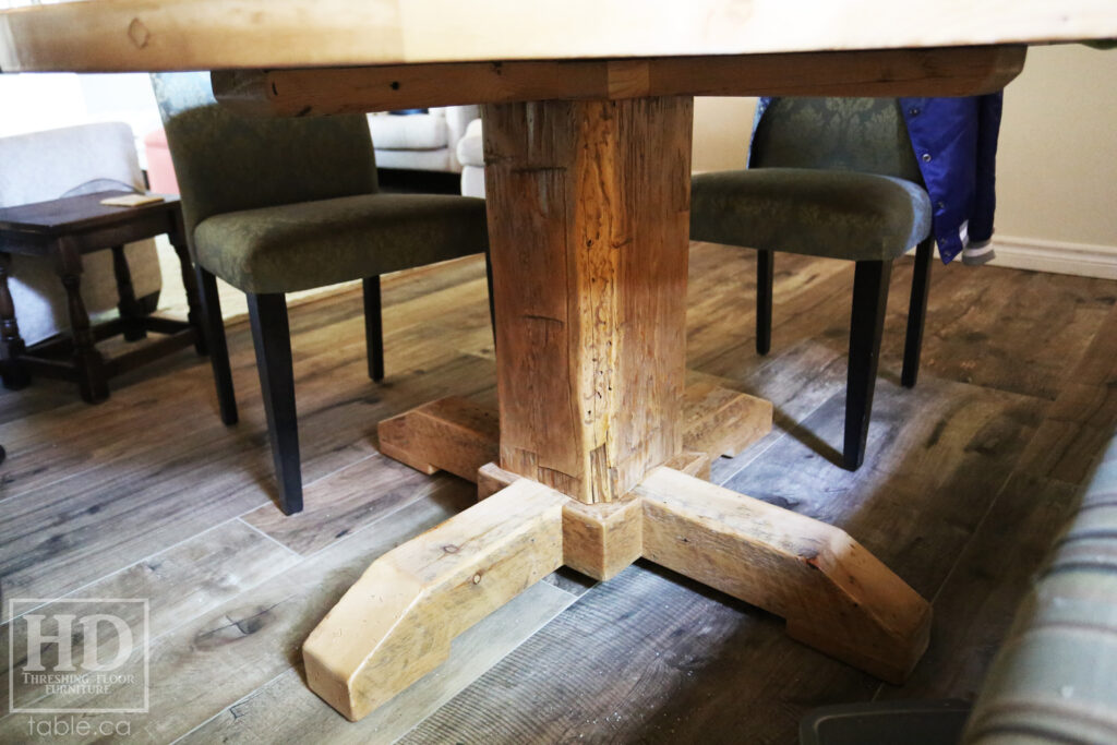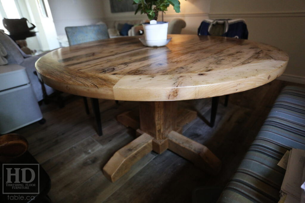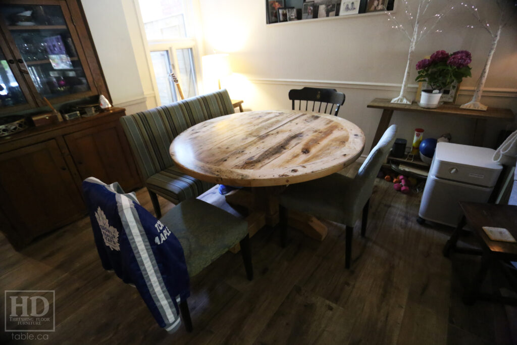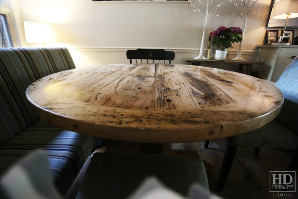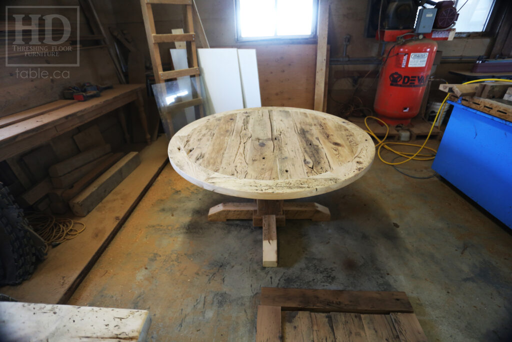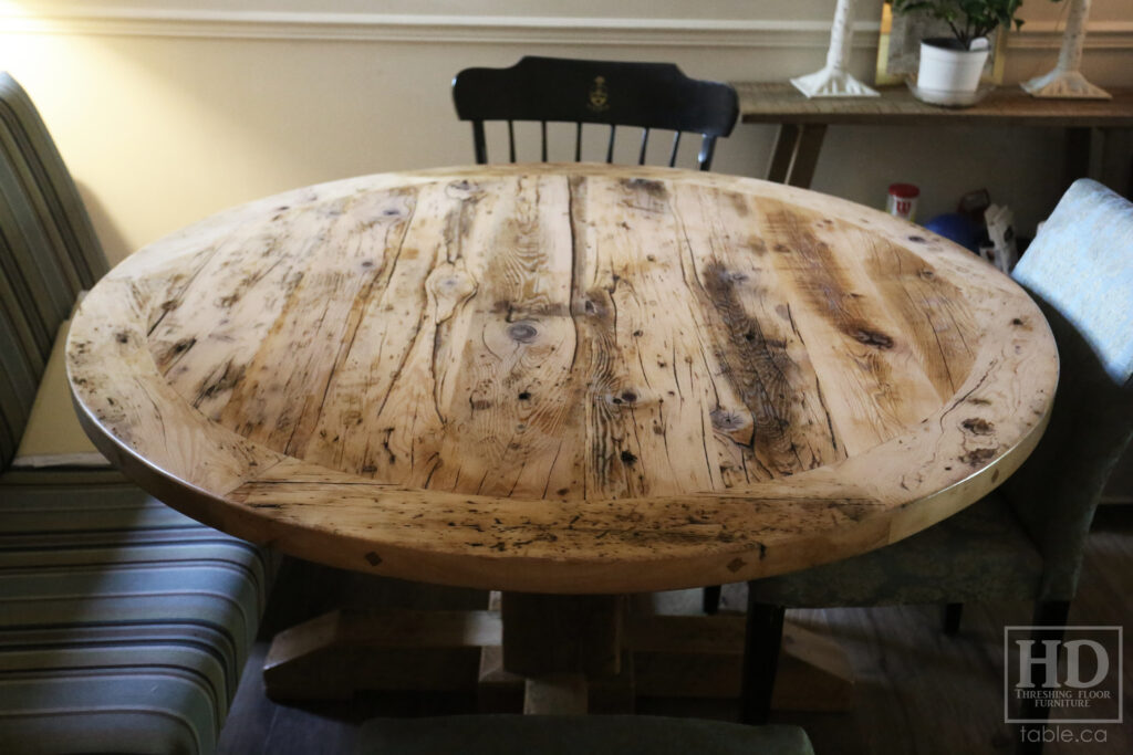 Project Summary: 54″ Ontario Barnwood Round Table we made for a Toronto home – Hand-Hewn Pedestal Base – Hemlock Threshing Floor Construction – Original distressing maintained – Premium epoxy + satin polyurethane finish – www.table.ca