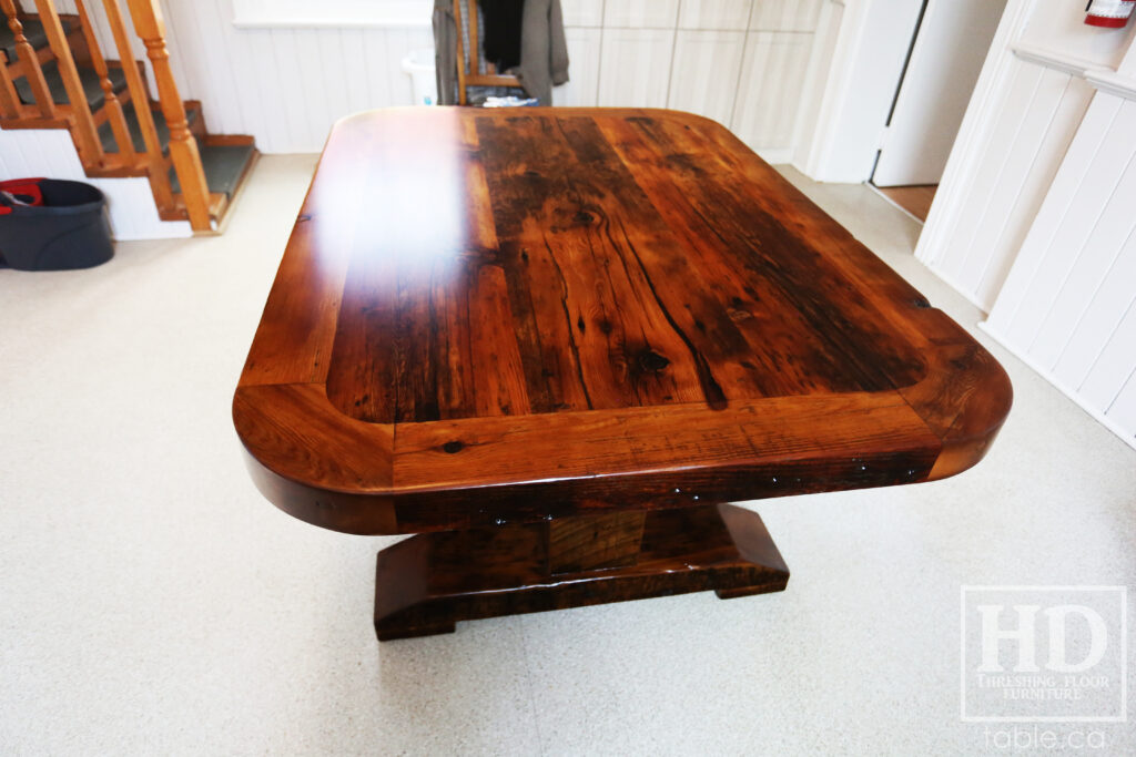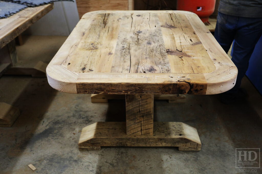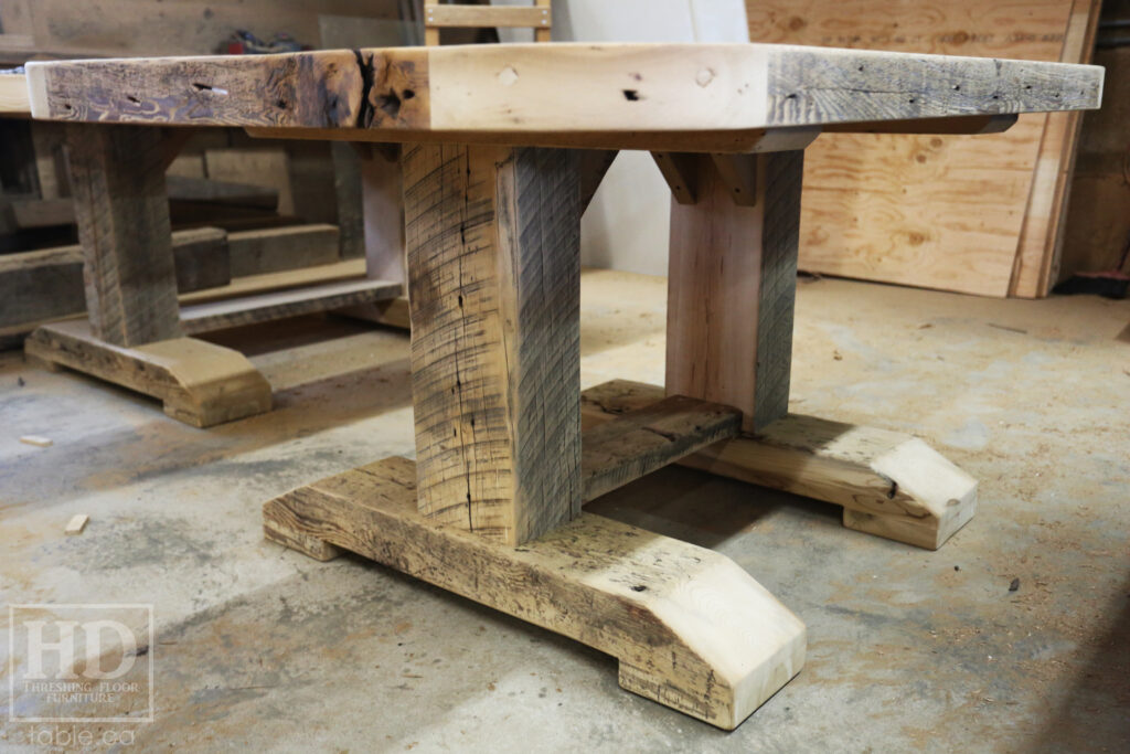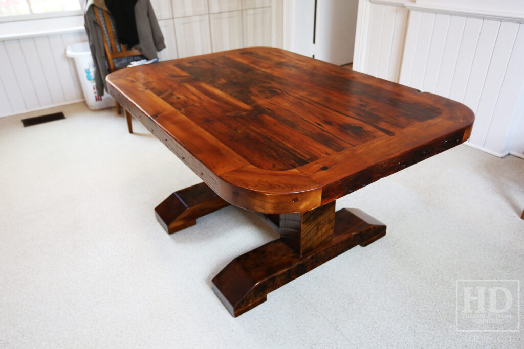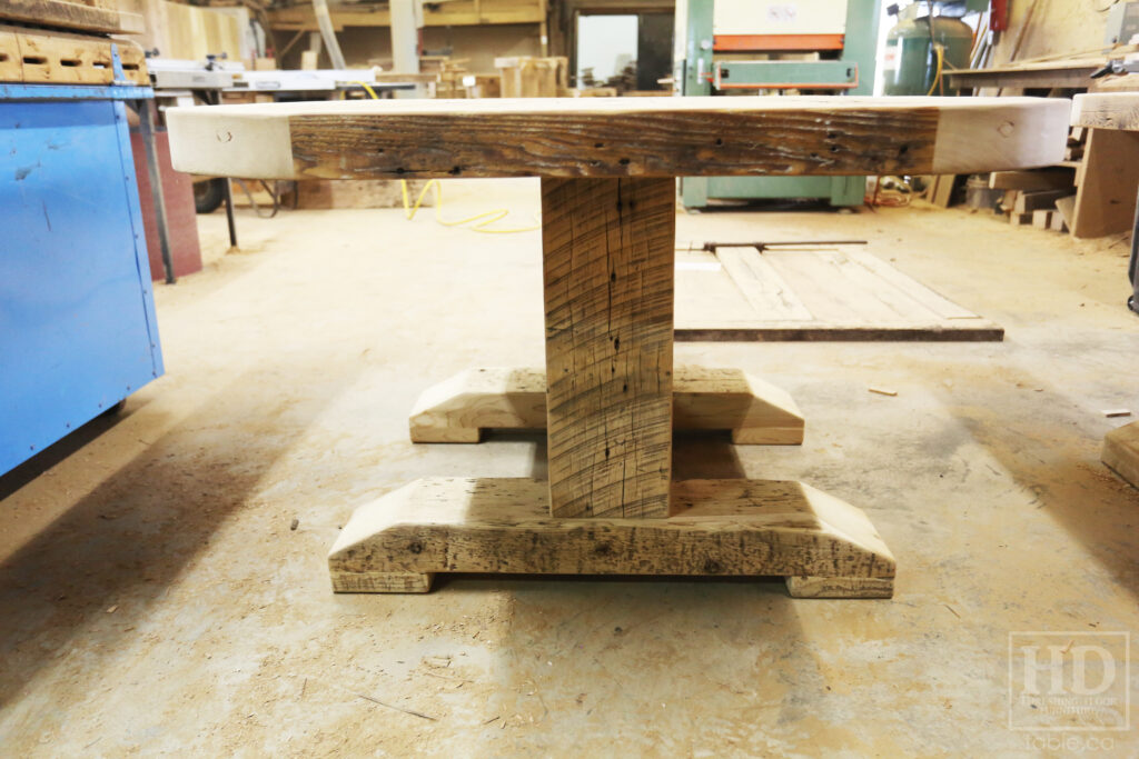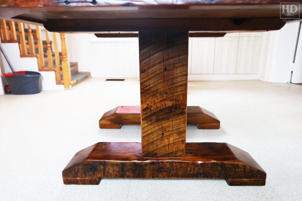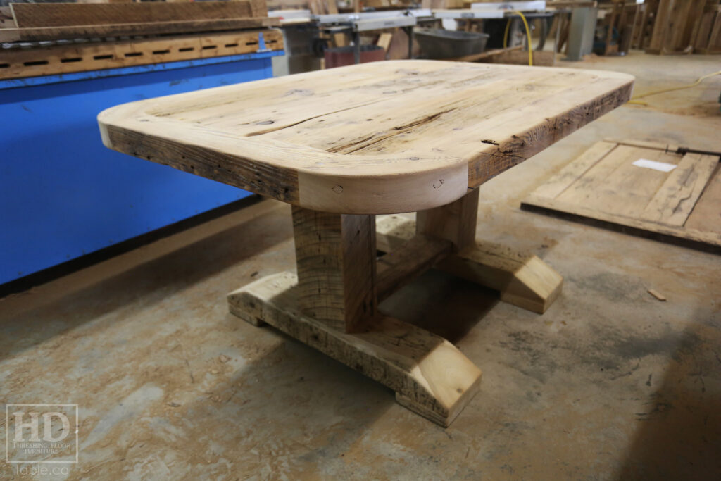 Project summary: 60″ Ontario Barnwood Table we made for a Port Hope office – 42″ wide – Extra thick 3″ top option – Hand-hewn Pedestals Base with rail – Old Growth Reclaimed Hemlock Construction – Original edges + patina kept – Rounded Corners Option – Epoxy seal on base option – Premium epoxy + satin polyurethane finish – www.table.ca